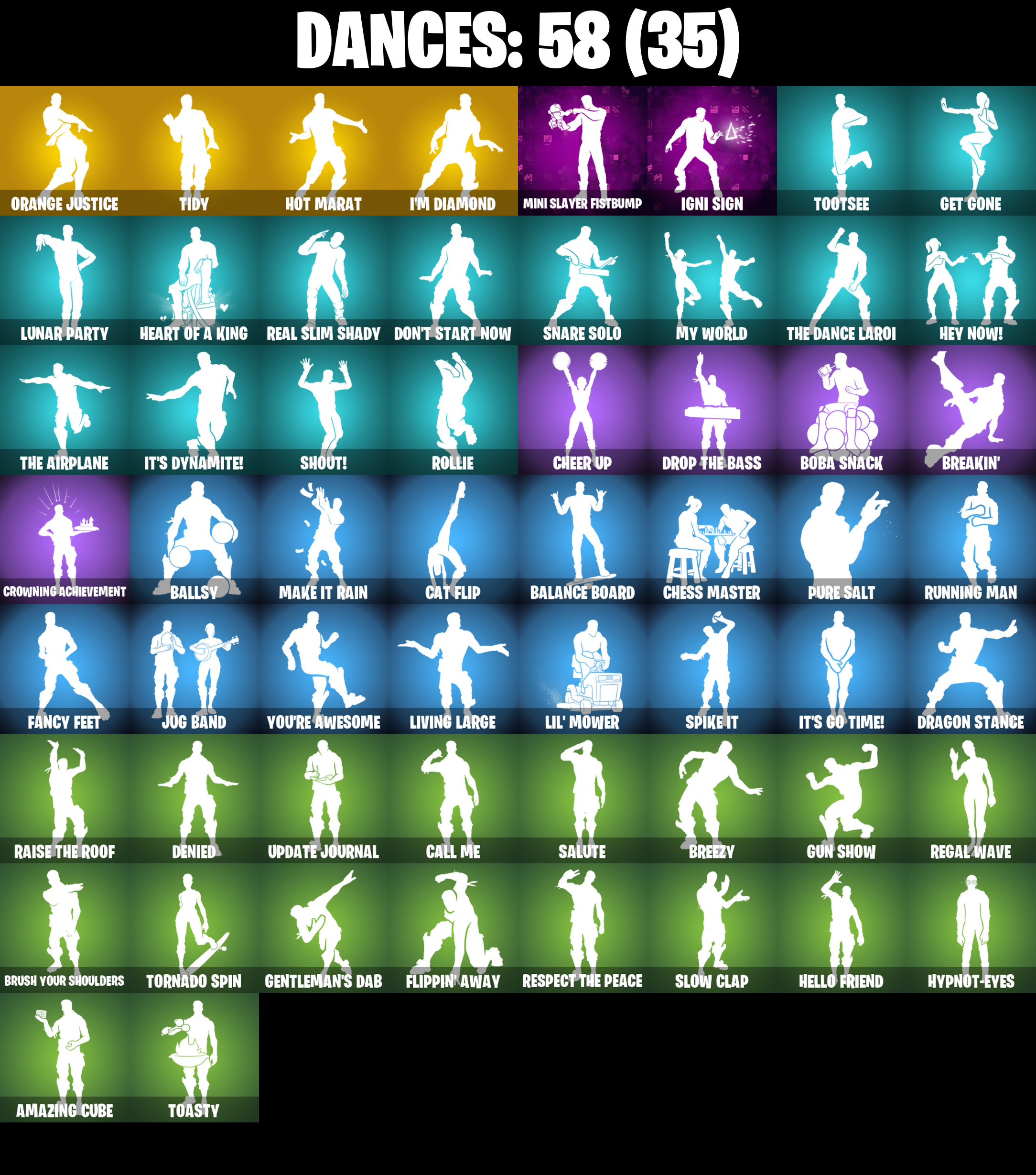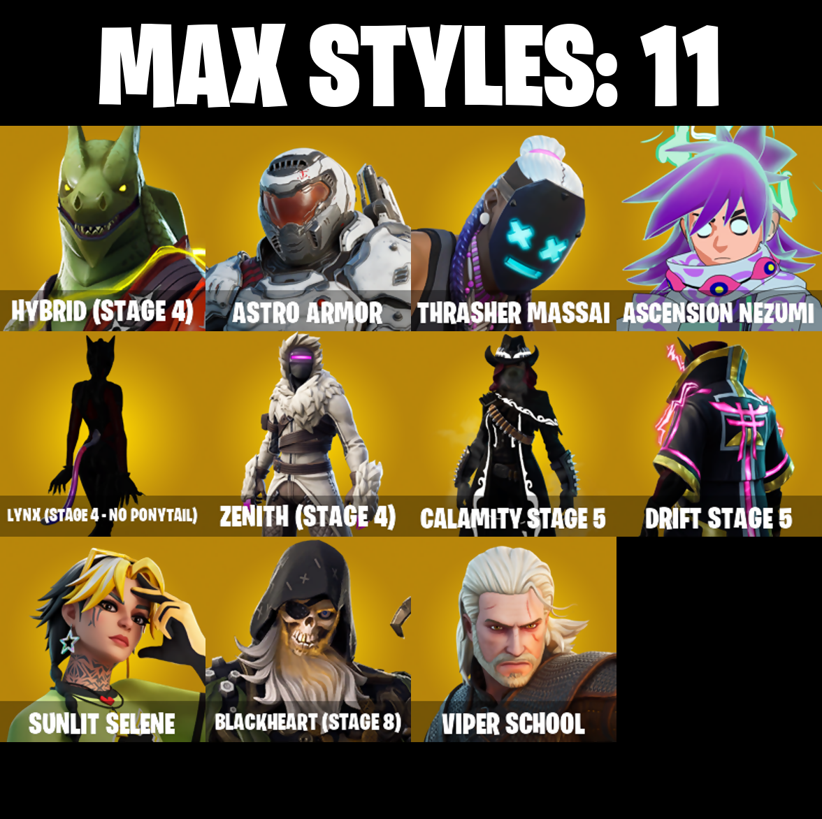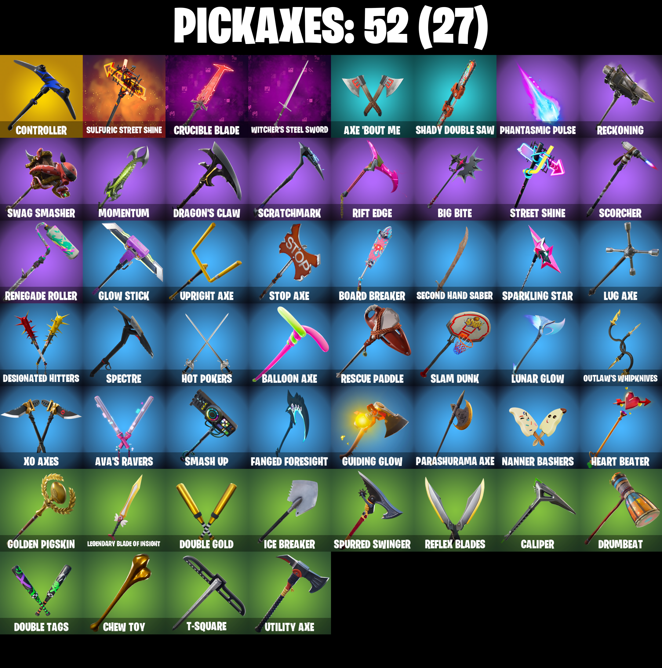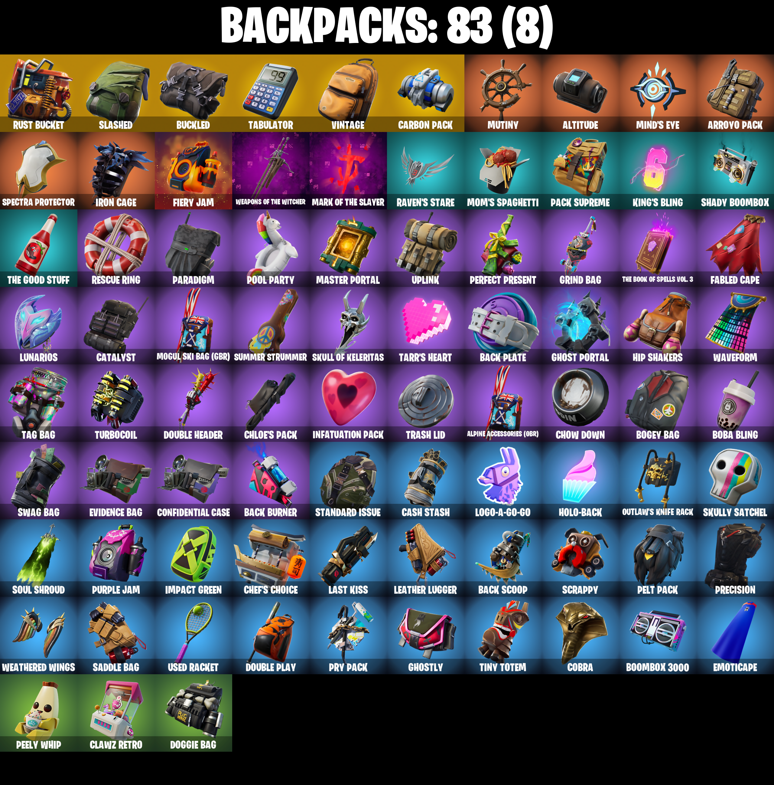 Abstrakt, Aerobic Assassin, Alpine Accessories (Obr), Alpine Ace (GBR), Altitude, Amazing Cube, Archetype, Arroyo Pack, Ascension Nezumi, Aspen, Astro Armor, Ava, Ava's Ravers, Axe 'Bout Me, Back Burner, Back Plate, Back Scoop, Balance Board, Balloon Axe, Ballsy, Banner Trooper, Big Bite, Blackheart, Blackheart (Stage 8), Blue Streak, Blue Team Leader, Board Breaker, Boba Bling, Boba Snack, Bogey Bag, Bonehead, Boombox 3000, Breakin', Breezy, Brush Your Shoulders, Bryce 3000, Buckled, Bullet Rider, Bullseye, Bunker Jonesy, Cacodemon, Calamity, Calamity Stage 5, Caliper, Call Me, Candyman, Carbon Commando, Carbon Pack, Cash Stash, Cat Flip, Catalyst, Cheer Up, Chef's Choice, Chess Master, Chew Toy, Chloe Frazer, Chloe's Pack, Chow Down, Clawz Retro, Cobra, Confidential Case, Conquest, Controller, Covered Crusader, Crossbar Crusher, Crossfire, Crowning Achievement, Crucible Blade, Cruiser, Crusher, DJ Yonder, Dealer's Deck, Denied, Designated Hitters, Doggie Bag, Doggo, Don't Start Now, Doom Slayer, Double Gold, Double Header, Double Play, Double Tags, Downpour, Downshift, Dragon Stance, Dragon's Claw, Dreamflower, Drift, Drift Stage 5, Drop The Bass, Drumbeat, Dusty, Emoticape, End Zone Expert, Evidence Bag, Fable, Fabled Cape, Fancy Feet, Fanged Foresight, Far Out Man, Fastball, Feathered Flyer, Fiery Jam, Flappy, Flip Flyer, Flippin' Away, Gage, Gentleman's Dab, Geralt of Rivia, Get Gone, Ghost Portal, Ghostly, Giddy-Up, Glow Stick, Golden Pigskin, Grind Bag, Guiding Glow, Gumshoe, Gun Show, Hana, Hang Time, Heart Beater, Heart Of A King, Heist, Hello Friend, Helsie, Hey Now!, Hip Shakers, Holo-Back, Hot Marat, Hot Pokers, Hotwire, Huddle Hero, Huntress, Hybrid, Hybrid (Stage 4), Hypnot-Eyes, I'm Diamond, Ice Breaker, Igni Sign, Impact Green, Infatuation Pack, Infield Fly, Inflate-A-Roach, Iron Cage, Isabelle, It's Dynamite!, It's Go Time!, Joy, Jug Band, Jumpshot, Keleritas, King Krab, King's Bling, Kitbash, Komplex, Kyra, Last Kiss, Leather Lugger, Lebron James, Legendary Blade Of Insight, Lil' Mower, Living Large, Logo-A-Go-Go, Lovethorn, Lug Axe, Lunar Glow, Lunar Party, Lunarios, Lynx, Lynx (Stage 4 - No Ponytail), Mahomes Saucy Style, Make It Rain, Mark Of The Slayer, Marshall Never More, Massai, Master Portal, Match Point, Mind's Eye, Mini Slayer Fistbump, Mogul Master (GBR), Mogul Ski Bag (Gbr), Mom's Spaghetti, Momentum, Moonglide, Mutiny, My World, Nanner Bashers, Nathan Drake, Nezumi, Offense Overseer, Orange Justice, Outlaw's Knife Rack, Outlaw's Whipknives, Pack Supreme, Paper Parasol, Paradigm, Parashurama Axe, Peely Whip, Pelt Pack, Perfect Present, Petunia, Phantasmic Pulse, Picnic, Pool Party, Precision, Prickly Patroller, Prodigy, Pry Pack, Pure Salt, Purple Jam, Raise The Roof, Rally Raider, Rap Boy, Raven, Raven Express, Raven's Stare, Real Slim Shady, Reckoning, Recon Ranger, Redline, Reflex Blades, Regal Wave, Renegade Roller, Replay Ranger, Rescue Paddle, Rescue Ring, Respect The Peace, Rift Edge, Riley, Rogue Agent, Rollie, Running Man, Rust Bucket, Rustler, Saddle Bag, Salute, Scorcher, Scorpion, Scrappy, Scratchmark, Second Hand Saber, Selene, Servo, Shady Boombox, Shady Double Saw, Shout!, Siren, Skull Of Keleritas, Skull Trooper, Skully, Skully Satchel, Sky Serpents, Skybound Longboard, Slam Dunk, Slashed, Sleuth, Slim Shady, Slow Clap, Smash Up, Snare Solo, Soul Shroud, Sparkling Star, Sparkplug, Spectra Protector, Spectre, Spike It, Spurred Swinger, Standard Issue, Stop Axe, Street Shine, Sulfuric Street Shine, Sully's "New" Seaplane, Summer Strummer, Sun Tan Specialist, Sunlit Selene, Sushi Master, Swag Bag, Swag Smasher, T-Square, Tabulator, Tag Bag, Tarr's Heart, Tectonic Komplex, The Ace, The Airplane, The Book Of Spells Vol 3, The Dance Laroi, The Good Stuff, The McG, The Peerless Parasol, The Umbrella, Thrasher Massai, Tidy, Tie-Dye Flyer, Tiny Totem, Toasty, Tootsee, Tornado Spin, Touchdown, Toxic Tagger, Trash Lid, Triple Threat, Tune Squad Lebron, Turbocoil, Update Journal, Uplink, Upright Axe, Used Racket, Utility Axe, Vintage, Viper School, Volley Girl, Waveform, Weapons Of The Witcher, Weathered Wings, Wet Paint, Whispering Wind, Whistle Warrior, Wingman, Witcher's Steel Sword, Wolf, Wrangler, XO Axes, Xile, You're Awesome, Zenith, Zenith (Stage 4)