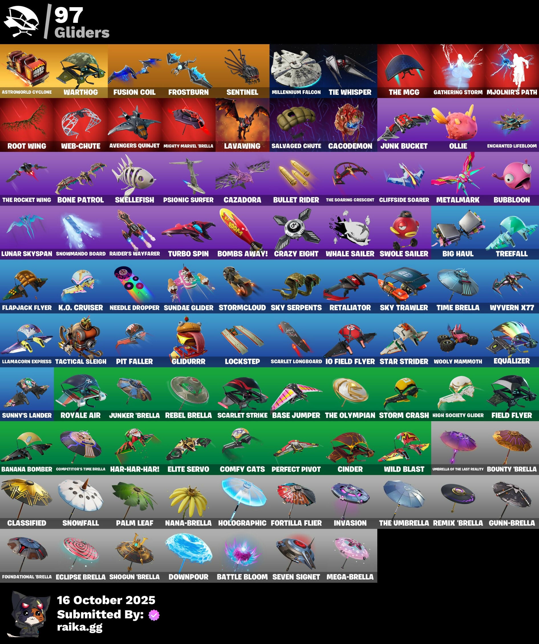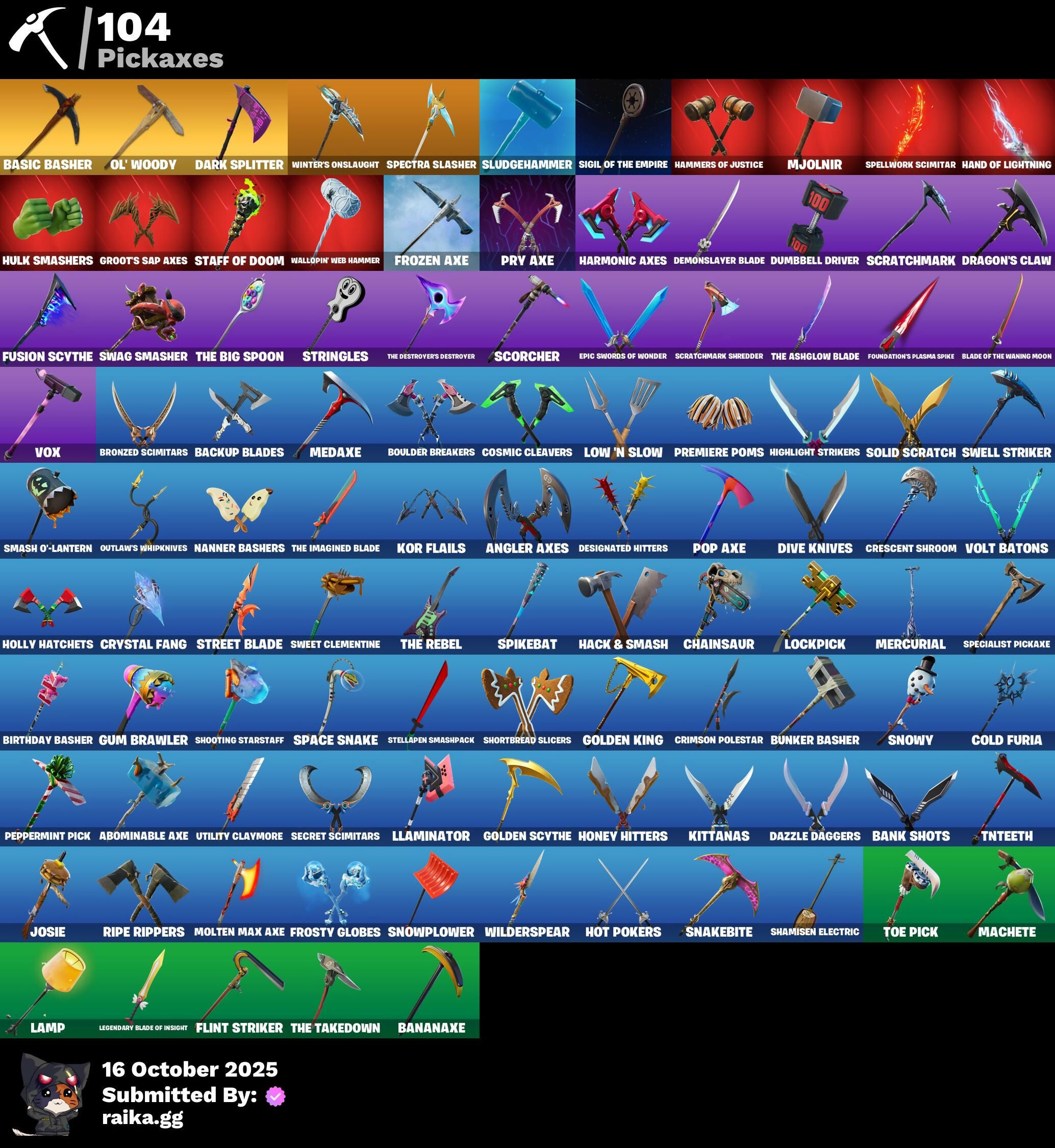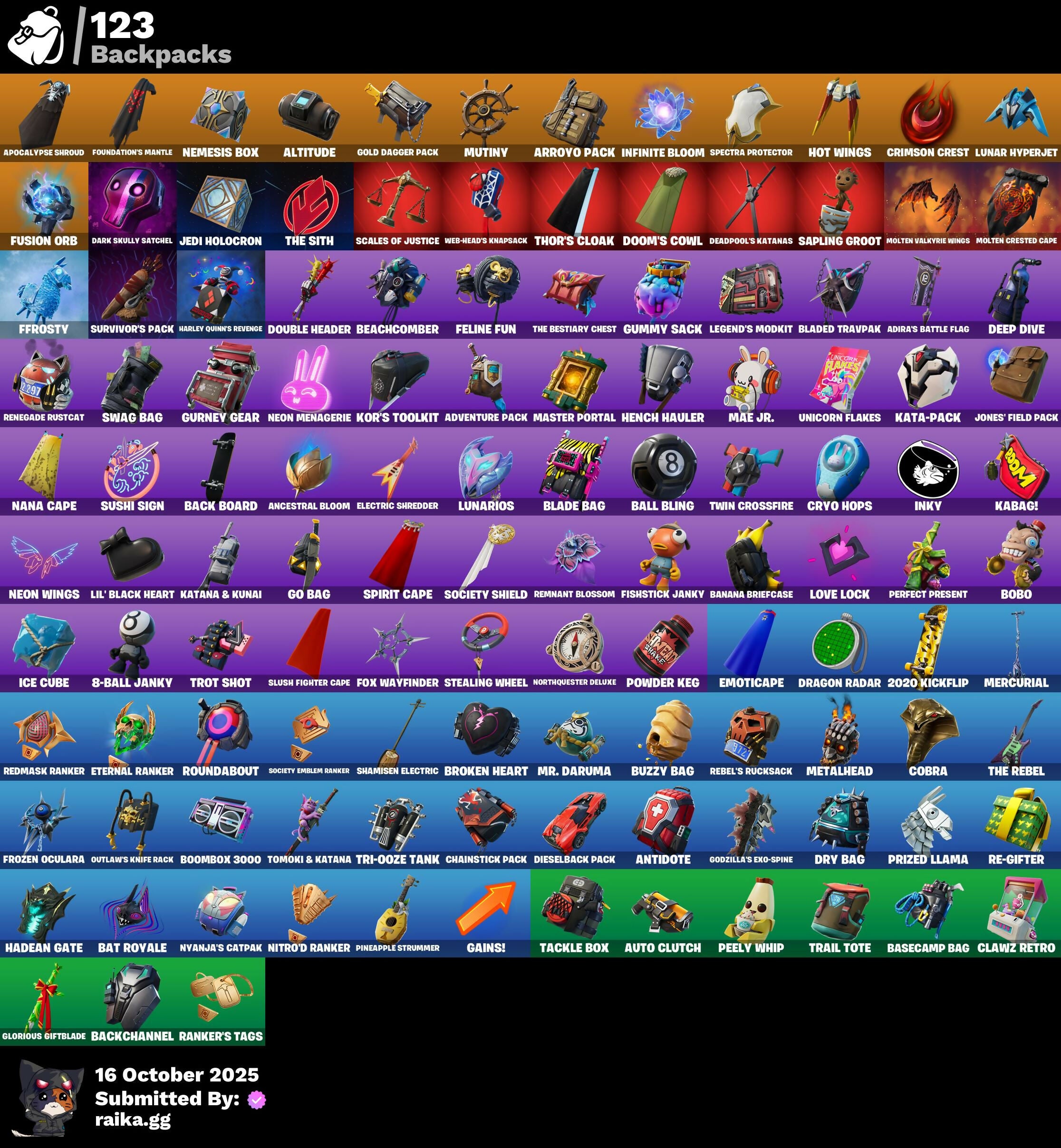 2020 Kickflip, 2022, 8-Ball, 8-Ball Janky, 8-Ball Vs Scratch, A.L.T.E.R., Abominable Axe, Adira's Armor, Adira's Battle Flag, Adventure Pack, Aerial, Aerial Classic, Aerial Swagger, Afterparty, Agent Jones, Agent Nana, Agent Peely, Air Horn, Altitude, Anakin Skywalker, Ancestral Bloom, Angler Axes, Antidote, Apocalypse Shroud, Arcane Steel, Arctic Camo, Ark, Armadillo, Arroyo Pack, Astro Antidote, Astro Assassin, Astro Jack, Astroworld Cyclone, Auto Clutch, Avengers, Avengers Logo, Avengers Quinjet, Back Board, Backchannel, Backup Blades, Bacon, Bag Of Coal, Ball Bling, Banana Bomber, Banana Briefcase, Bananaxe, Bandolette, Bank Shots, Banner, Banner Icon, Base Jumper, Basecamp Bag, Basic Basher, Bat Royale, Bat Signal, Batman, Battle Bloom, Battle Bus Balloon, Battle Call, Battle Mode, Be Seeing You, Be The Mastermind, Beach Chair, Beachcomber, Bear Hug, Beef Blade, Beep Beep, Bees!, Big Guns, Big Haul, Billy Bounce, Birthday Basher, Bitter Sweets, Blackheart, Blade Bag, Blade of the Waning Moon, Bladed Travpak, Blasted, Blinding Lights, Blocko, Bloomsday, Bobo, Boing!, Bombastic Winterfest, Bombs Away!, Bone, Bone Patrol, Boogeyman, Boombox 3000, Boot It, Both Eyes Open, Boulder Breakers, Bounty 'Brella, Brite Bomber, Broken Heart, Bronzed Scimitars, Brutus, Bryce 3000, Bubbloon, Bullet Rider, Bunker Basher, Bunker Jonesy, Burning Dragon, Burpee, Bush Peek, Bushie Bright, Bushranger, Buzzy Bag, Bytes' Sigil, Cacodemon, Calico, Call Me, Cameo, Cameo Vs Chic, Cap Kick, Captain America's Shield, Carbon Scarlet, Cash Grab, Cat Flip, Catalyst, Cazadora, Cerberus Bite, Chainsaur, Chainstick Pack, Chaos Directive, Chapter 2 Season 1 Level 100, Chapter 2 Season 2 Level 100, Charlotte, Charlotte's Logo, Chess Master, Chic, Chillshot, Chimichanga!, Choice Knit, Chomp Cud!!, Choppy, Chromatic, Chrome Marked, Cinder, Classified, Clawz Retro, Clean Sweep, Cliffside Soarer, Cloudburst, Cluck Strut, Cobra, Coconuts, Coin Flip, Cold Furia, Comet, Comfy Cats, Compass, Competitor's Time Brella, Conga, Console Cup, Contour Camo, Corrosive Stripe, Corrupted, Cosmic Cleavers, Count It!, Courageous Mikasa, Cowboy Chat, Crackdown, Crafted Cardboard, Crazy Castle, Crazy Eight, Crescent Shroom, Crimson Crest, Crimson Polestar, Crowning Achievement, Cryo Hops, Crystal Fang, Cuddle Hearts, Cuddle Team Hula, Cursed, Cyclo Curl, D.C. 63, Dagger Dance, Daisies, Dance Mat, Dante, Dark, Dark Skully, Dark Skully Satchel, Dark Splitter, Dazzle Daggers, Deadpool, Deadpool's Katanas, Deep Dive, Deep End, Demogorgon, Demons Beware, Demonslayer Blade, Denim Destiny, Designated Hitters, Determined Renegade, Diamond Hanz, Diamond Shapes, Dieselback Pack, Disco, Dive Knives, Do The 'Split, Doctor Doom, Doggo, Don Of The Wastes, Doom's Cowl, Double Header, Downpour, Doze Dab, Dragon Radar, Dragon Rune Lances, Dragon Scales, Dragon Spirit, Dragon Stance, Dragon's Claw, Driftwood, Drones-Y View, Droop, Dropout, Dry Bag, Dumbbell Driver, Durrr Burger, Dynamite, E.G.O., Eclipse Brella, Electric Shredder, Elite Servo, Ember, Emote Camo, Emoticape, Enchanted Lifebloom, Epic Swords of Wonder, Equalizer, Erisa Alert, Escapees, Eternal Ranker, Evasive Maneuvers, Everything's Fine, Explosion, Eye Of Agamotto, Fabio Sparklemane, Fallen Love Ranger, Falling Leaf, Falling Snow, Fan Attack, Fancy Feet, Fate, Feline Fun, Festive Paper, Ffrosty, Field Flyer, Field Surgeon, Final Harbinger, Fish Hook, Fishbone, Fishstick Janky, Fist, Fizzix, Fizzle, Flapjack Flyer, Flashback Breakdown, Flint Striker, Flippin' Away, Flood, Focused, Foil Flex, Fortilla Flier, Foundation's Mantle, Foundation's Plasma Spike, Foundational, Foundational 'Brella, Fox, Fox Wayfinder, Fright Funk, Frostburn, Frosted, Frostwing, Frosty Globes, Frozen Axe, Frozen Oculata, Frozen Over, Fry Angles, Fusion, Fusion Coil, Fusion Orb, Fusion Scythe, Fusion!, G.O.A.T., GG Ornament, GG Snakes, GG Snowman, Gains!, Gathering Storm, Gear Specialist Maya, Gentleman's Dab, Get Funky, Get Griddy, Gila Classic, Gildedguy, GlidURRR, Glorious Giftblade, Go Bag, Godzilla’s Exo-Spine, Gold Dagger Pack, Gold Touch, Golden Agent, Golden King, Golden Scythe, Golden Shine, Golf Clap, Grav-Fusion, Greed, Groot, Groot Glow, Groot's Sap Axes, Ground Pound, Grriz, Grumpy Tree, Guggi Was Here, Gum Brawler, Gumbo, Gummy Sack, Gunn-Brella, Gunnar's Special, Gurney Gear, Hack & Smash, Hadean Gate, Hades Insignia, Ham, Hammerhead, Hammers of Justice, Hand Signals, Hand of Lightning, Hand of Trace, Hand-Forged, Har-Har-Har!, Harbinger Armor Omegarok, Harbinger Of Victory, Harley Quinn's Revenge, Harlowe, Harmonic Axes, Haute Hustle, Have A Seat, Haven, Heart's Desire, Hello Friend, Hench, Hench Hauler, Here Comes Trubble, Hidden Haven, High Five, High Society Glider, Highlight Strikers, Highwire Hop, Holiday Boxy, Holly Hatchets, Holographic, Honey Hitters, Hope's Look, Hot Pokers, Hot Wings, Hula Hoopin', Hulk Smashers, Hybrid, Hybrid Egg, I Declare!, IDK, IO Field Flyer, Ice Cube, Imagined Edge, Imagined Order, Imperial March, In Her Sights, Indigo Ice, Infinite Bloom, Infinite Dab, Infinity Blade, Inky, Invasion, Iris, It Is Finished, It's... You?, Jack Gourdon, Jazz Hands, Je Suis Montague, Jedi Holocron, Jellyfish, Jennifer Walters, Jet Signals, Jolly Roger, Jones' Field Pack, Jonesy The First, Josie, Journey, Journey Vs Hazard, Jubilation, Jujutsu Kaisen Emblem, Jumbo Popcorn, Jump Jets, Junk Bucket, Junker 'Brella, Jurassically Charged, Just Desserts, Justice Reigns, K.O. Cruiser, Kabag!, Kaboom!, Kata-Pack, Katana & Kunai, Keep It Mello, Kenji, Kit, Kittanas, Knee Slapper, Knight's Helm, Knight's Honor, Kon's Bark, Kor, Kor Flails, Kor's Toolkit, Krisabelle, Kymera Swarm, Laguna, Lamp, Lara Croft, Laugh It Up, Lavawing, Lbc Signature, Leave A Scarr, Legend's Modkit, Legendary Blade of Insight, Lil Split, Lil' Black Heart, Lil' Longboat, Lil' Monster, Lil' Octane, Lil' Shady Mobile, Lithic, Llamacorn Express, Llaminator, Llamistletoe, Lloose Cannon, Lockpick, Lockstep, Lord Vader, Lotus Touch, 