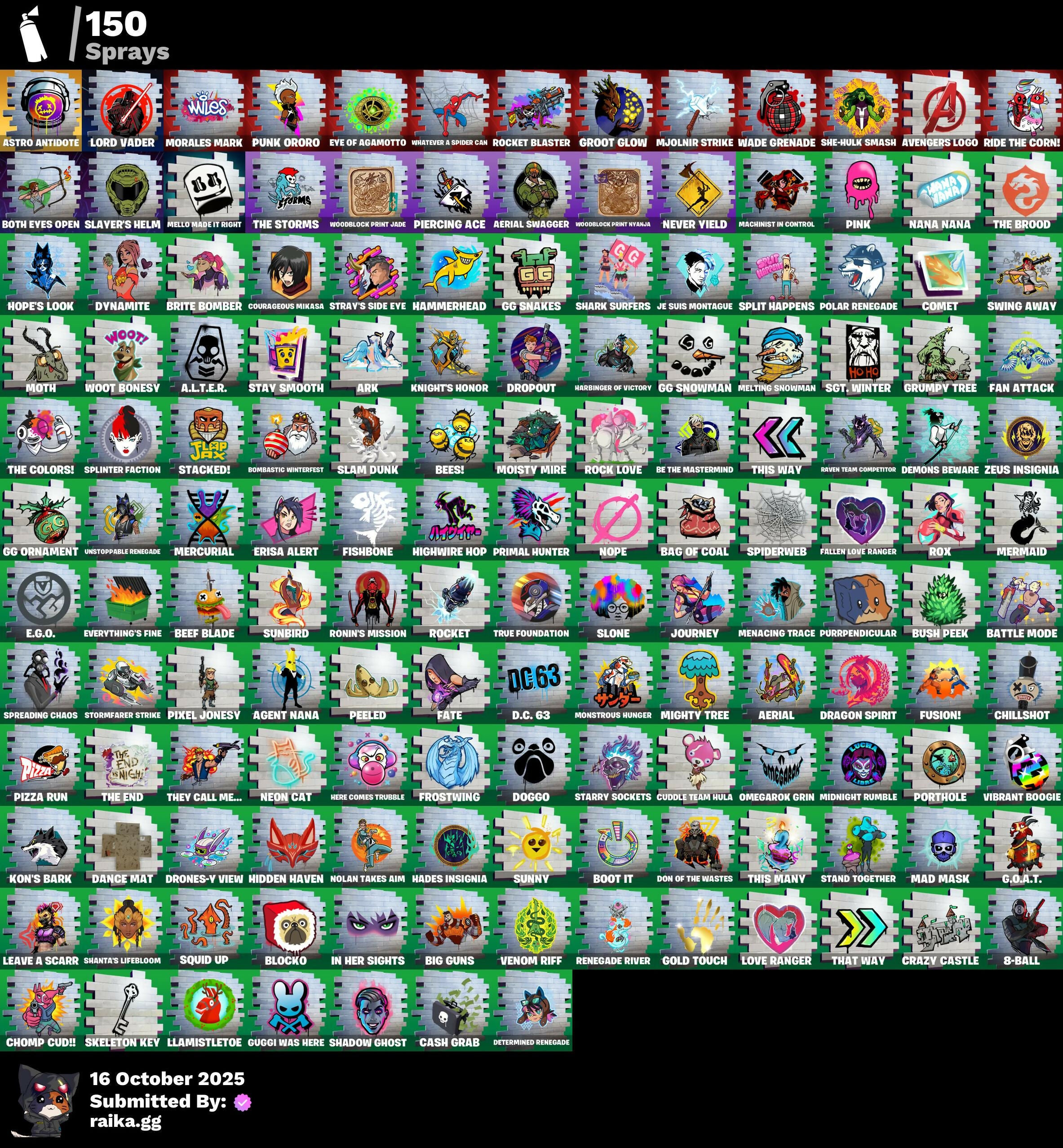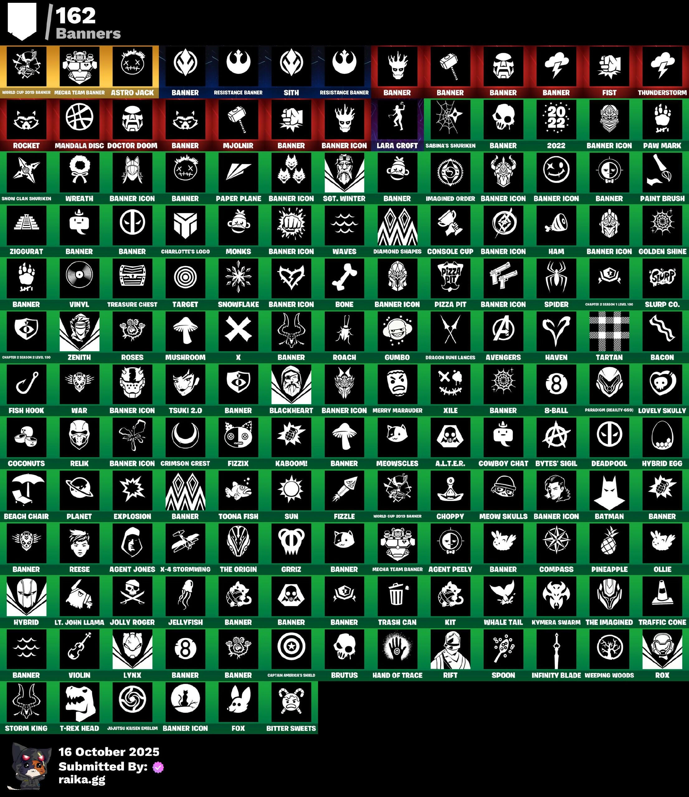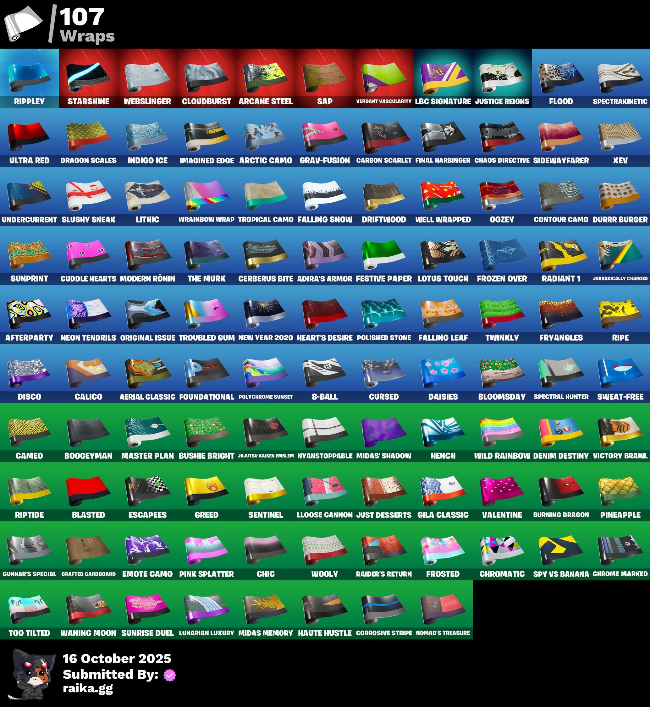 2020 Kickflip, 2022, 8-Ball, 8-Ball Janky, 8-Ball Vs Scratch, A.L.T.E.R., Abominable Axe, Adira's Armor, Adira's Battle Flag, Adventure Pack, Aerial, Aerial Classic, Aerial Swagger, Afterparty, Agent Jones, Agent Nana, Agent Peely, Air Horn, Altitude, Anakin Skywalker, Ancestral Bloom, Angler Axes, Antidote, Apocalypse Shroud, Arcane Steel, Arctic Camo, Ark, Armadillo, Arroyo Pack, Astro Antidote, Astro Assassin, Astro Jack, Astroworld Cyclone, Auto Clutch, Avengers, Avengers Logo, Avengers Quinjet, Back Board, Backchannel, Backup Blades, Bacon, Bag Of Coal, Ball Bling, Banana Bomber, Banana Briefcase, Bananaxe, Bandolette, Bank Shots, Banner, Banner Icon, Base Jumper, Basecamp Bag, Basic Basher, Bat Royale, Bat Signal, Batman, Battle Bloom, Battle Bus Balloon, Battle Call, Battle Mode, Be Seeing You, Be The Mastermind, Beach Chair, Beachcomber, Bear Hug, Beef Blade, Beep Beep, Bees!, Big Guns, Big Haul, Billy Bounce, Birthday Basher, Bitter Sweets, Blackheart, Blade Bag, Blade of the Waning Moon, Bladed Travpak, Blasted, Blinding Lights, Blocko, Bloomsday, Bobo, Boing!, Bombastic Winterfest, Bombs Away!, Bone, Bone Patrol, Boogeyman, Boombox 3000, Boot It, Both Eyes Open, Boulder Breakers, Bounty 'Brella, Brite Bomber, Broken Heart, Bronzed Scimitars, Brutus, Bryce 3000, Bubbloon, Bullet Rider, Bunker Basher, Bunker Jonesy, Burning Dragon, Burpee, Bush Peek, Bushie Bright, Bushranger, Buzzy Bag, Bytes' Sigil, Cacodemon, Calico, Call Me, Cameo, Cameo Vs Chic, Cap Kick, Captain America's Shield, Carbon Scarlet, Cash Grab, Cat Flip, Catalyst, Cazadora, Cerberus Bite, Chainsaur, Chainstick Pack, Chaos Directive, Chapter 2 Season 1 Level 100, Chapter 2 Season 2 Level 100, Charlotte, Charlotte's Logo, Chess Master, Chic, Chillshot, Chimichanga!, Choice Knit, Chomp Cud!!, Choppy, Chromatic, Chrome Marked, Cinder, Classified, Clawz Retro, Clean Sweep, Cliffside Soarer, Cloudburst, Cluck Strut, Cobra, Coconuts, Coin Flip, Cold Furia, Comet, Comfy Cats, Compass, Competitor's Time Brella, Conga, Console Cup, Contour Camo, Corrosive Stripe, Corrupted, Cosmic Cleavers, Count It!, Courageous Mikasa, Cowboy Chat, Crackdown, Crafted Cardboard, Crazy Castle, Crazy Eight, Crescent Shroom, Crimson Crest, Crimson Polestar, Crowning Achievement, Cryo Hops, Crystal Fang, Cuddle Hearts, Cuddle Team Hula, Cursed, Cyclo Curl, D.C. 63, Dagger Dance, Daisies, Dance Mat, Dante, Dark, Dark Skully, Dark Skully Satchel, Dark Splitter, Dazzle Daggers, Deadpool, Deadpool's Katanas, Deep Dive, Deep End, Demogorgon, Demons Beware, Demonslayer Blade, Denim Destiny, Designated Hitters, Determined Renegade, Diamond Hanz, Diamond Shapes, Dieselback Pack, Disco, Dive Knives, Do The 'Split, Doctor Doom, Doggo, Don Of The Wastes, Doom's Cowl, Double Header, Downpour, Doze Dab, Dragon Radar, Dragon Rune Lances, Dragon Scales, Dragon Spirit, Dragon Stance, Dragon's Claw, Driftwood, Drones-Y View, Droop, Dropout, Dry Bag, Dumbbell Driver, Durrr Burger, Dynamite, E.G.O., Eclipse Brella, Electric Shredder, Elite Servo, Ember, Emote Camo, Emoticape, Enchanted Lifebloom, Epic Swords of Wonder, Equalizer, Erisa Alert, Escapees, Eternal Ranker, Evasive Maneuvers, Everything's Fine, Explosion, Eye Of Agamotto, Fabio Sparklemane, Fallen Love Ranger, Falling Leaf, Falling Snow, Fan Attack, Fancy Feet, Fate, Feline Fun, Festive Paper, Ffrosty, Field Flyer, Field Surgeon, Final Harbinger, Fish Hook, Fishbone, Fishstick Janky, Fist, Fizzix, Fizzle, Flapjack Flyer, Flashback Breakdown, Flint Striker, Flippin' Away, Flood, Focused, Foil Flex, Fortilla Flier, Foundation's Mantle, Foundation's Plasma Spike, Foundational, Foundational 'Brella, Fox, Fox Wayfinder, Fright Funk, Frostburn, Frosted, Frostwing, Frosty Globes, Frozen Axe, Frozen Oculata, Frozen Over, Fry Angles, Fusion, Fusion Coil, Fusion Orb, Fusion Scythe, Fusion!, G.O.A.T., GG Ornament, GG Snakes, GG Snowman, Gains!, Gathering Storm, Gear Specialist Maya, Gentleman's Dab, Get Funky, Get Griddy, Gila Classic, Gildedguy, GlidURRR, Glorious Giftblade, Go Bag, Godzilla’s Exo-Spine, Gold Dagger Pack, Gold Touch, Golden Agent, Golden King, Golden Scythe, Golden Shine, Golf Clap, Grav-Fusion, Greed, Groot, Groot Glow, Groot's Sap Axes, Ground Pound, Grriz, Grumpy Tree, Guggi Was Here, Gum Brawler, Gumbo, Gummy Sack, Gunn-Brella, Gunnar's Special, Gurney Gear, Hack & Smash, Hadean Gate, Hades Insignia, Ham, Hammerhead, Hammers of Justice, Hand Signals, Hand of Lightning, Hand of Trace, Hand-Forged, Har-Har-Har!, Harbinger Armor Omegarok, Harbinger Of Victory, Harley Quinn's Revenge, Harlowe, Harmonic Axes, Haute Hustle, Have A Seat, Haven, Heart's Desire, Hello Friend, Hench, Hench Hauler, Here Comes Trubble, Hidden Haven, High Five, High Society Glider, Highlight Strikers, Highwire Hop, Holiday Boxy, Holly Hatchets, Holographic, Honey Hitters, Hope's Look, Hot Pokers, Hot Wings, Hula Hoopin', Hulk Smashers, Hybrid, Hybrid Egg, I Declare!, IDK, IO Field Flyer, Ice Cube, Imagined Edge, Imagined Order, Imperial March, In Her Sights, Indigo Ice, Infinite Bloom, Infinite Dab, Infinity Blade, Inky, Invasion, Iris, It Is Finished, It's... You?, Jack Gourdon, Jazz Hands, Je Suis Montague, Jedi Holocron, Jellyfish, Jennifer Walters, Jet Signals, Jolly Roger, Jones' Field Pack, Jonesy The First, Josie, Journey, Journey Vs Hazard, Jubilation, Jujutsu Kaisen Emblem, Jumbo Popcorn, Jump Jets, Junk Bucket, Junker 'Brella, Jurassically Charged, Just Desserts, Justice Reigns, K.O. Cruiser, Kabag!, Kaboom!, Kata-Pack, Katana & Kunai, Keep It Mello, Kenji, Kit, Kittanas, Knee Slapper, Knight's Helm, Knight's Honor, Kon's Bark, Kor, Kor Flails, Kor's Toolkit, Krisabelle, Kymera Swarm, Laguna, Lamp, Lara Croft, Laugh It Up, Lavawing, Lbc Signature, Leave A Scarr, Legend's Modkit, Legendary Blade of Insight, Lil Split, Lil' Black Heart, Lil' Longboat, Lil' Monster, Lil' Octane, Lil' Shady Mobile, Lithic, Llamacorn Express, Llaminator, Llamistletoe, Lloose Cannon, Lockpick, Lockstep, Lord Vader, Lotus Touch, 