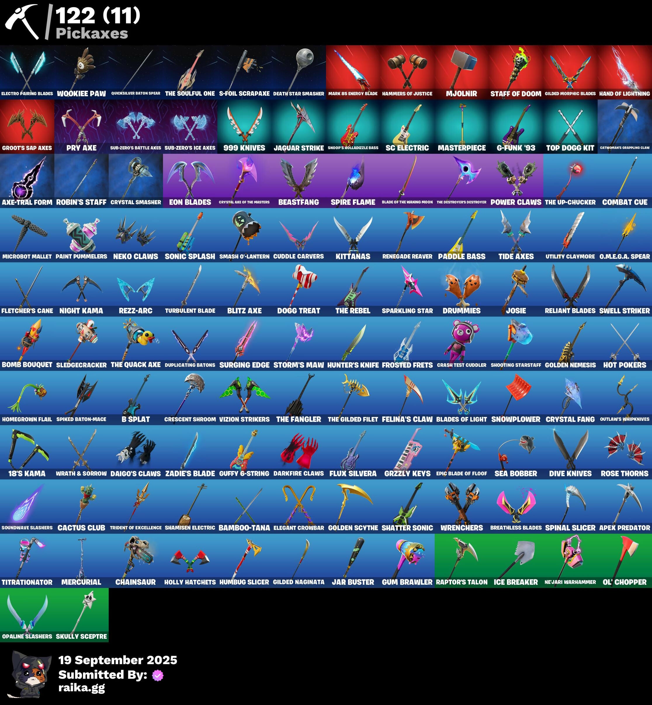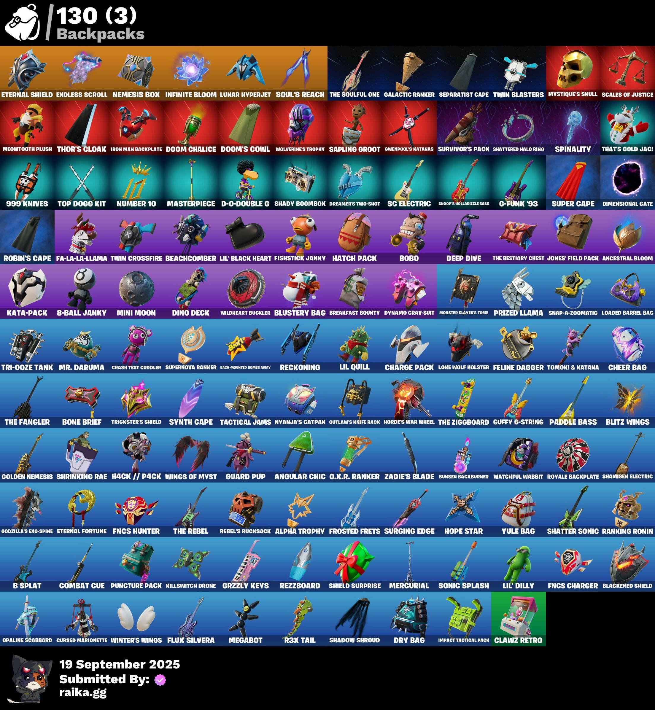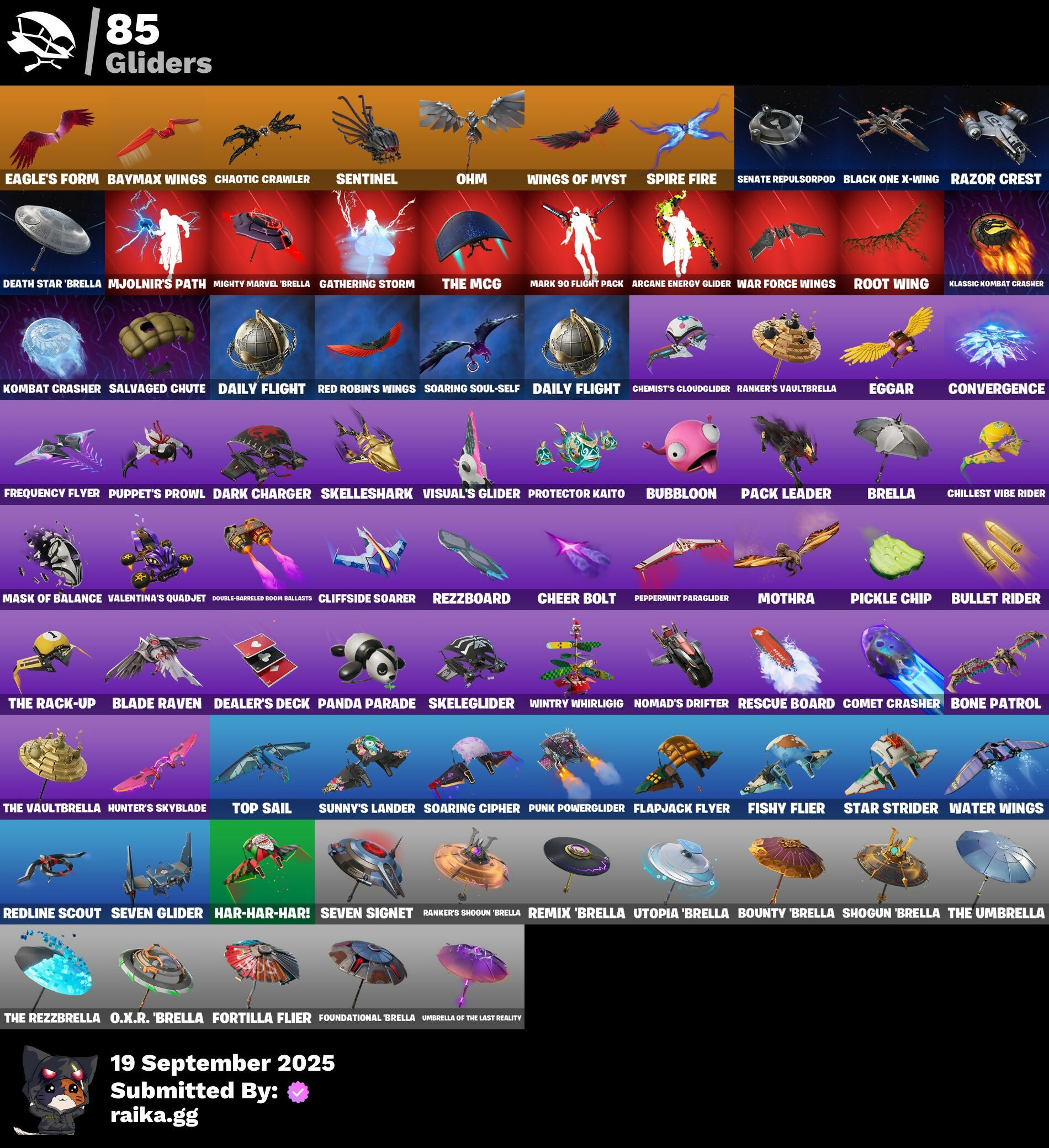 1-Ball, 18's Kama, 8-Ball Janky, 999 Knives, Aces Wild, Acolyte's Curse, Adeline, Aerial Classic, Aerial Swagger, Afterparty, Agent Jones, Agent Jones (Jump 31), Air Shredder, Alpha Trophy, Ancestral Bloom, Andy Fangerson, Angular Chic, Apex Predator, Appeeling Drive, Aquaman, Arcane Energy Glider, Arcane Research, Arcane Steel, Arctic Achiever, Arctic Adeline, Auntie Dot, Aura, Axe-Tral Form, Axo’s Big Moment, Azarath Metrion Zinthos!, B Splat, Babygirl!!!, Bamboo-Tana, Baron Kane, Baron's Hoard, Battle Blessing, Battle Mode, Bawk Off, Baymax Wings, Beachcomber, Bean Bag, Bear Hug, Beastfang, Beef Blade, Belt It!, Berserker Barrage!, Bi-Han, Big Dill, Bike To Go, Birdarang Flourish, Black Leader, Black One X-Wing, Blackened Shield, Blade Raven, Blade of The Waning Moon, Blades of Light, Blitz Axe, Blitz Wings, Blustery Bag, Bobo, Bomb Bouquet, Bombastic Winterfest, Bone Brief, Bone Patrol, Boogie Down, Boomin', Boots N' Cats, Both Eyes Open, Bounty 'Brella, Breakfast Bounty, Breathless Blades, Brella, Bubloon, Build Up, Bullet Rider, Bunsen Backburner, Bytes' Sigil, C'Mere, Cactus Club, Cap Attack, Cardistry, Cassidy Quinn, Catwoman's Grappling Claw, Chainsaur, Chalked Up 1-Ball, Chaos Directive, Chaos Director, Chaotic Crawler, Charge Pack, Cheer Bag, Cheer Bolt, Chemist's Cloudglider, Chigusa, Chill Challenger, Chillest Vibe Rider, Choice Knit, Chomp Cud!!, Choose Naughty, Choppy, Chrome Marked, Clawz Retro, Clean Sweep, Cliffside Soarer, Cloudburst, Cluck, Cluck (Slurpy), Clucking Mad, Combat Cue, Come Get Me!, Comet Crasher, Confident Iridia, Controlled Chaos, Convergence, Courageous Mikasa, Crabby King, Crash Test Cuddler, Crashed Chiller, Crescent Shroom, Cross Your Heart, Cross’ Grand Entrance, Crowning Achievement, Crystal Axe of The Masters, Crystal Fang, Crystal Smasher, Crystal’s Run, Cube Marking, Cuddle Carvers, Cuddles Garden, Cursed Marionette, Cyclo Curl, D-O-Double G, D.C. 63, Daigo, Daigo's Claws, Daigo’s Stance, Daily Flight, Dark Charger, Dark Doggo, Darkfire Claws, Daughter of Trigon, Deal'em Cassidy Quinn, Dealer's Deck, Death Star 'Brella, Death Star Smasher, Deep Dive, Demon Hunter Hope, Demons Beware, Determined Kendo, Dill With It, Dillicious, Dillinger The Gherk, Dimensional Gate, Dino Deck, Diva’s Grin, Dive Knives, Doctor Doom, Doctor Doom (God Emperor), Dogg Treat, Dolphin, Doom Chalice, Doom's Cowl, Double-Barreled Boom Ballasts, Double-Suited Queen, Dreamer's Two-Shot, Dropout, Drummies, Dry Bag, Duelist's Card Trick, Dupli-Kate, Duplicating Batons, Duplikates, Dusk Knight, Dyna-Boom!, Dynamo, Dynamo Grav-Suit, Dynamo TNTina, Dynamo Tntoon-A, Eagle's Form, Eggar, Electro Pairing Blades, Elegant Crowbar, Emma’s Influence, Endless Scroll, Energized Godzilla, Eon Blades, Epic Blade of Floof, Eternal Emblem, Eternal Fortune, Eternal Knight, Eternal Shield, Evasive Maneuvers, Evolved Heat Ray, Eye of Agamotto, FNCS Charger, FNCS Hunter, Fa-La-La-Llama, Fade, Fade Out, Felina, Felina's Claw, Feline Dagger, Ferocious, Fishstick Janky, Fishy Flier, Fist, Fist Bump, Fixer, Flapjack Flyer, Fletcher Kane, Fletcher's Cane, Flippin' Away, Flux Silvera, Fortilla Flier, Foundational 'Brella, Frequency Flyer, Frosted Frets, Frozen Treat Cart, Full Moon Fletcher Kane, Fully Charged Drift, G-Funk '93, GG Cuddlez, Galactic Ranker, Gangnam Style, Gathering Storm, Gilded Morphic Blades, Gilded Naginata, Glass Bridge Survivor, Glyph Master, Godzilla Awaits, Godzilla Evolved, Godzilla's Exo-Spine, Golden Ghoul, Golden Grin, Golden Nemesis, Golden Scythe, Golden Wolf, Good Guy, Gothic Morgan, Grav-Fusion, Gringle Gift, Groot, Groot (Silver Foil), Groot Glow, Groots Sap Axes, Groovy!, Grzzly Keys, Guard Pup, Guardian Jade, Guffy 6-String, Guggi Was Here, Gum Brawler, Gumbo, Gunnar's Special, Gunslinger Outlaw Midas, Gwenpool's Katanas, Gwetterman Jacket, H4ck // P4ck, Hammerhead, Hammers of Justice, Hand of Lightning, Happy, Har-Har-Har!, Harmonizer, Hatch Pack, Haven, Haylee & The Beast, Haylee Skye, Heart's Desire, Heat Vision Hunter, Heavy Metal Omega, Helichopper, Hero Baymax, Heroic Baymax, Holly Hatchets, Homegrown Flail, Hope Star, Horde's War Wheel, Hot Pokers, Hot ‘N Sour, Howlin’, Humbug Slicer, Hunter's Arsenal, Hunter's Knife, Hunter's Skyblade, Hype!, Ice Breaker, Idol Lights, Imagined Edge, Imagined Order, Impact Tactical Pack, In Her Sights, Industrious, Infinite Bloom, Infinite Dab, Infinite Swirl, Intentions Unknown, Inventor's Choice, Invisible Cut, Iridia Vayne, Iron Man, Iron Man Backplate, It's Chemistry!, It's... You?, I’m Ready!, Jade, Jade’s Curse, Jaguar Strike, Jar Buster, Jelly Jammin’, Jennifer Walters, Jet Signals, Jones' Field Pack, Josie, Joss, Joss’ Chaos, Jules, Jules' Mask, Jurassically Charged, Ka Boom!, Ka-Choom!, Kablammo!, Kata-Pack, Keisha Cross, Kendo, Kenshi Yonezu, Keyed Up, Killswitch, Killswitch Drone, Killswitch Insignia, Killswitch Ready, Killswitch’s Mission, King of the Outlaws, Kintsugi Daigo, Kit, Kittanas, Klassic Kombat Crasher, Knight’s Helm, Kombat Crasher, Krisabelle, Kryptonian Crest, Kymera Swarm, Kyran Aryk, LBC '93 Dogg, LBC Signature, Lady of Cranes, Lara Croft, Lara Croft (Gold Anniversary), Leafy Longboardin', Lightrider, Lightrider Insignia, Lil Quill, Lil' Black Heart, Lil' Dilly, Lil' Godzilla Attack, Lil' Prancer, Lionel Messi, Loaded Barrel Bag, Lobby Classic, Lone Wolf Holster, Love It!, Lucky Nyanja, Lunar Hyperjet, Lunarian Luxury, Mancake, Mandalorian, Mark 85 Energy Blade, Mark 90 Flight Pack, Mask Of Balance, Masked, Master Engineer, Masterpiece, Mave, Mave (Reactive Hair Off), Mayhem, Mecha Fish, Mecha Wrecks, Megabot, Megumi, Meowabunga!, Meowdas, Meowdas Mark, Meowstermind, Meowtooth Plush, Mercurial, Microbot Mallet, Midas' Shadow, Midnight Mycology, Midnight Skye, Mighty Marvel 'Brella, Minato Hakaru, Mini Dogfight, Mini Moon, Mjolnir, Mjolnir Strike, Mjolnir's Path, Modern Rōnin, Monster Slayer's Tome, Morales Mark, Morgan Myst, Morgan Myst Insignia, Morphic Blue, Mothra, M