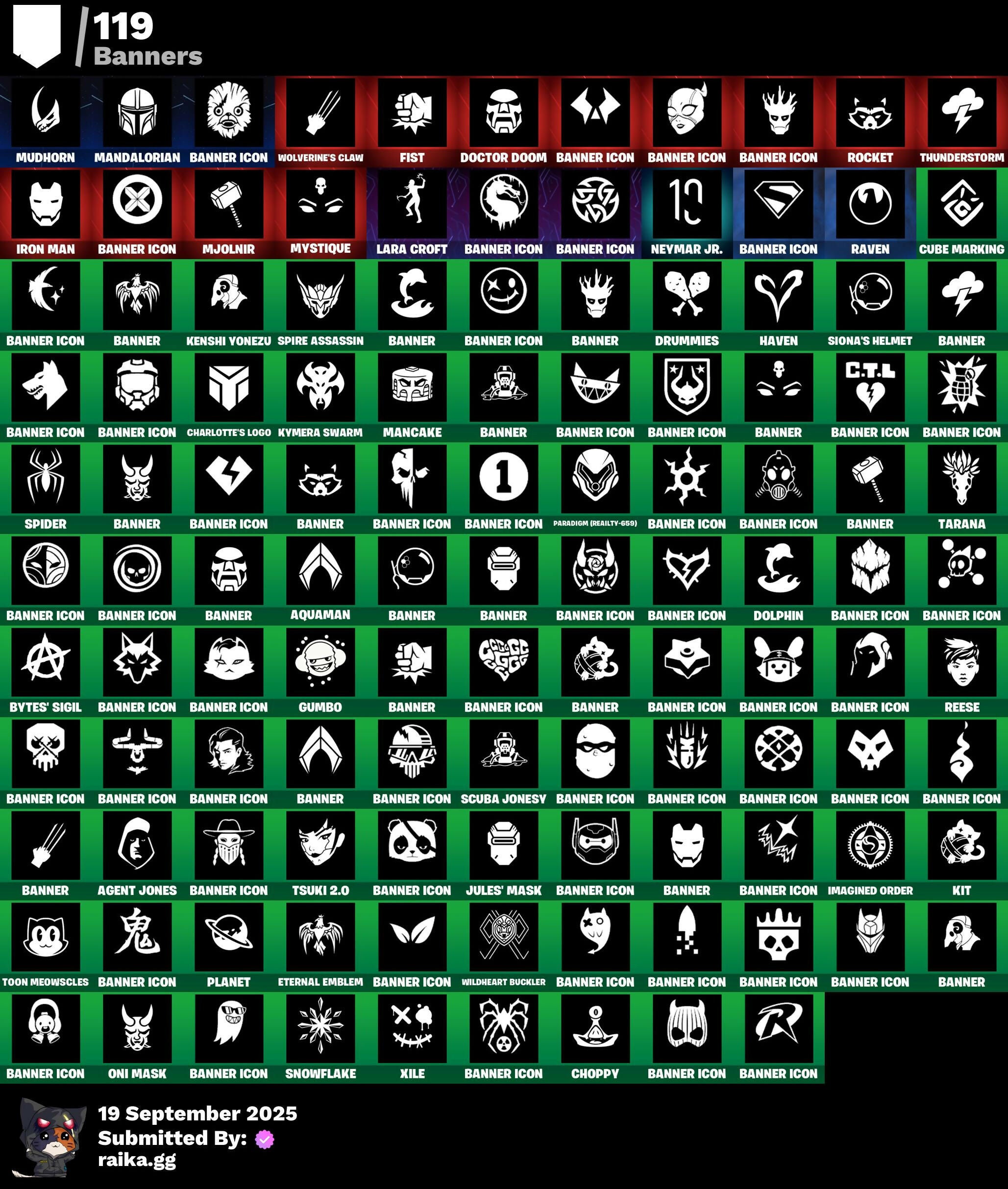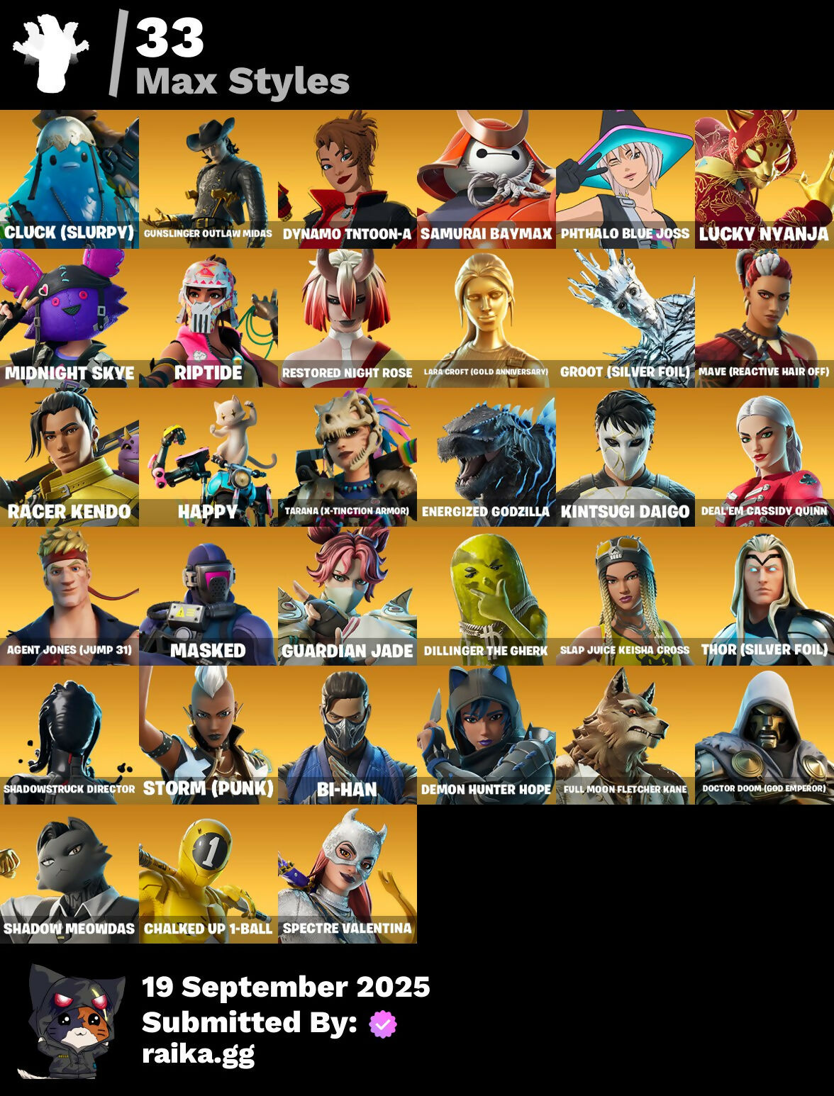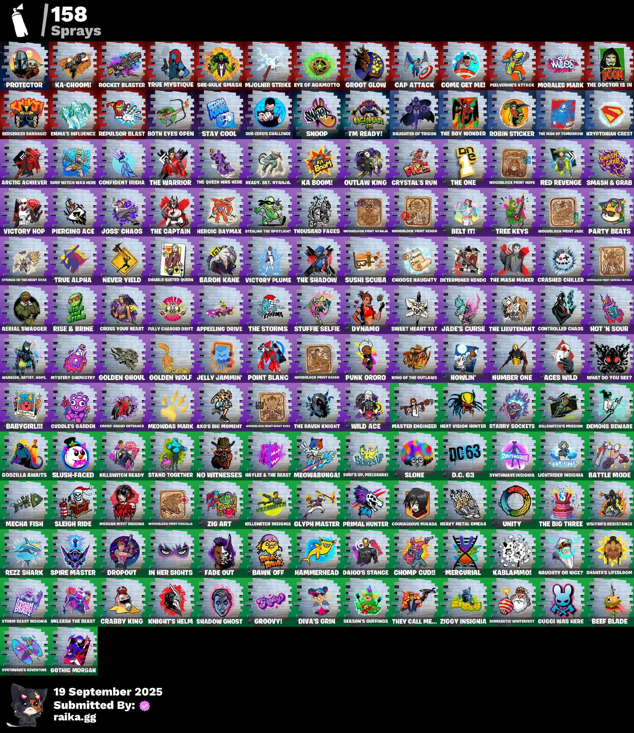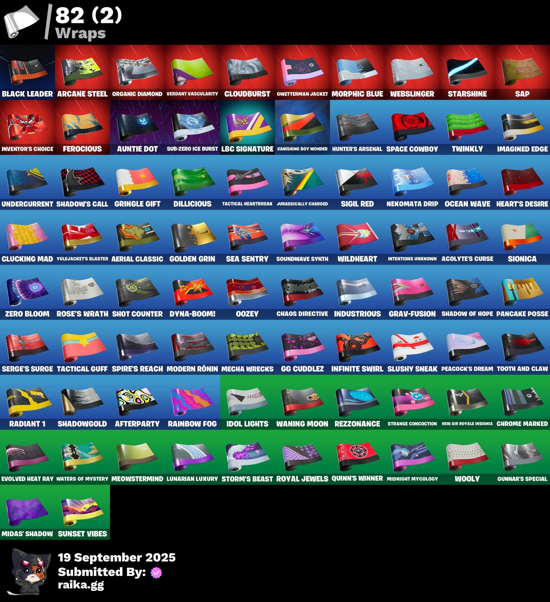 1-Ball, 18's Kama, 8-Ball Janky, 999 Knives, Aces Wild, Acolyte's Curse, Adeline, Aerial Classic, Aerial Swagger, Afterparty, Agent Jones, Agent Jones (Jump 31), Air Shredder, Alpha Trophy, Ancestral Bloom, Andy Fangerson, Angular Chic, Apex Predator, Appeeling Drive, Aquaman, Arcane Energy Glider, Arcane Research, Arcane Steel, Arctic Achiever, Arctic Adeline, Auntie Dot, Aura, Axe-Tral Form, Axo’s Big Moment, Azarath Metrion Zinthos!, B Splat, Babygirl!!!, Bamboo-Tana, Baron Kane, Baron's Hoard, Battle Blessing, Battle Mode, Bawk Off, Baymax Wings, Beachcomber, Bean Bag, Bear Hug, Beastfang, Beef Blade, Belt It!, Berserker Barrage!, Bi-Han, Big Dill, Bike To Go, Birdarang Flourish, Black Leader, Black One X-Wing, Blackened Shield, Blade Raven, Blade of The Waning Moon, Blades of Light, Blitz Axe, Blitz Wings, Blustery Bag, Bobo, Bomb Bouquet, Bombastic Winterfest, Bone Brief, Bone Patrol, Boogie Down, Boomin', Boots N' Cats, Both Eyes Open, Bounty 'Brella, Breakfast Bounty, Breathless Blades, Brella, Bubloon, Build Up, Bullet Rider, Bunsen Backburner, Bytes' Sigil, C'Mere, Cactus Club, Cap Attack, Cardistry, Cassidy Quinn, Catwoman's Grappling Claw, Chainsaur, Chalked Up 1-Ball, Chaos Directive, Chaos Director, Chaotic Crawler, Charge Pack, Cheer Bag, Cheer Bolt, Chemist's Cloudglider, Chigusa, Chill Challenger, Chillest Vibe Rider, Choice Knit, Chomp Cud!!, Choose Naughty, Choppy, Chrome Marked, Clawz Retro, Clean Sweep, Cliffside Soarer, Cloudburst, Cluck, Cluck (Slurpy), Clucking Mad, Combat Cue, Come Get Me!, Comet Crasher, Confident Iridia, Controlled Chaos, Convergence, Courageous Mikasa, Crabby King, Crash Test Cuddler, Crashed Chiller, Crescent Shroom, Cross Your Heart, Cross’ Grand Entrance, Crowning Achievement, Crystal Axe of The Masters, Crystal Fang, Crystal Smasher, Crystal’s Run, Cube Marking, Cuddle Carvers, Cuddles Garden, Cursed Marionette, Cyclo Curl, D-O-Double G, D.C. 63, Daigo, Daigo's Claws, Daigo’s Stance, Daily Flight, Dark Charger, Dark Doggo, Darkfire Claws, Daughter of Trigon, Deal'em Cassidy Quinn, Dealer's Deck, Death Star 'Brella, Death Star Smasher, Deep Dive, Demon Hunter Hope, Demons Beware, Determined Kendo, Dill With It, Dillicious, Dillinger The Gherk, Dimensional Gate, Dino Deck, Diva’s Grin, Dive Knives, Doctor Doom, Doctor Doom (God Emperor), Dogg Treat, Dolphin, Doom Chalice, Doom's Cowl, Double-Barreled Boom Ballasts, Double-Suited Queen, Dreamer's Two-Shot, Dropout, Drummies, Dry Bag, Duelist's Card Trick, Dupli-Kate, Duplicating Batons, Duplikates, Dusk Knight, Dyna-Boom!, Dynamo, Dynamo Grav-Suit, Dynamo TNTina, Dynamo Tntoon-A, Eagle's Form, Eggar, Electro Pairing Blades, Elegant Crowbar, Emma’s Influence, Endless Scroll, Energized Godzilla, Eon Blades, Epic Blade of Floof, Eternal Emblem, Eternal Fortune, Eternal Knight, Eternal Shield, Evasive Maneuvers, Evolved Heat Ray, Eye of Agamotto, FNCS Charger, FNCS Hunter, Fa-La-La-Llama, Fade, Fade Out, Felina, Felina's Claw, Feline Dagger, Ferocious, Fishstick Janky, Fishy Flier, Fist, Fist Bump, Fixer, Flapjack Flyer, Fletcher Kane, Fletcher's Cane, Flippin' Away, Flux Silvera, Fortilla Flier, Foundational 'Brella, Frequency Flyer, Frosted Frets, Frozen Treat Cart, Full Moon Fletcher Kane, Fully Charged Drift, G-Funk '93, GG Cuddlez, Galactic Ranker, Gangnam Style, Gathering Storm, Gilded Morphic Blades, Gilded Naginata, Glass Bridge Survivor, Glyph Master, Godzilla Awaits, Godzilla Evolved, Godzilla's Exo-Spine, Golden Ghoul, Golden Grin, Golden Nemesis, Golden Scythe, Golden Wolf, Good Guy, Gothic Morgan, Grav-Fusion, Gringle Gift, Groot, Groot (Silver Foil), Groot Glow, Groots Sap Axes, Groovy!, Grzzly Keys, Guard Pup, Guardian Jade, Guffy 6-String, Guggi Was Here, Gum Brawler, Gumbo, Gunnar's Special, Gunslinger Outlaw Midas, Gwenpool's Katanas, Gwetterman Jacket, H4ck // P4ck, Hammerhead, Hammers of Justice, Hand of Lightning, Happy, Har-Har-Har!, Harmonizer, Hatch Pack, Haven, Haylee & The Beast, Haylee Skye, Heart's Desire, Heat Vision Hunter, Heavy Metal Omega, Helichopper, Hero Baymax, Heroic Baymax, Holly Hatchets, Homegrown Flail, Hope Star, Horde's War Wheel, Hot Pokers, Hot ‘N Sour, Howlin’, Humbug Slicer, Hunter's Arsenal, Hunter's Knife, Hunter's Skyblade, Hype!, Ice Breaker, Idol Lights, Imagined Edge, Imagined Order, Impact Tactical Pack, In Her Sights, Industrious, Infinite Bloom, Infinite Dab, Infinite Swirl, Intentions Unknown, Inventor's Choice, Invisible Cut, Iridia Vayne, Iron Man, Iron Man Backplate, It's Chemistry!, It's... You?, I’m Ready!, Jade, Jade’s Curse, Jaguar Strike, Jar Buster, Jelly Jammin’, Jennifer Walters, Jet Signals, Jones' Field Pack, Josie, Joss, Joss’ Chaos, Jules, Jules' Mask, Jurassically Charged, Ka Boom!, Ka-Choom!, Kablammo!, Kata-Pack, Keisha Cross, Kendo, Kenshi Yonezu, Keyed Up, Killswitch, Killswitch Drone, Killswitch Insignia, Killswitch Ready, Killswitch’s Mission, King of the Outlaws, Kintsugi Daigo, Kit, Kittanas, Klassic Kombat Crasher, Knight’s Helm, Kombat Crasher, Krisabelle, Kryptonian Crest, Kymera Swarm, Kyran Aryk, LBC '93 Dogg, LBC Signature, Lady of Cranes, Lara Croft, Lara Croft (Gold Anniversary), Leafy Longboardin', Lightrider, Lightrider Insignia, Lil Quill, Lil' Black Heart, Lil' Dilly, Lil' Godzilla Attack, Lil' Prancer, Lionel Messi, Loaded Barrel Bag, Lobby Classic, Lone Wolf Holster, Love It!, Lucky Nyanja, Lunar Hyperjet, Lunarian Luxury, Mancake, Mandalorian, Mark 85 Energy Blade, Mark 90 Flight Pack, Mask Of Balance, Masked, Master Engineer, Masterpiece, Mave, Mave (Reactive Hair Off), Mayhem, Mecha Fish, Mecha Wrecks, Megabot, Megumi, Meowabunga!, Meowdas, Meowdas Mark, Meowstermind, Meowtooth Plush, Mercurial, Microbot Mallet, Midas' Shadow, Midnight Mycology, Midnight Skye, Mighty Marvel 'Brella, Minato Hakaru, Mini Dogfight, Mini Moon, Mjolnir, Mjolnir Strike, Mjolnir's Path, Modern Rōnin, Monster Slayer's Tome, Morales Mark, Morgan Myst, Morgan Myst Insignia, Morphic Blue, Mothra, M