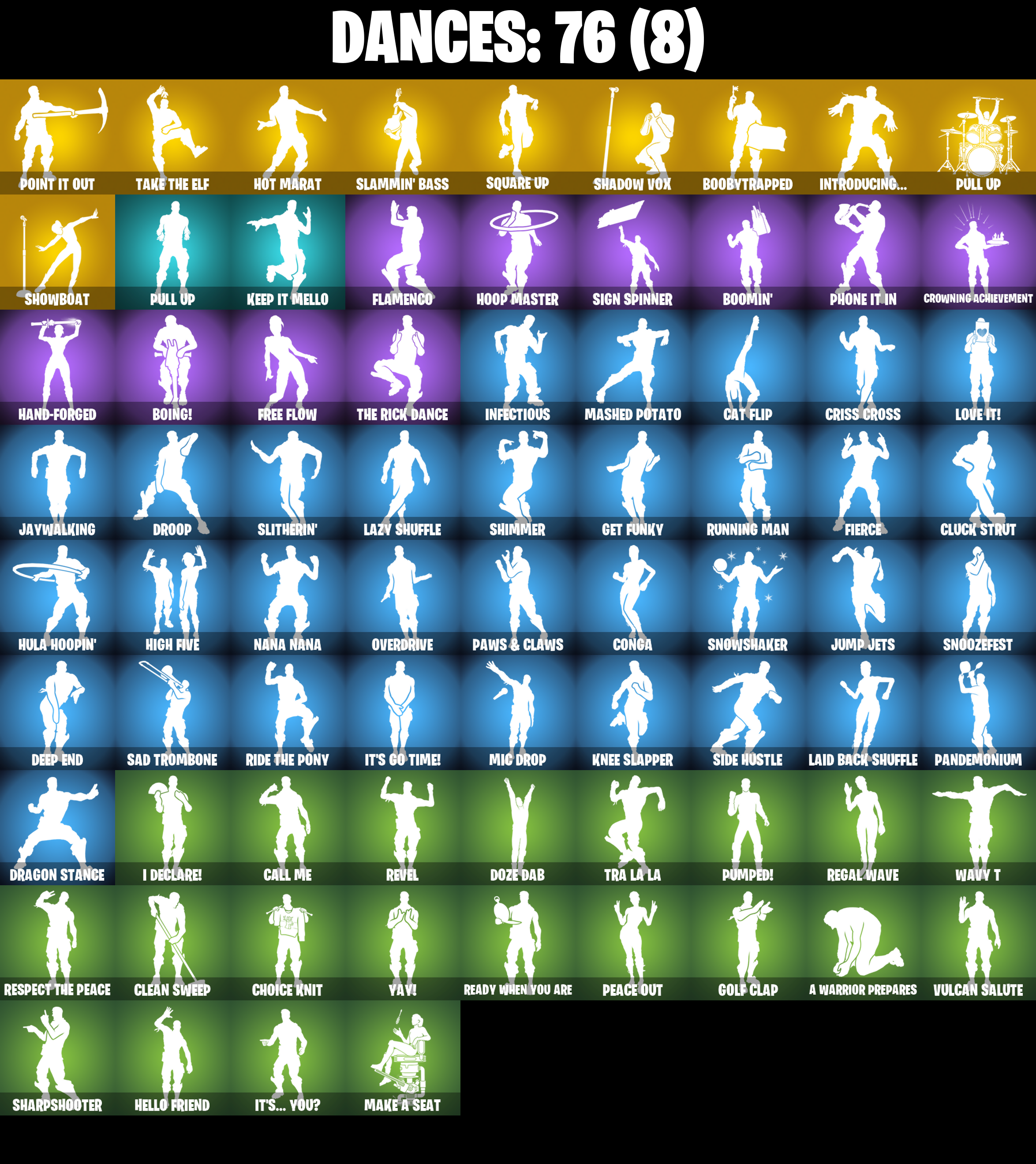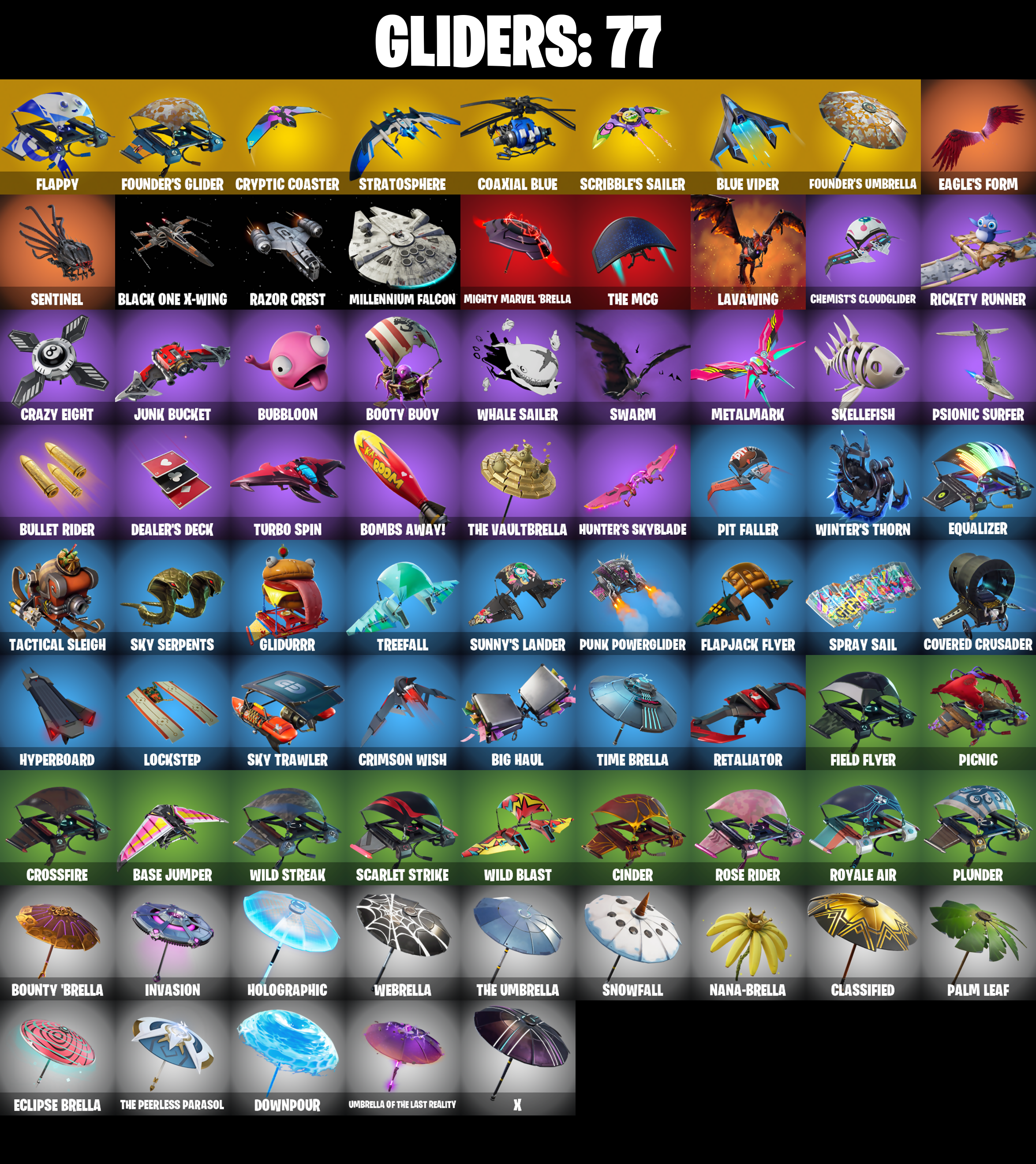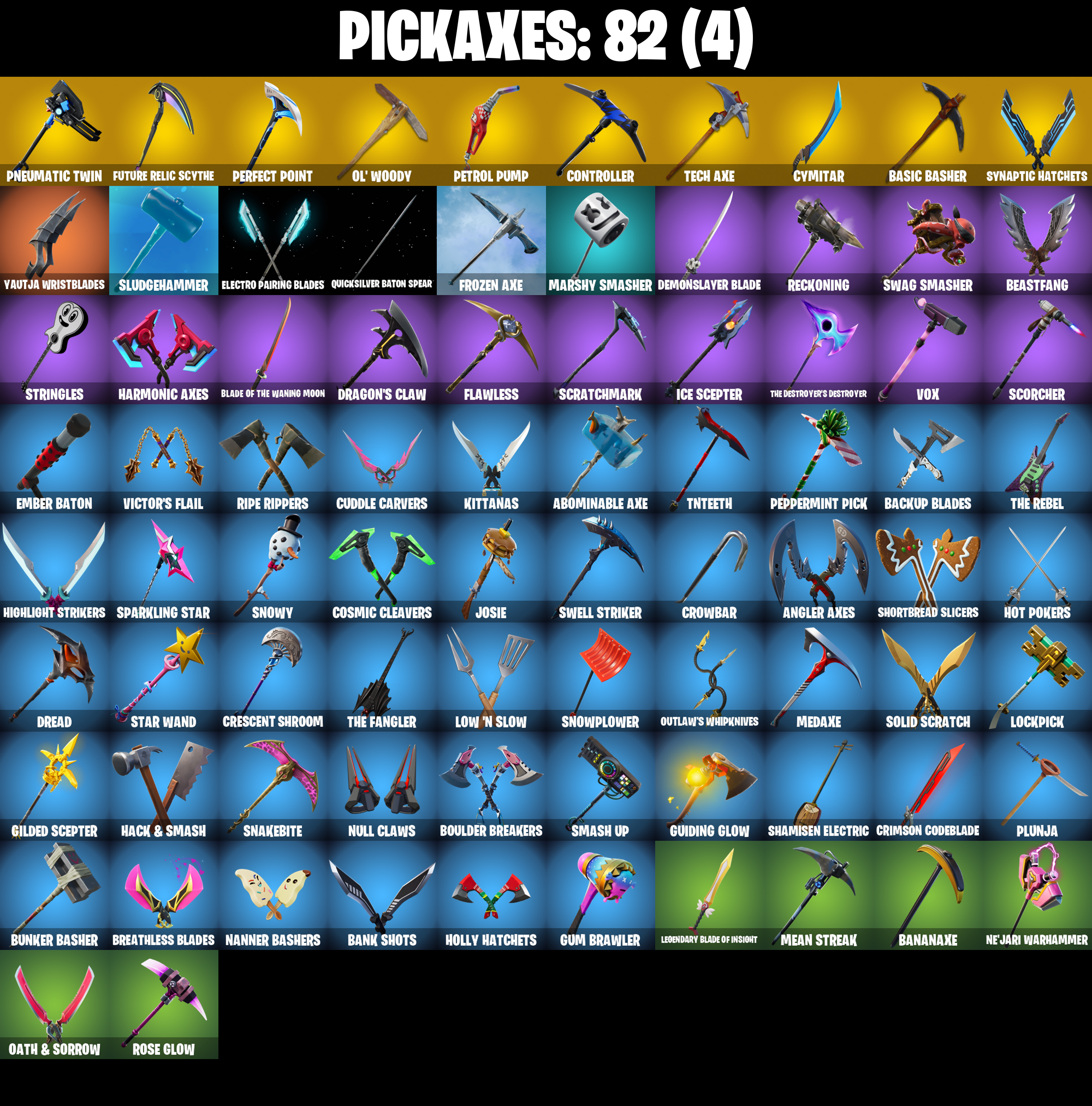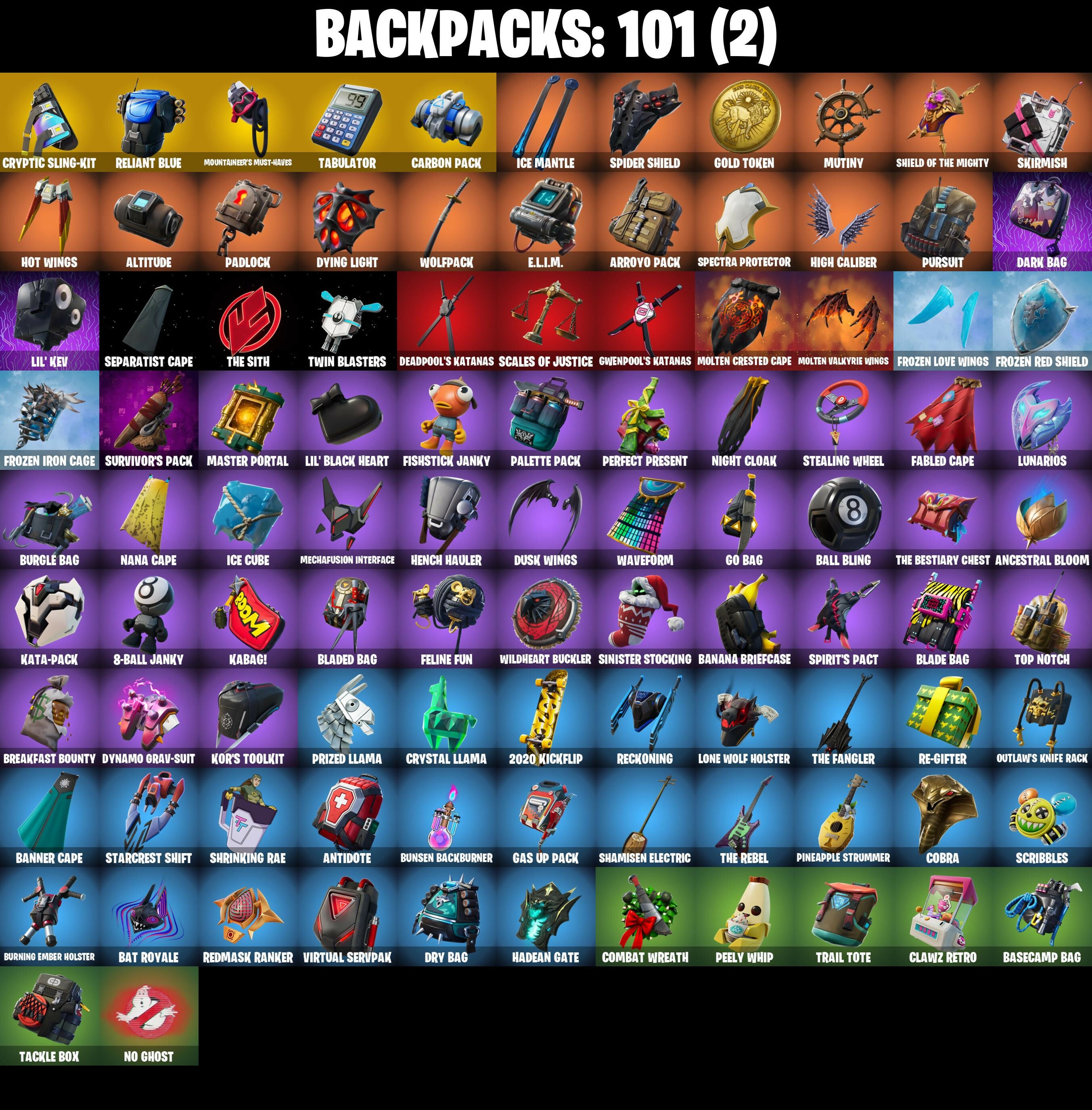 2020 Kickflip, 8-Ball Janky, 8-Ball Vs Scratch, A Warrior Prepares, A.I.M., Abominable Axe, Agent Jones, Agent Peely, Altitude, Ancestral Bloom, Angler Axes, Antidote, Arroyo Pack, Backup Blades, Ball Bling, Banana Briefcase, Bananaxe, Bank Shots, Banner Cape, Base Jumper, Basecamp Bag, Basic Basher, Bat Royale, Beastfang, Big Haul, Black One X-Wing, Black Werewolf, Blackheart, Blackheart (Stage 8), Blade Bag, Blade Of The Waning Moon, Bladed Bag, Blizzard Bomber, Blue Viper, Boing!, Bombs Away!, Boobytrapped, Boomin', Booty Buoy, Boulder Breakers, Bounty 'Brella, Breakfast Bounty, Breathless Blades, Brutus, Bubbloon, Bullet Rider, Bullseye, Bunker Basher, Bunker Jonesy, Bunsen Backburner, Burgle Bag, Burning Ember Holster, Calamity, Calamity Stage 5, Call Me, Cameo Vs Chic, Carbon Commando, Carbon Pack, Cat Flip, Catalyst, Charlotte, Chemist's Cloudglider, Choice Knit, Cinder, Classified, Clawz Retro, Clean Sweep, Cluck Strut, Coaxial Blue, Cobra, Combat Wreath, Conga, Controller, Cosmic Cleavers, Covered Crusader, Crazy Eight, Crescent Shroom, Crimson Codeblade, Crimson Wish, Criss Cross, Crossfire, Crowbar, Crowning Achievement, Cryptic Coaster, Cryptic Sling-Kit, Crystal Llama, Cuddle Carvers, Cymitar, DJ Yonder, Dark Bag, Dark Bomber, Deadpool, Deadpool's Katanas, Dealer's Deck, Deep End, Demi, Demonslayer Blade, Dire, Downpour, Doze Dab, Dragon Stance, Dragon's Claw, Dread, Droop, Dry Bag, Dusk, Dusk Wings, Dying Light, Dynamo Grav-Suit, E.L.I.M., Eagle's Form, Eclipse Brella, Electro Pairing Blades, Ember, Ember Baton, Equalizer, Fable, Fabled Cape, Fade, Feline Fun, Field Flyer, Fierce, Fishstick Janky, Fixer, Flamenco, Flapjack Flyer, Flappy, Flawless, Founder's Glider, Founder's Umbrella, Free Flow, Frozen Axe, Frozen Iron Cage, Frozen Love Ranger, Frozen Love Wings, Frozen Raven, Frozen Red Knight, Frozen Red Shield, Future Relic Scythe, Gage, Gas Up Pack, Gear Specialist Maya, Get Funky, Giddy-Up, Gilded Scepter, Glidurr, Go Bag, Gold Token, Golf Clap, Guiding Glow, Gum Brawler, Gwenpool's Katanas, Hack & Smash, Hadean Gate, Hand-Forged, Harmonic Axes, Hello Friend, Hench Hauler, High Caliber, High Five, Highlight Strikers, Holly Hatchets, Holographic, Hoop Master, Hot Marat, Hot Pokers, Hot Wings, Hula Hoopin', Hunter's Skyblade, Hybrid, Hybrid (Stage 4), Hyperboard, I Declare!, Ice Cube, Ice King (Gold), Ice Mantle, Ice Scepter, Infectious, Introducing..., Invasion, It's Go Time!, It's... You?, Jaywalking, Josie, Journey Vs Hazard, Jump Jets, Jun-Hwan, Junk Bucket, Kabag!, Kata-Pack, Keep It Mello, Kittanas, Knee Slapper, Kondor, Kor's Toolkit, Krisabelle, Laguna, Laid Back Shuffle, Lavawing, Lazy Shuffle, Legendary Blade Of Insight, Lexa, Lil' Black Heart, Lil' Kev, Lina Scorch, Lockpick, Lockstep, Lone Wolf Holster, Love It!, Low 'N Slow, Lt. Evergreen, Lunarios, Luxe, Luxe (Gold Clothing), Lynx, Lynx (Stage 4 - No Ponytail), Make A Seat, Mancake, Mandalorian, Marshy Smasher, Mashed Potato, Master Key, Master Key (Masked), Master Portal, Mave, Mave (Reactive Hair Off), Mean Streak, Mechafusion Interface, Medaxe, Menace, Menace (Challenger Menace - Flame), Meowscles, Metalmark, Mic Drop, Mighty Marvel 'Brella, Millennium Falcon, Molten Battle Hound, Molten Crested Cape, Molten Valkyrie, Molten Valkyrie Wings, Mountaineer's Must-Haves, Mutiny, Nana Cape, Nana Nana, Nana-Brella, Nanner Bashers, Ne'Jari Warhammer, Night Cloak, Nightshade, No Ghost, Null Claws, Oath & Sorrow, Ocean, Ol' Woody, Onesie, Onesie (Winter), Outlaw's Knife Rack, Outlaw's Whipknives, Overdrive, Padlock, Palette Pack, Palm Leaf, Pandemonium, Paws & Claws, Peace Out, Peely, Peely Whip, Peppermint Pick, Perfect Point, Perfect Present, Petrol Pump, Phone It In, Picnic, Pineapple Strummer, Pit Faller, Plunder, Plunja, Pneumatic Twin, Point It Out, Polar Peely, Powder, Powder (White), Predator, Prized Llama, Prodigy, Psionic Surfer, Pull Up, Pumped!, Punk Powerglider, Pursuit, Quicksilver Baton Spear, Rapscallion, Razor Crest, Re-Gifter, Ready When You Are, Reckoning, Red Strike, Redmask Ranker, Reese, Regal Wave, Reliant Blue, Remedy Vs Toxin, Respect The Peace, Retaliator, Revel, Rickety Runner, Ride The Pony, Ripe Rippers, Rippley Vs Sludge, Rose Glow, Rose Rider, Rose Team Leader, Rox, Rox (Stage 5), Royale Air, Ruin, Running Man, Sad Trombone, Scales Of Justice, Scarlet Strike, Scorcher, Scratchmark, Scribble's Sailer, Scribbles, Sentinel, Separatist Cape, Sgt. Winter, Sgt. Winter Headgear, Shadow Vox, Shamisen Electric, Sharpshooter, Shield Of The Mighty, Shimmer, Shinji, Shortbread Slicers, Showboat, Shrinking Rae, Side Hustle, Sidewinder, Sidewinder (Dark), Sign Spinner, Sinister Stocking, Skellefish, Skirmish, Sky Serpents, Sky Trawler, Slammin' Bass, Slitherin', Sludgehammer, Smash Up, Snakebite, Snoozefest, Snowfall, Snowplower, Snowshaker, Snowy, Solid Scratch, Sparkling Star, Spectra Protector, Spider Knight, Spider Shield, Spirit's Pact, Spray Sail, Square Up, Stage 4, Star Wand, Starcrest Shift, Stealing Wheel, Stratosphere, Stratus, Stringles, Subzero Cryptic, Sultura, Summit Striker, Sunny's Lander, Survivor's Pack, Swag Smasher, Swarm, Swell Striker, Synaptic Hatchets, Tabulator, Tackle Box, Tactical Sleigh, Take The Elf, Tech Axe, The Bestiary Chest, The Destroyer's Destroyer, The Fangler, The Ice King, The Mcg, The Peerless Parasol, The Prisoner, The Rebel, The Rick Dance, The Sith, The Umbrella, The Vaultbrella, Tilted Teknique, Tilted Teknique (Hoodie), Time Brella, Tnteeth, Tntina, Toona Fish, Top Notch, Tra La La, Trail Tote, Treefall, Trilogy, Trog, Trog (Tribal), Tsuki 2.0, Turbo Spin, Turk Vs Riptide, Twin Blasters, Umbrella of the Last Reality, Vautja Wristblades, Vega, Victor's Flail, Virtual Servpak, Vivi Chroma, Vox, Vulcan Salute, Warpaint, Wavebreaker, Waveform, Wavy T, Webrella, Whale Sailer, Wild Blast, Wild Streak, Wilde, Wildheart Buckler, Winter's Thorn, Wolfpack, Wooly Warrior, X, X-Lord, Yay!, Yule Trooper, Zenith, Zenith (Stage 4)