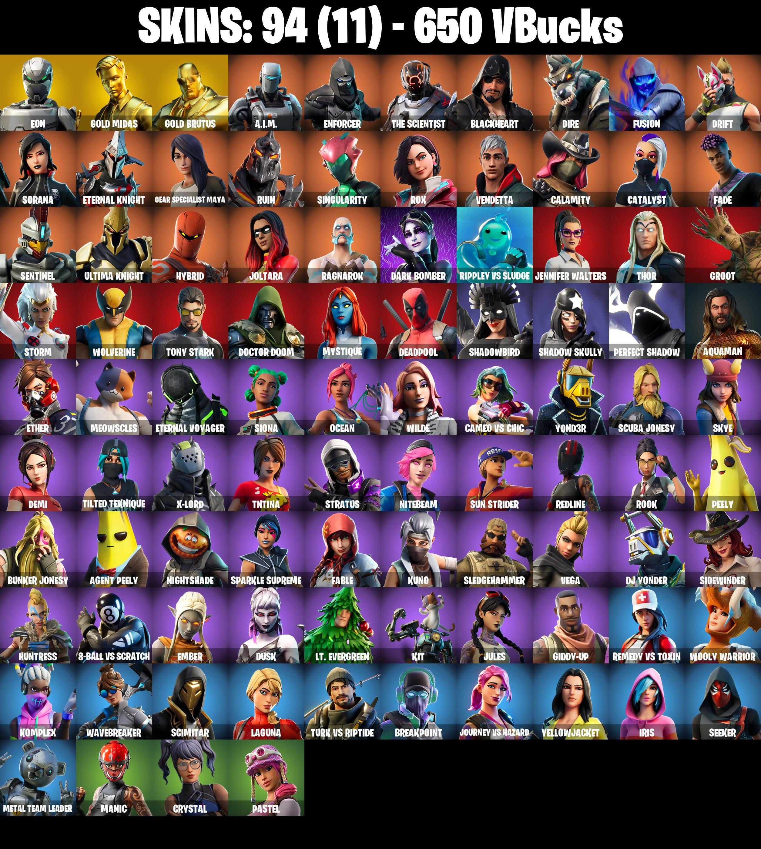 PC/PSN/XBOX |94 skins | Eon | Deadpool | Gold Midas | Gold Brutus | Drift | Ragnarok | Dire | Peely | Vendetta | Ultima Knight | Fusion | #B904