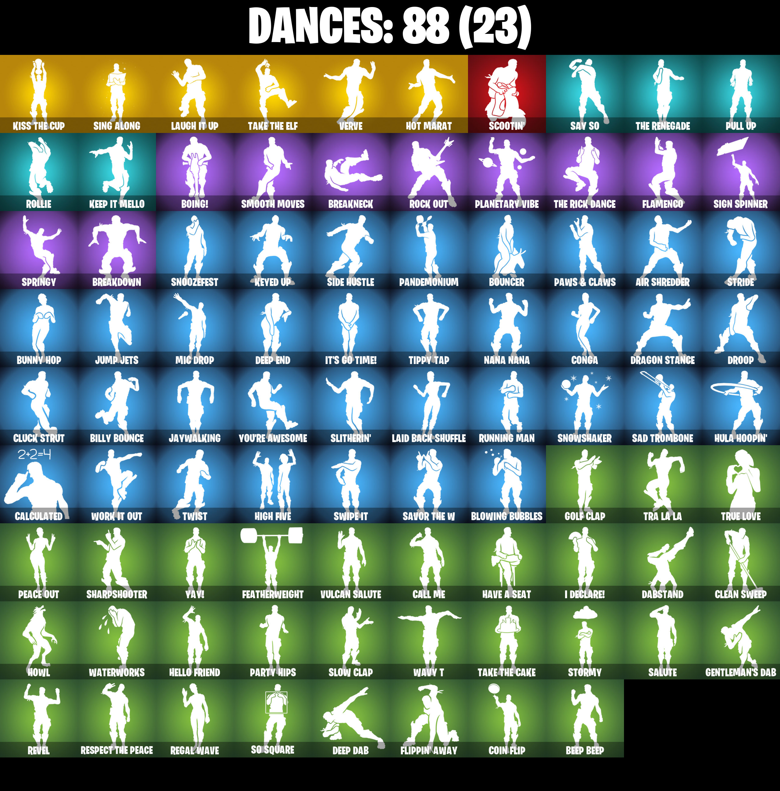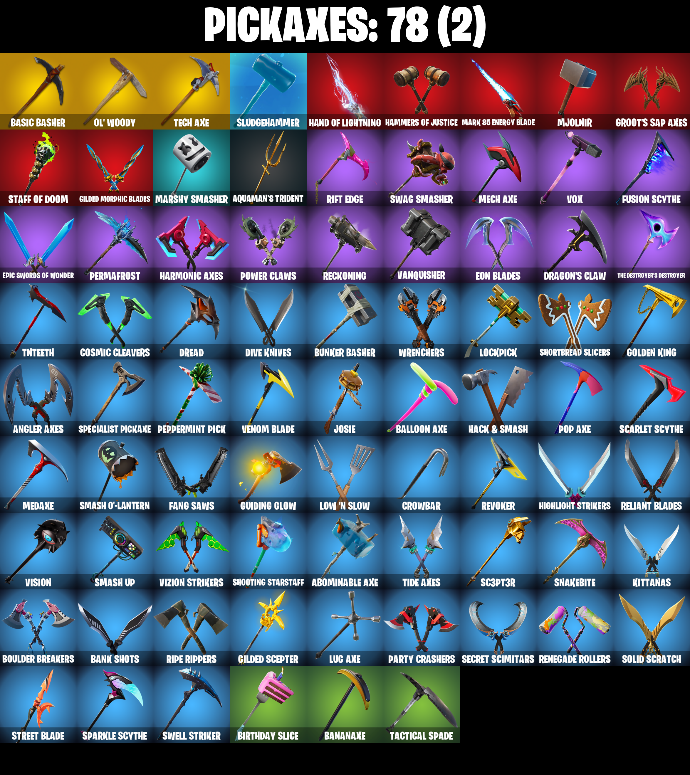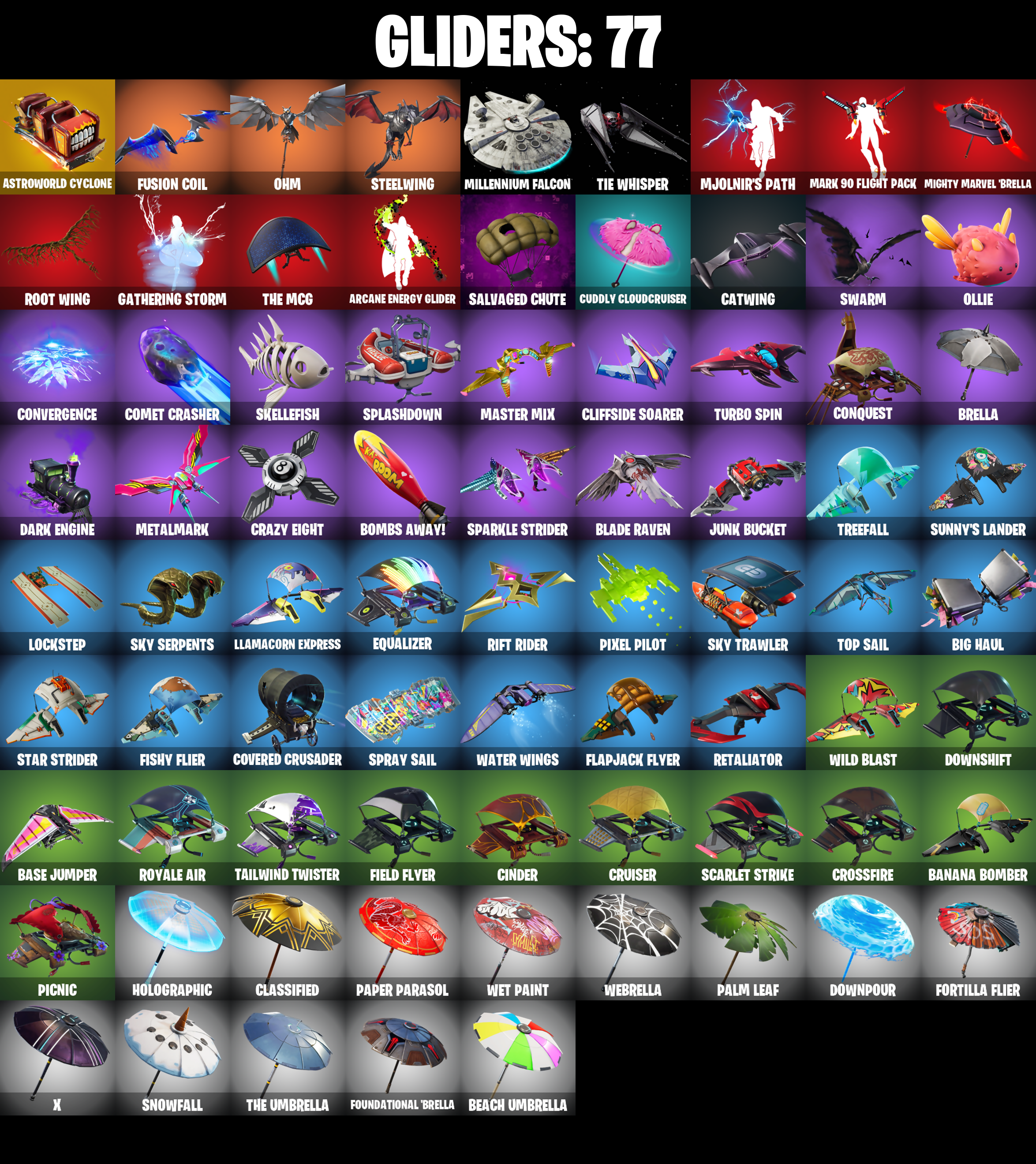 8-Ball Janky, 8-Ball Vs Scratch, A.I.M., Abominable Axe, Adventure Pack, Agent Peely, Air Shredder, Angler Axes, Antidote, Aquaman, Aquaman's Trident, Arcane Energy Glider, Arroyo Pack, Astroworld Cyclone, Atmosphere, Back Board, Backstabber, Backtracker, Ball Bling, Balloon Axe, Banana Bomber, Banana Briefcase, Bananaxe, Bank Shots, Banner Shield, Base Jumper, Basecamp Bag, Basic Basher, Beach Umbrella, Beachcomber, Beep Beep, Big Haul, Billy Bounce, Birthday Slice, Black, Black Werewolf, Blackheart, Blackheart (Stage 8), Blade Bag, Blade Raven, Blowing Bubbles, Bobo, Boing!, Bombs Away!, Boulder Breakers, Bouncer, Breakdown, Breakneck, Breakpoint, Brella, Bunker Basher, Bunker Jonesy, Bunny Hop, CNXN, Calamity, Calamity Stage 5, Calculated, Call Me, Cameo Vs Chic, Catalyst, Catalyst (Overcharged), Catwing, Chainstick Pack, Chic (Yellow), Cinder, Classified, Clawz Retro, Clean Sweep, Cliffside Soarer, Cluck Strut, Cobra, Coin Flip, Combat Wreath, Comet Crasher, Conga, Conquest, Convergence, Cosmic Cleavers, Covered Crusader, Crazy Eight, Crossfire, Crowbar, Cruiser, Crystal, Cuddly Cloudcruiser, Dabstand, Dark Bag, Dark Bomber, Dark Engine, Deadpool, Deadpool Unmasked, Deadpool's Katanas, Deep Dab, Deep Dive, Deep End, Demi, Demi (Night), Dire, Dive Knives, Dj Vonder, Doctor Doom, Doctor Doom (God Emperor), Doom Chalice, Doom's Cowl, Downpour, Downshift, Dragon Stance, Dragon's Claw, Dragoncrest, Dread, Drift, Drift Stage 5, Droop, Dry Bag, Dual Kama, Dusk, Dusk Wings, Dying Light, E.L.I.M., Ember, Ember (Night), Enforcer, Eon, Eon Blades, Epic Swords Of Wonder, Equalizer, Eternal Knight, Eternal Shield, Eternal Voyager, Eternal Voyager (Eternal), Ether, Fable, Fabled Cape, Fade, Fang Saws, Featherweight, Feline Fun, Field Flyer, Fishstick Janky, Fishy Flier, Flamenco, Flapjack Flyer, Flippin' Away, Fortilla Flier, Foundational 'Brella, Frozen Shroud, Fusion, Fusion Coil, Fusion Orb, Fusion Scythe, Gameplan, Gathering Storm, Gear Specialist Maya, Gear Specialist Maya (Hat - Dark), Gentleman's Dab, Giddy-Up, Gilded Morphic Blades, Gilded Scepter, Go Bag, Godzilla's Exo-Spine, Gold Brutus, Gold Dagger Pack, Gold Midas, Gold Token, Golden King, Golf Clap, Groot, Groot's Sap Axes, Guiding Glow, Hack & Smash, Hammers Of Justice, Hand Of Lightning, Happy, Harmonic Axes, Have A Seat, Hazard, Hello Friend, Hench Hauler, High Five, Highlight Strikers, Holographic, Hot Marat, Hot Wings, Howl, Hula Hoopin', Huntress, Hybrid, Hybrid (Stage 4), I Declare!, Infinite Bloom, Iris, Iron Man Backplate, It's Go Time!, Jaywalking, Jennifer Walters, Joltara, Josie, Journey Vs Hazard, Jules, Jump Jets, Junk Bucket, Kabag!, Keep It Mello, Kev, Keyed Up, Kiss The Cup, Kit, Kittanas, Komplex, Kuno, Laguna, Laid Back Shuffle, Laugh It Up, Lil' Black Heart, Lil' Kev, Llamacorn Express, Lockpick, Lockstep, Low 'n Slow, Lt. Evergreen, Lug Axe, Lumi Core Red, Lunar Hyperjet, Manic, Mark 86 Energy Blade, Mark 90 Flight Pack, Marshy Smasher, Masked, Master Mix, Master Portal, Mech Axe, Medaxe, Meowscles, Metal Team Leader, Metalmark, Mic Drop, Mighty Marvel 'Brella, Millennium Falcon, Mini Moon, Mjolnir, Mjolnir's Path, Mr. Daruma, Mutiny, Mystique, Mystique (Tactical), Mystique's Skull, Nana Cape, Nana Nana, Night Cloak, Nightshade, Nitebeam, Nyanja's Catpak, Ocean, Ohm, Ol' Woody, Ollie, Paint Pack, Palette Pack, Palm Leaf, Pandemonium, Paper Parasol, Party Crashers, Party Hips, Pastel, Paws & Claws, Peace Out, Peely, Peppermint Pick, Perfect Shadow, Perfect Wings, Permafrost, Picnic, Pineapple Strummer, Pixel Pilot, Planetary Vibe, Pool Party, Pop Axe, Power Claws, Precision, Pull Up, Purple Jam, Quack Pack, Ragnarok, Raonarok (No Shoulder Pad), Re-Gifter, Ready Ruck, Rearguard, Rebel's Rucksack, Reckoning, Redline, Regal Wave, Reliant Blades, Remedy (Purple), Remedy Vs Toxin, Renegade Rollers, Respect The Peace, Retaliator, Retribution, Revel, Revoker, Rift Edge, Rift Rider, Ripe Rippers, Rippley Vs Sludge, Riptide, Rock Out, Rollie, Rook, Root Wing, Roundabout, Rox, Rox (Stage 5), Royale Air, Ruin, Running Man, Rust Bucket, Sad Trombone, Salute, Salvaged Chute, Sapling Groot, Savor The W, Say So, Sc3pt3r, Scales of Justice, Scarlet Edge, Scarlet Scythe, Scarlet Strike, Scimitar, Scootin', Scratch (Virus), Scuba Jonesy, Secret Scimitars, Seeker, Sentinel, Sentinel (Dark), Shadow Skully, Shadowbird, Shadowbird Wings, Sharpshooter, Shooting Starstaff, Shortbread Slicers, Side Hustle, Sidewinder, Sidewinder (Dark), Sign Spinner, Signal Jammer, Sing Along, Singularity, Singularity (Stage 3), Siona, Skellefish, Sky Serpents, Sky Trawler, Skye, Sledgehammer, Slitherin', Slow Clap, Sludgehammer, Smash O'-Lantern, Smash Up, Smooth Moves, Smoothie, Snakebite, Snoozefest, Snowfall, Snowshaker, So Square, Solid Scratch, Sorana, Sparkle Scythe, Sparkle Strider, Sparkle Supreme, Sparkle Supreme (Bob Cut), Specialist Pickaxe, Spiked Satchel, Splashdown, Spray Sail, Springy, Staff Of Doom, Standard Issue, Star Shot, Star Strider, Star Surge, Starcrest Shift, Stark Satchel, Steelwing, Storm, Storm (Punk), Stormy, Stratus, Stratus (Red), Street Blade, Stride, Subjugator, Sun Strider, Sunny's Lander, Supreme Shell, Swag Smasher, Swarm, Swell Striker, Swipe It, Tackle Box, Tactical Spade, Tailwind Twister, Take The Cake, Take The Elf, Tech Axe, The Destroyer's Destroyer, The McG, The Renegade, The Rick Dance, The Scientist, The Sith, The Umbrella, Thor, Thor's Cloak, Tide Axes, Tie Whisper, Tilted Teknique, Tilted Teknique (Hoodie), Tippy Tap, Tnteeth, Tntina, Tony Stark, Top Sail, Tra La La, Trail Tote, Treefall, Trophy Sack, True Love, Turbo Spin, Turk Vs Riptide, Twist, Ultima Knight, Ultima Knight (Origin), Uplink, Vanquisher, Vega, Vega (Teal), Vendetta, Vendetta (Stage 6), Venom Blade, Verve, Vision, Vizion Strikers, Vond3r, Vox, Vulcan Salute, Warning Bow, Water Wings, Waterworks, Wavebreaker, Waveform, Wavy T, Webrella, Welder, Wet Paint, Wild Blast, Wilde, Wolfpack, Wolverine, Wolverine (Classic), Wolverine's Trophy, Wooly 