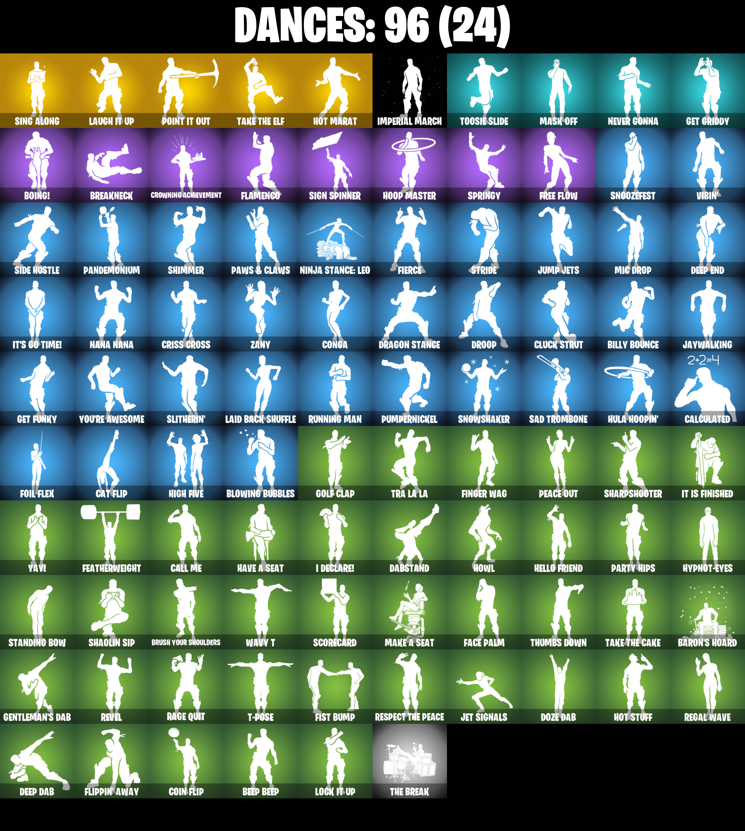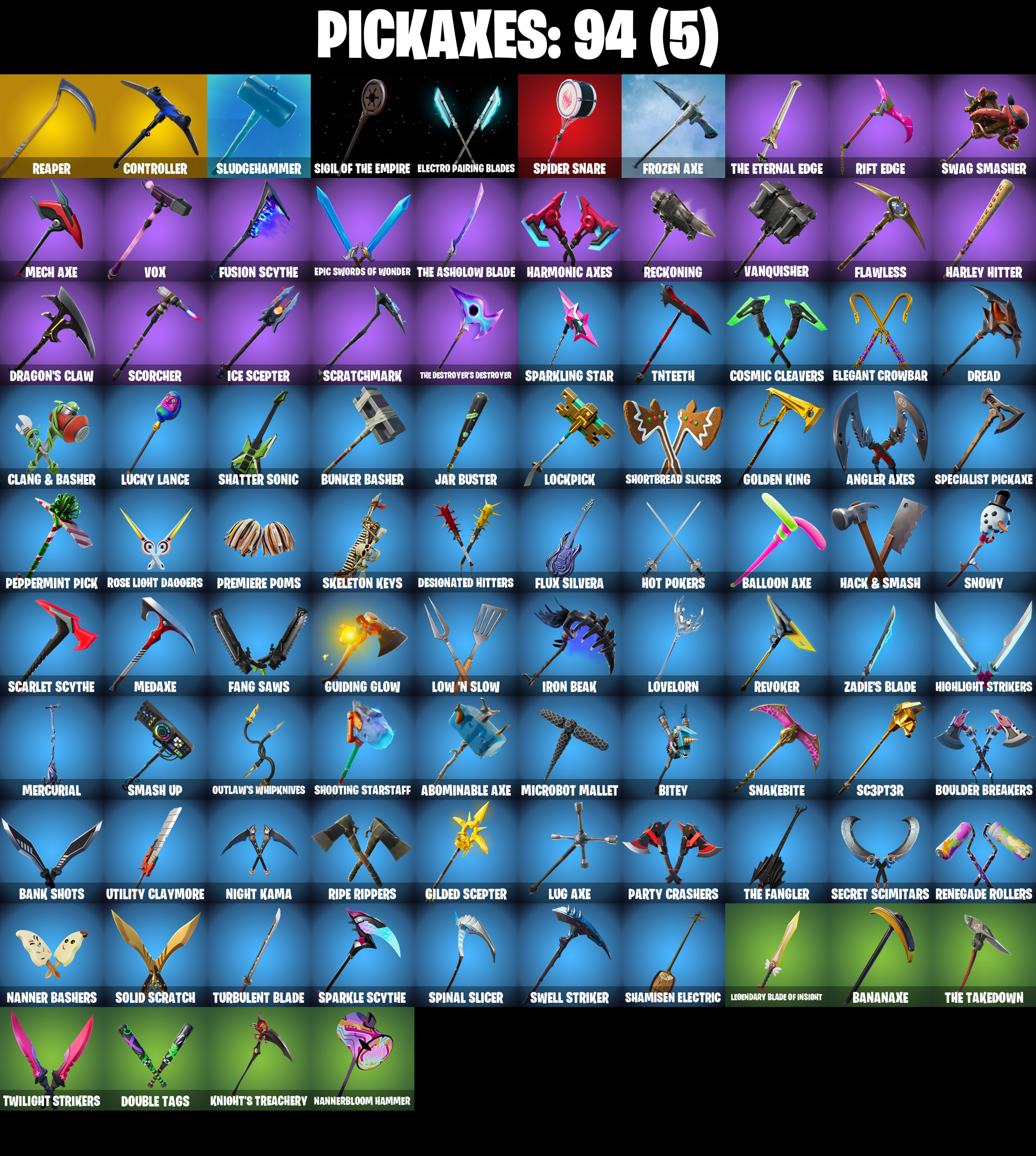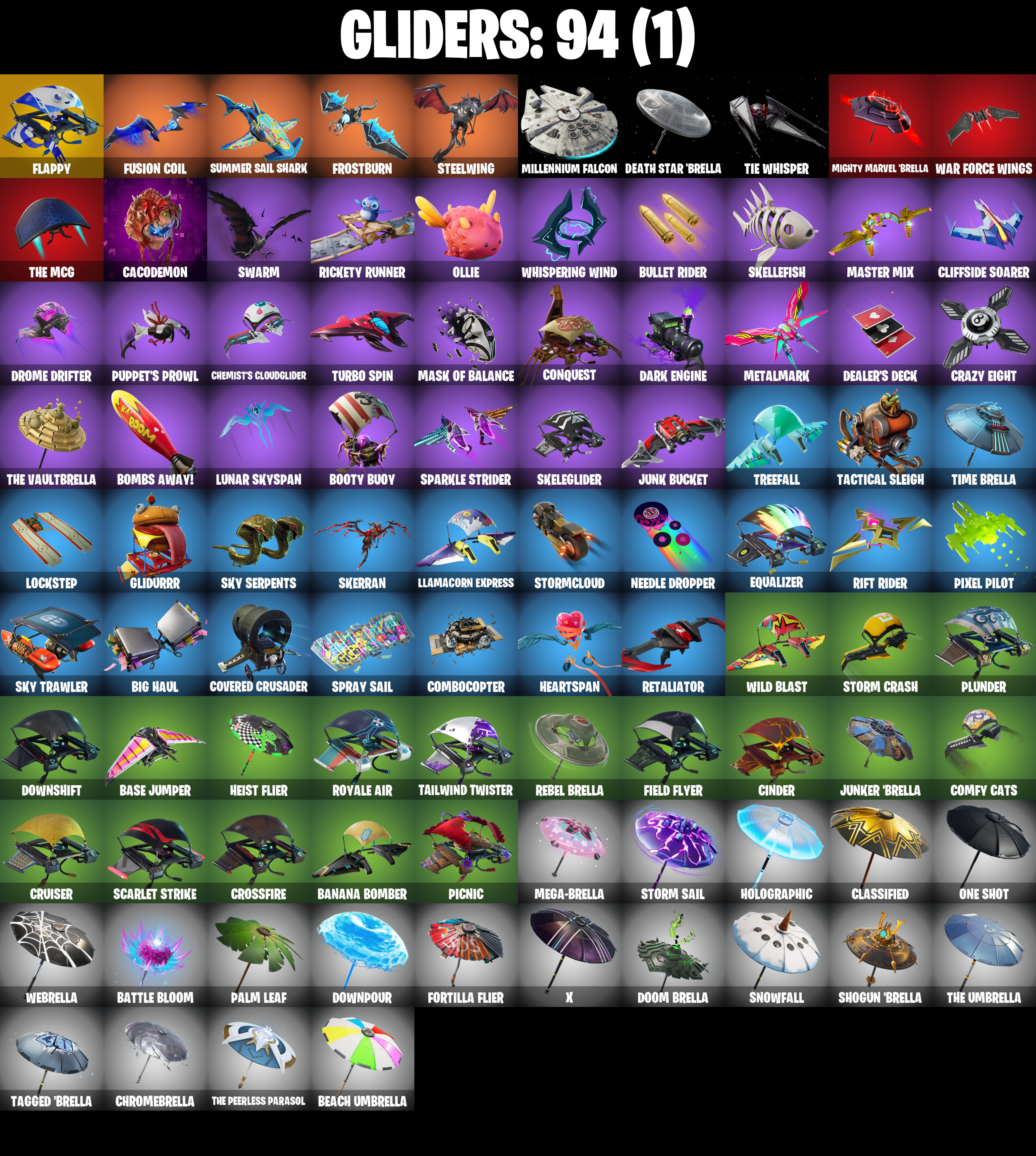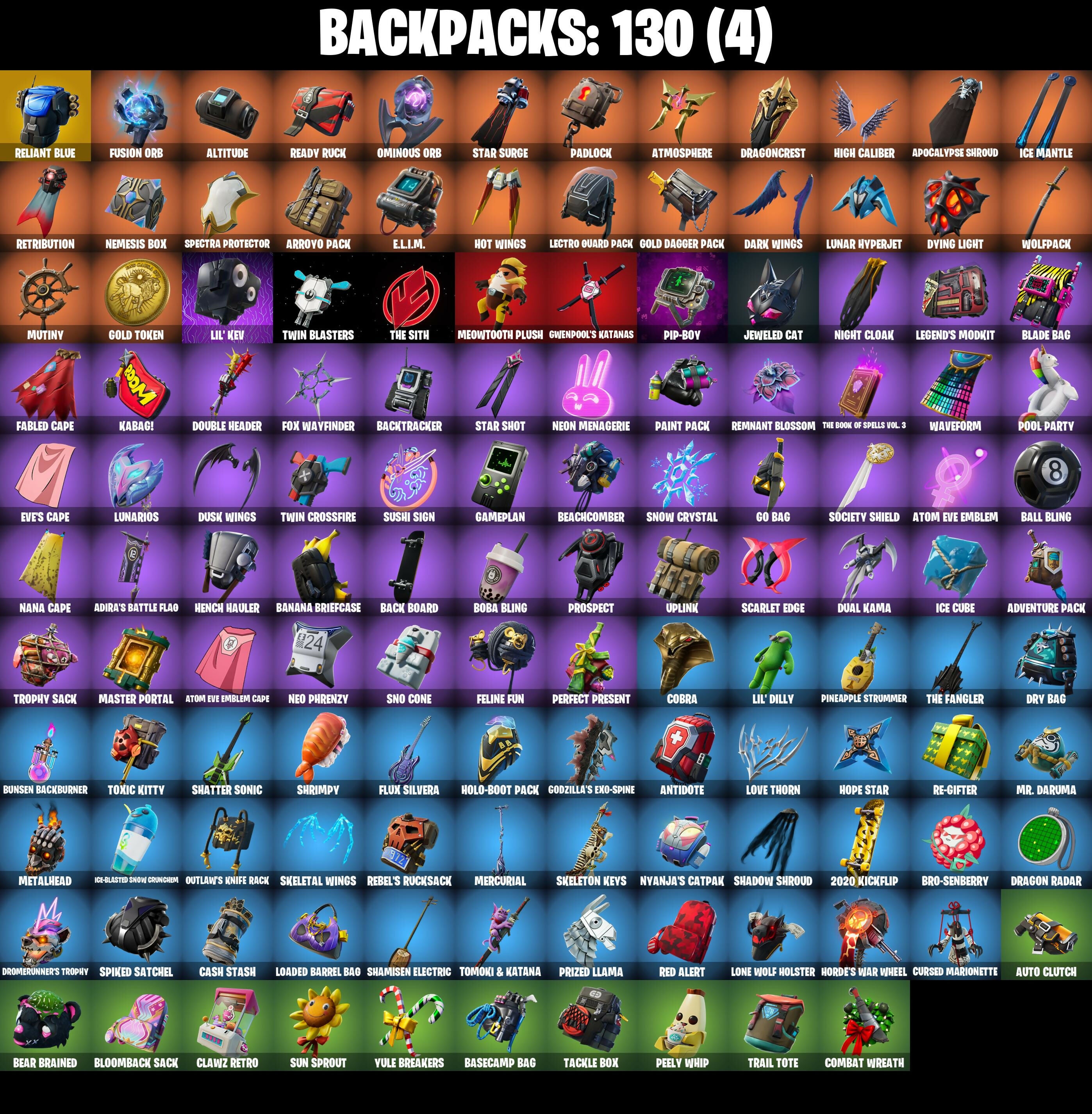 2020 Kickflip, 8-Ball Vs Scratch, A.I.M., Abominable Axe, Adira's Battle Flag, Adventure Pack, Agent Peely, Altitude, Angler Axes, Antidote, Apocalypse Shroud, Arctic Assassin, Arroyo Pack, Atmosphere, Atom Eve, Atom Eve Emblem, Atom Eve Emblem Cape, Aura, Auto Clutch, Back Board, Backtracker, Ball Bling, Balloon Axe, Banana Bomber, Banana Briefcase, Bananaxe, Bandolette, Bank Shots, Banner Trooper, Baron's Hoard, Base Jumper, Basecamp Bag, Battle Bloom, Beach Umbrella, Beachcomber, Bear Brained, Beep Beep, Belle Berry, Big Haul, Billy Bounce, Bitey, Black Werewolf, Blackheart, Blackheart (Stage 8), Blade Bag, Bloomback Sack, Blowing Bubbles, Boba Bling, Boing!, Bombs Away!, Booty Buoy, Boulder Breakers, Breakneck, Bro-Senberry, Brush Your Shoulders, Brutus, Bullet Rider, Bunker Basher, Bunker Jonesy, Bunsen Backburner, Cacodemon, Calamity, Calamity Stage 5, Calculated, Call Me, Cameo Vs Chic, Cash Stash, Cat Flip, Catalyst, Catalyst (Overcharged), Catastrophe, Catwoman Comic Book Outfit, Chemist's Cloudglider, Chic (Yellow), Chromebrella, Cinder, Clang & Basher, Clash, Classified, Clawz Retro, Cliffside Soarer, Cluck Strut, Clutch, Clutch (Red), Cobra, Coin Flip, Combat Wreath, Combocopter, Comfy Cats, Commando, Conga, Conquest, Controller, Cosmic Cleavers, Covered Crusader, Crazy Eight, Criss Cross, Crossfire, Crowning Achievement, Cruiser, Crusher, Crystal, Cursed Marionette, DJ Yonder, Dabstand, Dark Engine, Dark Wings, Dealer's Deck, Death Star 'Brella, Deep Dab, Deep End, Demi, Demi (Night), Designated Hitters, Dire, Doom Brella, Double Header, Double Tags, Downpour, Downshift, Doze Dab, Dragon Radar, Dragon Stance, Dragon's Claw, Dragoncrest, Dread, Drift, Drift Stage 5, Drome Drifter, Dromerunner's Trophy, Droop, Dry Bag, Dual Kama, Dusk, Dusk Wings, Dying Light, E.L.I.M., Electro Pairing Blades, Elegant Crowbar, Ember, Ember (Night), Epic Swords Of Wonder, Equalizer, Eternal Voyager, Eternal Voyager (Eternal), Eve's Cape, Fable, Fabled Cape, Face Palm, Fang Saws, Fate, Featherweight, Feline Fun, Field Flyer, Fierce, Finger Wag, Fist Bump, Flamenco, Flappy, Flawless, Flippin' Away, Flux Silvera, Foil Flex, Fortilla Flier, Fox Wayfinder, Free Flow, Frostburn, Frozen Axe, Fusion, Fusion Coil, Fusion Orb, Fusion Scythe, Gameplan, Gear Specialist Maya, Gentleman's Dab, Get Funky, Get Griddy, Ghoul Trooper, Giddy-Up, Gilded Scepter, Glidurr, Go Bag, Godzilla's Exo-Spine, Gold Dagger Pack, Gold Midas, Gold Token, Golden King, Golf Clap, Grind, Grind (Red), Guiding Glow, Gwenpool's Katanas, Hack & Smash, Harley Hitter, Harmonic Axes, Have A Seat, Hazard, Heartspan, Heist Flier, Hello Friend, Hench Hauler, High Caliber, High Five, Highlight Strikers, Holo-Boot Pack, Holographic, Hoop Master, Hope Star, Horde's War Wheel, Hot Marat, Hot Pokers, Hot Stuff, Hot Wings, Howl, Hula Hoopin', Huntress, Hybrid, Hybrid (Stage 4), Hypnot-Eyes, I Declare!, Ice Cube, Ice King (Gold), Ice Mantle, Ice Scepter, Ice-Blasted Snow Crunch'em, Imperial March, Iron Beak, Isabelle, It Is Finished, It's Go Time!, Jar Buster, Jaywalking, Jet Signals, Jeweled Cat, Jolly Jammer, Journey Vs Hazard, Jump Jets, Junk Bucket, Junker 'Brella, Kabag!, Knight's Treachery, Kuno, Laguna, Laid Back Shuffle, Laugh It Up, Lectro Guard Pack, Legend's Modkit, Legendary Blade Of Insight, Lil Whip, Lil' Dilly, Lil' Kev, Llamacorn Express, Loaded Barrel Bag, Lock It Up, Lockpick, Lockstep, Lone Wolf Holster, Love Thorn, Lovelorn, Low 'N Slow, Lt. Evergreen, Lucky Lance, Lug Axe, Lunar Hyperjet, Lunar Skyspan, Lunarios, Luxe, Luxe (Gold Clothing), Lynx, Lynx (Stage 4 - No Ponytail), Make A Seat, Maki Master, Mask Of Balance, Mask Off, Master Key, Master Key (Masked), Master Mix, Master Portal, Mech Axe, Medaxe, Mega-brella, Meowscles, Meowtooth Plush, Mercurial, Metalhead, Metalmark, Mic Drop, Microbot Mallet, Mighty Marvel 'Brella, Millennium Falcon, Mr. Daruma, Mutiny, Mystify, Nana Cape, Nana Nana, Nanner Bashers, Nannerbloom Hammer, Needle Dropper, Nemesis Box, Neo Phrenzy, Neo Versa, Neon Menagerie, Never Gonna, Night Cloak, Night Kama, Nightshade, Ninja Stance: Leo, Nog Ops, Nyanja's Catpak, Ollie, Ominous Orb, One Shot, Onesie, Onesie (Winter), Outlaw's Knife Rack, Outlaw's Whipknives, Padlock, Paint Pack, Palm Leaf, Pandemonium, Party Crashers, Party Hips, Paws & Claws, Peace Out, Peely, Peely Whip, Peppermint Pick, Perfect Present, Picnic, Pineapple Strummer, Pip-Boy, Pixel Pilot, Plunder, Point It Out, Pool Party, Powder, Powder (White), Premiere Poms, Prized Llama, Prospect, Pumpernickel, Puppet's Prowl, Rage Quit, Ravage, Re-Gifter, Ready Ruck, Reaper, Rebel Brella, Rebel's Rucksack, Reckoning, Red Alert, Redline, Regal Wave, Reliant Blue, Remedy (Purple), Remedy Vs Toxin, Remnant Blossom, Renegade Rollers, Respect The Peace, Retaliator, Retribution, Revel, Revoker, Rickety Runner, Rift Edge, Rift Rider, Ripe Rippers, Rippley (Purple), Rippley Vs Sludge, Riptide, Rose Light Daggers, Rox, Rox (Stage 5), Royale Air, Ruby, Ruin, Running Man, Runway Racer, Sad Trombone, Sc3pt3r, Scarlet Commander, Scarlet Edge, Scarlet Scythe, Scarlet Strike, Scorcher, Scorecard, Scratch (Virus), Scratchmark, Scuba Crystal, Secret Scimitars, Sentinel, Sentinel (Dark), Sgt. Winter, Sgt. Winter Headgear, Shadow Ops, Shadow Shroud, Shamisen Electric, Shaolin Sip, Sharpshooter, Shatter Sonic, Shimmer, Shogun 'Brella, Shooting Starstaff, Shortbread Slicers, Shrimpy, Side Hustle, Sidewinder, Sidewinder (Dark), Sigil Of The Empire, Sign Spinner, Sing Along, Singularity, Singularity (Stage 3), Skeleglider, Skeletal Wings, Skeleton Keys, Skellefish, Skerran, Skull Ranger, Sky Serpents, Sky Trawler, Skye, Slitherin', Sludgehammer, Smash Up, Snakebite, Sno Cone, Snoozefest, Snow Crystal, Snowfall, Snowshaker, Snowy, Society Shield, Solid Scratch, Sorana, Sorana (Grey), Sparkle Scythe, Sparkle Strider, Sparkle Supreme, Sparkle Supreme (Bob Cut), Sparkling Star, Specialist Pickaxe, Spectra Protector, Spider Snare, Spiked Satchel, Spinal Slicer, Spray Sai