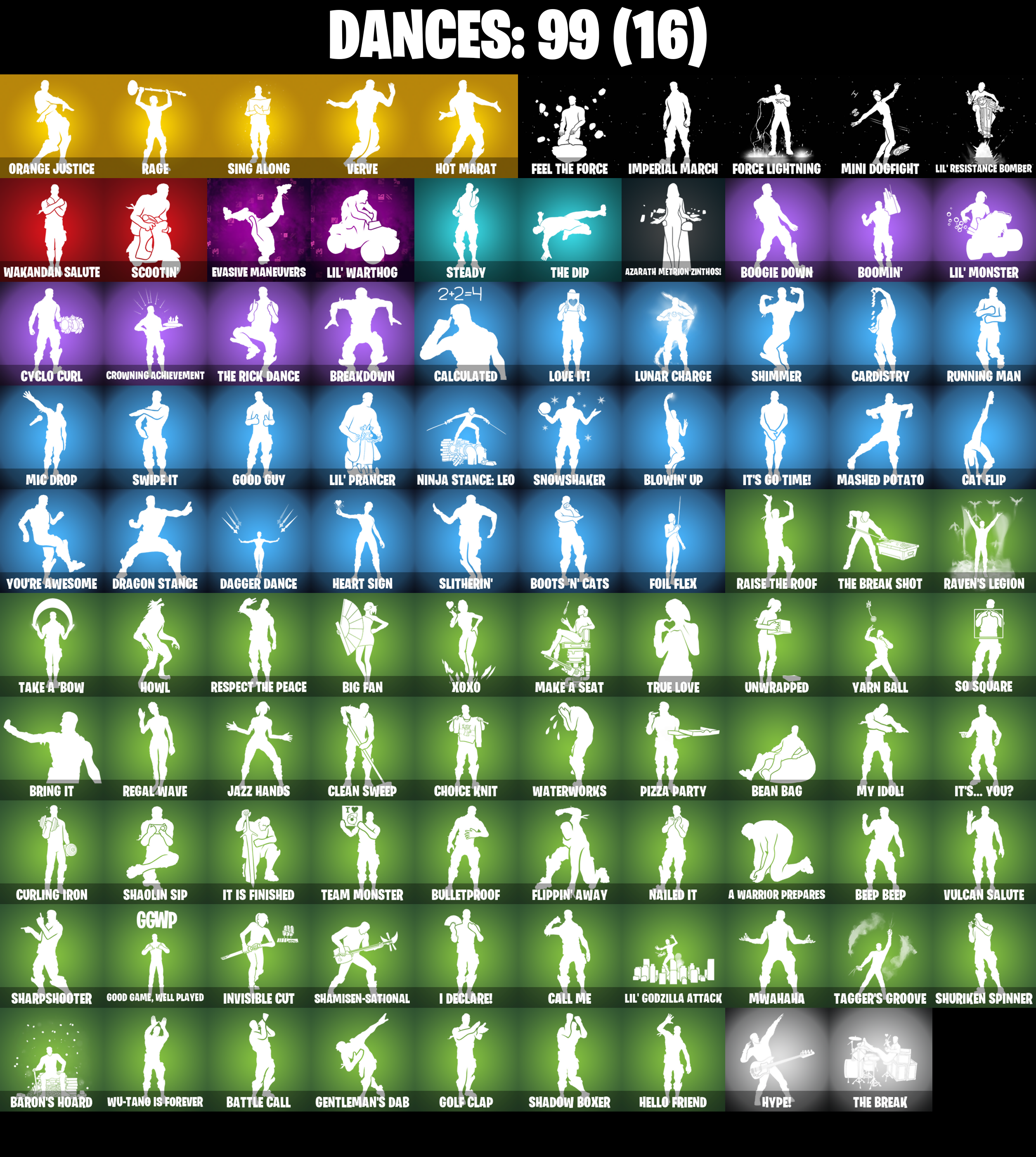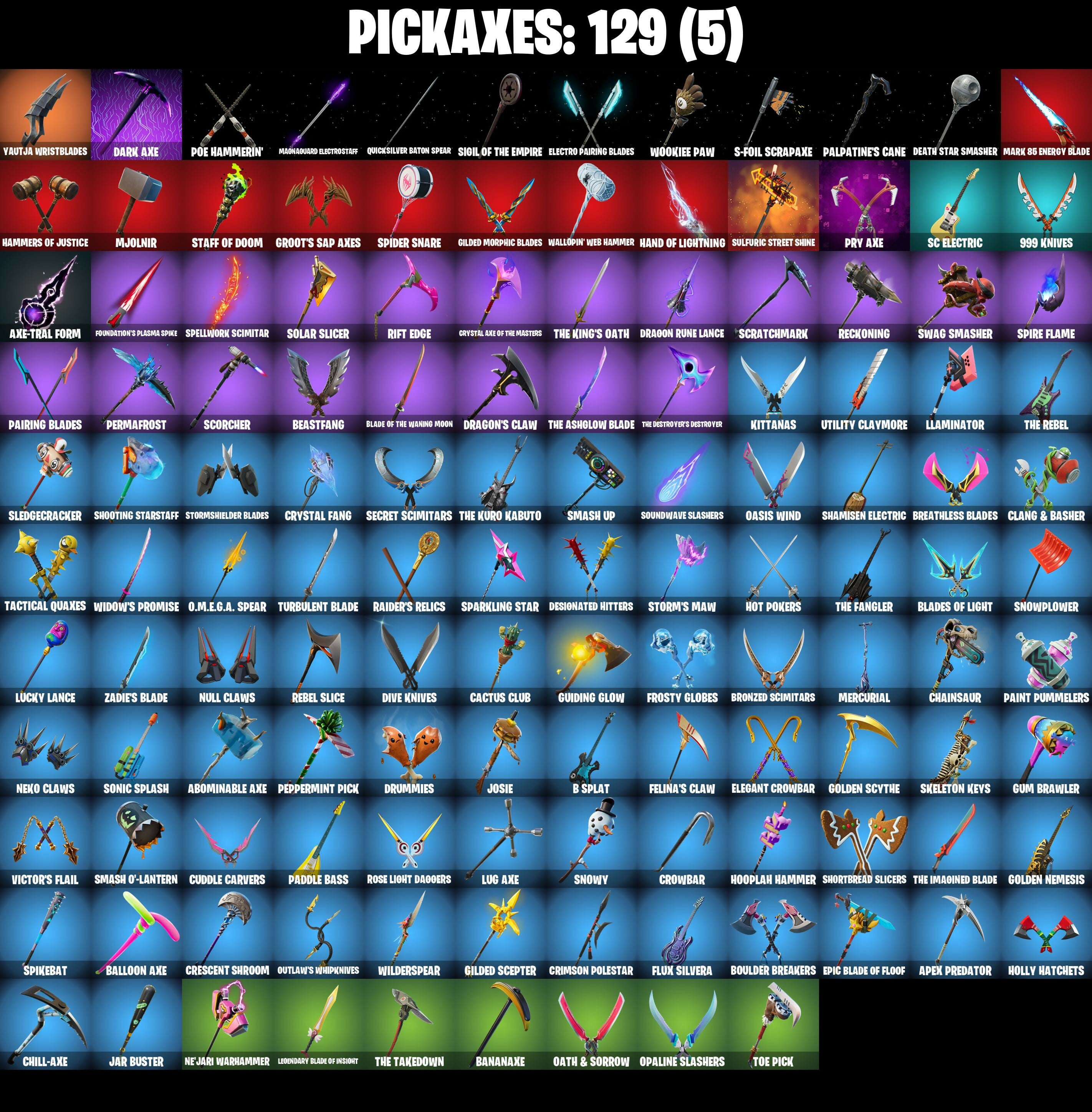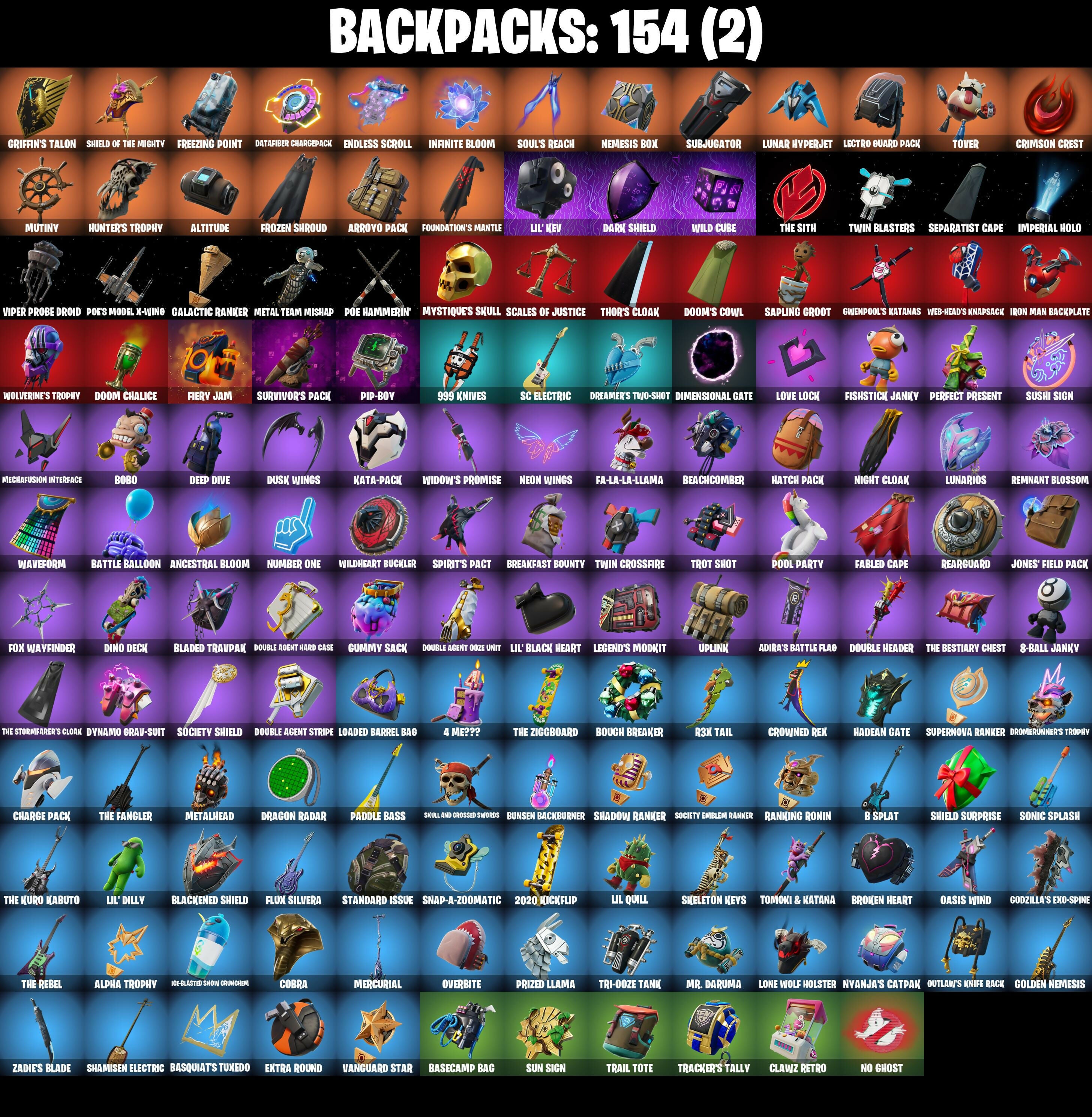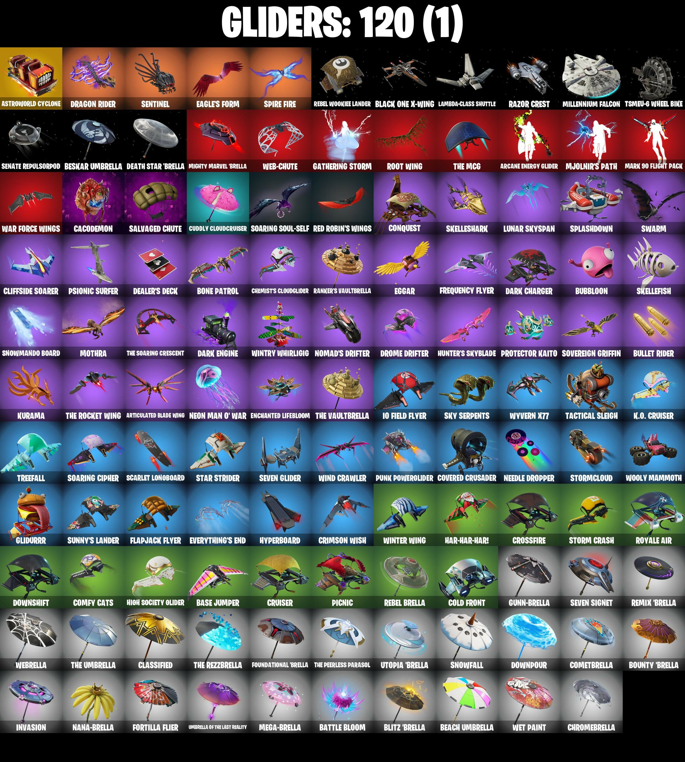 10 Field Flyer, 2020 Kickflip, 4 Me???, 8-Ball Janky, 999 Knives, A Warrior Prepares, Abominable Axe, Adira, Adira (Battle Mask), Adira's Battle Flag, Agent Jones, Agent Jones (Jump 31), Alpha Trophy, Altitude, Ancestral Bloom, Apex Predator, Apprentice Evie, Arcane Energy Glider, Arroyo Pack, Articulated Blade Wing, Astroworld Cyclone, Axe-Tral Form, Azarath Metrion Zinthos!, B Splat, Balloon Axe, Bananaxe, Baron's Hoard, Base Jumper, Basecamp Bag, Basquiat's Tuxedo, Battle Balloon, Battle Bloom, Battle Call, Beach Umbrella, Beachcomber, Bean Bag, Beastfang, Beep Beep, Beskar Umbrella, Big Fan, Black One X-Wing, Blackened Shield, Blackheart, Blackheart (Stage 8), Blade of the Waning Moon, Bladed Travpak, Blades of Light, Blitz 'Brella, Blowin' Up, Bobo, Bone Patrol, Boogie Down, Boomin', Boots 'n' Cats, Bough Breaker, Boulder Breakers, Bounty 'Brella, Boxer, Boxy, Breakdown, Breakfast Bounty, Breathless Blades, Bring It, Broken Heart, Bronzed Scimitars, Bubbloon, Bullet Rider, Bulletproof, Bunsen Backburner, Cacodemon, Cactus Club, Calamity, Calamity Stage 5, Calculated, Call Me, Cardistry, Cat Flip, Chainsaur, Chaos Double Agent, Charge Pack, Chemist's Cloudglider, Chill-Axe, Choice Knit, Chromebrella, Clang & Basher, Classified, Clawz Retro, Clean Sweep, Cliffside Soarer, Cluck, Cluck (Slurpy), Cobra, Cold Front, Color Crush, Cometbrella, Comfy Cats, Comfy Chomps, Conquest, Covered Crusader, Crescent Shroom, Crimson Crest, Crimson Polestar, Crimson Wish, Crossfire, Crowbar, Crowned Rex, Crowning Achievement, Cruiser, Crystal Axe of the Masters, Crystal Fang, Cuddle Carvers, Cuddly Cloudcruiser, Curling Iron, Cyclo Curl, DJ Yonder, Dagger Dance, Dark Axe, Dark Charger, Dark Engine, Dark Jonesy, Dark Red Knight, Dark Shield, Dark Wild Card, Darth Vader, Datafiber Chargepack, Dealer's Deck, Death Star 'Brella, Death Star Smasher, Deep Dive, Designated Hitters, Dimensional Gate, Dino Deck, Dive Knives, Dizzie, Doctor Doom, Doctor Doom (God Emperor), Dolph, Doom Chalice, Doom's Cowl, Double Agent Hard Case, Double Agent Hush, Double Agent Ooze Unit, Double Agent Stripe, Double Agent Wildcard, Double Header, Downpour, Downshift, Dragon Radar, Dragon Rider, Dragon Rune Lance, Dragon Stance, Dragon's Claw, Dreamer's Two-Shot, Drift, Drift Stage 5, Drome Drifter, Dromerunner's Trophy, Drummies, Dusk, Dusk Knight, Dusk Wings, Dynamo Grav-Suit, Eagle's Form, Eggar, Electro Pairing Blades, Elegant Crowbar, Emperor Palpatine, Enchanted Lifebloom, Endless Scroll, Energized Godzilla, Enforcer, Epic Blade of Floof, Evasive Maneuvers, Everything's End, Evie, Evie (Summer Strider), Extra Round, Fa-La-La-Llama, Fable, Fabled Cape, Feel The Force, Felina, Felina's Claw, Fiery Jam, Fishstick Janky, Flapjack Flyer, Flippin' Away, Flux Silvera, Foil Flex, Force Lightning, Fortilla Flier, Foundation's Mantle, Foundation's Plasma Spike, Foundational 'Brella, Fox Wayfinder, Freezing Point, Frequency Flyer, Frostbite, Frosty Globes, Frozen Shroud, Galactic Ranker, Gathering Storm, General Grievous, Gentleman's Dab, Giddy-up, Gilded Morphic Blades, Gilded Scepter, Glidurr, Godzilla Evolved, Godzilla's Exo-Spine, Golden Nemesis, Golden Scythe, Golf Clap, Good Game, Well Played, Good Guy, Griffin's Talon, Groot, Groot (Silver Foil), Groot's Sap Axes, Guardian Jade, Guiding Glow, Gum Brawler, Gumbo, Gumbo (Sour), Gummy Sack, Gunn-Brella, Gwenpool's Katanas, Hadean Gate, Hammers of Justice, Hand of Lightning, Har-Har-Har!, Harlowe, Harlowe (Helmet), Hatch Pack, Haven, Haven (Tropical Chirper), Heart Sign, Hello Friend, High Society Glider, Holly Hatchets, Hooplah Hammer, Hot Marat, Hot Pokers, Howl, Hunter's Skyblade, Hunter's Trophy, Huntress, Hybrid, Hybrid (Stage 4), Hype!, Hyperboard, I Declare!, Ice-Blasted Snow Cruncher, Imperial Holo, Imperial March, Infinite Bloom, Invasion, Invisible Cut, Iron Man Backplate, It Is Finished, It's Go Time!, It's... You?, Jade, Jar Buster, Jazz Hands, Jennifer Walters, Jones' Field Pack, Josie, K.O. Cruiser, Kata-Pack, Kendo, Kittanas, Kondor, Krisabelle, Kurama, Lambda-Class Shuttle, Lara Croft, Lectro Guard Pack, Legend's Modkit, Legendary Blade of Insight, Lexa, Lexa (Warstrike), Lil Quill, Lil' Black Heart, Lil' Dilly, Lil' Godzilla Attack, Lil' Kev, Lil' Monster, Lil' Prancer, Lil' Resistance Bomber, Lil' Warthog, Llaminator, Loaded Barrel Bag, Lone Wolf Holster, Love It!, Love Lock, Lt. John Llama, Lt. John Llama (Gilded Reality), Lucky Lance, Lug Axe, Lunar Charge, Lunar Hyperjet, Lunar Skyspan, Lunarios, Lynx, Lynx (Stage 4 - No Ponytail), Magnaguard Electrostaff, Make A Seat, Malik, Malik (Solitary Defender), Mancake, Mandalorian, Mark 85 Energy Blade, Mark 90 Flight Pack, Mashed Potato, Mave, Mave (Reactive Hair Off), Mechafusion Interface, Mega-Brella, Menace, Menace (Challenger Menace - Flame), Mercurial, Metal Team Mishap, Metalhead, Mic Drop, Mighty Marvel 'Brella, Millennium Falcon, Mini Dogfight, Mjolnir, Mjolnir's Path, Mothra, Mr. Daruma, Mutiny, Mwahaha, My Idol!, Mystique, Mystique's Skull, Nailed It, Nana-Brella, Ne'Jari Warhammer, Needle Dropper, Neko Claws, Nemesis Box, Neon Man O' War, Neon Wings, Neymar Jr, Night Cloak, Nightshade, Ninja Stance: Leo, No Ghost, Nomad's Drifter, Null Claws, Number One, Nyanja, Nyanja's Catpak, O.M.E.G.A. Spear, Oasis Wind, Oath & Sorrow, Opaline Slashers, Orange Justice, Outlaw's Knife Rack, Outlaw's Whipknives, Overbite, Paddle Bass, Paint Pummeler, Pairing Blades, Palpatine's Cane, Peekaboo, Peppermint Pick, Perfect Present, Permafrost, Phantasm, Picnic, Pip-Boy, Pizza Party, Poe Dameron, Poe Hammerin', Poe's Model X-Wing, Polar Peely, Pool Party, Powder, Powder (White), Predator, Prized Llama, Protector Kaito, Pry Axe, Psionic Surfer, Punk Powerglider, Quicksilver Baton Spear, R3X Tail, Rage, Ragnarok, Ragnarok (No Shoulder Pad), Raider's Relics, Raise The Roof, Ranker's Vaultbrella, Ranking Ronin, Raven's Legion, Raz, Razor Crest, Rearguard, Rebel Brella, Rebel Slice, Rebel Wookiee Lander, Rebirth Raven, Reckoning, R