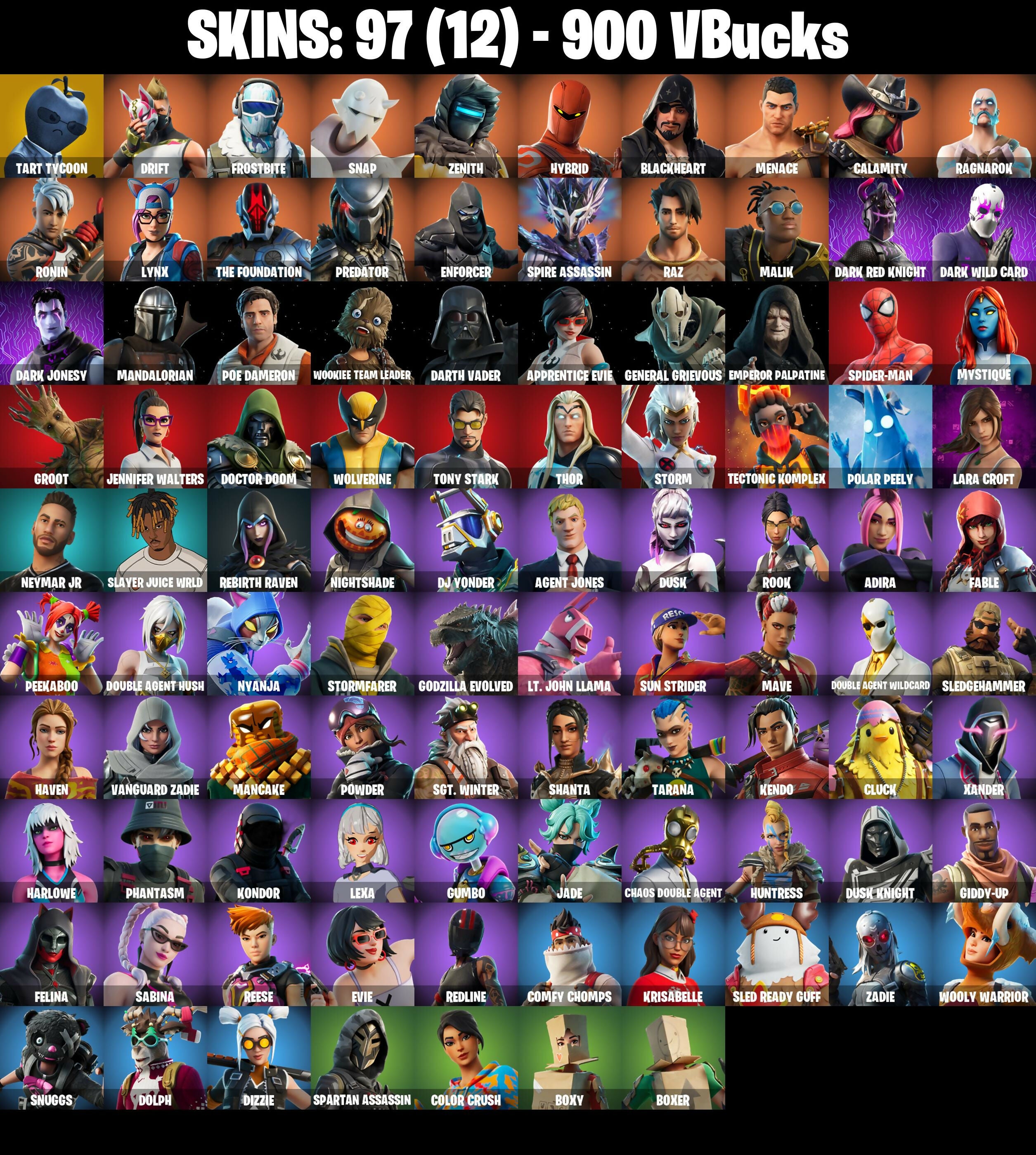 PC/PSN/XBOX |97 skins | Lara Croft | Orange Justice | Drift | Rage | Ragnarok | Spider-Man | Tony Stark | Menace | Spire Assassin | #B1045
