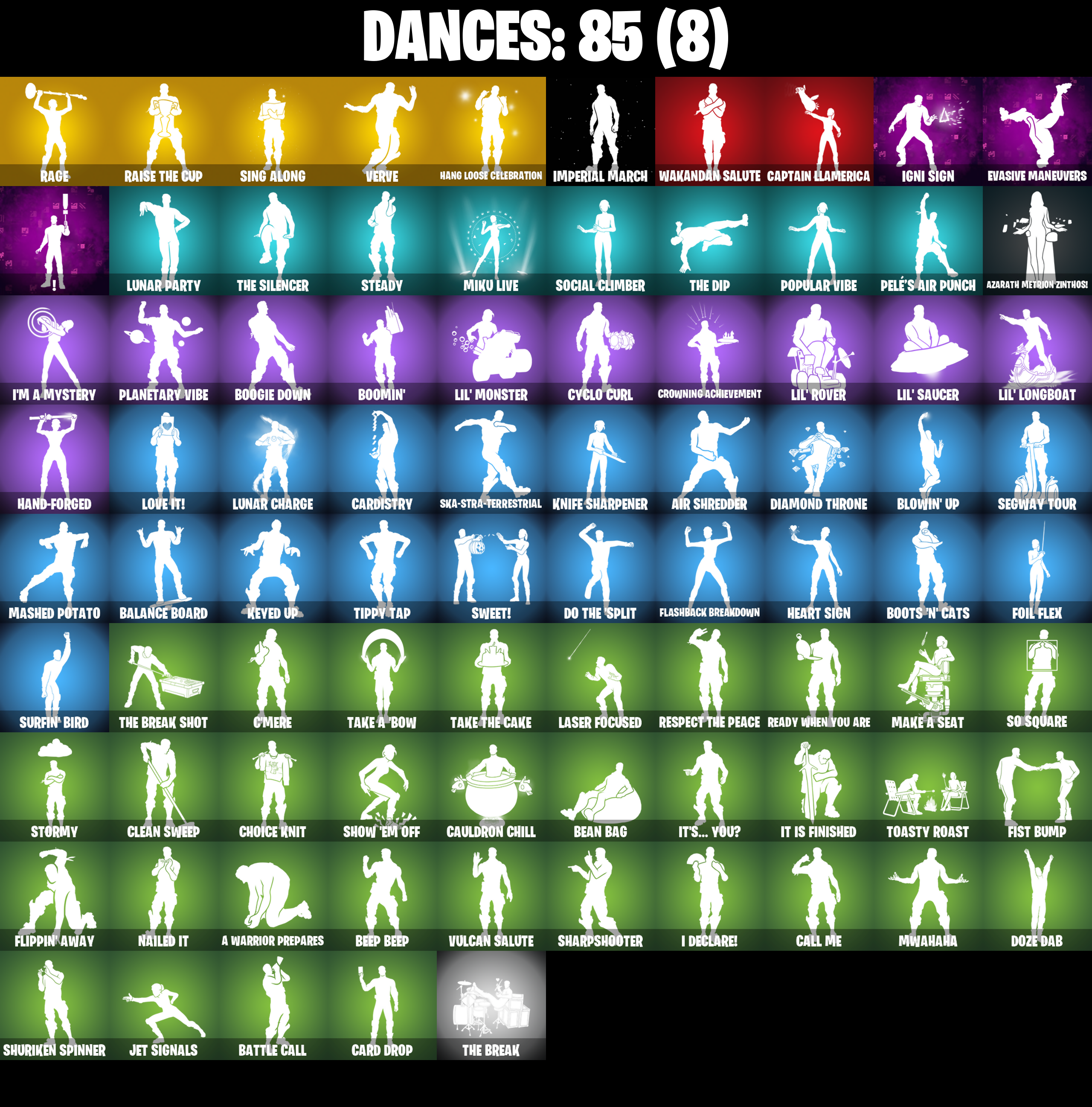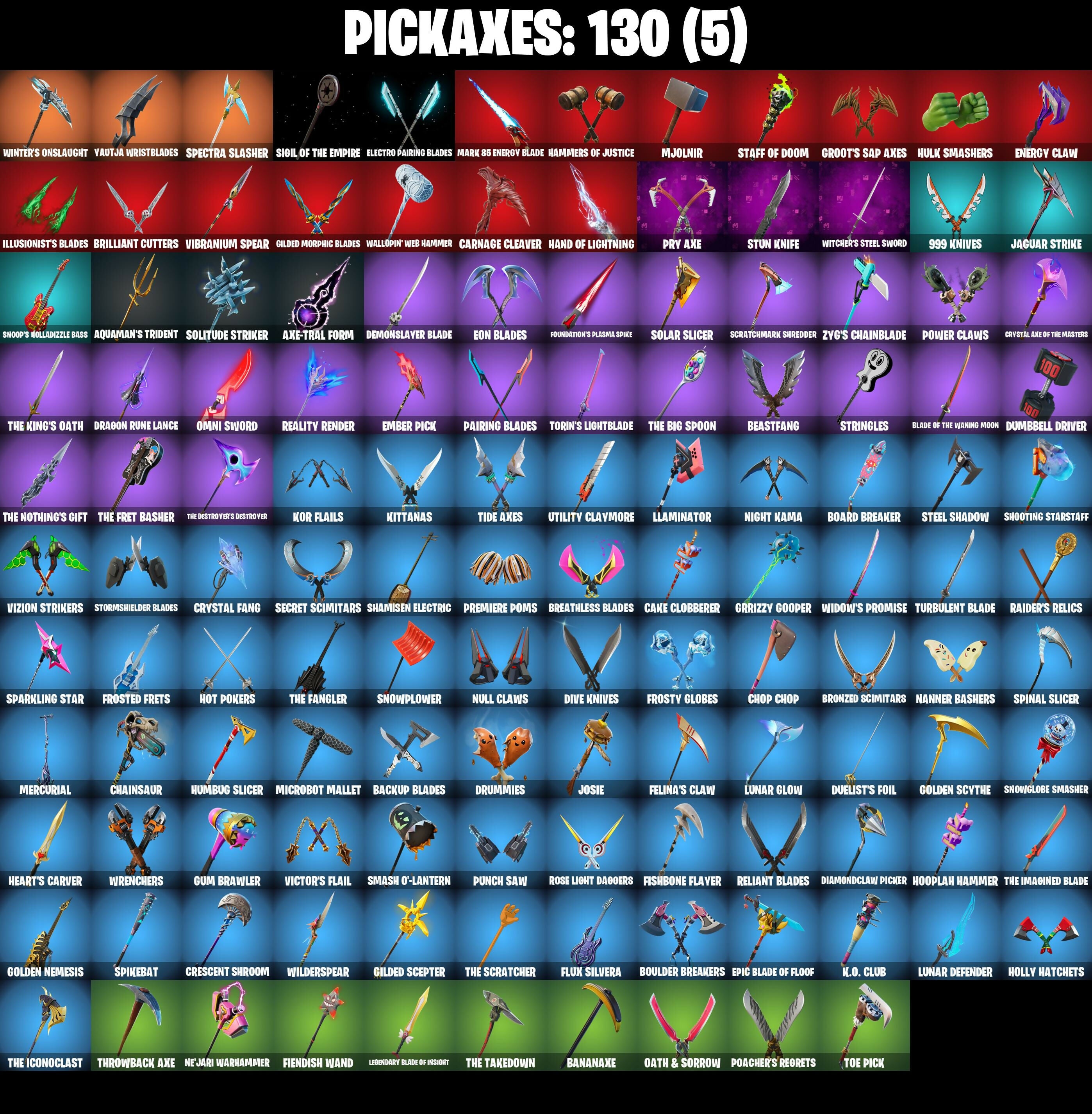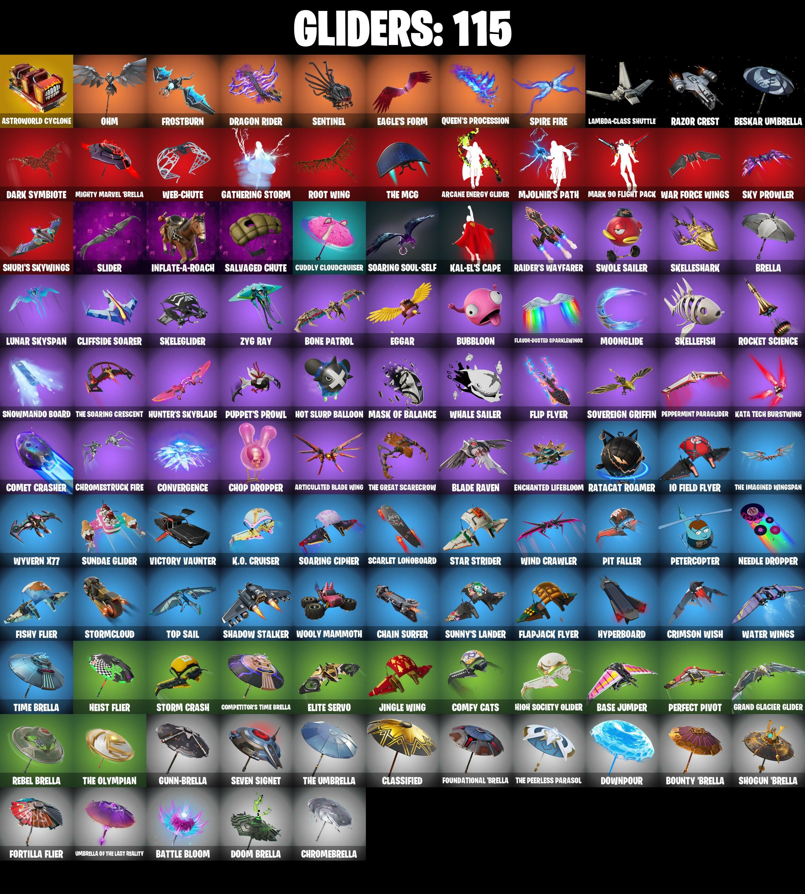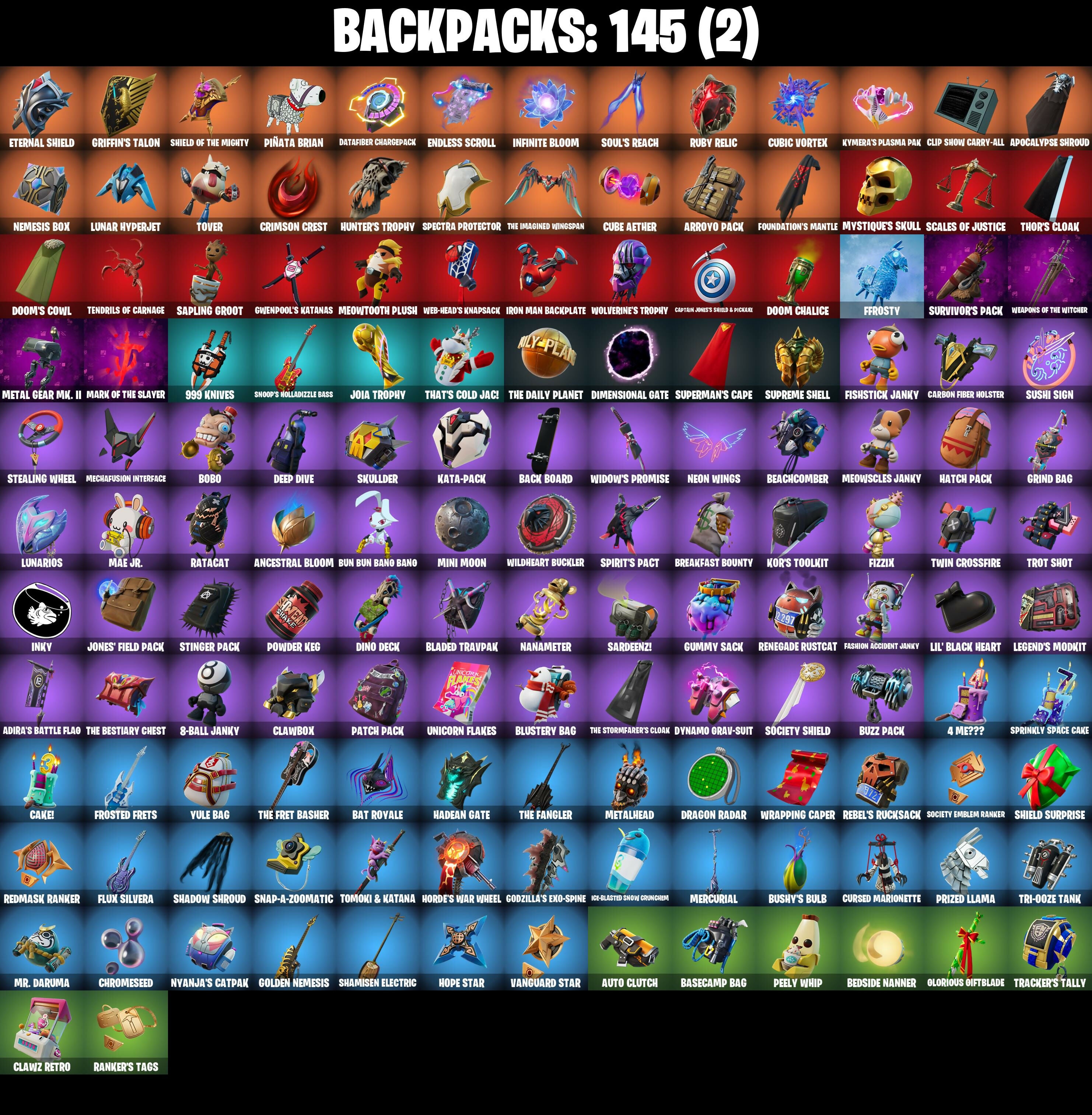 10 Field Flyer, 4 Me???, 8-Ball Janky, 999 Knives, A Warrior Prepares, Adira, Adira's Battle Flag, Agent Jones, Agent Jones (Jump 31), Air Shredder, Ancestral Bloom, Apocalypse Shroud, Aquaman, Aquaman's Trident, Arcane Energy Glider, Arroyo Pack, Arthur Curry, Articulated Blade Wing, Astroworld Cyclone, Auto Clutch, Axe-Tral Form, Azarath Metrion Zinthos!, Back Board, Backup Blades, Balance Board, Bananaxe, Base Jumper, Basecamp Bag, Bat Royale, Battle Bloom, Battle Call, Beachcomber, Bean Bag, Beastfang, Bedside Nanner, Beep Beep, Beskar Umbrella, Black, Blade Raven, Blade of the Waning Moon, Bladed Travpak, Blowin' Up, Blustery Bag, Board Breaker, Bobo, Bone Patrol, Boogie Down, Boomin', Boots 'N' Cats, Boulder Breakers, Bounty 'Brella, Breakfast Bounty, Breathless Blades, Brella, Brilliant Cutters, Bronzed Scimitars, Bubbloon, Bun Bun Bang Bang, Burning Ambition Valeria, Bushy's Bulb, Buzz Pack, Bytes, Bytes (Lone Traveler), Cake Clobberer, Cake!, Call Me, Captain Jones's Shield & Pickaxe, Captain Llamerica, Carbon Fiber Holster, Card Drop, Cardistry, Carnage, Carnage (Maximum), Carnage Cleaver, Cauldron Chill, Chain Surfer, Chainsaur, Charlotte, Choice Knit, Chop Chop, Chop Dropper, Chromebrella, Chromeseed, Chromestruck Fire, Clark Kent, Clark Kent (Superman), Classified, Clawbox, Clawz Retro, Clean Sweep, Cliffside Soarer, Cluck, Cluck (Slurpy), Comet Crasher, Comfy Cats, Competitor's Time Brella, Convergence, Crescent Shroom, Crimson Crest, Crimson Wish, Crowning Achievement, Crystal Axe of the Masters, Crystal Fang, Cube Aether, Cubic Vortex, Cuddly Cloudcruiser, Cup Show Cabry-All, Cursed Marionette, Cyclo Curl, Dark Symbiote, Darth Vader, Datafiber Chargedpack, Deep Dive, Demonslayer Blade, Diamond Throne, Diamondclaw Picker, Dimensional Gate, Dino Deck, Dive Knives, Do The 'Split, Doctor Doom, Doctor Doom (God Emperor), Doom Brella, Doom Chalice, Doom's Cowl, Downpour, Doze Dab, Dragon Radar, Dragon Rider, Dragon Rune Lance, Drummies, Duelist's Foil, Dumbbell Driver, Dynamo Grav-Suit, Eagle's Form, Eggar, Electro Pairing Blades, Elite Servo, Ember Pick, Enchanted Lifebloom, Endless Scroll, Energy Claw, Eon Blades, Epic Blade of Floof, Eternal Knight, Eternal Shield, Evasive Maneuvers, Evie, Fabio Sparklemane, Fade, Fancy Peter Griffin, Fashion Accident Janky, Felina, Felina's Claw, Ffrosty, Fiendish Wand, Fishbone Flayer, Fishstick Janky, Fishy Flier, Fist Bump, Fizzix, Flapjack Flyer, Flashback Breakdown, Flavor-Dusted Sparklewings, Flip Flyer, Flippin' Away, Flux Silvera, Foil Flex, Fortilla Flier, Foundation's Mantle, Foundation's Plasma Spike, Foundational 'Brella, Frost Squad, Frostburn, Frosted Frets, Frosty Globes, G'mere, Gathering Storm, Geralt Of Rivia, Gilded Morphic Blades, Gilded Scepter, Glorious Giftblade, Godzilla's Exo-Spine, Golden Nemesis, Golden Scythe, Grand Glacier Glider, Griffin's Talon, Grind Bag, Groot, Groot (Silver Foil), Groot's Sap Axes, Grriz, Grrizzly Gooper, Guggimon, Gum Brawler, Gumbo, Gummy Sack, Gunn-Brella, Gunnar, Gwenpool's Katanas, Hadean Gate, Hammers of Justice, Hand of Lightning, Hand-Forged, Hang Loose Celebration, Happy, Harbinger Armor Omegadox, Harlowe, Hatch Pack, Haven, Heart Sign, Heart's Carver, Heist Flier, High Society Glider, Holiday Boxy, Holly Hatchets, Hooplah Hammer, Hope, Hope Star, Horde's War Wheel, Hot Pokers, Hot Slurp Balloon, Hulk Smashers, Humbug Slicer, Hunter's Skyblade, Hunter's Trophy, Hyperboard, I Declare!, I'm A Mystery, Ice-Blasted Snow Crunchem, Igni Sign, Illusionist's Blades, Imperial March, Infinite Bloom, Inflate-A-Roach, Inky, Iron Man Backplate, It Is Finished, It's... You?, J.B. Chimpanski, J.B. Chimpanski (Helmet), Jaguar Strike, Jennifer Walters, Jet Signals, Jingle Wing, Joia Trophy, Jones' Field Pack, Josie, Jules, K.O. Club, K.O. Cruiser, Kal-El's Cape, Kata Tech Burstwing, Kata-Pack, Keyed Up, Kiara K.O., Kiara K.O. (Captain's Bomber), Kit, Kittanas, Knife Sharpener, Kondor, Kor, Kor (Trenchcoat), Kor Flails, Kor's Toolkit, Krisabelle, Kymera, Kymera's Plasma Pak, Lambda-Class Shuttle, Lara Croft, Lara Croft (Gold Anniversary), Laser Focused, Legend's Modkit, Legendary Blade of Insight, Lennox Rose, Lexa, Lexa (Warstrike), Lil Split, Lil' Black Heart, Lil' Longboat, Lil' Monster, Lil' Rover, Lil' Saucer, Llaminator, Love It!, Lt. John Llama, Lunar Charge, Lunar Defender, Lunar Glow, Lunar Hyperjet, Lunar Party, Lunar Skyspan, Lunarios, Mae Jr., Make A Seat, Malik, Malik (Solitary Defender), Mancake, Mandalorian, Mandalorian (Clothing), Mark 85 Energy Blade, Mark 90 Flight Pack, Mashed Potato, Mask Of Balance, Masked, Massai, Mave, Mave (Reactive Hair Off), Mechafusion Interface, Menace, Menace (Challenger Menace - Flame), Meow Skulls, Meowscles Janky, Meowtooth Plush, Mercurial, Metal Gear Mk. II Mark of the Slayer, Metalhead, Microbot Mallet, Mighty Marvel 'Brella, Miku Live, Mini Moon, Mjolnir, Mjolnir's Path, Montague, Moonglide, Mr. Daruma, Mwahaha, Mystique, Mystique (Tactical), Mystique's Skull, Nailed It, Nanameter, Nanner Bashers, Ne'Jari Warhammer, Needle Dropper, Nemesis Box, Neon Wings, Neymar Jr, Night Kama, Nisha, Null Claws, Nyanja's Catpak, Oath & Sorrow, Ocean, Ohm, Old Snake, Omegarok, Omni Sword, Oscar, Pairing Blades, Paradigm (Reality-659), Patch Pack, Peely Whip, Pelé's Air Punch, Peppermint Paraglider, Perfect Pivot, Peter Griffin, Petercopter, Pit Faller, Piñata Brian, Planetary Vibe, Poacher's Regrets, Polar Peely, Popular Vibe, Powder Keg, Power Claws, Predator, Premiere Poms, Prized Llama, Prowler, Pry Axe, Punch Saw, Puppet's Prowl, Queen's Procession, Rage, Raider's Relics, Raider's Wayfarer, Raise The Cup, Ranker's Tags, Ratacat, Ratacat Roamer, Raz, Razor Crest, Ready When You Are, Reality Render, Rebel Brella, Rebel's Rucksack, Rebirth Raven, Redmask Ranker, Reese, Reliant Blades, Renegade Lynx, Renegade Rustcat, Respect The Peace, Riptide, Rocket Science, Ronin, Ronin (Cape), Root Wing, Rose Light Daggers, Rough Cut Montague, Ruby Relic, Runway Racer, Sab