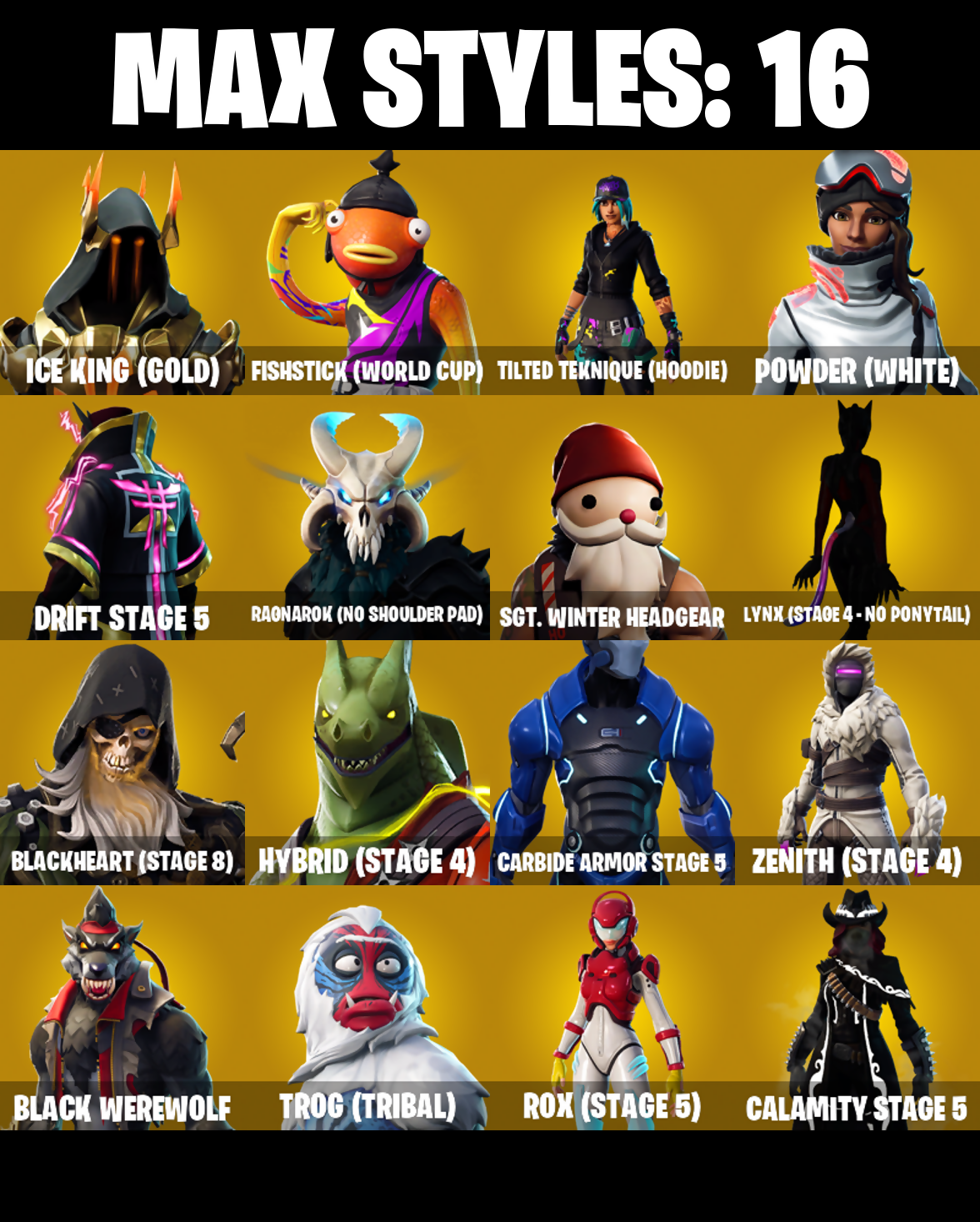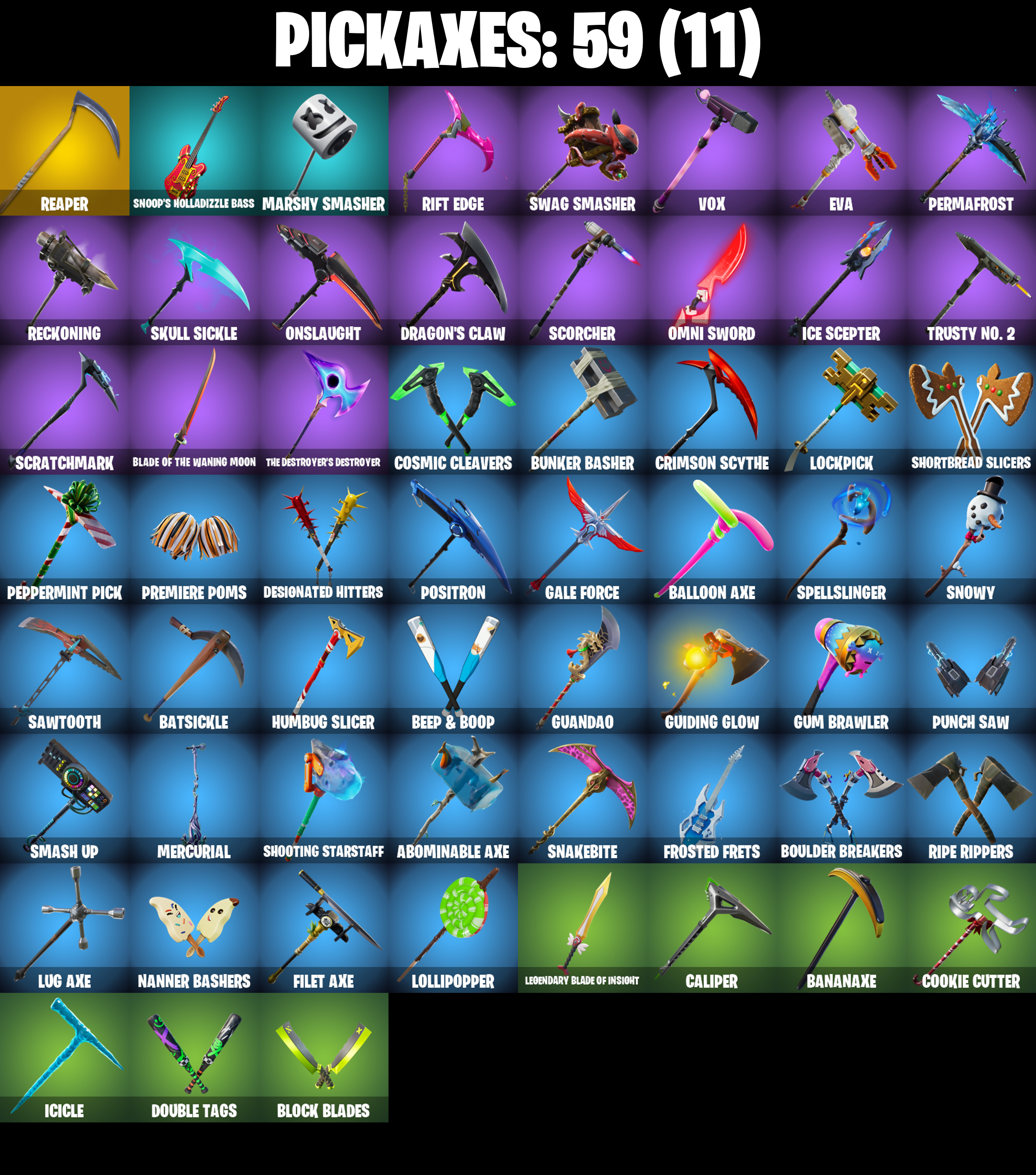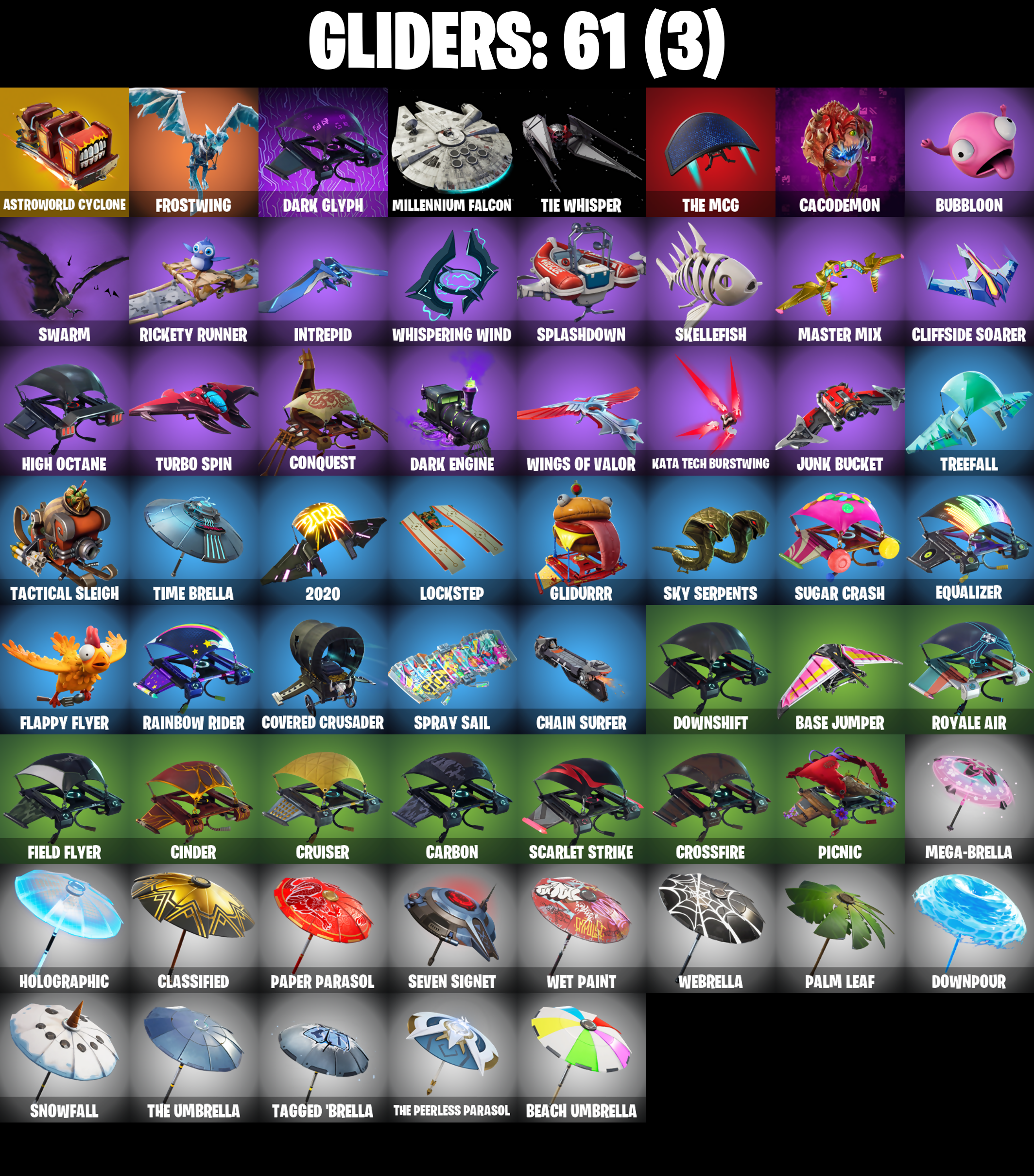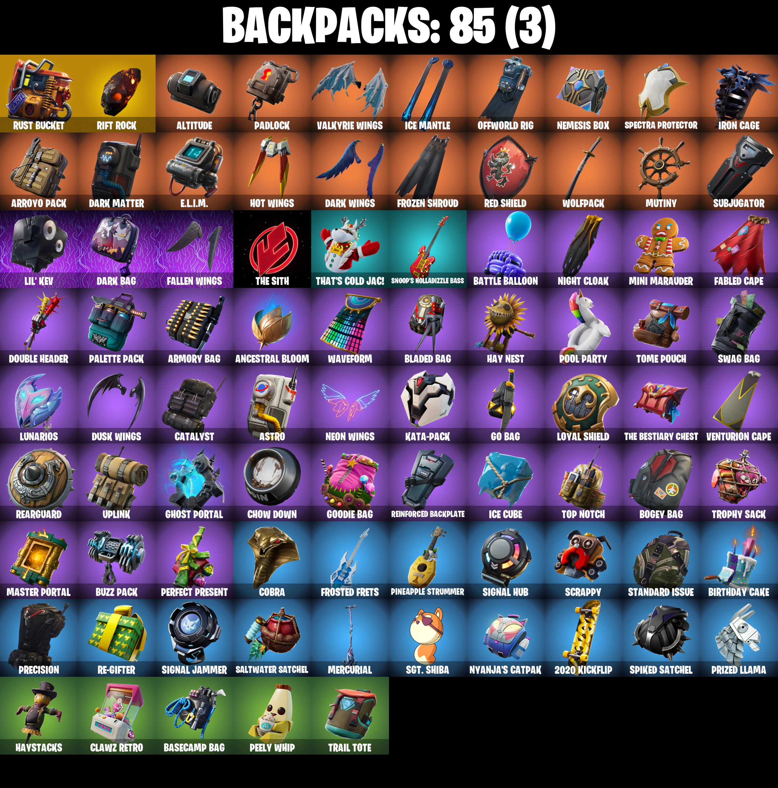 2020, 2020 Kickflip, A.I.M., Abominable Axe, Altitude, Ancestral Bloom, Arctic Assassin, Armory Bag, Arroyo Pack, Aspen, Astro, Astroworld Cyclone, B.R.U.T.E. Gunner, Balloon Axe, Bananaxe, Bandolier, Base Jumper, Basecamp Bag, Batsickle, Battle Balloon, Battlehawk, Beach Umbrella, Beep & Boop, Best Mates, Birthday Cake, Black Werewolf, Blackheart, Blackheart (Stage 8), Blade of the Waning Moon, Bladed Bag, Block Blades, Bogey Bag, Boneless, Boulder Breakers, Breakdown, Breakpoint, Bring It, Brite Bomber, Bubbloon, Bullseye, Bunker Basher, Bunker Jonesy, Bunnymoon, Buzz Pack, Cacodemon, Calamity, Calamity Stage 5, Calculated, Caliper, Call Me, Carbide, Carbide Armor Stage 5, Carbon, Cat Flip, Catalyst, Chain Surfer, Chow Down, Cinder, Classified, Clawz Retro, Clean Groove, Cliffside Soarer, Cluck Strut, Cobalt, Cobra, Commando, Conga, Conquest, Cookie Cutter, Cosmic Cleavers, Covered Crusader, Crimson Scythe, Criss Cross, Crossfire, Crowning Achievement, Cruiser, DJ Yonder, Dab, Dabstand, Dance Therapy, Dark Bag, Dark Bomber, Dark Engine, Dark Glyph, Dark Matter, Dark Voyager, Dark Wings, Designated Hitters, Devastator, Dire, Doggo, Double Header, Double Tags, Downpour, Downshift, Doze Dab, Dragon Stance, Dragon's Claw, Dream Feet, Drift, Drift Stage 5, Dusk, Dusk Wings, E.L.L.M., Electro Shuffle, Electro Swing, Elite Agent, Elmira, Enforcer, Equalizer, Eva, Extraterrestrial, Fable, Fabled Cape, Fallen Love Ranger, Fallen Wings, Field Flyer, Filet Axe, Finger Guns, Fishstick (World Cup), Fist Pump, Flamenco, Flappy Flyer, Flippin' Away, Free Flow, Fresh, Frosted Frets, Frostwing, Frozen Shroud, Gale Force, Gentleman's Dab, Get Funky, Ghost Portal, Giddy-Up, Glidurr, Go Bag, Golf Clap, Goodie Bag, Grill Sergeant, Groove Jam, Guan Yu, Guandao, Guiding Glow, Guitar Walk, Gum Brawler, Hay Man, Hay Nest, Haystacks, Headbanger, Hello Friend, High Octane, Holographic, Hot Wings, Humbug Slicer, Huntress, Hybrid, Hybrid (Stage 4), Hype, Hypnot-Eyes, I Declare!, Ice Cube, Ice King (Gold), Ice Mantle, Ice Scepter, Icicle, Infectious, Inferno, Infinite Dab, Intrepid, Iron Cage, It's Go Time!, It's... You?, Jaywalking, Jubilation, Jump Jets, Junk Bucket, Kata Tech Burstwing, Kata-Pack, Keep It Mello, Kiss The Cup, Laguna, Legendary Blade of Insight, Lil' Kev, Living Large, Llamacadabra, Lockpick, Lockstep, Lollipopper, Love It!, Loyal Shield, Lt. Evergreen, Lug Axe, Lunarios, Lynx, Lynx (Stage 4 - No Ponytail), Make It Rain, Marshmello, Marshy Smasher, Master Mix, Master Portal, Mega-Brella, Mercurial, Merry Marauder, Mic Drop, Millennium Falcon, Mini Marauder, Mission Specialist, Moonwalker, Mutiny, Nanner Bashers, Nemesis Box, Neon Wings, Night Cloak, Nightshade, No Sweat, Nyanja's Catpak, Offworld Rig, Omega, Omni Sword, Onesie, Onslaught, Orange Justice, Padlock, Palette Pack, Palm Leaf, Paper Parasol, Peace Out, Peekaboo, Peely, Peely Whip, Peppermint Pick, Perfect Present, Permafrost, Phone It In, Picnic, Pineapple Strummer, Point It Out, Poised Playmaker, Pool Party, Pop Lock, Popcorn, Positron, Powder, Powder (White), Precision, Premiere Poms, Prized Llama, Punch Saw, Ragnarok, Rainbow Rider, Rambunctious, Raonarok (No Shoulder Pad), Ravage, Raven, Re-Gifter, Reaper, Rearguard, Reckoning, Recon Specialist, Red Knight, Red Shield, Red Strike, Redline, Regal Wave, Reinforced Backplate, Respect, Respect The Peace, Rickety Runner, Rift Edge, Rift Rock, Ripe Rippers, Rock Out, Rogue Agent, Rook, Rox, Rox (Stage 5), Royale Air, Running Man, Rust Bucket, Rust Lord, Sad Trombone, Saltwater Satchel, Salute, Sawtooth, Scarlet Strike, Scorcher, Scorpion, Scrappy, Scratchmark, Sentinel, Seven Signet, Sgt. Green Clover, Sgt. Shiba, Sgt. Winter, Sgt. Winter Headgear, Shaolin Sip, Sharpshooter, Shimmer, Shooting Starstaff, Shortbread Slicers, Sidewinder, Signal Hub, Signal Jammer, Signature Shuffle, Skellefish, Skull Sickle, Skull Trooper, Sky Serpents, Sledgehammer, Slitherin', Slow Clap, Smash Up, Smooth Moves, Snakebite, Snoop's Holladizzle Bass, Snoozefest, Snowfall, Snowshaker, Snowy, Sparkplug, Spectra Protector, Spellslinger, Spiked Satchel, Splashdown, Spray Sail, Squad Leader, Squat Kick, Standard Issue, Subjugator, Sugar Crash, Summit Striker, Sun Strider, Swag Bag, Swag Smasher, Swarm, Swipe It, T-Pose, Tactical Sleigh, Tagged 'brella, Take The L, Teknique, That's Cold Jac!, The Ace, The Bestiary Chest, The Destroyer's Destroyer, The Ice King, The Mcg, The Peerless Parasol, The Prisoner, The Reaper, The Robot, The Sith, The Umbrella, The Visitor, Tidy, Tie Whisper, Tilted Teknique, Tilted Teknique (Hoodie), Time Brella, Tome Pouch, Top Notch, Tra La La, Trail Tote, Treefall, Trog, Trog (Tribal), Trophy Sack, True Heart, True Love, Trusty No. 2, Tsuki 2.0, Turbo Spin, Uplink, Valkyrie, Valkyrie Wings, Valor, Vega, Venturion, Venturion Cape, Verge, Vivacious, Vox, Waterworks, Waveform, Waypoint, Webrella, Wet Paint, Whispering Wind, Wiggle, Wilde, Wingman, Wings Of Valor, Wolfpack, Wooly Warrior, World Warrior, X-Lord, Yay!, You're Awesome, Zenith, Zenith (Stage 4), Zoe Clash, Zoey