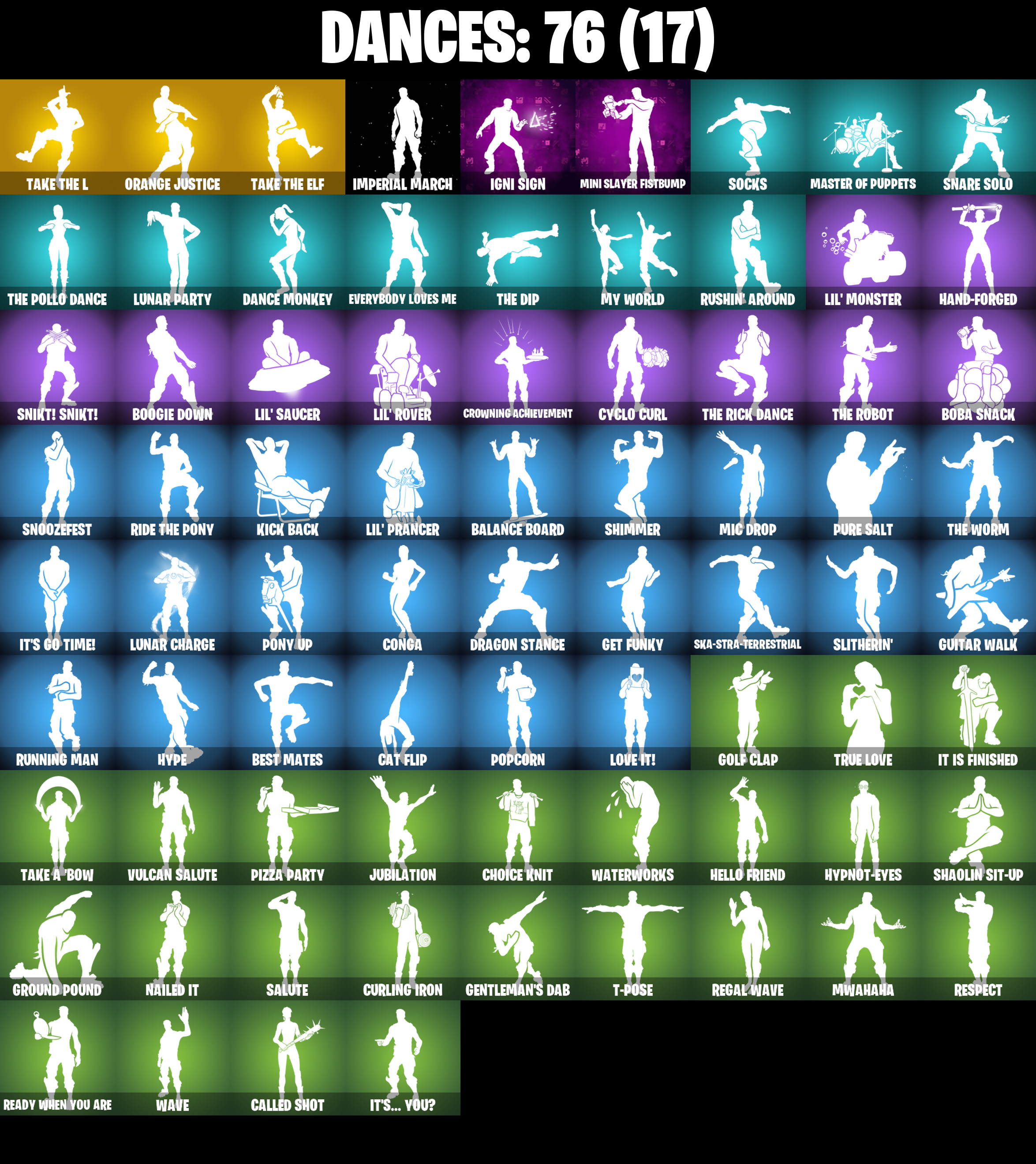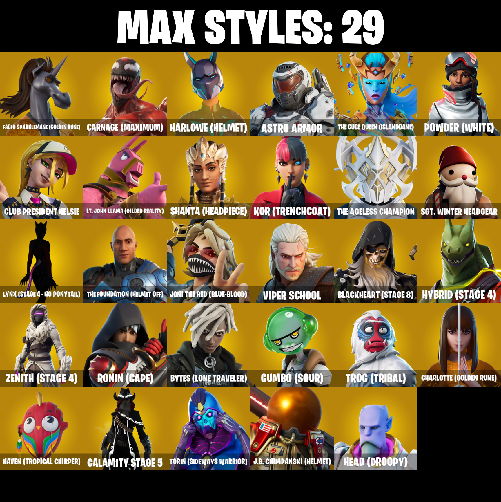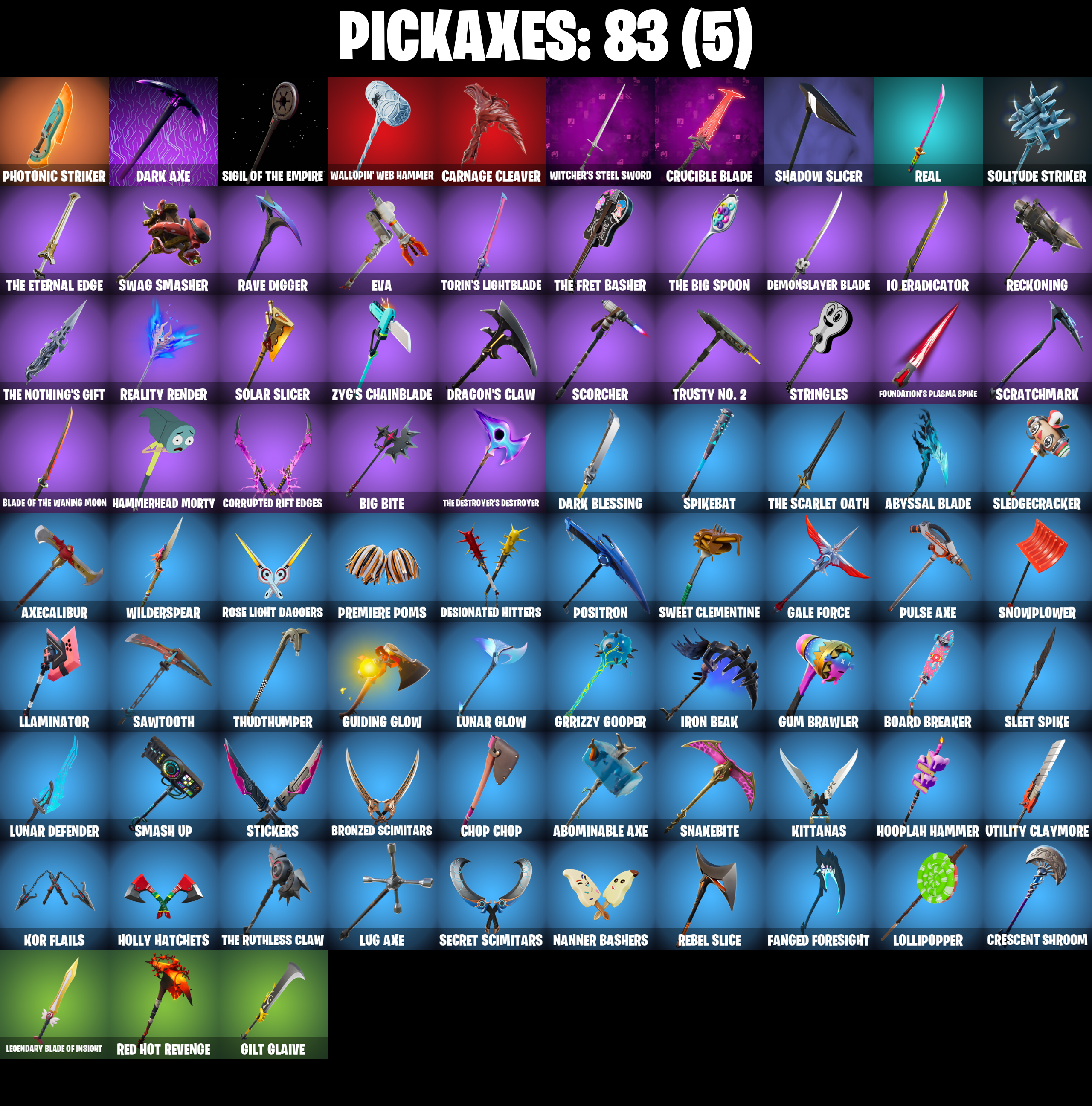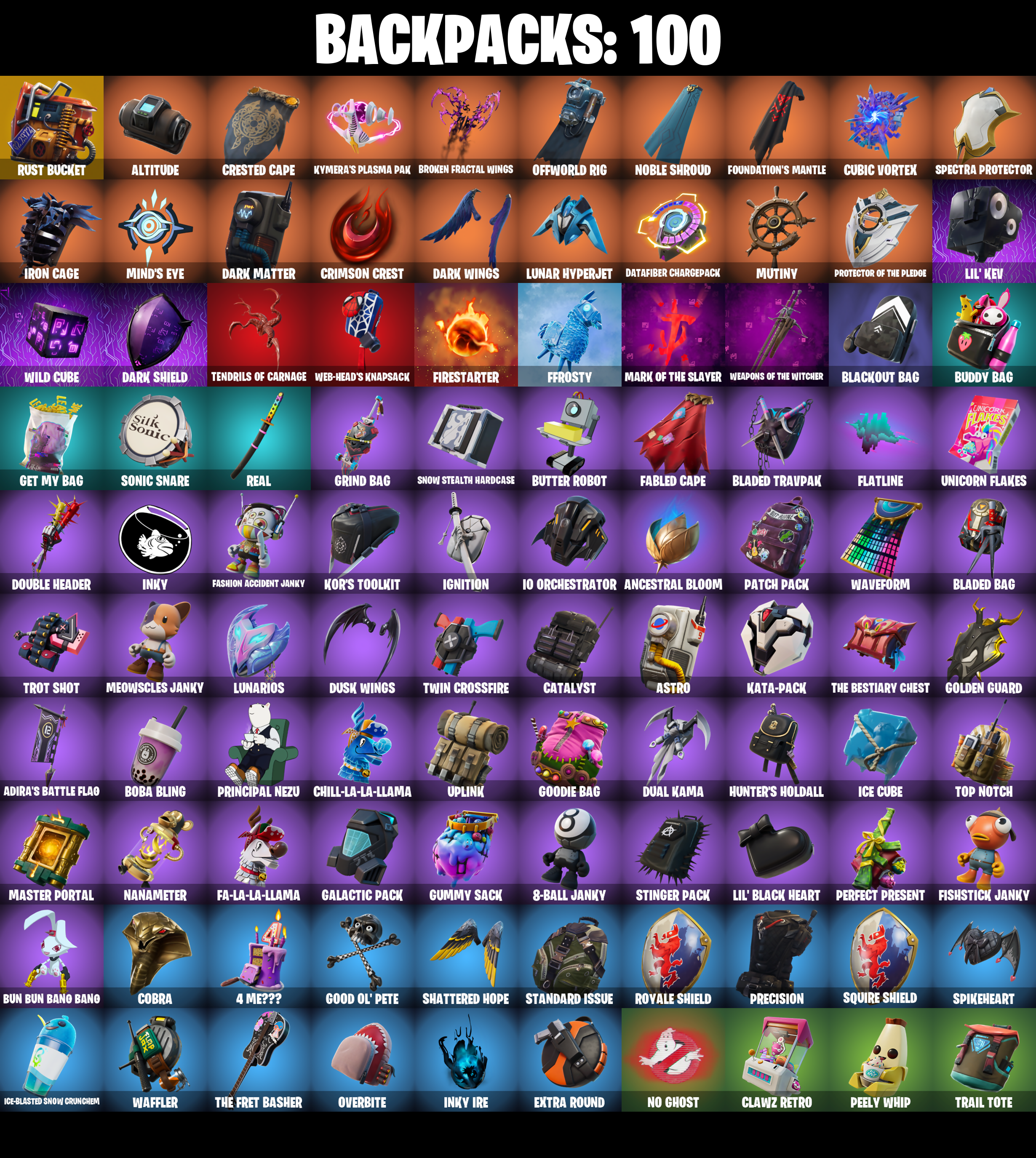4 Me???, 8-Ball Janky, Abominable Axe, Absenz, Abyssal Blade, Adira's Battle Flag, Aftermath, All Might, Altitude, Amplitude, Ancestral Bloom, Anderson .Paak, Arctic Adeline, Astro, Astro Armor, Axecalibur, Balance Board, Battle Bloom, Battle Hound, Battlehawk, Beach Umbrella, Best Mates, Big Bite, Blackheart, Blackheart (Stage 8), Blackout Bag, Blade of the Waning Moon, Bladed Bag, Bladed Travpak, Blaze, Blue Squire, Board Breaker, Boba Bling, Boba Snack, Boogie Down, Broken Fractal Wings, Bronzed Scimitars, Bubbloon, Buddy Bag, Bun Bun Bang Bang, Butter Robot, Bytes, Bytes (Lone Traveler), Cacodemon, Calamity, Calamity Stage 5, Called Shot, Carbide, Carbon, Carnage, Carnage (Maximum), Carnage Cleaver, Cat Flip, Catalyst, Charlotte, Charlotte (Golden Rune), Chill-La-La-Llama, Choice Knit, Chop Chop, Chop Dropper, Chromebrella, Chromestruck Fire, Cinder, Clawz Retro, Club President Helsie, Cobra, Comfy Chomps, Commander's Descent, Commando, Conga, Corrupted Rift Edges, Corrupted Tendrils, Covered Crusader, Crescent Shroom, Crested Cape, Crimson Crest, Crossfire, Crowning Achievement, Crucible Blade, Cubic Vortex, Curling Iron, Cyclo Curl, D'ark, DJ Yonder, Dance Monkey, Dark Axe, Dark Blessing, Dark Jonesy, Dark Matter, Dark Red Knight, Dark Shield, Dark Symbiote, Dark Voyager, Dark Wild Card, Dark Wings, Datafiber Chargepack, Demonslayer Blade, Designated Hitters, Dizzie, Doctor Slone, Doom Slayer, Double Header, Downshift, Dragon Stance, Dragon's Claw, Driftwalker, Dual Kama, Dusk Wings, Dusty, Elite Agent, Enchanted Lifebloom, Equalizer, Eva, Everybody Loves Me, Extra Round, Fa-La-La-Llama, Fabio Sparklemane, Fabio Sparklemane (Golden Rune), Fable, Fabled Cape, Fanged Foresight, Fashion Accident Janky, Feathered Flyer, Ffrosty, Fiery Descent, Firestarter, Fishstick Janky, Flatline, Flavor-Dusted Sparklewings, Flip Flyer, Foundation's Mantle, Foundation's Plasma Spike, Fox Fire, Galactic Pack, Gale Force, Gentleman's Dab, Geralt of Rivia, Get Down!, Get Funky, Get My Bag, Giddy-Up, Gildhart, Gilt Glaive, Glidurrr, Golden Guard, Golf Clap, Good Ol' Pete, Goodie Bag, Grind Bag, Ground Pound, Grrrizzy Gooper, Guggimon, Guiding Glow, Guitar Walk, Gum Brawler, Gumbo, Gumbo (Sour), Gummy Sack, Hammerhead Morty, Hand-Forged, Har-Har-Har!, Harlowe, Harlowe (Helmet), Haven, Haven (Tropical Chirper), Head (Droopy), Hello Friend, Helsie, Holly Hatchets, Hooplah Hammer, Hunter's Holdall, Hybrid, Hybrid (Stage 4), Hype, Hypnot-Eyes, IO Field Flyer, IO Orchestrator, IO Stealth Sail, Ice Cube, Ice-Blasted Snow Crunchgem, Igni Sign, Ignition, Imperial March, Infield Fly, Inflate-a-Roach, Inky, Inky Ire, Intrepid, Invasion, Io Eradicator, Iron Beak, Iron Cage, It Is Finished, It's Go Time!, It's... You?, J Balvin, J.B. Chimpanski, J.B. Chimpanski (Helmet), Joey, Joni The Red, Joni The Red (Blue-Blood), Jubilation, Kal-El's Cape, Kata-Pack, Kick Back, Kittanas, Kor, Kor (Trenchcoat), Kor Flails, Kor's Toolkit, Krisabelle, Kuno, Kymera, Kymera's Plasma Pak, Legendary Blade of Insight, Lil' Black Heart, Lil' Kev, Lil' Monster, Lil' Prancer, Lil' Rover, Lil' Saucer, Llaminator, Lockstep, Lollipopper, Loserfruit, Love It!, Lt. John Llama, Lt. John Llama (Gilded Reality), Lug Axe, Lunar Charge, Lunar Defender, Lunar Glow, Lunar Hyperjet, Lunar Party, Lunarios, Lynx, Lynx (Stage 4 - No Ponytail), Major Mancake, Mako, Mark Of The Slayer, Massai, Master Of Puppets, Master Portal, Meowscles Janky, Mic Drop, Mina Park, Mind's Eye, Mini Slayer Fistbump, Mission Specialist, Moniker, Moonglide, Moonwalker, Mutiny, Mwahaha, My World, Nailed It, Nana-Brella, Nanameter, Nanner Bashers, Nezumi, No Ghost, Noble Shroud, Offworld Rig, Orange Justice, Overbite, Palm Leaf, Paper Parasol, Paradigm (Reality-659), Patch Pack, Peely, Peely Whip, Perfect Present, Photonic Striker, Picnic, Pizza Party, Polar Peely, Pony Up, Popcorn, Positron, Powder, Powder (White), Precision, Premiere Poms, Principal Nezu, Protector Of The Pledge, Psionic Surfer, Pulse Axe, Pure Salt, Queen's Procession, Rainbow Rider, Ravage, Rave Digger, Raven, Ready When You Are, Real, Reality Render, Rebel Brella, Rebel Slice, Reckoning, Red Hot Revenge, Red Strike, Regal Wave, Respect, Rick Sanchez, Rick's UFO Cruiser, Rickety Runner, Ride The Pony, Rocket Science, Rogue Agent, Ronin, Ronin (Cape), Rose Light Daggers, Royale Air, Royale Knight, Royale Shield, Ruby Shadows, Running Man, Rushin' Around, Rust Bucket, Rust Lord, Salute, Sawtooth, Scorcher, Scratchmark, Secret Scimitars, Selene, Sentinel, Seven Signet, Sgt. Winter, Sgt. Winter Headgear, Shadow Slicer, Shanta, Shanta (Headpiece), Shaolin Sit-Up, Shattered Hope, Shimmer, Sidewinder, Sigil of the Empire, Sir Glider The Brave, Ska-Stra-Terrestrial, Sky Serpents, Sky Shadow, Sled Ready Guff, Sledgecracker, Sleet Spike, Slitherin', Smash Up, Snakebite, Snare Solo, Snikt! Snikt!, Snoozefest, Snow Stealth Hardcase, Snow Stealth Slone, Snowfall, Snowflake, Snowmando Board, Snowplower, Socks, Solar Slicer, Solitude Striker, Sonic Snare, Spectra Protector, Spider-Man, Spikebat, Spikeheart, Squire Shield, Standard Issue, Stickers, Stinger Pack, Storm Crash, Stringles, Sugar Crash, Summit Striker, Sunny, Sunny's Lander, Swag Smasher, Sweet Clementine, T-Pose, Tactical Sleigh, Take A 'Bow, Take The Elf, Take The L, Teknique, Tendrils Of Carnage, The Ageless, The Ageless Champion, The Bestiary Chest, The Big Spoon, The Cube Queen, The Cube Queen (Islandbane), The Destroyer's Destroyer, The Dip, The Eternal Edge, The Foundation, The Foundation (Helmet Off), The Fret Basher, The Kid Laroi, The Nothing's Gift, The Peerless Parasol, The Pollo Dance, The Reaper, The Rick Dance, The Robot, The Rocket Wing, The Ruthless Claw, The Scarlet Oath, The Soaring Crescent, The Umbrella, The Visitor, The Worm, Thudthumper, Time Brella, Toona Fish, Top Notch, Torin, Torin (Sideways Warrior), Torin's Lightblade, Trail Tote, Trog, Trog (Tribal), Trot Shot, True Love, Trusty No. 2, Twin Crossfire, Umbrella Of The Last Reality, Uni