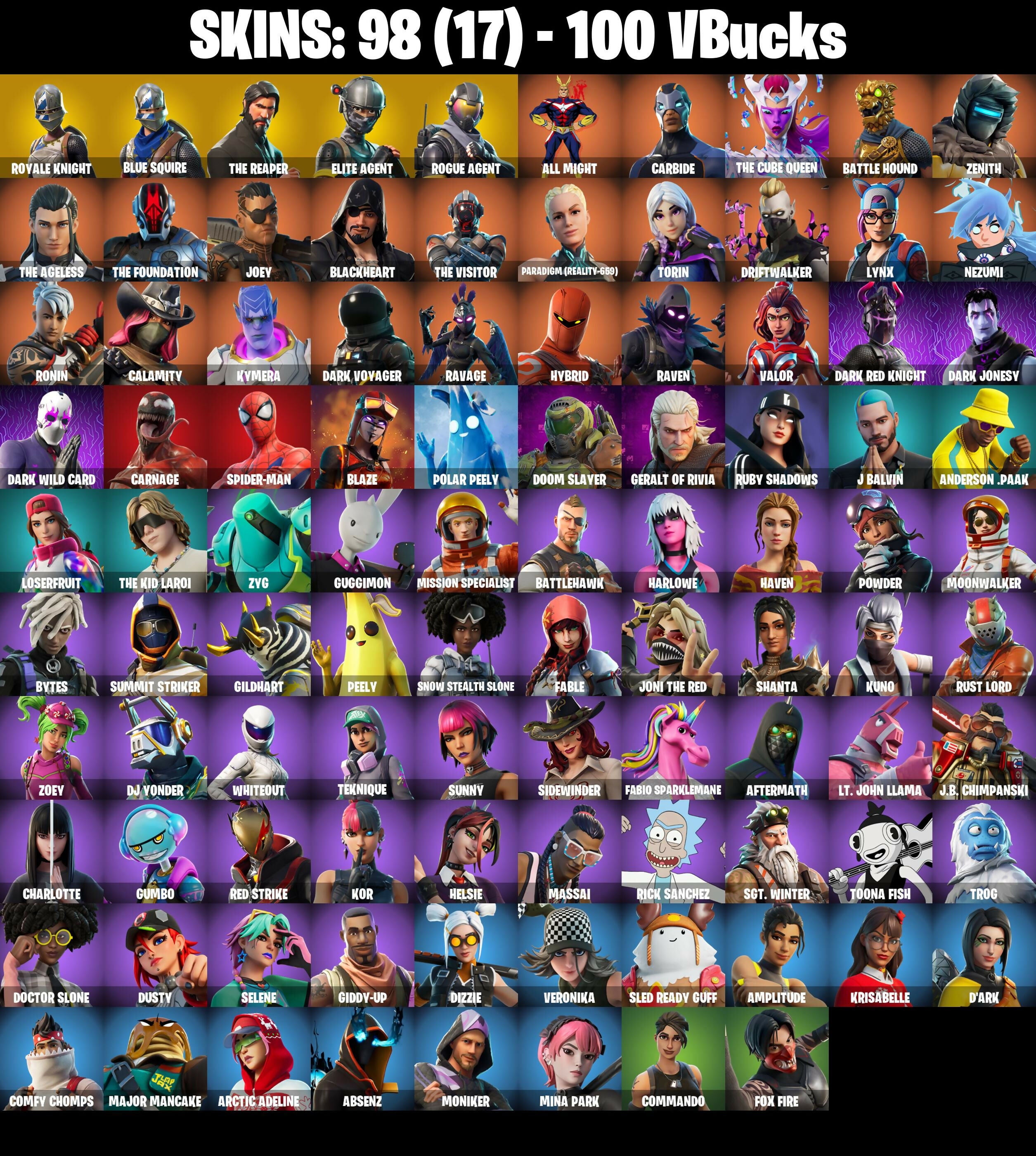 PC/PSN/XBOX |98 skins | Royale Knight | Blue Squire | The Reaper | Elite Agent | Take The L | Mako | Orange Justice | Dark Voyager | #B916