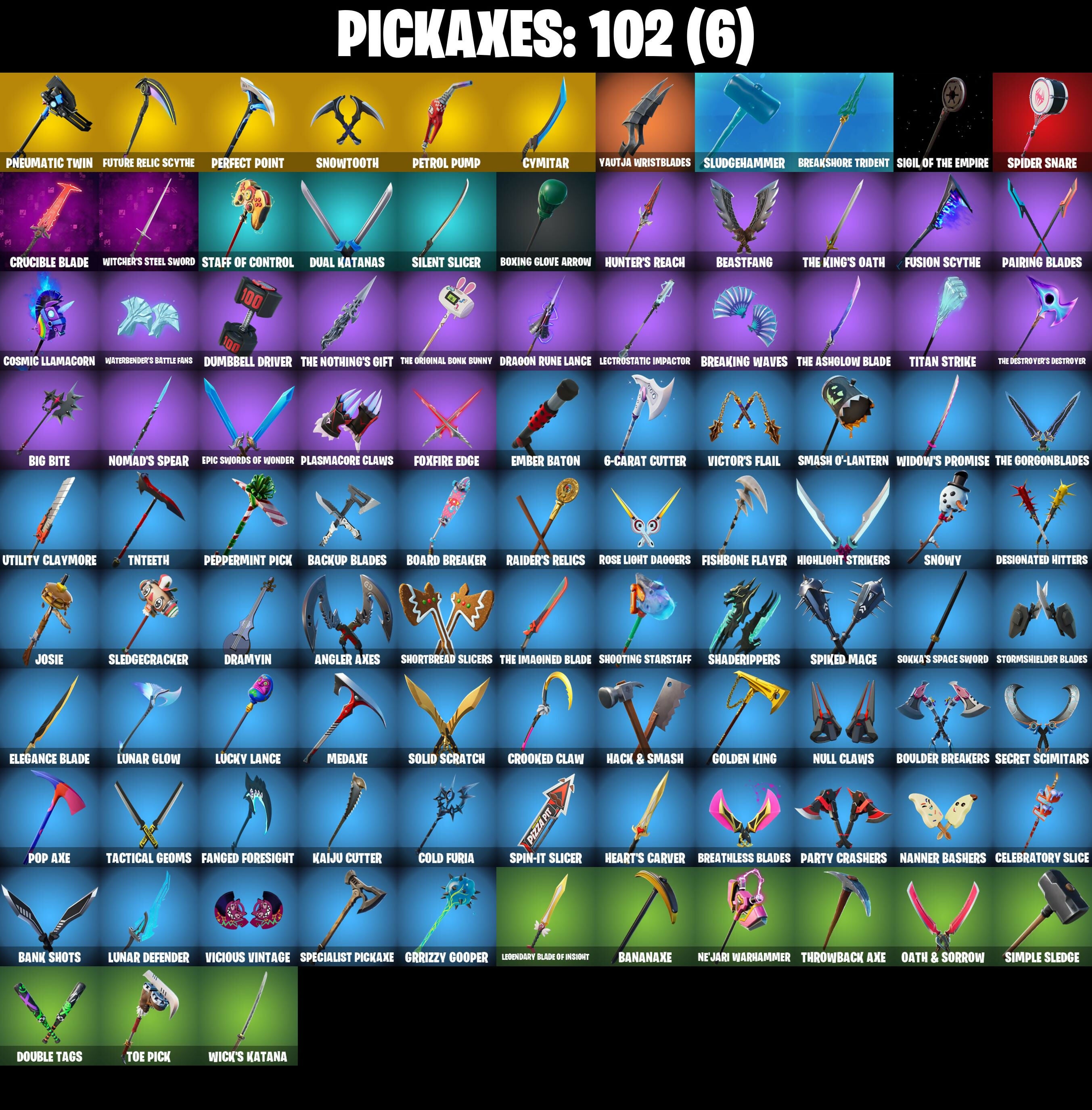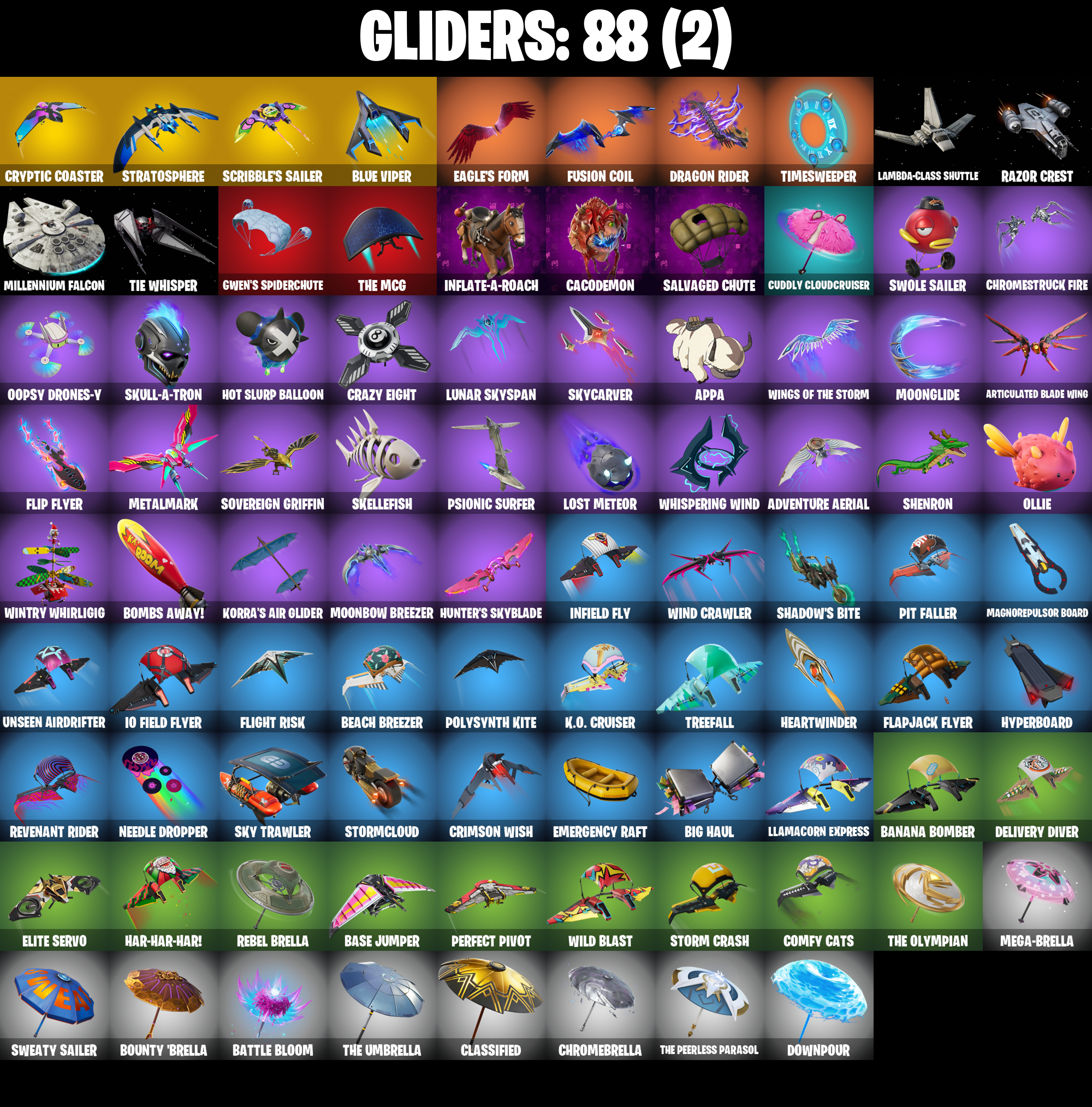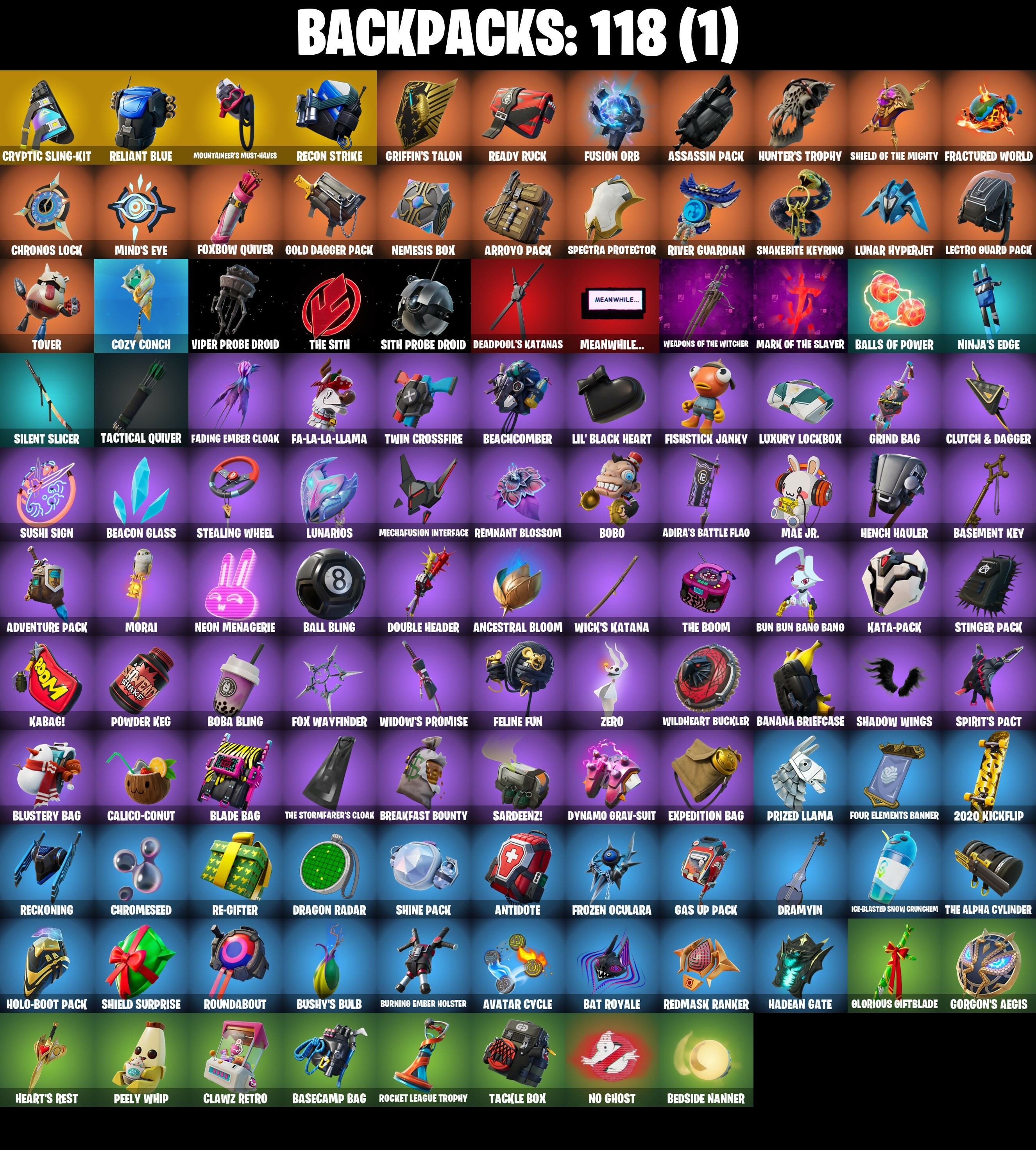 2020 Kickflip, 6-Carat Cutter, 8-Ball VS Scratch, A Warrior Prepares, Adira, Adira (Battle Mask), Adira's Battle Flag, Adventure Aerial, Adventure Pack, Agent Peely, Ahsoka Tano, Ancestral Bloom, Angler Axes, Antidote, Antonia, Aphrodite, Appa, Arachnrobatics, Arctic Adeline, Arroyo Pack, Articulated Blade Wing, Ascension Nezomi, Assassin Pack, Astro Armor, Avatar Cycle, Avatar's Flourish, Backup Blades, Balance Board, Balanced, Ball Bling, Balls of Power, Banana Bomber, Banana Briefcase, Bananaxe, Bank Shots, Base Jumper, Basecamp Bag, Basement Key, Bat Royale, Battle Bloom, Beach Breezer, Beachcomber, Beacon Glass, Beastfang, Bedside Nanner, Beep Beep, Big Bite, Big Haul, Blade Bag, Blizzard Bomber, Blowin' Up, Blue Viper, Blustery Bag, Board Breaker, Boba Bling, Bobo, Boing!, Bombs Away!, Boogie Down, Boomin', Boosting Ki, Boulder Breakers, Bounty 'Brella, Boxing Glove Arrow, Breakfast Bounty, Breaking Point, Breaking Waves, Breakshore Trident, Breathless Blades, Brutus, Bubblegum Highwire, Bun Bun Bang Bang, Burning Ember Holster, Bushy's Bulb, Bytes, Bytes (Lone Traveler), Cacodemon, Calico-Conut, Call Me, Cameo VS Chic, Celebratory Slice, Cerberus, Chef's Special, Chic (Yellow), Chrome Punk, Chromebrella, Chromeseed, Chromestruck Fire, Chronos Lock, Classified, Clawz Retro, Clean Sweep, Cloaked Shadow, Clutch & Dagger, Coin Flip, Cold Furia, Comfy Cats, Conch Call, Controller Crew, Coruscant Guard, Cosmic Llamacorn, Cozy Conch, Crack It, Crazy Eight, Crimson Wish, Crooked Claw, Crowning Achievement, Crucible Blade, Cryptic Coaster, Cryptic Sling-Kit, Cuddly Cloudcruiser, Cyclo Curl, Cymitar, Darth Vader, Deadpool, Deadpool Unmasked, Deadpool's Katanas, Delivery Diver, Designated Hitters, Diamond Diva, Dice Roll, Don't Start Now, Doom Slayer, Double Header, Double Tags, Downpour, Dragon Radar, Dragon Rider, Dragoon Rune Lance, Dramyin, Droop, Dual Katanas, Dumbbell Driver, Dusty, Dynamo Grav-Suit, Eagle's Form, Elegance Blade, Elite Servo, Ember Baton, Emergency Raft, Epic Swords of Wonder, Era, Eren Jaeger, Evie, Expedition Bag, Expressionism, Extraterrestrial, Fa-La-La-Llama, Fading Ember Cloak, Fanged Foresight, Feline Fun, Fish Thicc, Fishbone Flayer, Fishstick Janky, Fixer, Flaky Feast, Flapjack Flyer, Flight Risk, Flip Flyer, Flippin' Away, Four Elements Banner, Fox Wayfinder, Foxbow Quiver, Foxfire Edge, Fractured World, Frozen Oculura, Fusion, Fusion Coil, Fusion Orb, Fusion Scythe, Future Relic Scythe, Galaxia, Gas Up Pack, Gear Specialist Maya, Gear Specialist Maya (Hat - Dark), Geralt Of Rivia, Get Out Of Your Mind, Glorious Giftblade, Gold Dagger Pack, Gold Midas, Golden King, Gorgon's Aegis, Green Arrow, Griffin's Talon, Grind Bag, Grriz, Grrizzy Gooper, Gwen's Spiderchute, Hack & Smash, Hadean Gate, Har-Har-Har!, Hazard, Heart's Carver, Heart's Rest, Heartwinder, Helsie, Hench Hauler, High Five, Highlight Strikers, Highwire, Holiday Boxy, Holo-Boot Pack, Hot Slurp Balloon, Howl, Hula Hoopin', Hunter's Reach, Hunter's Skyblade, Hunter's Trophy, Hyperboard, Hypnot-Eyes, I Declare!, Ice-Blasted Snow Grunchem, Igni Sign, Imani, Imperial March, Indiana Jones, Indiana Jones (Temple Explorer), Infield Fly, Inflate-A-Roach, Introducing..., Io Field Flyer, Iris, It Is Finished, Jack Skellington, John Wick, Josie, Journey VS Hazard, Jun-Hwan, K.O. Cruiser, Kabag!, Kaiju Cutter, Kata-Pack, Khaby Lame, Kondor, Korra, Korra's Air Glider, Lambda-Class Shuttle, Laser Focused, Lectro Guard Pack, Lectrostatic Impactor, Legendary Blade of Insight, Lennox Rose, Lexa, Lexa (Warstrike), Lil' Black Heart, Lil' Prancer, Lil' T-6 Shuttle, Lina Scorch, Llamacorn Express, Lost Meteor, Lt. Evergreen, Lucky Lance, Lunar Defender, Lunar Glow, Lunar Hyperjet, Lunar Party, Lunar Skyspan, Lunarios, Luxury Lockbox, Mae, Mae Jr., Magnorepulsor Board, Make A Seat, Malik, Malik (Solitary Defender), Mancake, Mandalorian, Mandalorian (Clothing), Mark of the Slayer, Mashed Potato, Massai, Mave, Mave (Reactive Hair Off), Meanwhile..., Mechafusion Interface, Medaxe, Medusa, Mega-Brella, Members Only, Menace, Menace (Challenger Menace - Flame), Meow Skulls, Meowscles, Metalmark, Millennium Falcon, Min-Joon, Mind's Eye, Mini Slaver Fistbump, Mizuki, Moonbow Breezer, Moonglide, Morai, Mountaineer's Must-Haves, My Cabbages!, Mystica, Nailed It, Nanner Bashers, Ne'Jari Warhammer, Needle Dropper, Nemesis Box, Neon Menagerie, Nezumi, Ninja, Ninja Stance: Leo, Ninja Style, Ninja's Edge, No Ghost, Nolan Chance, Nomad's Spear, Null Claws, Oath & Sorrow, Ollie, Omg I Love It, Oopsy Drones-Y, Pairing Blades, Pandemonium, Paradigm (Aurelian), Paradigm (Reality-659), Party Crashers, Party Hips, Paws & Claws, Peely Whip, Peppermint Pick, Perfect Pivot, Perfect Point, Petrol Pump, Piper Pace, Pit Faller, Pitcycle, Plasmacore Claws, Pneumatic Twin, Point & Shoot, Point Patroller, Polysynth Kite, Pop Axe, Poseidon, Powder Keg, Predator, Prized Llama, Psionic Surfer, Pull Up, Pumped!, Purradise Meowscles, Rage, Raider's Relics, Razor Crest, Re-Gifter, Ready Ruck, Rebel Brella, Reckoning, Recon Strike, Redmask Ranker, Reef Cake Fish Thicc, Reese, Reliant Blue, Remedy (Purple), Remedy VS Toxin, Remnant Blossom, Renzo The Destroyer, Respect The Peace, Revenant Rider, Rippley (Purple), Rippley VS Sludge, Riptide, River Guardian, Rocket League Trophy, Rose Light Daggers, Roundabout, Sabina, Sabina (Ponytail), Salvaged Chute, Sardeenz!, Scout Regiment Salute, Scratch (Virus), Scribbles Sailer, Secret Scimitars, Selene, Self Reflexing, Shadebox, Shaderippers, Shadow Vox, Shadow Wings, Shadow's Bite, Shaolin Sip, Sharpshooter, Shenron, Shield Surprise, Shield of the Mighty, Shine Pack, Shooting Starstaff, Shortbread Slicers, Showboat, Shurikien Spinner, Side Hustle, Sigil of the Empire, Silent Slicer, Simple Sledge, Sing Along, Sith Probe Droid, Skellefish, Skull-A-Tron, Sky Trawler, Skycarver, Skye, Slammin' Bass, Sled Ready Guff, Sledgecracker, Sludgehammer, Smash O'Lantern, Snakebite Keyring, Snap, Snowmando, Snowshaker, Snowtooth, 