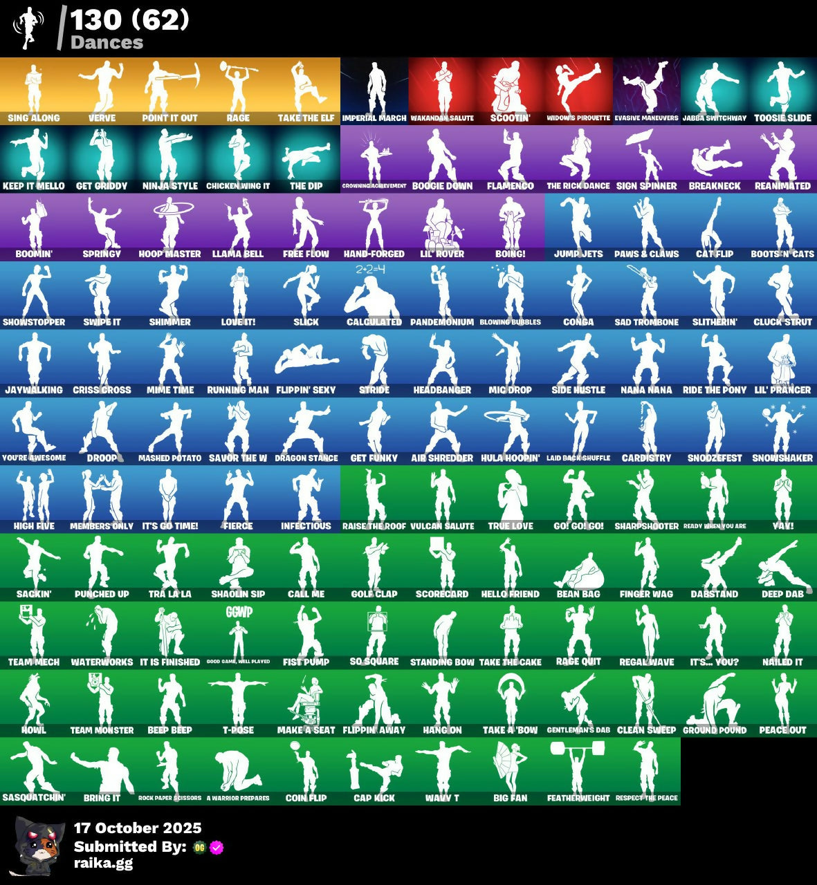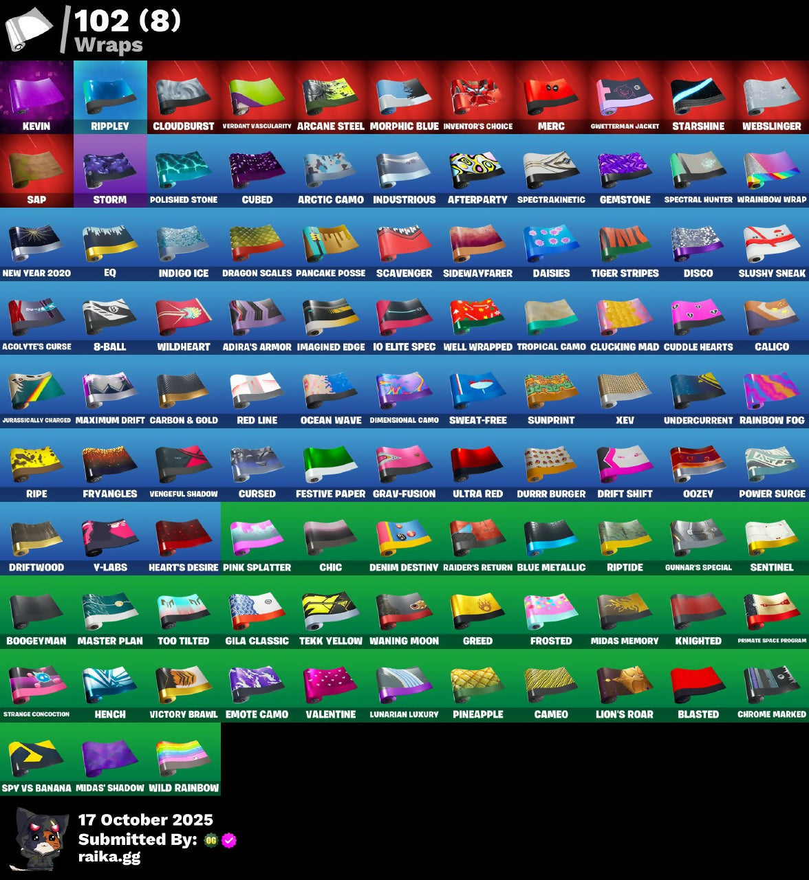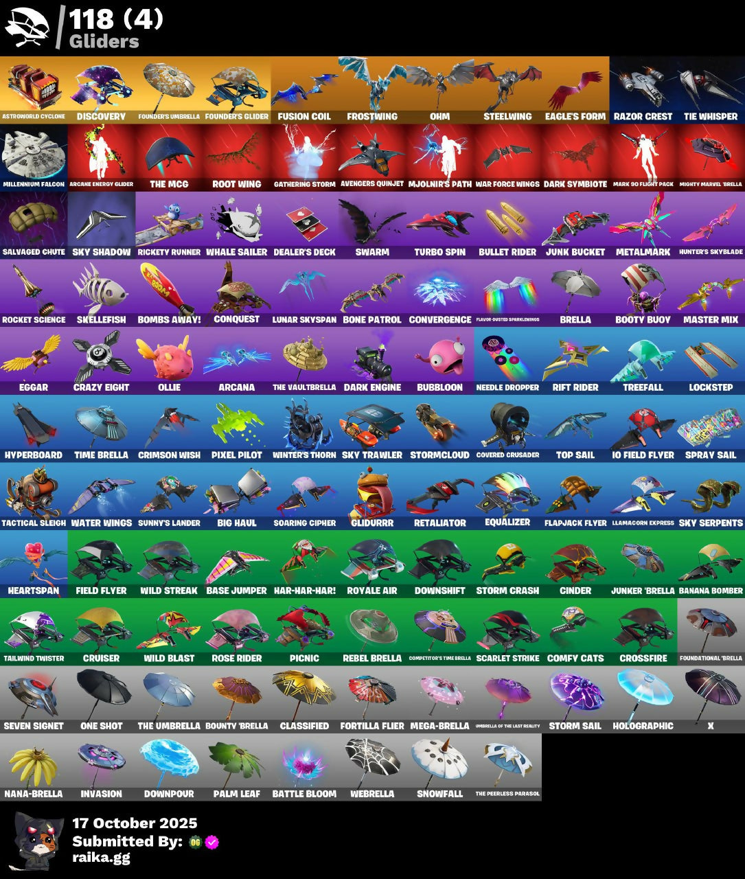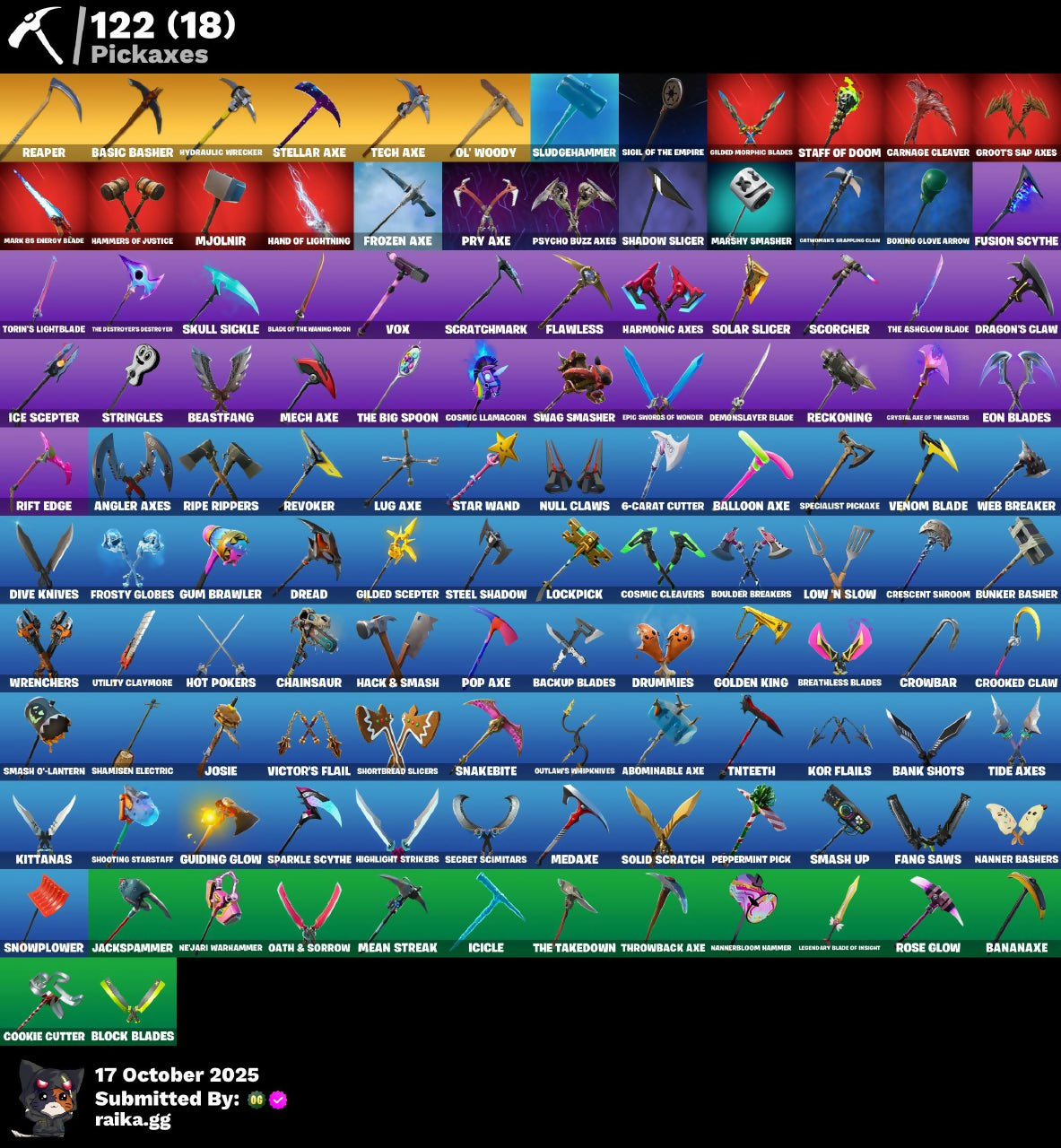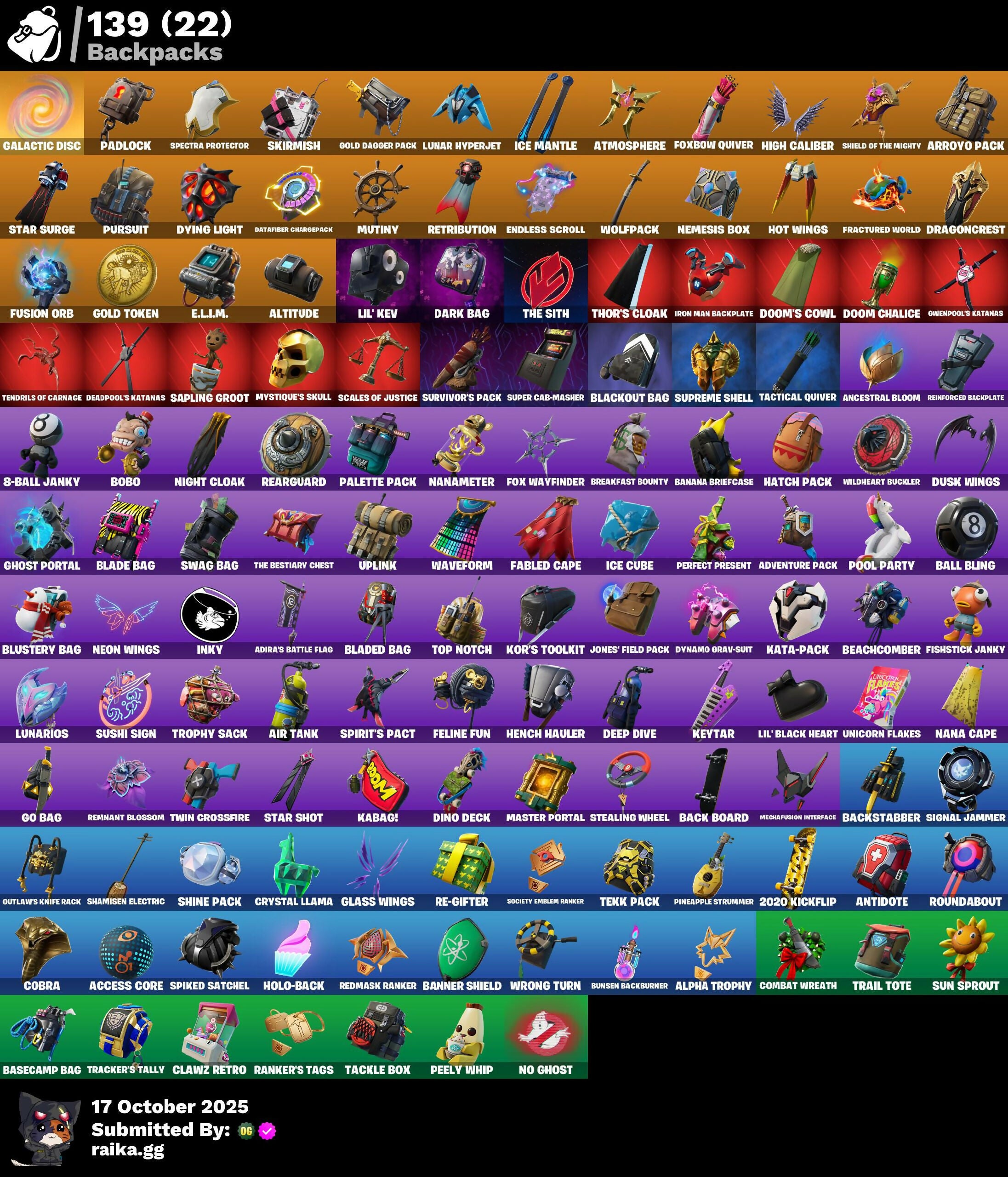 10 Field Flyer, 2020 Kickflip, 6-Carat Cutter, 8-Ball, 8-Ball Janky, 8-Ball vs Scratch, A Warrior Prepares, A.I.M., Abominable Axe, Access Core, Acolyte's Curse, Adira's Armor, Adira's Battle Flag, Adventure Pack, Afterparty, Agent Jones, Agent Peely, Air Shredder, Air Tank, Alpha Trophy, Altitude, Ancestral Bloom, Angler Axes, Antidote, Arcana, Arcane Energy Glider, Arcane Steel, Arctic Camo, Arroyo Pack, Astroworld Cyclone, Atmosphere, Avengers Quinjet, B.R.U.T.E. Gunner, Back Board, Backstabber, Backup Blades, Ball Bling, Balloon Axe, Banana Bomber, Banana Briefcase, Bananaxe, Bank Shots, Banner Shield, Base Jumper, Basecamp Bag, Basic Basher, Battle Bloom, Beachcomber, Bean Bag, Beastfang, Beep Beep, Big Fan, Big Haul, Blackheart, Blackout Bag, Blade Bag, Blade Of The Waning Moon, Bladed Bag, Blasted, Block Blades, Blowing Bubbles, Blue Metallic, Blustery Bag, Bobo, Boing!, Bombs Away!, Bone Patrol, Boogeyman, Boogie Down, Boomin', Boots 'N' Cats, Booty Buoy, Boulder Breakers, Bounty Brella, Boxing Glove Arrow, Breakfast Bounty, Breakneck, Breakpoint, Breathless Blades, Brella, Bring It, Bubbloon, Bullet Rider, Bunker Basher, Bunker Jonesy, Bunsen Backburner, Calamity, Calculated, Calico, Call Me, Cameo, Cameo vs Chic, Cap Kick, Carbon & Gold, Cardistry, Carnage, Carnage Cleaver, Cat Flip, Catalyst, Catwoman's Grappling Claw, Chainsaur, Charlotte, Chic, Chicken Wing It, Chrome Marked, Chun-Li, Cinder, Classified, Clawz Retro, Clean Sweep, Cloudburst, Cluck, Cluck Strut, Clucking Mad, Cobalt, Cobra, Coin Flip, Combat Wreath, Comfy Cats, Competitor's Time Brella, Conga, Conquest, Convergence, Cookie Cutter, Cosmic Cleavers, Cosmic Llamacorn, Covered Crusader, Crazy Eight, Crescent Shroom, Crimson Wish, Criss Cross, Crooked Claw, Crossfire, Crowbar, Crowning Achievement, Cruiser, Crystal Axe Of The Masters, Crystal Llama, Cubed, Cuddle Hearts, Cursed, DJ Yonder, Dabstand, Daisies, Dark Bag, Dark Bomber, Dark Engine, Dark Symbiote, Datafiber Chargepack, Deadpool, Deadpool's Katanas, Dealer's Deck, Deep Dab, Deep Dive, Demi, Demonslayer Blade, Denim Destiny, Diamond Diva, Dimensional Camo, Dino Deck, Dire, Disco, Discovery, Dive Knives, Doctor Doom, Doom Chalice, Doom's Cowl, Downpour, Downshift, Dragon Scales, Dragon Stance, Dragon's Claw, Dragoncrest, Dread, Drift, Drift Shift, Driftwood, Droop, Drummies, Dummy, Durrr Burger, Dusk, Dusk Wings, Dying Light, Dynamo, Dynamo Grav-Suit, E.L.I.M., EQ, Eagle's Form, Eggar, Ember, Emote Camo, Endless Scroll, Eon Blades, Epic Swords Of Wonder, Equalizer, Eternal Voyager, Evasive Maneuvers, Fabio Sparklemane, Fable, Fabled Cape, Fade, Fang Saws, Featherweight, Feline Fun, Festive Paper, Field Flyer, Fierce, Finger Wag, Fishstick Janky, Fist Pump, Flamenco, Flapjack Flyer, Flavor-Dusted Sparklings, Flawless, Flippin' Away, Flippin' Sexy, Fortilla Flier, Foundational 'Brella, Founder's Glider, Founder's Umbrella, Fox Wayfinder, Foxbow Quiver, Fractured World, Free Flow, Frosted, Frostwing, Frosty Globes, Frozen Axe, Fryangles, Fusion, Fusion Coil, Fusion Orb, Fusion Scythe, Galactic Disc, Galaxia, Galaxy, Gathering Storm, Gear Specialist Maya, Gemstone, Gentleman's Dab, Get Funky, Get Griddy, Ghost Portal, Giddy-Up, Gila Classic, Gilded Morphic Blades, Gilded Scepter, Glass Wings, Glidurrr, Go Bag, Go! Go! Go!, Gold Brutus, Gold Dagger Pack, Gold Midas, Gold Token, Golden King, Golf Clap, Good Game, Well Played, Grav-Fusion, Greed, Green Arrow, Groot, Groot's Sap Axes, Ground Pound, Guiding Glow, Gum Brawler, Gunnar's Special, Gwenpool's Katanas, Gwettermann Jacket, Hack & Smash, Hammers Of Justice, Hand Of Lightning, Hand-Forged, Hang On, Har-Har-Har!, Harmonic Axes, Hatch Pack, Headbanger, Heart's Desire, Heartspan, Hello Friend, Hench, Hench Hauler, High Caliber, High Five, Highlight Strikers, Holo-Back, Holographic, Hoop Master, Hot Pokers, Hot Wings, Howl, Hula Hoopin', Hunter's Skyblade, Huntress, Hybrid, Hydraulic Wrecker, Hyperboard, IO Elite Spec, Ice Cube, Ice Mantle, Ice Scepter, Icicle, Imagined Edge, Imperial March, Indigo Ice, Industrious, Infectious, Inky, Invasion, Inventor's Choice, Iris, Iron Man Backplate, It Is Finished, It's Go Time!, It's... You?, J.B. Chimpanski, Jabba Switchway, Jackspammer, Jaywalking, Jennifer Walters, Jolly Jammer, Jones' Field Pack, Josie, Journey vs Hazard, Jules, Jump Jets, Junk Bucket, Junker 'Brella, Jurassically Charged, Kabag!, Kata-Pack, Keep It Mello, Kevin, Keytar, Kittanas, Knighted, Kondor, Kor, Kor Flails, Kor's Toolkit, Laguna, Laid Back Shuffle, Lara Croft, Legendary Blade Of Insight, Lexa, Lil' Black Heart, Lil' Kev, Lil' Prancer, Lil' Rover, Lion's Roar, Llama Bell, Llamacorn Express, Lockpick, Lockstep, Love It!, Low 'N Slow, Lt. Evergreen, Lug Axe, Lunar Hyperjet, Lunar Skyspan, Lunarian Luxury, Lunarios, Luxe, Lynx, Make A Seat, Mancake, Mandalorian, Mark 85 Energy Blade, Mark 90 Flight Pack, Marshy Smasher, Mashed Potato, Master Key, Master Mix, Master Plan, Master Portal, Mave, Maximum Drift, Mean Streak, Mech Axe, Mechafusion Interface, Medaxe, Mega-Brella, Members Only, Menace, Meowscles, Merc, Metalmark, Microdrop, Midas Memory, Midas' Shadow, Mighty Marvel 'Brella, Millennium Falcon, Mime Time, Mjolnir, Mjolnir's Path, Morphic Blue, Mutiny, Mystique, Mystique's Skull, Nailed It, Nana Cape, Nana Nana, Nana-Brella, Nanameter, Nanner Bashers, Nannerbloom Hammer, Needle Dropper, Nejari Warhammer, Nemesis Box, Neon Wings, New Year 2020, Night Cloak, Nightshade, Ninja Style, No Ghost, Null Claws, Oath & Sorrow, Ocean, Ocean Wave, Ohm, Ol' Woody, Ollie, One Shot, Onesie, Oozey, Outlaw's Knife Rack, Outlaw's Whipknives, Padlock, Palette Pack, Palm Leaf, Pancake Posse, Pandemonium, Paws & Claws, Peace Out, Peely, Peely Whip, Peppermint Pick, Perfect Present, Picnic, Pineapple, Pineapple Strummer, Pink Splatter, Pixel Pilot, Point It Out, Polished Stone, Pool Party, Pop Axe, Powder, Power Surge, Predator, Prickly Patroller, Primate Space Program, Pry Axe, Psycho Bandit, Psycho Buzz Axes, P