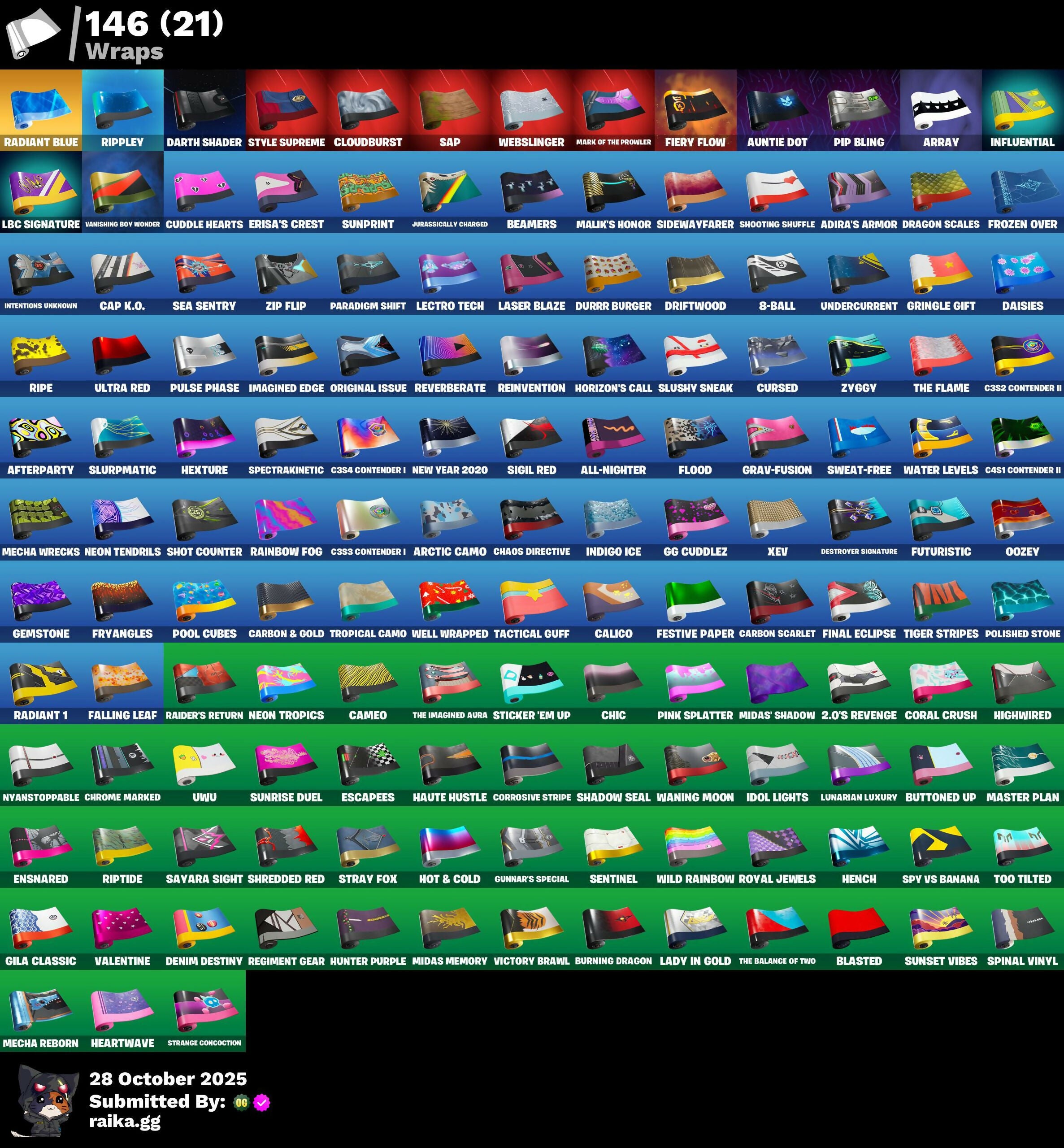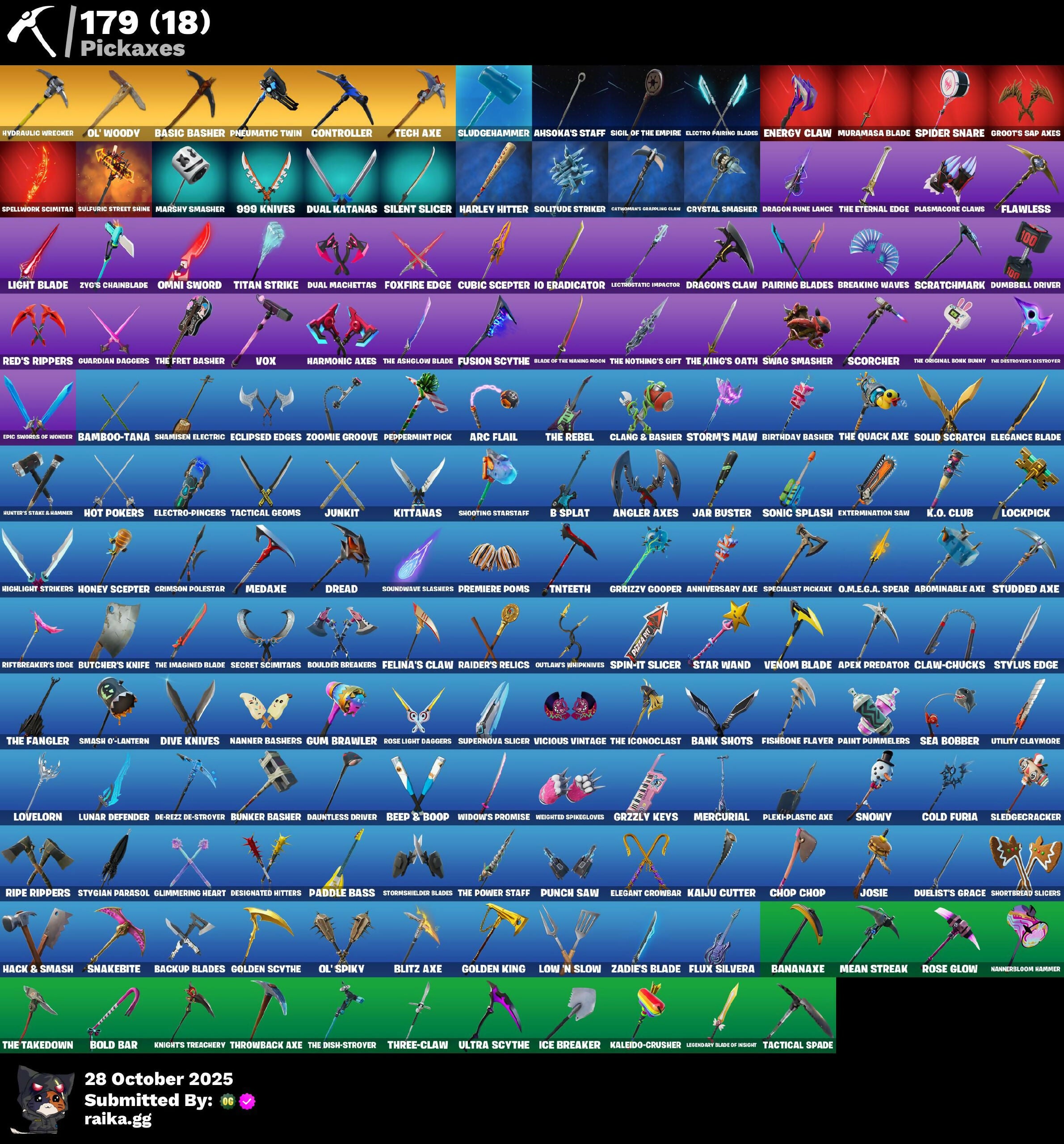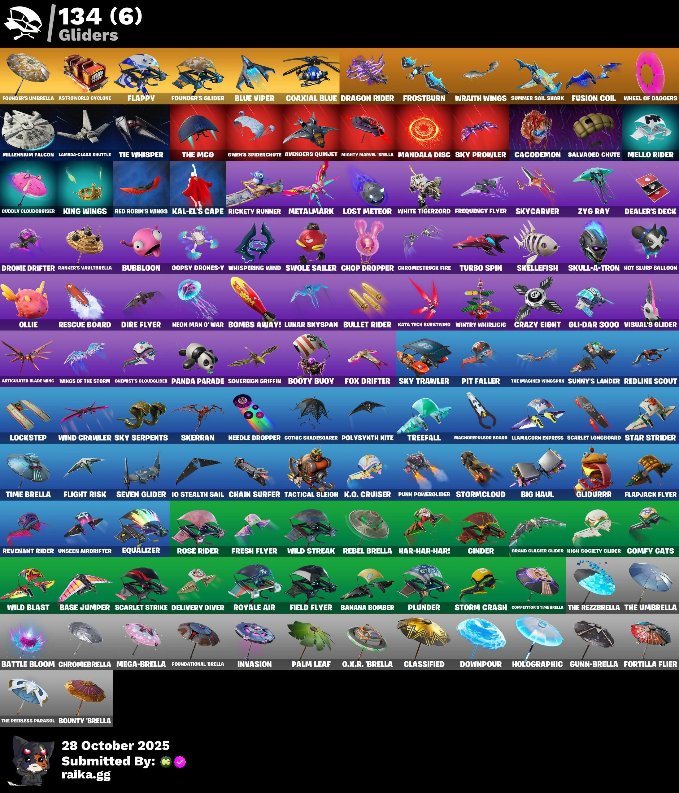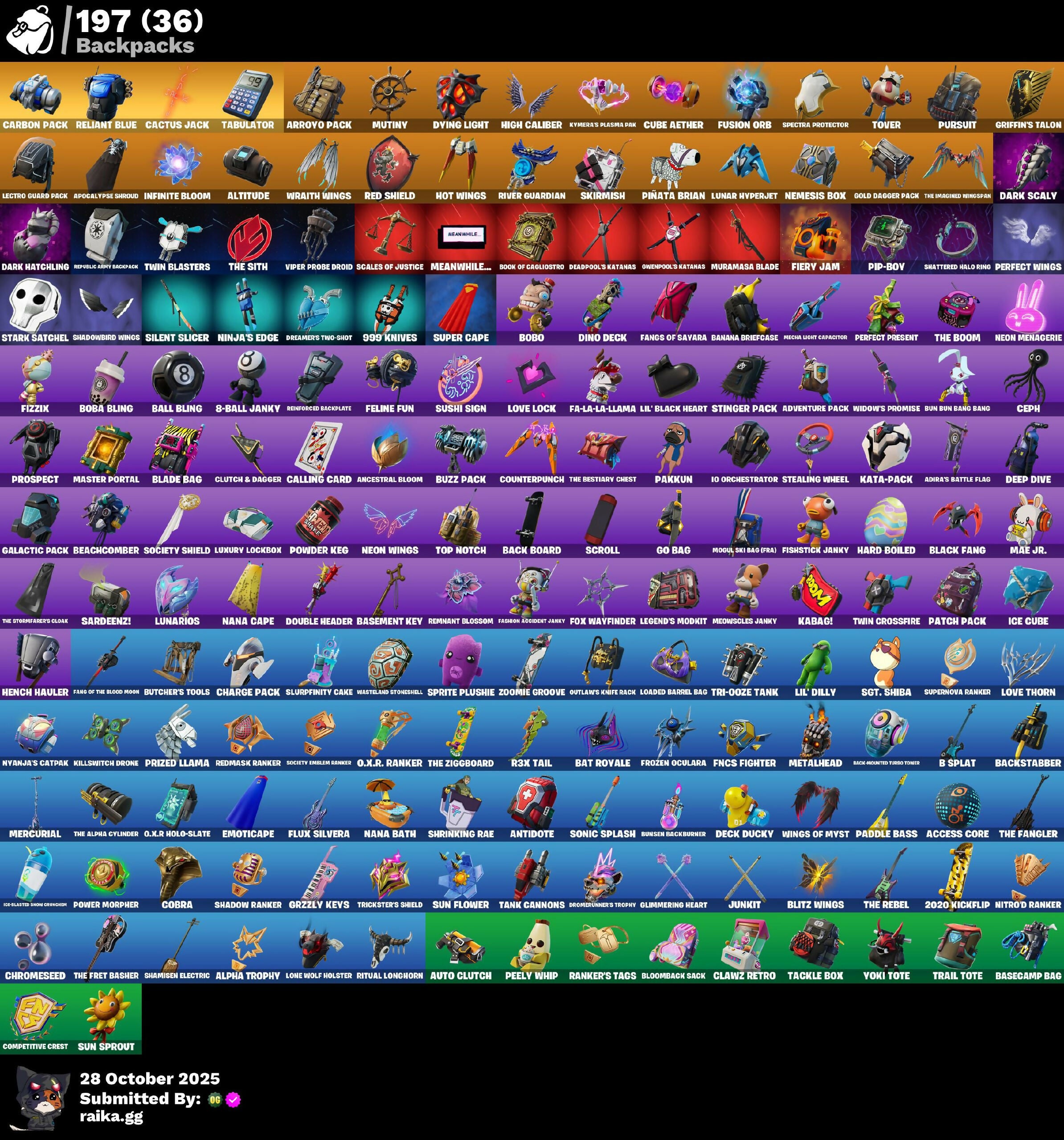 2.0’s Revenge, 2020 Kickflip, 8-Ball, 8-Ball Janky, 8-Ball vs Scratch, 999 Knives, Abominable Axe, Access Core, Adira, Adira's Armor, Adira's Battle Flag, Adventure Pack, Afterparty, Agent Peely, Ahsoka's Staff, All-Nighter, Alpha Trophy, Altitude, Amazing Cube, Ancestral Bloom, Angler Axes, Anniversary Axe, Antidote, Antonia, Apex Predator, Apocalypse Shroud, Arachrobatics, Arc Flail, Arctic Adeline, Arctic Camo, Array, Arroyo Pack, Articulated Blade Wing, Ascend!, Ask Me, Astroworld Cyclone, Auntie Dot, Auto Clutch, Avengers Quinjet, B Splat, Back Board, Back-Mounted Turbo Toner, Backlash, Backstabber, Backup Blades, Ball Bling, Bamboo-Tana, Banana Bomber, Banana Briefcase, Bananaxe, Bank Shots, Baron's Hoard, Base Jumper, Basecamp Bag, Basement Key, Basic Basher, Bat Royale, Battle Bloom, Beachcomber, Beamers, Bear Hug, Beep & Boop, Beep Beep, Behold!, Big Haul, Bike To Go, Birthday Basher, Black Fang, Blackheart, Blade Bag, Blade of the Waning Moon, Blasted, Blitz Axe, Blitz Wings, Bloombag Sack, Blowin' Up, Blue Viper, Boba Bling, Bobo, Boing!, Bold Bar, Bombs Away!, Boobytrapped, Boogie Down, Book of Cagliostro, Booty Buoy, Boulder Breakers, Bounty 'Brella, Breaking Point, Breaking Waves, Bring It Around, Brutus, Bubbloon, Build Up, Bullet Rider, Bun Bun Bang Bang, Bunker Basher, Bunker Jonesy, Bunsen Blacksburner, Burning Dragon, Butcher's Knife, Butcher's Tools, Buttoned Up, Buzz Pack, Bytes, C3S2 Contender II, C3S3 Contender I, C3S4 Contender I, C4S1 Contender II, Cacodemon, Cactus Jack, Calico, Call Me, Calling Card, Cameo, Cameo vs Chic, Cap K.O., Caper, Carbon & Gold, Carbon Commando, Carbon Pack, Carbon Scarlet, Cat Flip, Catwoman's Grappling Claw, Ceph, Chain Surfer, Chaos Directive, Charge Pack, Chefs Special, Chemist's Cloudglider, Chic, Chicken Wing It, Chop Chop, Chop Dropper, Chrome Marked, Chrome Punk, Chromebrella, Chromeseed, Chromestruck Fire, Cinder, Clang & Basher, Classified, Claw-Chucks, Clawz Retro, Clean Sweep, Cloudburst, Cluck Strut, Clutch & Dagger, Coaxial Blue, Cobalt, Cobra, Coin Flip, Cold Furia, Color Crush, Comfy Cats, Competitive Crest, Competitor's Time Brella, Conga, Conjure Weapon, Controller, Coral Crush, Corrosive Stripe, Counterpunch, Crack It, Crazy Eight, Crimson Polestar, Crystal Smasher, Cube Aether, Cubic Scepter, Cuddle Hearts, Cuddly Cloudcruiser, Curling Iron, Cursed, Cyclo Curl, Dagger Dance, Daisies, Dark Hatchling, Dark Rex, Dark Scaly, Dark Tricera Ops, Darth Shader, Darth Vader, Dauntless Driver, De-Rezz De-Stroyer, Deadpool, Deadpool's Katanas, Dealer's Deck, Deck Ducky, Deep Dive, Delivery Diver, Denied, Denim Destiny, Designated Hitters, Destroyer Signature, Dice Roll, Dino Deck, Dip, Dire Flyer, Dirtbike Challenge, Dive Knives, Doctor Slone, Doctor Strange, Double Header, Downpour, Doze Dab, Dragon Rider, Dragon Rune Lance, Dragon Scales, Dragon Stance, Dragon's Claw, Dread, Dreamer's Two-Shot, Driftwood, Drome Drifter, Dromer's Trophy, Droop, Dual Katanas, Dual Machettas, Duelist's Grace, Dumbbell Driver, Durrr Burger, Dusk Knight, Dying Light, Eclipsed Edges, Egg Drop Scoop, Electro Pairing Blades, Electro-Pincers, Elegance Blade, Elegant Crowbar, Ember, Emoticape, Empress Fan Dance, Energy Claw, Ensnared, Epic Swords of Wonder, Equalizer, Eren Jaeger, Erisa, Erisa's Crest, Escapees, Eureka!, Evie, Expressionism, Extermination Saw, FNCS Fighter, Fa-La-La-Llama, Face Palm, Falling Leaf, Fang of the Blood Moon, Fangs of Sayara, Fashion Accident Janky, Felina's Claw, Feline Fun, Festive Paper, Field Flyer, Fierce, Fiery Flow, Fiery Jam, Final Eclipse, Fish Thicc, Fishbone Flaver, Fishstick Janky, Fizzix, Flaky Feast, Flapjack Flyer, Flappy, Flawless, Flight Risk, Flippin' Away, Flood, Flux Silvera, Foil Flex, Fortilla Flier, Foundational 'Brella, Founder's Glider, Founder's Umbrella, Fox Drifter, Fox Wayfinder, Foxfire Edge, Frequency Flyer, Fresh Flyer, Frostburn, Frozen Oculata, Frozen Over, Fry Angles, Fusion Coil, Fusion Orb, Fusion Scythe, Futuristic, GG Cuddlez, Galactic Pack, Gear Specialist Maya, Gemstone, Get Funky, Get Griddy, Gila Classic, Gli-Dar 3000, Glidurrr, Glimmering Heart, Glitter, Go Bag, Gold Dagger Pack, Gold Midas, Golden King, Golden Scythe, Golf Clap, Good Game, Well Played, Good Sportsmanship, Gothic Shadesoarer, Grand Glacier Glider, Grav-Fusion, Griffin's Talon, Gringle Gift, Grizzzy Gooper, Groot's Sap Axes, Ground Pound, Grriz, Grzzly Keys, Guardian Daggers, Guff Gringle, Guggimon, Gum Brawler, Gunn-Brella, Gunnar, Gunnar’s Special, Gwen's Spiderchute, Hack & Smash, Har-Har-Har!, Hard Boiled, Harley Hitter, Harley Quinn, Harmonic Axes, Haute Hustle, Have A Seat, Heartburst, Heartwave, Hello Friend, Hench, Hench Hauler, Hexture, High Caliber, High Five, High Society Glider, Highlight Strikers, Highwire, Highwired, Hit It, Holly Jammer, Holographic, Honey Scepter, Hoop Master, Horizon’s Call, Hot & Cold, Hot Pokers, Hot Slurp Balloon, Hot Wings, Hula Hoopin', Hunter Purple, Hunter's Stake & Hammer, Hybrid, Hype!, Hypnot Eyes, IO Orchestrator, IQ Eradicator, Ice Breaker, Ice Cube, Ice-Blasted Snow Crunchgum, Idol Lights, Imagined Edge, Imperial March, In Da Party, Indigo Ice, Infinite Bloom, Influential, Intentions Unknown, Invasion, Io Stealth Sail, It Is Finished, It's... You?, Jar Buster, Joey, Josie, Journey vs Hazard, Jubilation, Jump Jets, Junkit, Jurassically Charged, K.O. Club, K.O. Cruiser, Kabag!, Kado Thorne, Kaiju Cutter, Kakashi Hatake, Kal-El's Cape, Kaleido-Crusher, Kata Tech Burstwing, Kata-Pack, Keep It Mello, Khaby Lame, Kiara K.O., Kick Back, Killswitch Drone, King Wings, Kittanas, Knight's Treachery, Kymera, Kymera's Plasma Pak, LBC Signature, Lady In Gold, Lambda-Class Shuttle, Laser Blaze, Laser Focused, Lectro Guard Pack, Lectro Tech, Lectrostatic Impactor, Legend's Modkit, Legendary Blade of Insight, Lennox Rose, Light Blade, Lil' Black Heart, Lil' Dilly, Lil' Prancer, Lil' Saucer, Lil' T-6 Shuttle, Llamacorn Express, Loaded Barrel Bag, Lockpick, Lockstep, Lone Wolf Holst