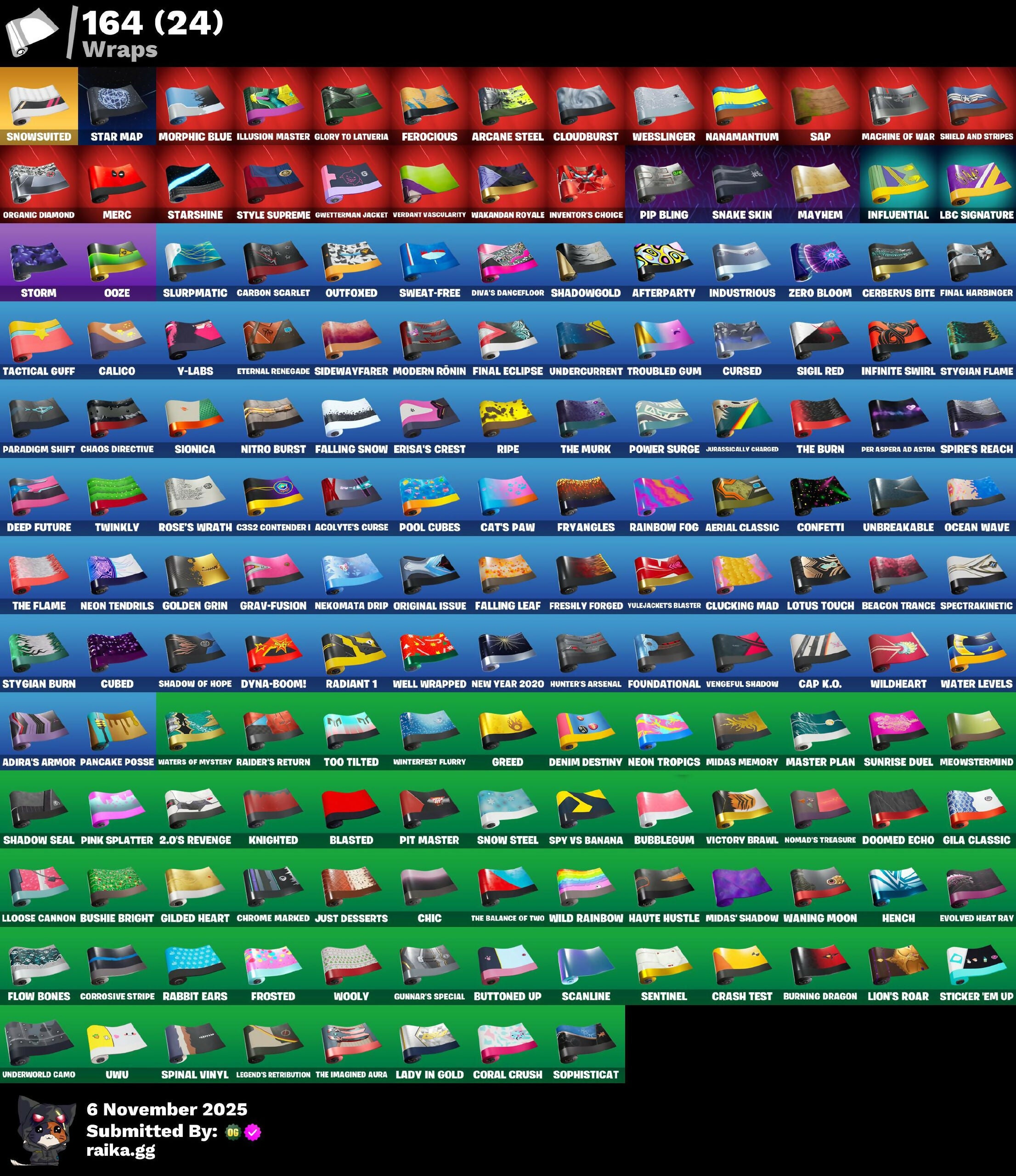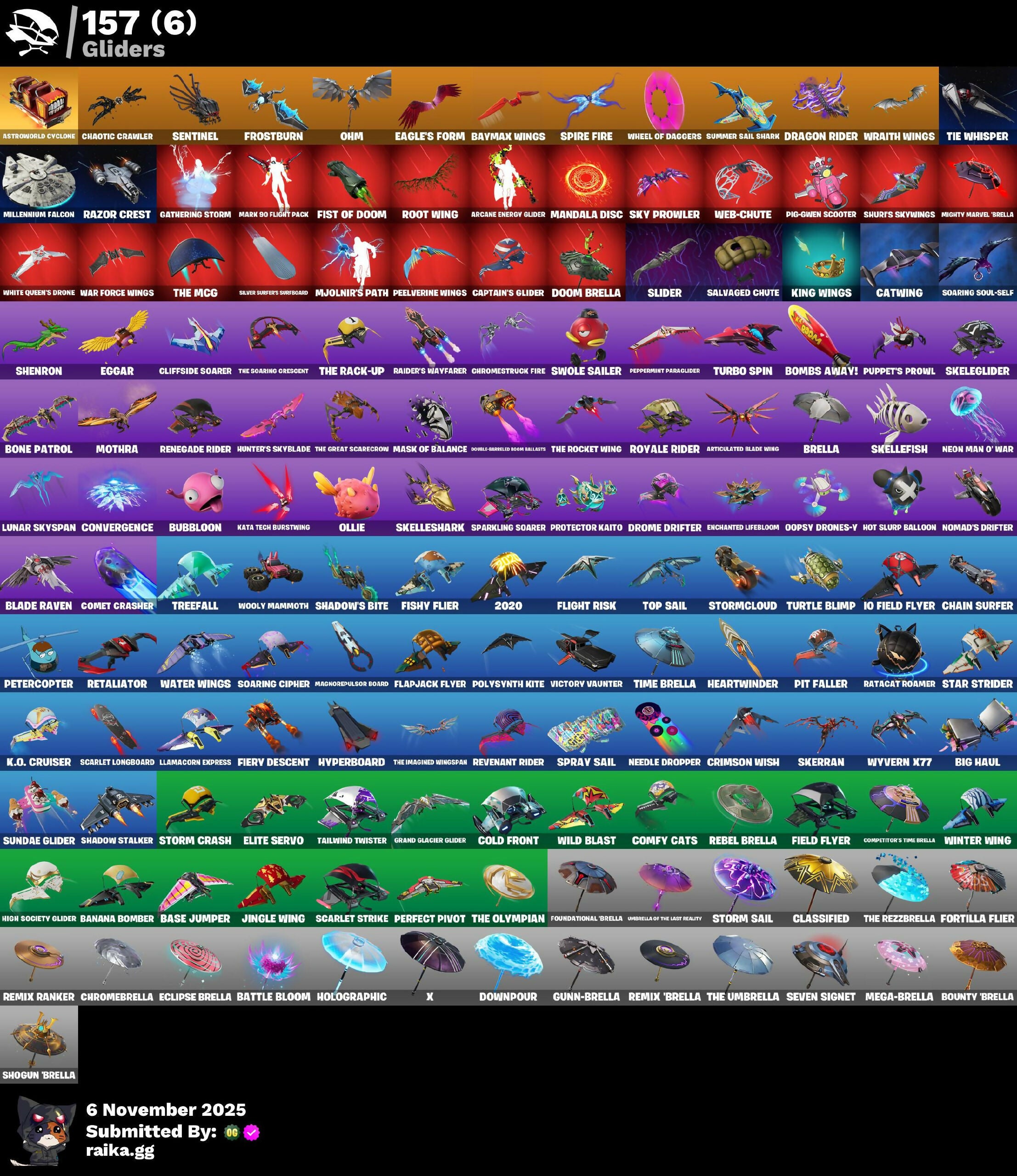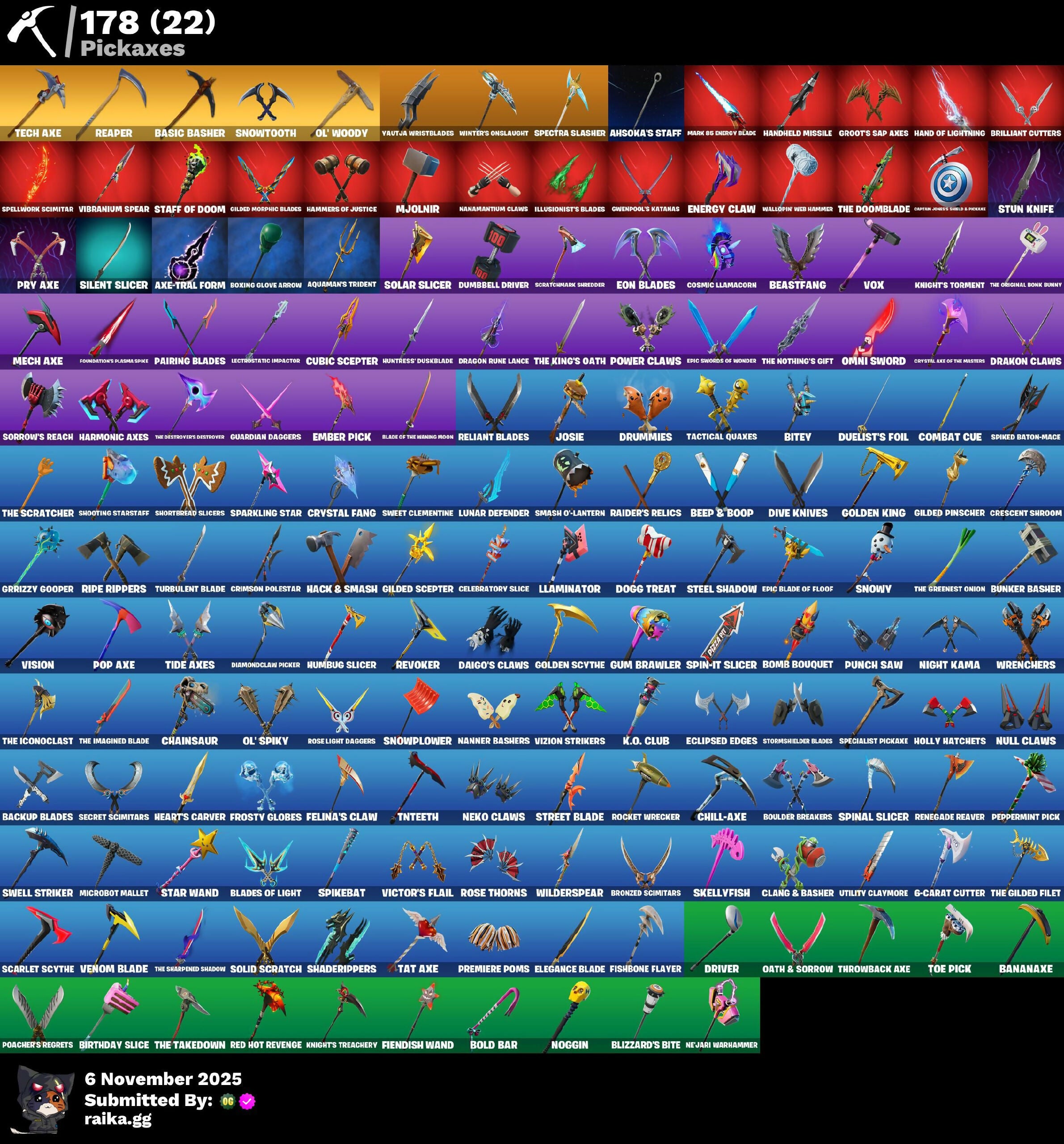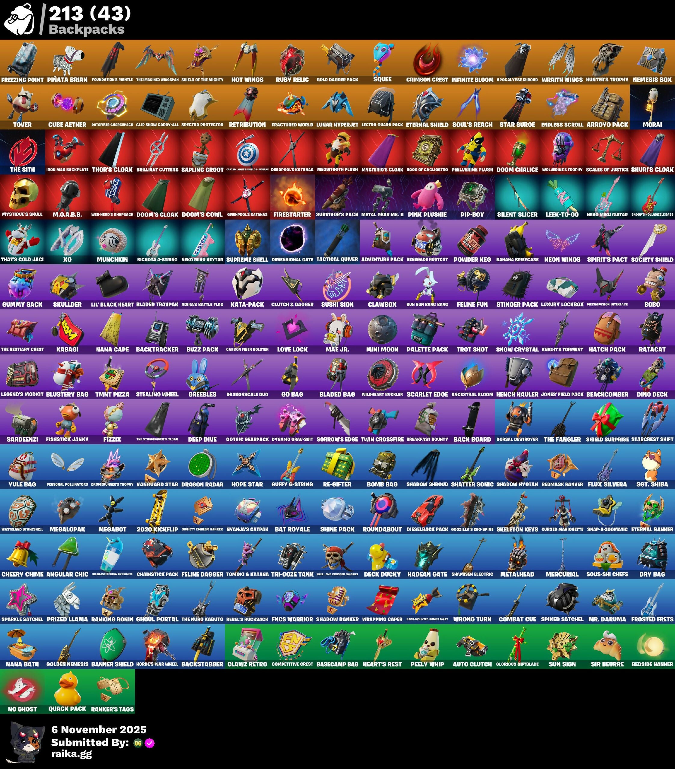 (Snikt!), 1-Ball, 2.0's Revenge, 2020, 2020 Kickflip, 6-Carat Cutter, A Warrior Prepares, Acolyte's Curse, Adeline, Adira, Adira's Armor, Adira's Battle Flag, Adventure Pack, Aerial Assault Bomber, Aerial Classic, Afterparty, Agent Jones, Agent Peely, Ahsoka Tano, Ahsoka's Staff, Air Shredder, Alli, Ancestral Bloom, Angular Chic, Antonia, Aphrodite, Apocalypse Shroud, Aquaman, Aquaman's Trident, Arcane Energy Glider, Arcane Steel, Arroyo Pack, Articulated Blade Wing, Assault Trooper, Astroworld Cyclone, Auto Clutch, Axe-Tral Form, Azarath Metrion Zinthos!, Back Alleybot Domino Meaty, Back Board, Backstabber, Backtracker, Backup Blades, Banana Bomber, Banana Briefcase, Bananaxe, Banner Shield, Base Jumper, Basecamp Bag, Basic Basher, Bat Royale, Battle Blessing, Battle Bloom, Battle Call, Baymax Wings, Beachcomber, Beacon Trance, Bean Bag, Bear Hug, Beastfang, Beatzbunny, Bedside Nanner, Beep & Boop, Beep Beep, Bhangra Boogie, Bichota 4-String, Big Haul, Billy Bounce, Bird Call, Birthday Slice, Bitey, Blade Of The Waning Moon, Blade Raven, Bladed Bag, Bladed Travpak, Blades Of Light, Blasted, Blaze, Blizzard's Bite, Blowin' Up, Blowing Bubbles, Blustery Bag, Bobo, Bold Bar, Bomb Bag, Bomb Bouquet, Bombs Away!, Bone Patrol, Boogie Down, Book Of Cagliostro, Boomin', Boosting Ki, Boots N' Cats, Boulder Breakers, Bounty 'Brella, Boxing Glove Arrow, Breakfast Bounty, Brella, Brilliant Cutters, Brite Bomber, Bronzed Scimitars, Bubblegum, Bubbloon, Buckle Up, Bulletproof, Bun Bun Bang Bang, Bunker Basher, Bunker Jonesy, Burning Dragon, Bushie Bright, Buttoned Up, Buzz Pack, Bytes, C3S2 Contender I, Calico, Call Me, Cap K.O., Captain Blamerica, Captain Jones, Captain Jones's Shield & Pickaxe, Captain's Glider, Carbon Fiber Holster, Carbon Scarlet, Card Drop, Cardistry, Cat's Paw, Catwing, Cauldron Chill, Celebratory Slice, Cerberus, Cerberus Bite, Chain Surfer, Chainsaur, Chainstick Pack, Chaos Directive, Chaos Director, Chaotic Crawler, Cheery Chime, Chic, Chill-Axe, Choice Knit, Chrome Marked, Chromebrella, Chromestruck Fire, Clang & Basher, Classified, Clawbox, Clawz Retro, Clean Sweep, Cliffside Soarer, Clip Show Carry-All, Cloudburst, Cluck, Cluck Strut, Clucking Mad, Clutch & Dagger, Coin Flip, Cold Front, Combat Cue, Comet Crasher, Comfy Cats, Competitive Crest, Competitor's Time Brella, Confetti, Conjure Weapon, Contract Giller, Controller Crew, Convergence, Coral Crush, Corrosive Stripe, Cosmic Llamacorn, Crack It, Crash Test, Crescent Shroom, Crimson Crest, Crimson Polestar, Crimson Wish, Crowning Achievement, Crystal Axe Of The Masters, Crystal Fang, Cube Aether, Cubed, Cubic Scepter, Cursed, Cursed Marionette, Cyclo Curl, Dagger Dance, Daigo, Daigo's Claws, Databier Chargepack, Deadpool, Deadpool's Katanas, Deck Ducky, Deep Dab, Deep Dive, Deep End, Deep Future, Deimos, Demi, Denim Destiny, Diamond Diva, Diamond Throne, Diamondclaw Picker, Dice Roll, Dieselback Pack, Dimensional Gate, Dino Deck, Diva Fever, Diva's Dancefloor, Dive Knives, Do The Split, Doctor Doom, Doctor Strange, Dogg Treat, Doom, Doom Brella, Doom Chalice, Doom's Cloak, Doom's Cowl, Doomed Echo, Dorsal Destroyer, Double-Barreled Boom Ballasts, Downpour, Doze Dab, Dragon Radar, Dragon Rider, Dragon Rune Lance, Drakon Claws, Drakon Steel Hybrid, Drakonscale Duo, Driver, Drome Drifter, Dromrunner's Trophy, Drummies, Dry Bag, Duelist's Foil, Dumbbell Driver, Dummy, Durrr Taisho, Dyna-Boom!, Dynamo Grav-suit, Dynamo TNTina, Eagle's Form, Eclipse Brella, Eclipsed Edges, Eggar, Electrostatic Impactor, Elegance Blade, Elite Servo, Ember Pick, Emma Frost, Enchanted Lifebloom, Endless Scroll, Energy Claw, Eon Blades, Epic Blade Of Floof, Epic Swords Of Wonder, Erisa, Erisa's Crest, Eternal Knight, Eternal Ranker, Eternal Renegade, Eternal Shield, Evasive Maneuvers, Evie, Evolved Heat Ray, Explorer Emilie, Face Palm, Fade, Falling Leaf, Falling Snow, Felina, Felina's Claw, Feline Dagger, Feline Fun, Ferocious, Field Flyer, Fiendish Wand, Fiery Descent, Final Eclipse, Final Harbinger, Firestarter, Fireworks Salvo, Fish Thicc, Fishbone Flayer, Fishstick Janky, Fishy Flier, Fist Bump, Fist of Doom, Fizzix, Flaky Feast, Flapjack Flyer, Flashback Breakdown, Flight Risk, Flippin' Away, Flow Bones, Flux Silvera, Fncs Warrior, Foil Flex, Fortilla Flier, Foundation's Mantle, Foundation's Plasma Spike, Foundational, Foundational 'Brella, Fractured World, Freezing Point, Freshly Forged, Front-Page Pose, Frost Squad, Frostbite, Frostburn, Frosted, Frosted Frets, Frosty Globes, Fryangles, Galaxia, Gathering Storm, Gear Specialist Maya, Ghoul Portal, Gila Classic, Gilded Heart, Gilded Morphic Blades, Gilded Pinscher, Gilded Scepter, Glorious Giftblade, Glory to Latveria, Glyphic, Go Bag, Godzilla Evolved, Godzilla's Exo-Spine, Gold Brutus, Gold Dagger Pack, Gold Meowscles, Gold Midas, Golden Grin, Golden King, Golden Nemesis, Golden Scythe, Gothic Gearpack, Grand Glacier Glider, Grav-Fusion, Greebles, Greed, Green Arrow, Grizzy Gooper, Groot, Groots Sap Axes, Grriz, Guardian Daggers, Guffy G-String, Guild, Gum Brawler, Gumbo, Gummy Sack, Gunn-Brella, Gunnar, Gunnar's Special, Gwen-Step, Gwenpool, Gwenpool's Katanas, Gwettermann Jacket, Hack & Smash, Hadean Gate, Hammers Of Justice, Hand Of Lightning, Handheld Missile, Hang On, Harlowe, Harmonic Axes, Haruka of the Masks, Hatch Pack, Haute Hustle, Haven, Heart Sign, Heart's Carver, Heart's Rest, Heartwinder, Hellfire Dance, Hench, Hench Hauler, Hero Baymax, High Society Glider, Hit It, Holiday Boxy, Holly Hatchets, Holographic, Hope, Hope Star, Horde's War Wheel, Hot Slurp Balloon, Hot Wings, Howl, Humbug Slicer, Hunter's Arsenal, Hunter's Skyblade, Hunter's Trophy, Huntress' Duskblade, Hyperboard, I Declare!, I'm A Mystery, IO Field Flyer, Ice Spice, Ice-blasted Snow Crouchen, Illusion Master, Illusionist's Blades, In Ha Mood, Industrious, Infinite Bloom, Infinite Swirl, Influential, Inventor's Choice, Invisible Cut, Iris, Iron Man Backplate, It's... You?, Jackie, Jade, Jennifer Walters, Je