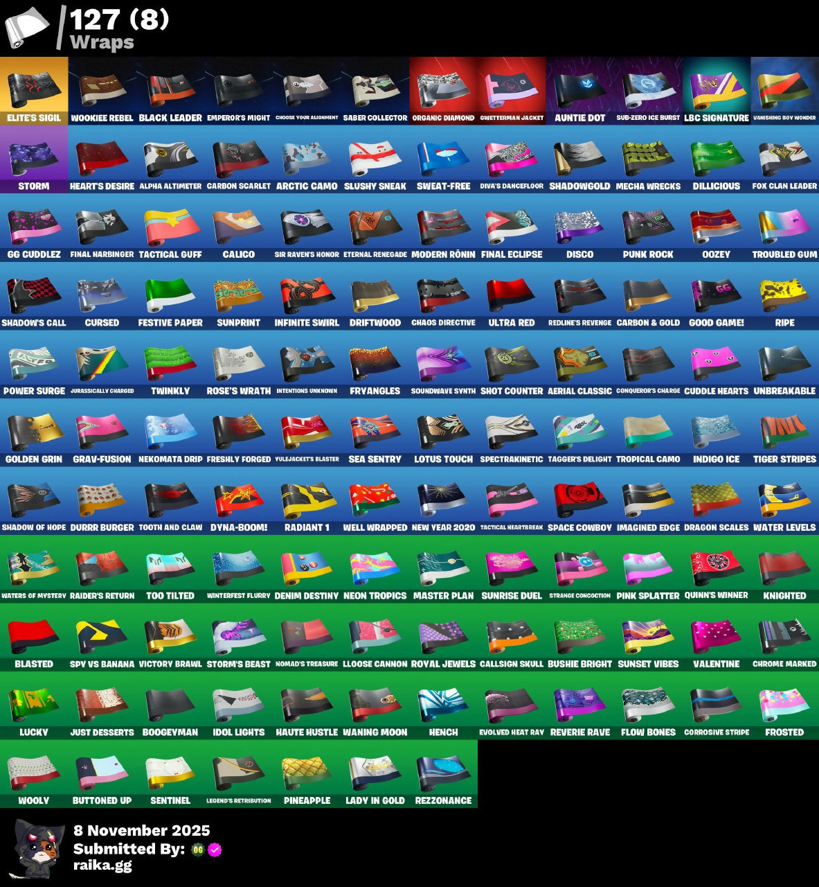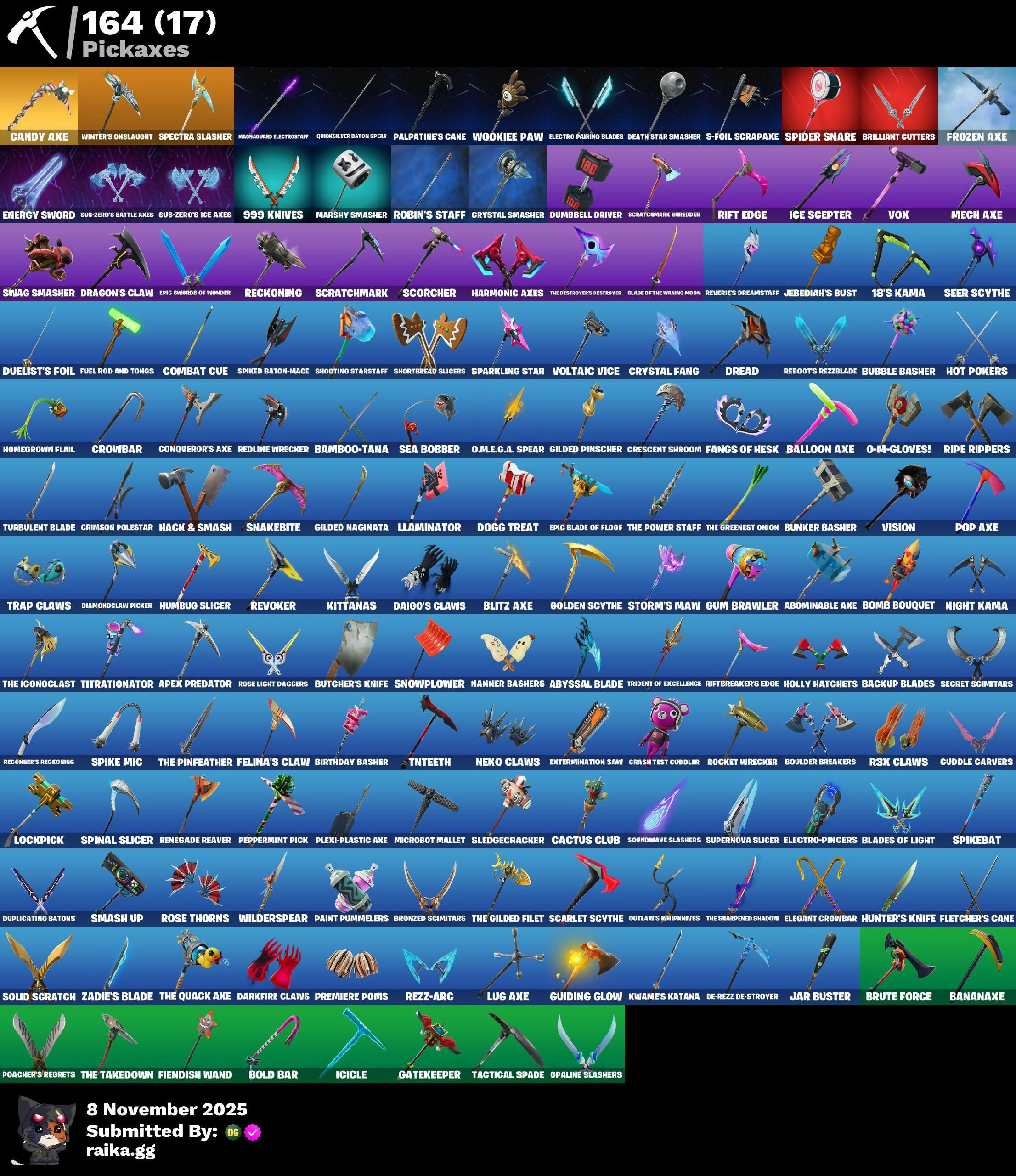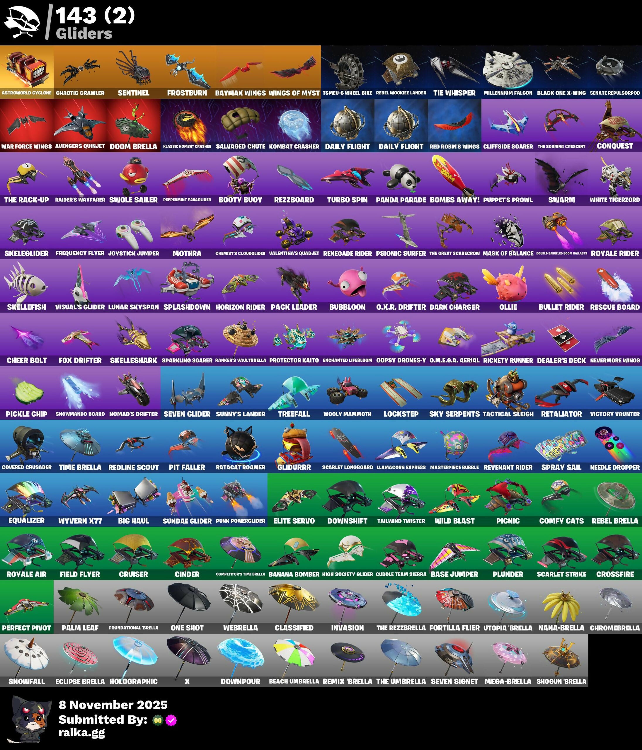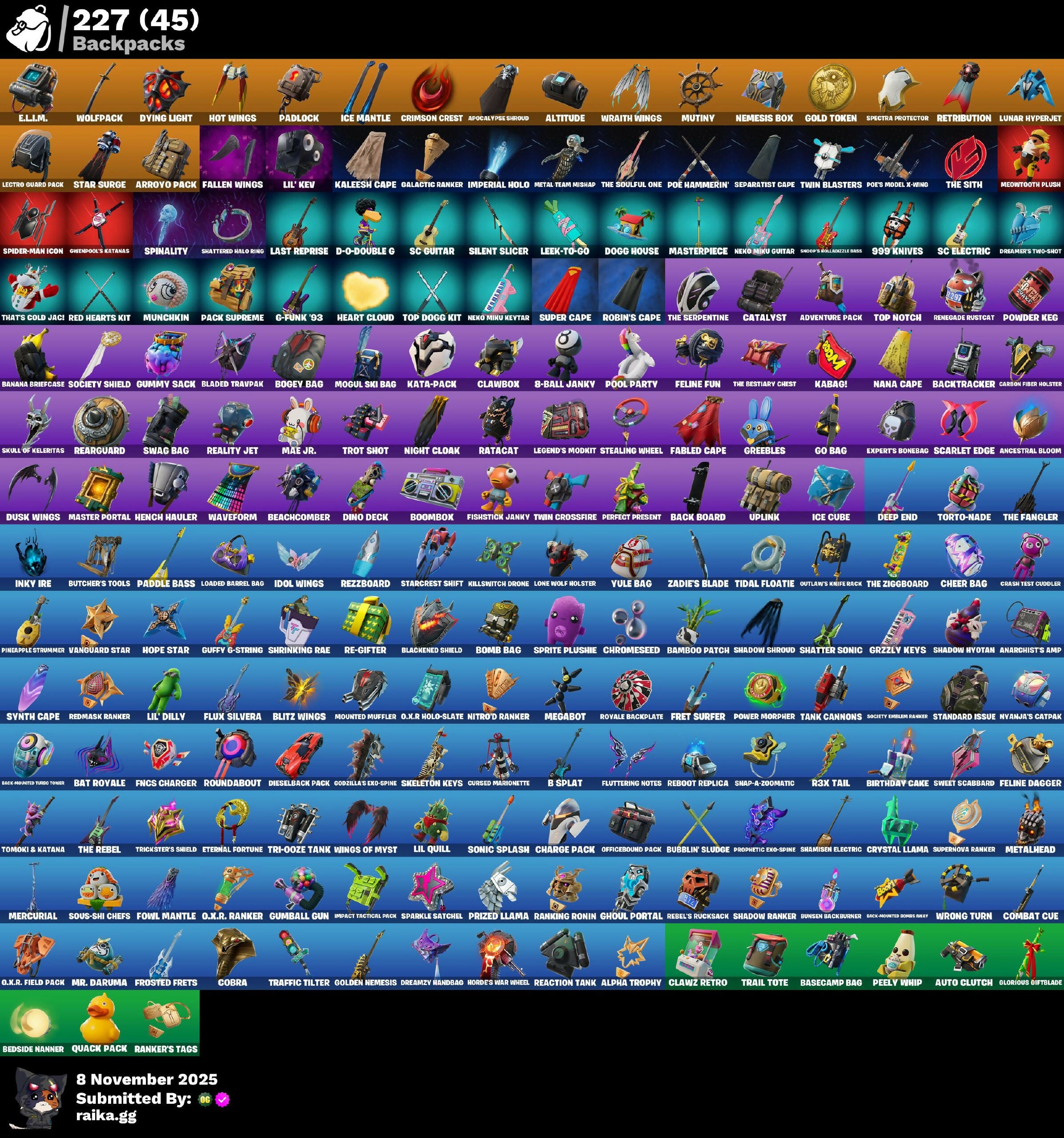 1-Ball, 18's Kama, 8-Ball Janky, 999 Knives, A.I.M., Abominable Axe, AbseNz, Abyssal Blade, Adventure Pack, Aerial Assault Bomber, Aerial Classic, Agent Patch, Agent Peely, Alpha Altimeter, Alpha Trophy, Altitude, Anarchist's Amp, Ancestral Bloom, Andy Fangerson, Apex Predator, Apocalypse Shroud, Apprentice Evie, Arcane Research, Arctic Camo, Arroyo Pack, Astroworld Cyclone, Augury, Auntie Dot, Auto Clutch, Avengers Quinjet, Avla Winn, Aw, Shucks., B Splat, Back Board, Backlash, Backtracker, Backup Blades, Balloon Axe, Bamboo Patch, Bamboo-Tana, Banana Bomber, Banana Briefcase, Bananaxe, Baron's Hoard, Base Jumper, Basecamp Bag, Bat Royale, Battle Blessing, Battle Gamer Mae, Baymax Wings, Beach Umbrella, Beachcomber, Bedside Nanner, Beep Beep, Bernie, Big Dill, Big Haul, Bike To Go, Billy Bounce, Birdarang Flourish, Birthday Basher, Birthday Cake, Black Leader, Black One X-Wing, Blackened Shield, Blackheart, Blade of the Waning Moon, Bladed TravPak, Blades of Light, Blasted, Blitz Axe, Blitz Wings, Bogey Bag, Bold Bar, Bomb Bag, Bomb Bouquet, Bombs Away!, Bone Breaker, Boogeyman, Boogie Down, Boombox, Booty Buoy, Boulder Breakers, Bow Go, Brilliant Cutters, Bronzed Scimitars, Brute Force, Brutus, Bubble Basher, Bubblin' Sludge, Bubbloon, Buck-Mounted Bombs Away, Build Up, Bullet Rider, Bunker Basher, Bunker Jonesy, Bunsen Backburner, Burnoff, Bushie Bright, Butcher's Knife, Butcher's Tools, Buttoned Up, Cactus Club, Calamity, Calculated, Calico, Call Me, Callsign Skull, Candy Axe, Captain L America, Captain Phasma, Carbon & Gold, Carbon Fiber Holster, Carbon Scarlet, Cassidy Quinn, Cat Flip, Catalyst, Cauldron Chill, Chaos Directive, Chaos Director, Chaotic Crawler, Charge Pack, Cheer Bag, Cheer Bolt, Chemist's Cloudglider, Choice Knit, Choose Your Alignment, Chrome Marked, Chrome Punk, Chromebrella, Chromeseed, Cinder, Classified, Clawbox, Clawz Retro, Clean Sweep, Cliffside Soarer, Cluck Strut, Cobra, Coin Flip, Combat Cue, Comfy Cats, Competitor's Time Brella, Conga, Conqueror's Axe, Conqueror's Charge, Conqueror's Claim, Conquest, Corrosive Stripe, Covered Crusader, Crash Test Cuddler, Crescent Shroom, Crimson Crest, Crimson Polestar, Crossfire, Crowbar, Crowning Achievement, Cruiser, Crystal Fang, Crystal Llama, Crystal Smasher, Cuddle Carvers, Cuddle Hearts, Cuddle Team Sierra, Cuddle Team Specialist, Cursed, Cursed Marionette, D-O-Double G, DJ Yonder, Dab, Daigo, Daigo's Claws, Daily Flight, Dancin' Domino, Danica, Dark Charger, Dark Side, Darkfire Claws, De-Rezz De-Stroyer, Dealer's Deck, Death Star Smasher, Deep End, Demi, Demogorgon, Denim Destiny, Diamondclaw Picker, Die With A Smile, Die With A Smile Bruno, Dieselback Pack, Dill With It, Dillicious, Dino Deck, Dire, Disco, Diva Fever, Diva's Dancefloor, Do The Split, Dogg House, Dogg Treat, Doom Brella, Double-Barreled Boom Ballasts, Downpour, Downshift, Doze Dab, Dragon Scales, Dragon Stance, Dragon's Claw, Dread, Dreamer's Two-Shot, Dreamzy Handbag, Drift, Driftwood, Duelist's Card Trick, Duelist's Foil, Dumbbell Driver, Dummy, Dunk On 'Em, Dupli-Kate, Duplicating Batons, Duplikates, Durrr Burger, Durrr Taisho, Dusk, Dusk Knight, Dusk Wings, Dying Light, Dyna-Boom!, Dynamo Tntina, E.L.I.M., Eclipse Brella, Electro Pairing Blades, Electro Swing, Electro-Pincers, Electrostaff, Elegant Crowbar, Elite Servo, Elite's Sigil, Ember, Emperor Palpatine, Emperor's Might, Enchanted Lifebloom, Energy Sword, Epic Blade of Floof, Epic Swords of Wonder, Equalizer, Eternal Fortune, Eternal Renegade, Evolved Heat Ray, Expert's Bonebag, Explorer Emilie, Extermination Saw, FNCS Charger, Fable, Fabled Cape, Fallen Love Ranger, Fallen Wings, Fangs of Hesk, Feel The Force, Felina, Felina's Claw, Feline Dagger, Feline Fun, Festival Lace, Festive Paper, Field Flyer, Fiendish Wand, Final Eclipse, Final Harbinger, Fishstick Janky, Fist Bump, Flamenco, Flashback Breakdown, Fletcher Kane, Fletcher's Cane, Flippin' Away, Flow Bones, Fluttering Notes, Flux Silvera, Foil Flex, For O.X.R!, Force Lightning, Fortilla Flier, Foundational 'Brella, Fowl Mantle, Fox Clan Leader, Fox Drifter, Free Flow, Frequency Flyer, Freshly Forged, Fret Surfer, Front Page Pose, Frostburn, Frosted, Frosted Frets, Frozen Axe, Frozen Treat Cart, Fryangles, Fuel Rod and Tongs, G-Funk '93, GG Cuddlez, Galactic Ranker, Gangnam Style, Gatekeeper, Gear Specialist Maya, General Grievous, Gentleman's Dab, Get Funky, Get Loose, Ghoul Portal, Giddy-Up, Gilded Naginata, Gilded Pinscher, Glidurr, Glorious Giftblade, Gloss, Go Bag, Godzilla Evolved, Godzilla's Exo-Spine, Gold Token, Golden Grin, Golden Nemesis, Golden Scythe, Golf Clap, Good Game!, Good Sportsmanship, Grav-Fusion, Greebles, Grzzly Keys, Guffy G-String, Guiding Glow, Gum Brawler, Gumball Gun, Gummy Sack, Gwendool's Katanas, Gweterman Jacket, Hack & Smash, Hana, Harmonic Axes, Haruka of the Masks, Haute Hustle, Haven, Haylee Skve, Heart Chopper, Heart Cloud, Heart's Desire, Helichopper, Hello Friend, Hench, Hench Hauler, Hero Baymax, High Society Glider, Holiday Boxy, Holly Hatchets, Holographic, Homegrown Flail, Hoop Master, Hope, Hope Star, Horde's War Wheel, Horizon Rider, Hot Marat, Hot Pokers, Hot Wings, Humbug Slicer, Hunter's Knife, Huntress, Hybrid, Hype!, I'm A Mystery, Ice Cube, Ice Mantle, Ice Scepter, Ice Spice, Icicle, Idol Lights, Idol Wings, Imagined Edge, Impact Tactical Pack, Imperial Holo, Indigo Ice, Infinite Swirl, Inky Ire, Instinct, Intentions Unknown, Invasion, Invisible Cut, Iris, It's Chemistry!, It's Go Time!, Jackie, Jade, Jar Buster, Jebediah's Bust, Jet Signals, Joss, Joystick Jumper, Jubilation, Jump Jets, Jumping Jacks, Jurassically Charged, Just Desserts, Kabag!, Kaleesh Cape, Kata-Pack, Keep It Mello, Keisha Cross, Kendo, Kick Ups, Killswitch, Killswitch Drone, Kittanas, Klassic Kombat Crasher, Knight Conqueror, Knighted, Kombat Crasher, Krisabelle, Kwame, Kwame's Katana, Kyran Arvk, LBC '93 Dogg, LBC Signature, Lady in Gold, Lady of Cranes, Laguna, Laid Back Shuffle, Last Reprise, Leafy Long
