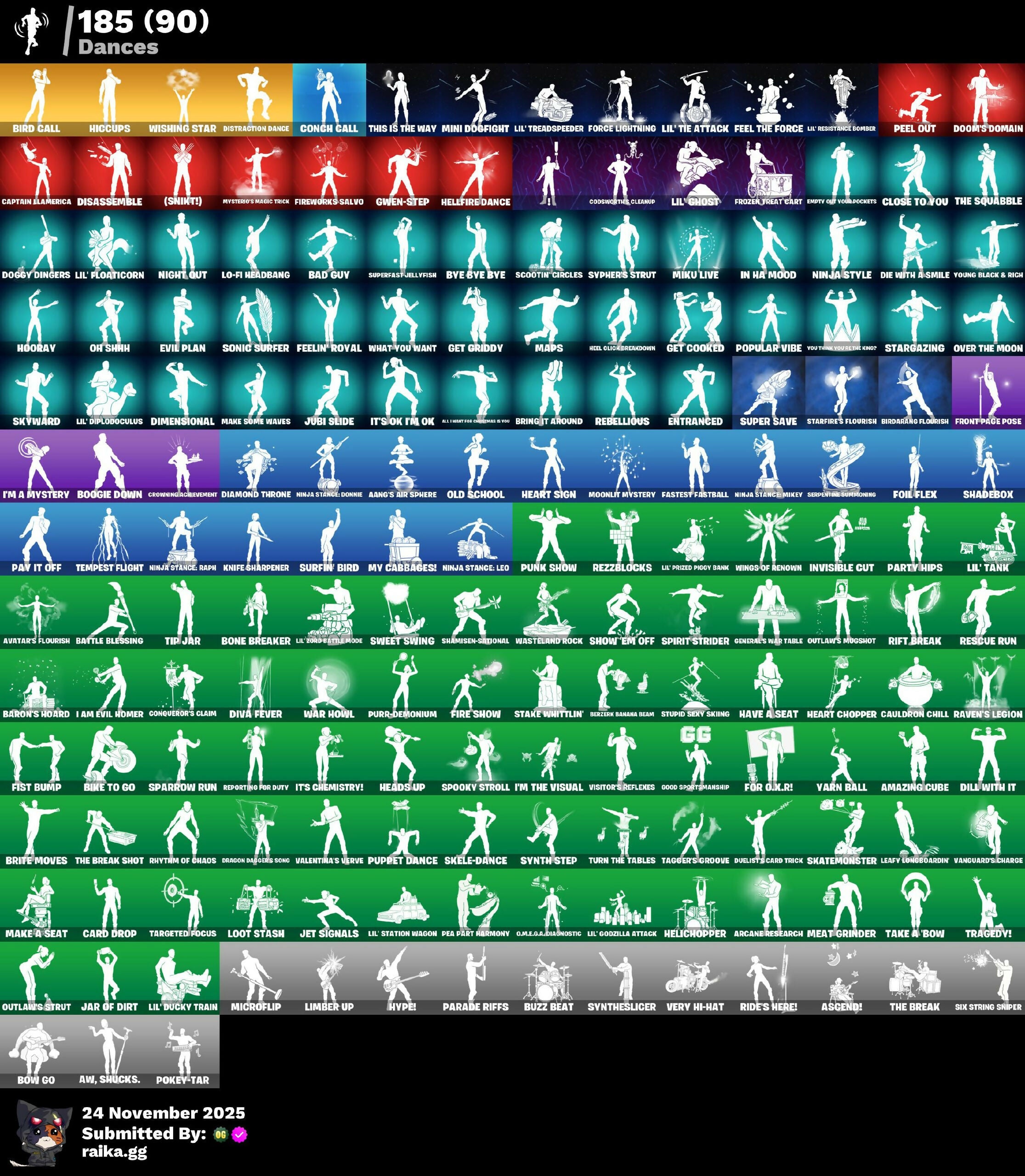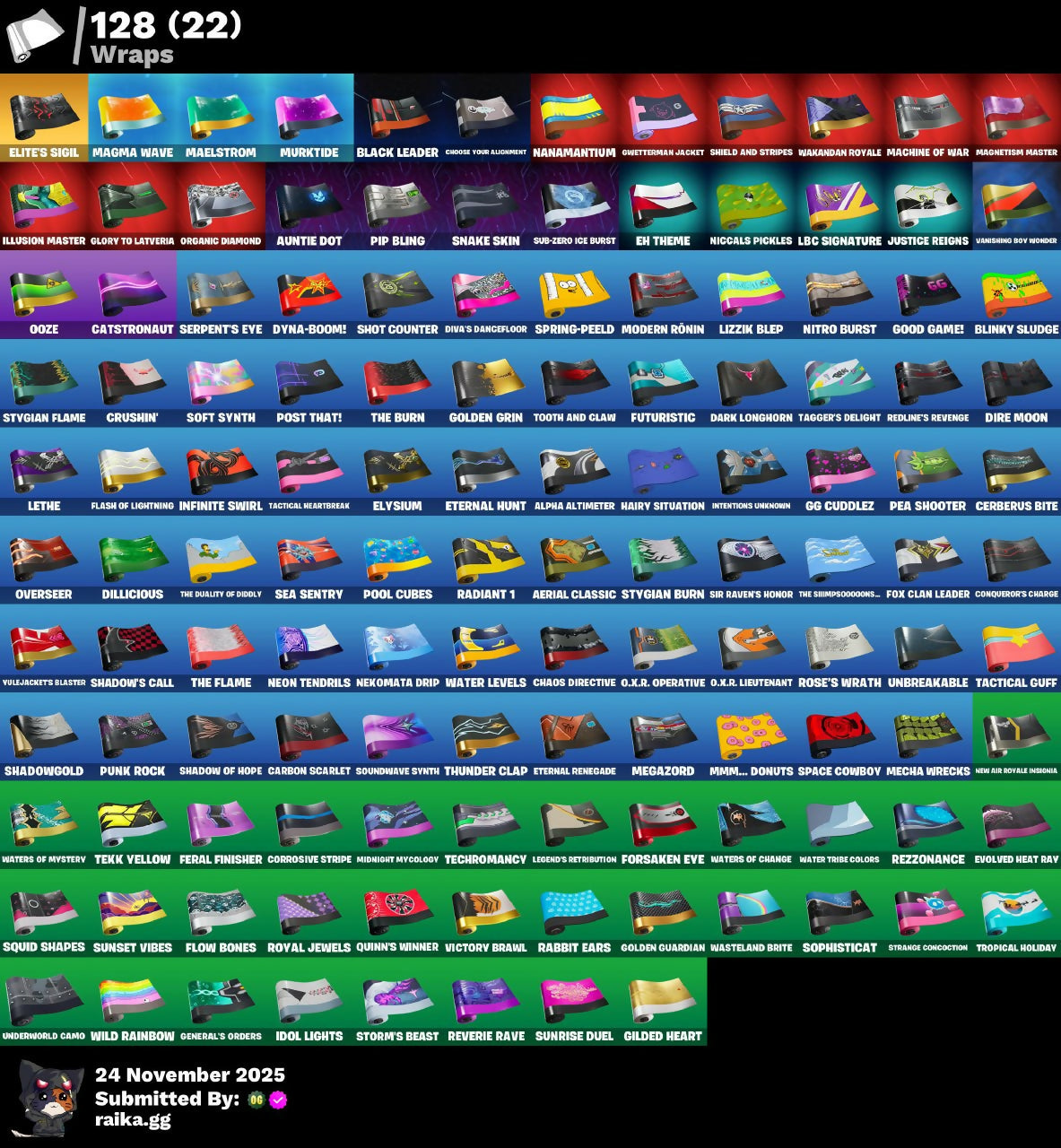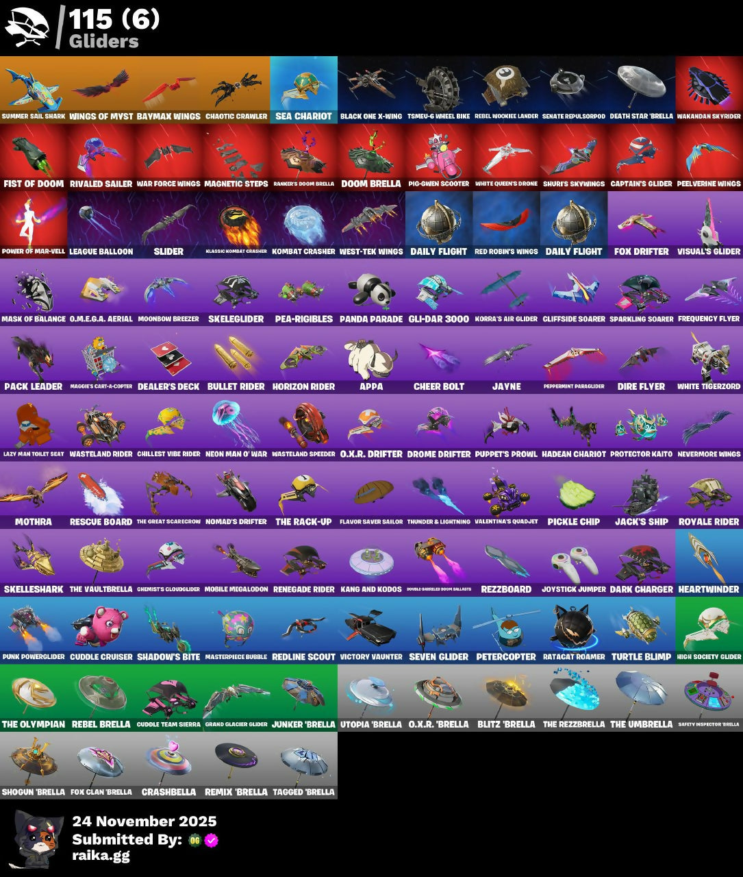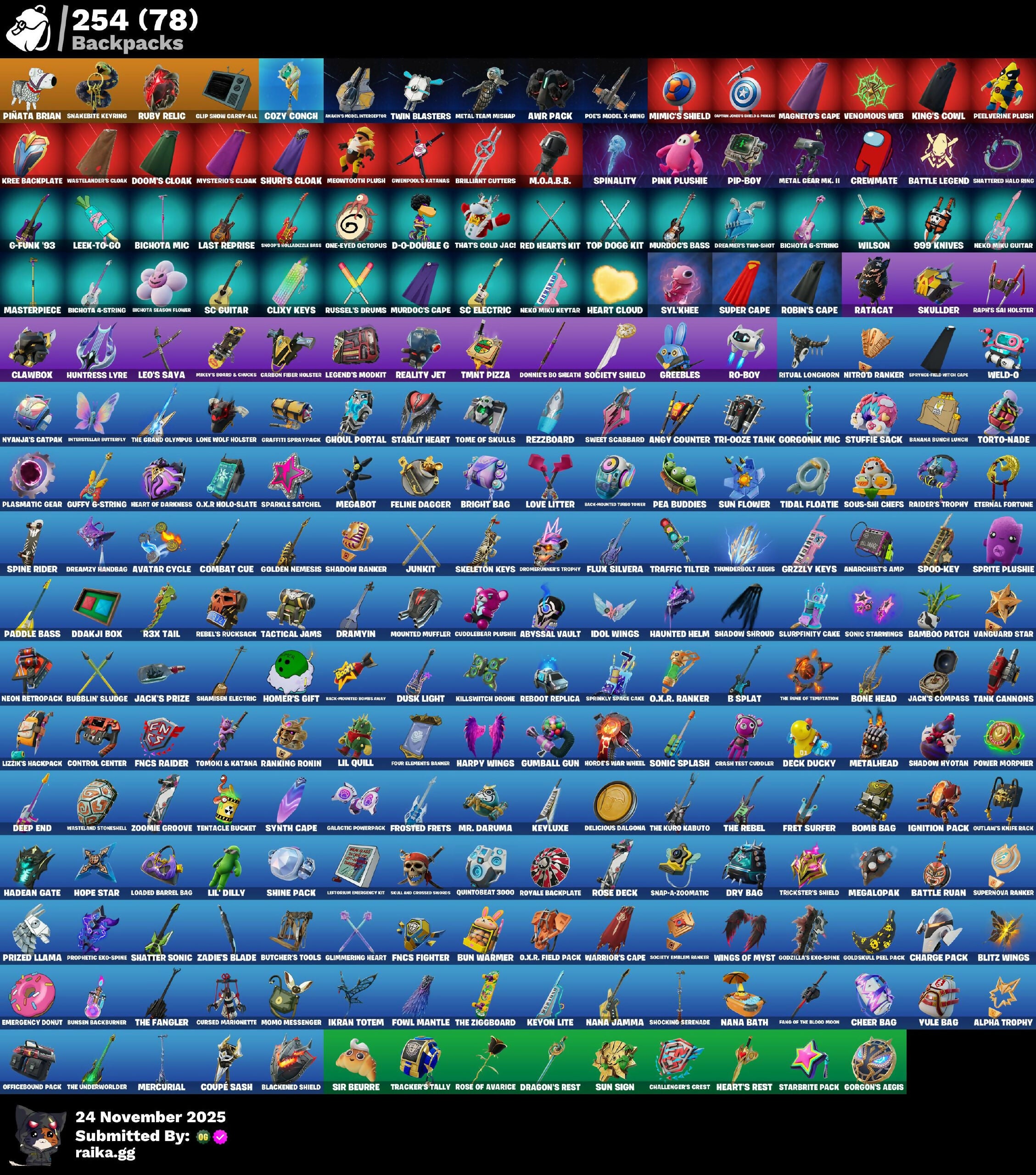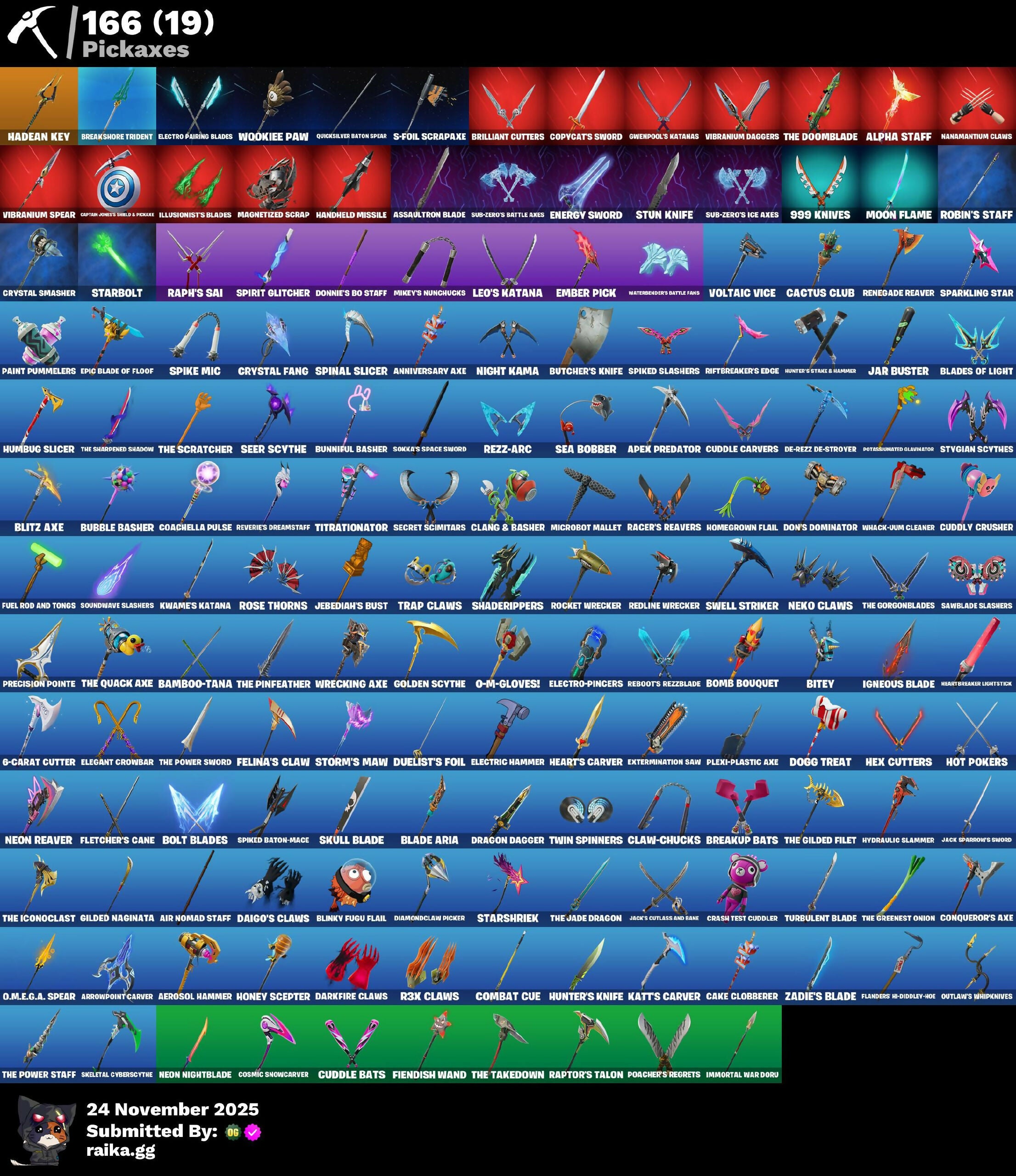 (Snikt!), 1-Ball, 10-Ball, 6-Carat Cutter, 999 Knives, Aang, Aang's Air Sphere, Abyssal Vault, Aerial Assault Bomber, Aerial Classic, Aerosol Hammer, Agata, Agent Patch, Air Nomad Staff, Akari, All I Want For Christmas Is You, Alpha Altimeter, Alpha Staff, Alpha Trophy, Amazing Cube, Anarchist's Amp, Andy Fangerson, Angy Counter, Anniversary Axe, Apex Predator, Aphrodite, Appa, Apprentice Evie, Arcane Research, Ares, Arrowpoint Carver, Artemis, Ascend!, Assaultron Blade, Augury, Auntie Dot, Avatar Cycle, Avatar State Aang, Avatar's Flourish, Aw, Shucks., Awr Pack, Ayla Winn, B Splat, Bad Guy, Bamboo Patch, Bamboo-Tana, Banana Bunch Lunch, Baron's Hoard, Battle Blessing, Battle Gamer Mae, Battle Legend, Battle Ruan, Baymax Wings, Beach Jules, Bernie, Berzerk Banana Beam, Bichota 4-String, Bichota G-String, Bichota Mic, Bichota Season Flower, Big Dill, Bigchota Season Karol G, Bike To Go, Bird Call, Birdarang Flourish, Bitey, Black Leader, Black One X-Wing, Black Panther, Blackened Shield, Blade Aria, Blades of Light, Blinky Fishstick, Blinky Fugu Flail, Blinky Sludge, Blitz Axe, Blitz Brella, Blitz Wings, Bolt Blades, Bomb Bag, Bomb Bouquet, Bone Breaker, Bone Head, Bones, Boogie Down, Bow Go, Breakshore Trident, Breakup Bats, Bright Bag, Brilliant Cutters, Bring It Around, Brite Agent, Brite Moves, Brite Raider, Bubble Basher, Bubblin' Sludge, Bullet Rider, Bun Warmer, Bunniful Basher, Bunsen Backburner, Burnoff, Butcher's Knife, Butcher's Tools, Buzz Beat, Bye Bye Bye, Cactus Club, Cake Clobberer, Captain Clamerica, Captain Jones, Captain Jones's Shield & Pickaxe, Captain Marvel, Captain Phasma, Captain's Glider, Carbon Fiber Holster, Carbon Scarlet, Card Drop, Carmine Rosso, Cassidy Quinn, Cate Meowdy, Catstronaut, Cauldron Chill, Cerberus, Cerberus Bite, Challenger's Crest, Champion Kuno, Chaos Directive, Chaos Director, Chaotic Crawler, Charge Pack, Cheer Bag, Cheer Bolt, Chemist's Cloudglider, Chewbacca, Chillest Vibe Rider, Clang & Basher, Clara, Claw-Chucks, Clawbox, Cliffside Soarer, Clip Show Carry-All, Clixy Keys, Close To You, Coachella Pulse, Combat Cue, Conch Call, Conqueror's Axe, Conqueror's Charge, Conqueror's Claim, Control Center, Coosworth's Cleanup, Copycat's Sword, Corrosive Stripe, Cosma, Cosmic Snowcarver, Coupé Sash, Cozy Conch, Crash Test Cuddler, Crashbrella, Crewmate, Crowning Achievement, Crushin', Crystal Fang, Crystal Smasher, Cuddle Bats, Cuddle Carvers, Cuddle Cruiser, Cuddle Team Sierra, Cuddle Team Specialist, CuddleBear Plushie, Cuddly Crusher, Cursed Jack Sparrow, Cursed Marionette, D-O-Double G, Daigo, Daigo's Claws, Daily Flight, Dali, Danica, Dark Charger, Dark Longhorn, Darkfire Claws, Ddak-Ji Box, De-Rezz De-Stroyer, Dealer's Deck, Death Star 'Brella, Deck Ducky, Deep End, Delicious Dalgona, Diamond Diva, Diamond Throne, Diamondclaw Picker, Die With A Smile, Die With A Smile Bruno, Dill With It, Dillicious, Dimensional, Dino Megazord, Dire Flyer, Dire Moon, Disassemble, Distraction Dance, Diva Fever, Diva's Dancefloor, Dogg Treat, Doggy Dingers, Don's Dominator, Donatello, Donnie's Bo Sheath, Donnie's Bo Staff, Doom, Doom Brella, Doom's Cloak, Doom's Domain, Double-Barreled Boom Ballasts, Dragon Dagger, Dragon Dagger's Song, Dragon's Rest, Dramyin, Dreamer's Two-Shot, Dreamzy Handbag, Drome Drifter, DromeRunner's Trophy, Dry Bag, Duelist's Card Trick, Duelist's Foil, Durrr Taisho, Dusk Knight, Dusk Light, Dyna-Boom!, Dynamo Tntina, Eh Theme, Electric Hammer, Electro Pairing Blades, Electro-Pincers, Elegant Crowbar, Elite's Sigil, Elysium, Ember Pick, Emergency Donut, Emma Frost, Empty Out Your Pockets, Energy Sword, Entranced, Epic Blade of Floof, Eternal Fortune, Eternal Hunt, Eternal Renegade, Evil Plan, Evolved Heat Ray, Explorer Emilie, Extermination Saw, FNCS Fighter, FNCS Raider, Fang of The Blood Moon, Fastest Fastball, Feel The Force, Feelin' Royal, Felina, Felina's Claw, Feline Dagger, Feral Finisher, Fiendish Wand, Fire Show, Fireworks Salvo, First Order Stormtrooper, Fist Bump, Fist Of Doom, Flanders Hi-Diddley-Hoe, Flash Of Lightning, Flavor Saver Sailor, Fletcher Kane, Fletcher's Cane, Flow Bones, Flux Silvera, Foil Flex, For O.J.X.R.!, Force Lightning, Forsaken Eve, Four Elements Banner, Fowl Mantle, Fox Clan 'Brella, Fox Clan Leader, Fox Drifter, Frequency Flyer, Fret Surfer, Front Page Pose, Frosted Frets, Frozen Treat Cart, Fuel Rod and Tongs, Futuristic, G-Funk '93, GG Cuddlez, Galactic Powerpack, General's Orders, General's War Table, Get Cooked, Get Griddy, Ghoul Portal, Gilded Heart, Gilded Naginata, Gli-Dar 3000, Glimmering Heart, Glory To Latveria, Godzilla Evolved, Godzilla's Exo-Spine, Golden Grin, Golden Guardian, Golden Nemesis, Golden Scythe, Goldskull Peel Pack, Good Game!, Good Sportsmanship, Gorgon's Aegis, Gorgonik Mic, Graffiti Spraypack, Grand Glacier Glider, Greebles, Green Ranger, Grzzly Keys, Guardian Lin, Guffy G-String, Gumball Gun, Gwen-step, Gwenpool, Gwenpool's Katanas, Gwettermann Jacket, Hadean Chariot, Hadean Gate, Hadean Key, Hades, Hairy Situation, Hana Park, Handheld Missile, Harpy Haze, Harpy Wings, Haruka of the Masks, Haunted Helm, Have A Seat, Haylee Skye, Heads Up, Heart Chopper, Heart Cloud, Heart Sign, Heart of Darkness, Heart's Carver, Heart's Rest, Heartbreaker Lightsick, Heartseeker Aphrodite, Heartwinder, Heel Click Breakdown, Helichopper, Hellfire Dance, Hero Baymax, Heroic Hope, Hex Cutters, Hexed Haze, Hiccups, High Society Glider, Homegrown Flail, Homer Simpson, Homer's Gift, Honey Scepter, Hooray, Hope, Hope Star, Horde's War Wheel, Horizon, Horizon Rider, Hot Pokers, Humbug Slicer, Hunter's Knife, Hunter's Stake & Hammer, Huntress Lyre, Hydraulic Slammer, Hype!, I Am Evil Homer, I'm A Mystery, I'm The Visual, Idol Lights, Idol Wings, Igneous Blade, Ignition Pack, Ikran Totem, Illusion Master, Illusionist's Blades, Immortal Wardoru, In Ha Mood, Infinite Swirl, Intentions Unknown, Interstellar Butterfly, Invisible Cut, It's Chemistry!, It's Ok I'm Ok, Jack Sparrow, Jack Sparrow's Swor