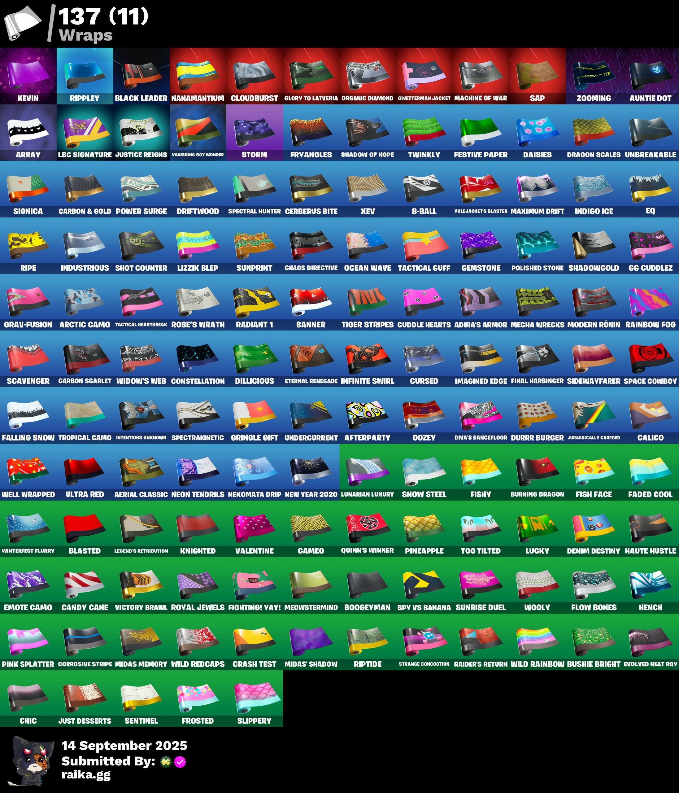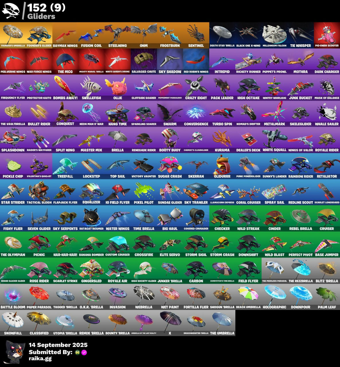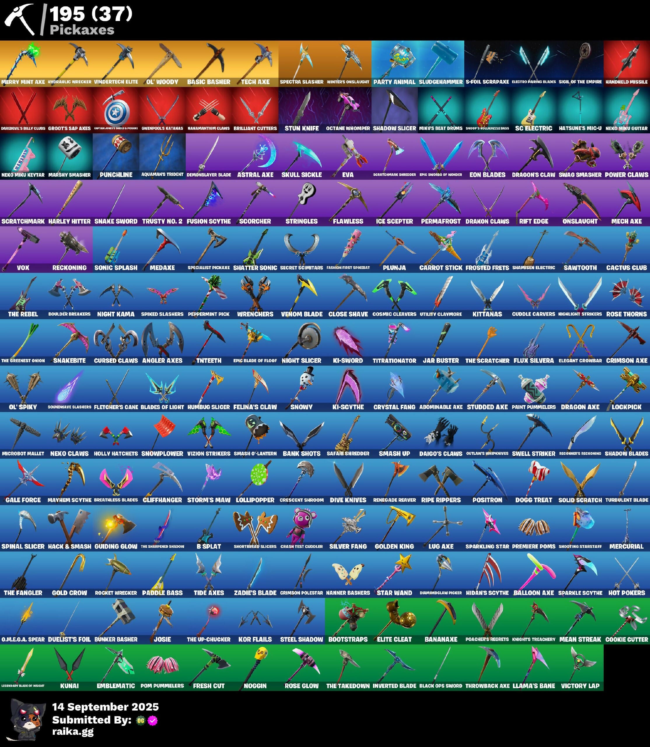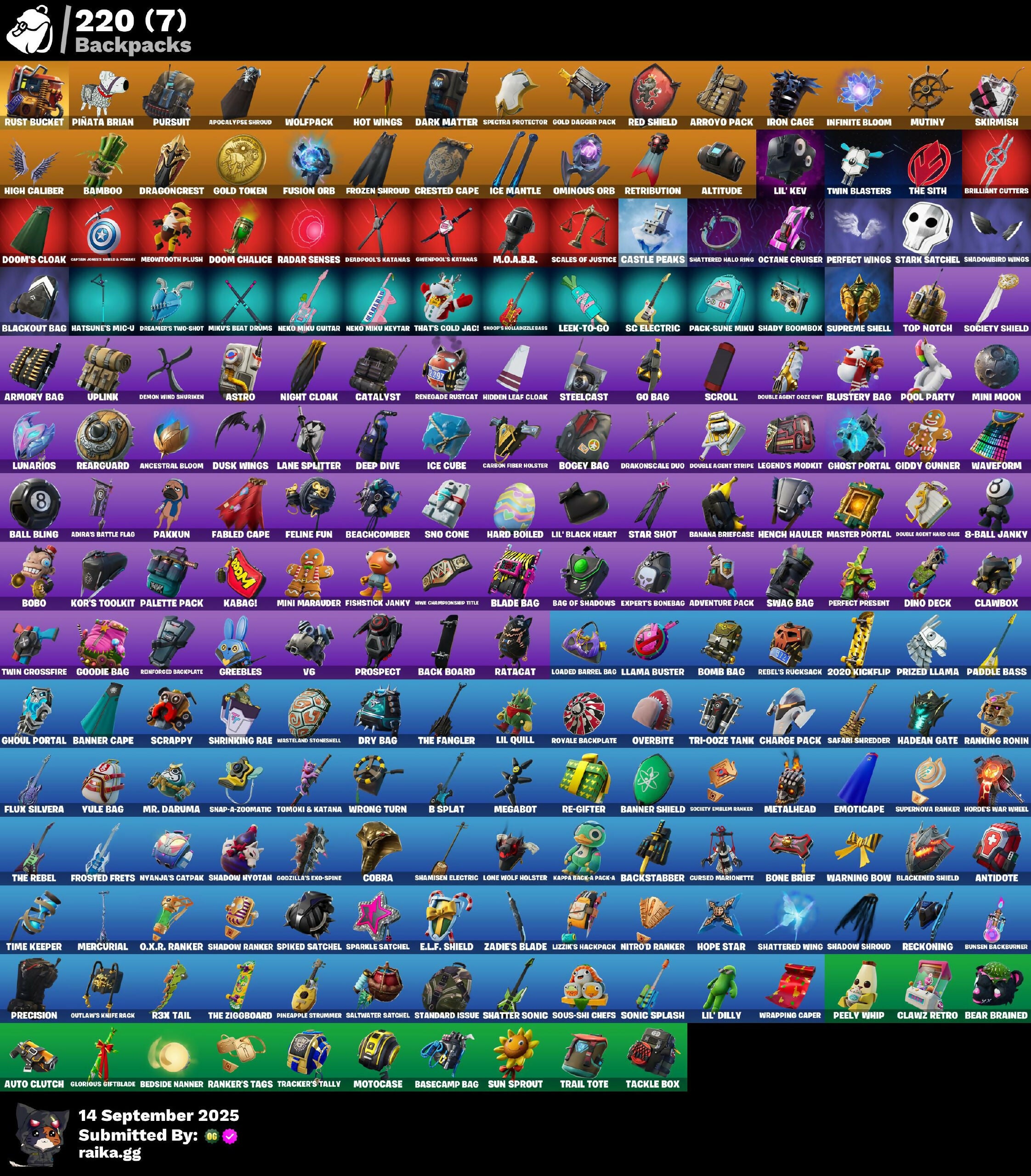 (Snikt!), 2020 Kickflip, 8-Ball, 8-Ball Janky, 8-Ball vs Scratch, Abominable Axe, Adira'S Battle Flag, Adira's Armor, Adventure Pack, Aerial Assault Bombie, Aerial Classic, Afterparty, Agent Peely, Air Shredder, Altitude, Ancestral Bloom, Angler Axes, Antidote, Apocalypse Shroud, Aquaman, Aquaman's Trident, Arctic Camo, Armory Bag, Around The Clock, Array, Arroyo Pack, Astral Axe, Astro, Auntie Dot, Aura, Auto Clutch, B Splat, Back Board, Backstabber, Bag Of Shadows, Ball Bling, Baller, Balloon Axe, Bamboo, Banana, Banana Bomber, Banana Briefcase, Bananaxe, Bandolier, Bank Shots, Banner, Banner Cape, Banner Shield, Banner Wave, Baron's Hoard, Base Jumper, Basecamp Bag, Basic Basher, Battle Bloom, Battle Bus, Battle Call, Battle Hound, Battlehawk, Baymax Wings, Be Seeing You, Beach Umbrella, Beachcomber, Bear Brained, Beastmode, Bedside Nanner, Beep Beep, Best Mates, Big Dill, Big Haul, Black Leader, Black One X-Wing, Black Ops Sword, Blackened Shield, Blackheart, Blackout Bag, Blade Bag, Blades of Light, Blasted, Blitz 'Brella, Blowing Bubbles, Blustery Bag, Bobo, Bogey Bag, Boing!, Bomb Bag, Bombs Away!, Bone Brief, Boogeyman, Boogie Down, Bootstraps, Booty Buoy, Boulder Breakers, Bounty 'Brella, Branded Brigadier, Breakdown, Breakneck, Breathless Blades, Brella, Brilliant Cutters, Brutus, Bullet Rider, Bullseye, Bunker Basher, Bunker Jonesy, Bunny, Bunsen Backburner, Burning Dragon, Burnoff, Bushie Bright, Busy, Cactus Club, Calamity, Calculated, Calico, Call Me, Cameo, Cameo vs Chic, Candy Cane, Cap Kick, Captain America'S Shield & Pickaxe, Captain Blamerica, Captain Jones's Shield & Pickaxe, Carbide, Carbon, Carbon & Gold, Carbon Fiber Holster, Carbon Scarlet, Carrot Stick, Cassidy Quinn, Castle Peaks, Cat Flip, Catalyst, Cerberus Bite, Chaos Directive, Chaos Double Agent, Charge Pack, Charlotte, Checker, Chemist's Cloudglider, Chic, Choice Knit, Cinder, Classified, Clawbox, Clawz Retro, Clean Sweep, Click!, Cliffhanger, Cliffside Soarer, Clinical Crosser, Close Shave, Cloudburst, Cluck Strut, Cobalt, Cobra, Codename E.L.F., Coin Flip, Comet, Comfy Chomps, Competitor's Time Brella, Conga, Conquest, Constellation, Constructor, Convergence, Cookie Cutter, Coral Cruiser, Corrosive Stripe, Cosmic Cleavers, Covered Crusader, Cozy Commander, Crash Test, Crash Test Cuddler, Crazy Eight, Crescent Shroom, Crested Cape, Crimson Axe, Crimson Polestar, Crossfire, Cruiser, Crystal, Crystal Fang, Cuddle Carvers, Cuddle Hearts, Cursed, Cursed Claws, Cursed Marionette, Custom Cruiser, DJ Yonder, Dab, Daigo, Daigo's Claws, Daisies, Daredevil, Daredevil's Billy Clubs, Dark Charger, Dark Doggo, Dark Matter, Dark Voyager, Deadpool, Deadpool'S Katanas, Dealer's Deck, Death Star 'Brella, Deep Dive, Demi, Demon Wind Shuriken, Demonslayer Blade, Denied, Denim Destiny, Diamond Throne, Diamondclaw Picker, Dillicious, Dino Deck, Dip, Dire, Disco Fever, Diva Fever, Diva's Dancefloor, Dive Knives, Do The Split, Dogg Treat, Doom Chalice, Doom's Cloak, Double Agent Hard Case, Double Agent Hush, Double Agent Ooze Quirt, Double Agent Stripe, Double Agent Wildcard, Downpour, Downshift, Doze Dab, Dragon Axe, Dragon Scales, Dragon Stance, Dragon's Claw, Dragoncrest, Dragonhearted 'Brella, Drakon Claws, Drakon Steel Hybrid, Drakonscale Duo, Dream, Dreamer's Two-Shot, Drift, Driftwood, Droop, Drop The Bass, Dry Bag, Duelist's Card Trick, Duelist's Foil, Dummy, Durrr Burger, Durrr Taisho, Dusk, Dusk Knight, Dusk Wings, E.L.F. Shield, Electro Pairing Blades, Elegant Crowbar, Elite Agent, Elite Cleat, Elite Servo, Ember, Emblematic, Emma Frost, Emote Camo, Emoticape, Eon Blades, Epic Blade of Floof, Epic Swords of Wonder, Eq, Equalizer, Eternal Renegade, Eternal Voyager, Eva, Evolved Heat Ray, Expert'S Bonebag, Explorer Emilie, Fable, Fabled Cape, Fade, Faded Cool, Falling Snow, Fashion First Spikebat, Fate, Felina's Claw, Feline Fun, Festive Paper, Field Flyer, Fierce, Fighting! Yay!, Final Harbinger, Finesse Finisher, Finger Wag, Fish Face, Fishstick, Fishstick Janky Rise Championship Style, Fishy, Fishy Flier, Fist Bump, Fixer, Flamenco, Flapjack Flyer, Flapper, Flawless, Fletcher Kane, Fletcher's Cane, Flippin' Away, Flippin' Sexy, Flow Bones, Flux Silvera, Foil Flex, Fortilla Flier, Founder's Glider, Founder's Umbrella, Founders Umbrella, Free Flow, Frequency Flyer, Fresh Cut, Fright Funk, Frontpage Pose, Frostburn, Frosted, Frosted Frets, Frozen Fishstick, Frozen Nog Ops, Frozen Shroud, Fryangles, Fusion, Fusion Coil, Fusion Orb, Fusion Scythe, Gale Force, Gear Specialist Maya, Gemstone, Gentleman's Dab, Get Funky, Gg Cuddlez, Ghost Portal, Ghoul Portal, Ghoul Trooper, Giddy Gunner, Giddy-Up, Ginger Gunner, Gingersled, Glidurr, Glorious Giftblade, Glory To Latveria, Gnome, Go Bag, Godzilla Evolved, Godzilla'S Exo-Spine, Goku Black, Gold Crow, Gold Dagger Pack, Gold Token, Golden King, Golf Clap, Goodie Bag, Grand Glacier Glider, Grav-Fusion, Greebles, Gringle Gift, Groot's Sap Axes, Groove Jam, Ground Pound, Guff Gringle, Guiding Glow, Gwen-Step, Gwendolyn'S Katanas, Gwenpool, Gwenpool's Katanas, Gwertterman Jacket, Hack & Smash, Hadean Gate, Hand Signals, Handheld Missile, Hang Time, Har-Har-Har!, Hard Boiled, Harley Hitter, Harley Quinn, Haruka of the Masks, Hatsune Miku, Hatsune'S Mic-U, Hatsune's Mic-0, Haute Hustle, Hellfire Dance, Hello Friend, Hemlock, Hench, Hench Hauler, Hero Baymax, Hidan's Scythe, Hidden Leaf Cloak, High Caliber, High Five, High Octane, High Society Glider, Highlight Strikers, Holiday Boxy, Holly Hatchets, Holographic, Hoop Master, Hootenanny, Hope, Hope Star, Horde'S War Wheel, Hot Marat, Hot Pokers, Hot Stuff, Hot Wings, Howl, Hula Hoopin', Humbug Slicer, Huntress, Hybrid, Hydraulic Wrecker, Hype, Hype!, I Declare!, I'm A Mystery, IO Field Flyer, Ice Cube, Ice Mantle, Ice Scepter, Idk, Imagined Edge, Imperial March, Indigo Ice, Industrious, Infinite Bloom, Infinite Swirl, Intentions Unknown, Intrepid, Intteeth, Invasion, Inverted Blade, Invisible Cut, Iron Cage, It Is Finished, It's Chemi