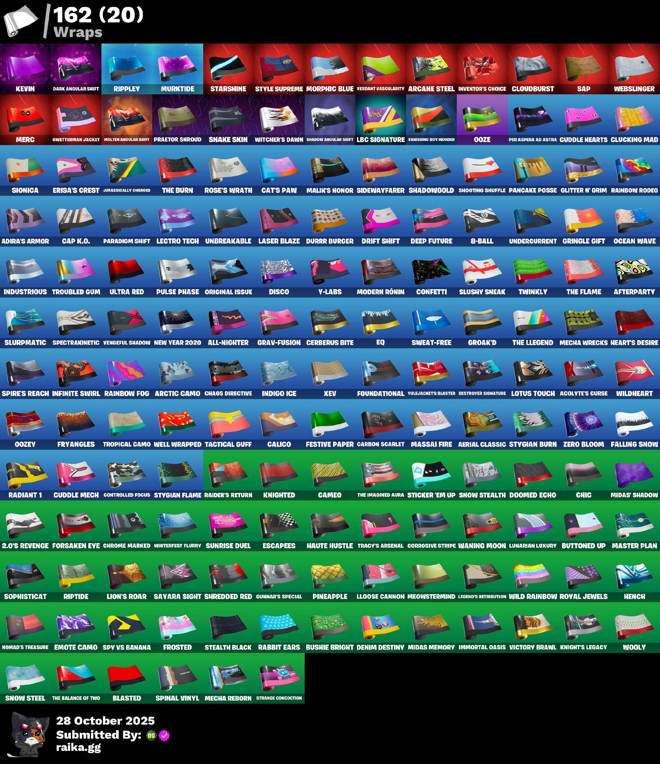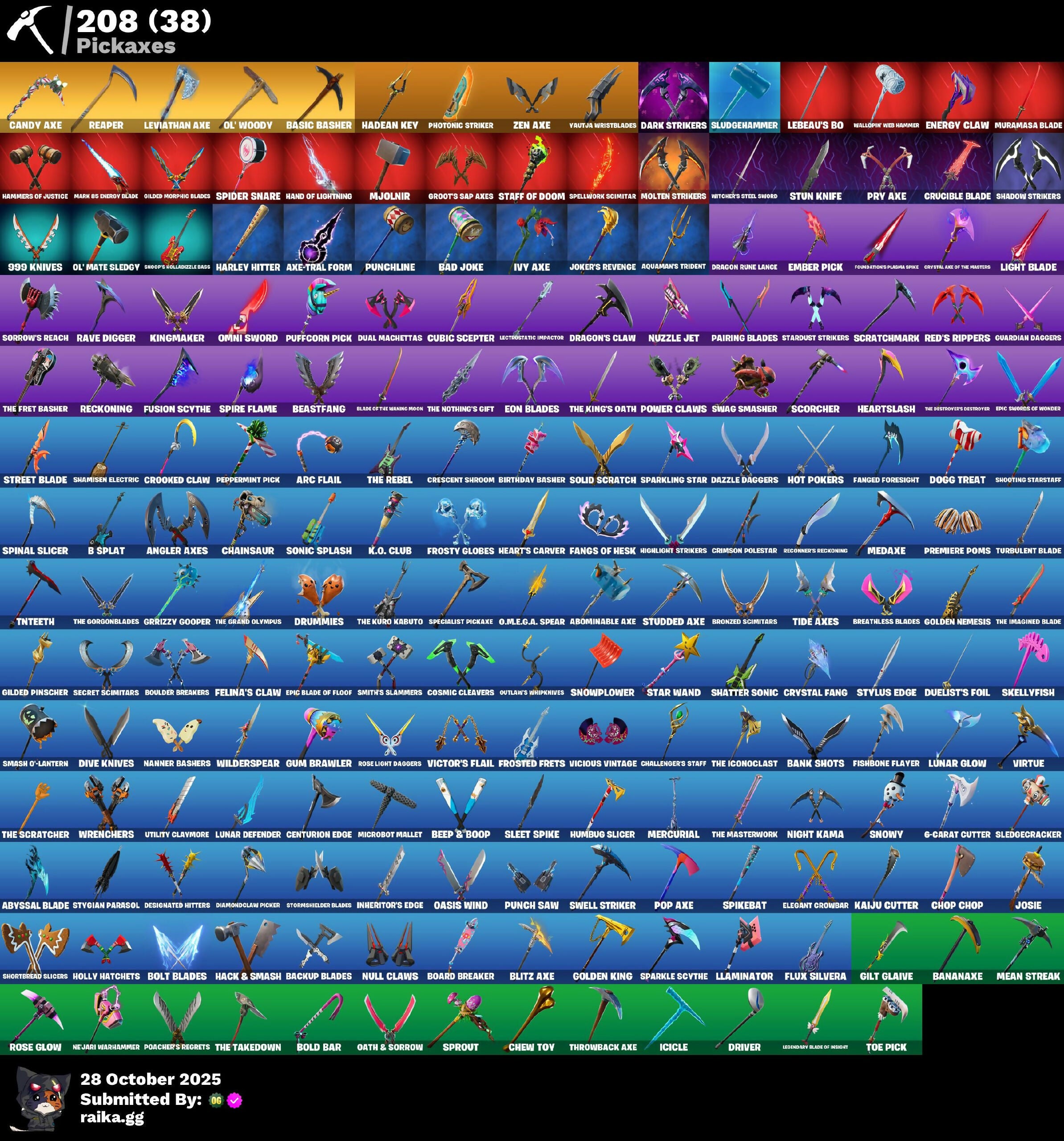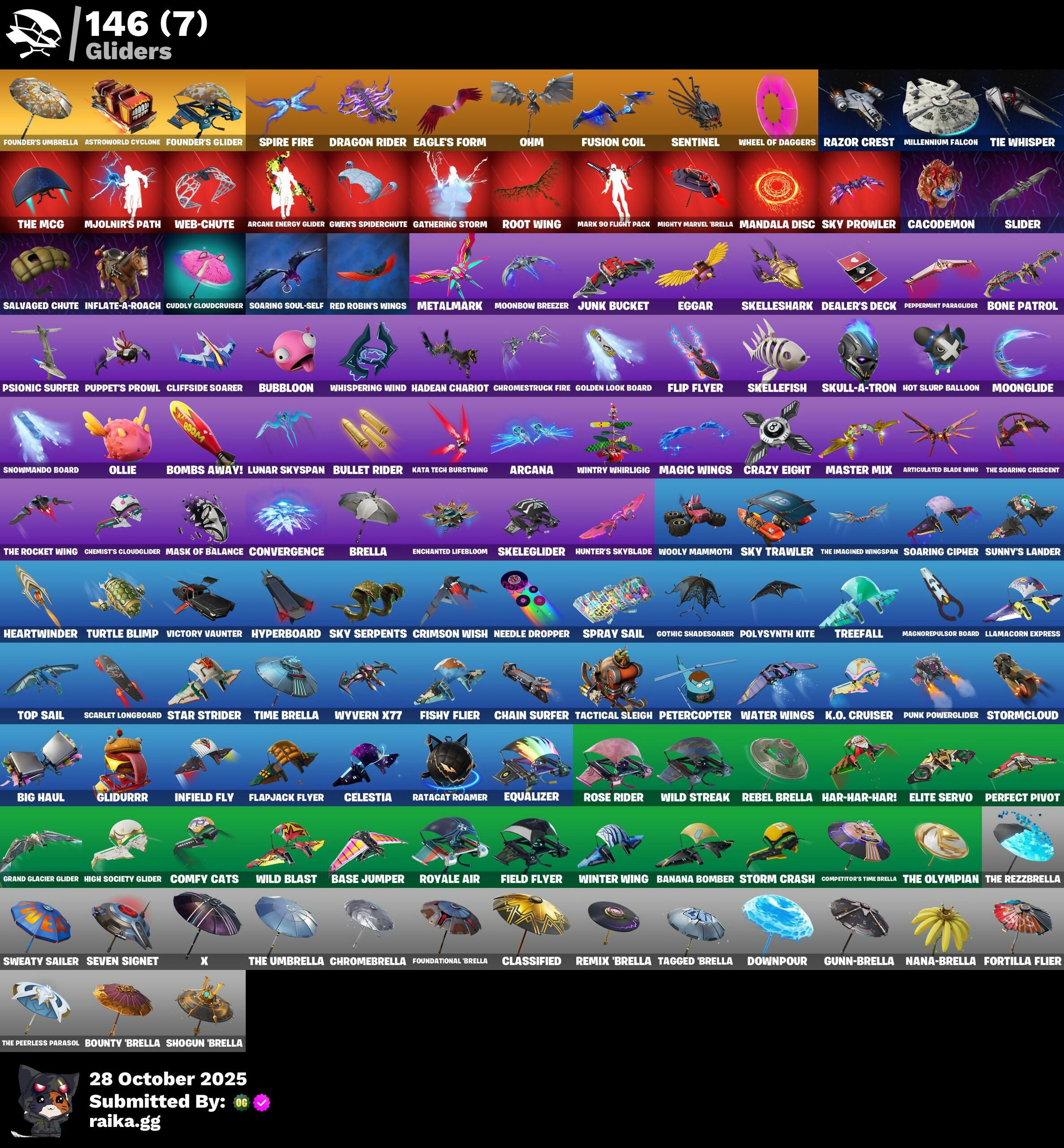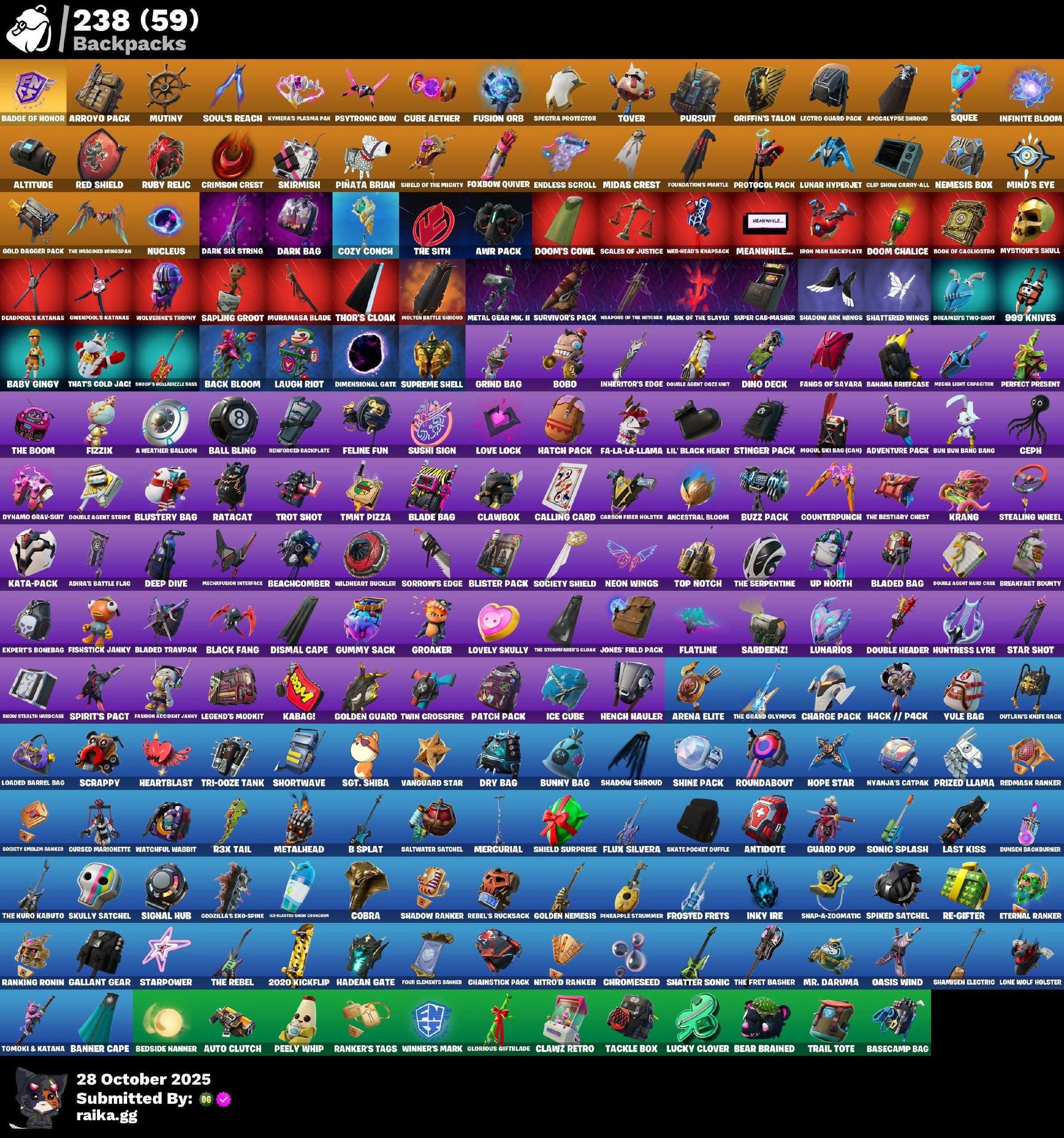 2.0's Revenge, 2020 Kickflip, 6-Carat Cutter, 8-Ball, 8-Ball Vs Scratch, 999 Knives, A Warrior Prepares, A Weather Balloon, AWR Pack, Abominable Axe, Abyssal Blade, Acolyte's Curse, Adira, Adira's Armor, Adira's Battle Flag, Adventure Pack, Aerial Classic, Aftermath, Afterparty, Agent Jones, Agent Peely, Air Shredder, All-Nighter, Alli, Altitude, Ancestral Bloom, Angler Axes, Antidote, Apocalypse Shroud, Aquaman, Aquaman's Trident, Arachrobatics, Arc Flail, Arcana, Arcane Energy Glider, Arcane Steel, Arctic Adeline, Arctic Camo, Arena Elite, Arm The Pumpkin!, Arroyo Pack, Arsenz, Articulated Blade Wing, Astroworld Cyclone, Aura, Auto Clutch, Axe-Tral Form, Azarath Metrion Zinthos!, B Splat, Baby Gingy, Back Bloom, Backlash, Backup Blades, Bad Joke, Badge Of Honor, Balance Board, Ball Bling, Banana Bomber, Banana Briefcase, Bananaxe, Bank Shots, Banner Cape, Baron's Hoard, Base Jumper, Basecamp Bag, Basic Basher, Beachcomber, Bear Brained, Bear Hug, Beastfang, Bedside Nanner, Beep & Boop, Beep Beep, Big Haul, Billy Bounce, Birdie, Birthday Basher, Black Fang, Blackheart, Blade Bag, Blade Of The Waning Moon, Bladed Bag, Bladed Travpak, Blasted, Blister Pack, Blitz Axe, Blowin' Up, Blowing Bubbles, Blustery Bag, Board Breaker, Bobo, Boing!, Bold Bar, Bolt Blades, Bombs Away!, Bone Patrol, Boogie Down, Book Of Cagliostro, Boomin', Boots 'N' Cats, Boulder Breakers, Bounty 'Brella, Breakfast Bounty, Breathless Blades, Brella, Bronzed Scimitars, Brutus, Bubbloon, Bullet Rider, Bun Bun Bang Bang, Bunny Bag, Bushie Bright, Buttoned Up, Buzz Pack, Bytes, Cacodemon, Calamity, Calico, Call Me, Calling Card, Cameo, Cameo Vs Chic, Candy Axe, Cap K.O., Carbon Fiber Holster, Carbon Scarlet, Card Drop, Cardistry, Cat Flip, Cat's Paw, Catalyst, Celestia, Centurion, Centurion Edge, Ceph, Cerberus Bite, Chain Surfer, Chainsaur, Chainstick Pack, Challenger's Staff, Champion Siren, Chaos Directive, Chaos Double Agent, Charge Pack, Chemist's Cloudglider, Chew Toy, Chic, Chicken Wing It, Chigusa, Choice Knit, Chop Chop, Chrome Marked, Chrome Punk, Chromebrella, Chromeseed, Chromestruck Fire, Chun-Li, Classified, Clawbox, Clawz Retro, Clean Sweep, Cliffside Soarer, Clip Show Carry-All, Cloudburst, Cluck, Clucking Mad, Cobalt, Cobra, Coin Flip, Comfy Cats, Competitor's Time Brella, Confetti, Conjure Weapon, Controlled Focus, Convergence, Copines, Corrosive Stripe, Cosmic Cleavers, Counterpunch, Cozy Commander, Cozy Conch, Crackdown, Crazy Eight, Crescent Shroom, Crimson Crest, Crimson Polestar, Crimson Wish, Crooked Claw, Crowning Achievement, Crucible Blade, Crystal, Crystal Axe Of The Masters, Crystal Fang, Cube Aether, Cubic Scepter, Cuddle Hearts, Cuddle Mech, Cuddly Cloudcruiser, Curling Iron, Cursed Marionette, Cyclo Curl, Dabstand, Dagger Dance, Dance Monkey, Dark Angular Shift, Dark Bag, Dark Bomber, Dark Power Chord, Dark Six String, Dark Strikers, Dazzle Daggers, Deadpool, Deadpool's Katanas, Dealer's Deck, Deep Dive, Deep Future, Deimos, Denim Destiny, Designated Hitters, Destroyer Signature, Diamond Diva, Diamond Throne, Diamondclaw Picker, Dimensional Gate, Dino Deck, Dirtbike Challenge, Disco, Disco Fever, Dismal Cape, Dive Knives, Dj Yonder, Doctor Doom, Doctor Strange, Dogg Treat, Don't Start Now, Doom Chalice, Doom Slayer, Doom's Cowl, Doomed Echo, Double Agent Hard Case, Double Agent Hush, Double Agent Ooze Unit, Double Agent Stripe, Double Agent Wildcard, Double Header, Downpour, Doze Dab, Dragon Rider, Dragon Rune Lance, Dragon Stance, Dragon's Claw, Dreamer's Two-Shot, Drift Shift, Driver, Droop, Drummies, Dry Bag, Dual Machettas, Duelist's Foil, Dunsen Backburner, Durrr Burger, Dusty, Dynamo, Dynamo Grab-Suit, EQ, Eagle's Form, Eggar, Electrostatic Impactor, Elegant Crowbar, Elite Servo, Ember Pick, Emote Camo, Enchanted Lifebloom, Endless Scroll, Energy Claw, Eon Blades, Epic Blade Of Floof, Epic Swords Of Wonder, Equalizer, Erisa, Erisa's Crest, Escapees, Eternal Ranker, Evasive Maneuvers, Evie, Expert's Bonebag, Expressionism, Fa-La-La-Llama, Fade, Falling Snow, Fancy Footwork, Fanged Foresight, Fangs Of Hesk, Fangs Of Savara, Fashion Accident Janky, Felina, Felina's Claw, Feline Fun, Festive Paper, Field Flyer, Fishbone Flayer, Fishstick, Fishstick Janky, Fishy Flier, Fist Bump, Fizzix, Flapjack Flyer, Flatline, Flip Flyer, Flippin' Away, Flux Silvera, Foil Flex, Forsaken Eye, Fortilla Flier, Foundation's Mantle, Foundation's Plasma Spike, Foundational, Foundational 'Brella, Founder's Glider, Founder's Umbrella, Four Elements Banner, Foxbow Quiver, Frost Squad, Frosted, Frosted Frets, Frosty Globes, Fry Angles, Fusion, Fusion Coil, Fusion Orb, Fusion Scythe, Galaxy Scout, Gallant Gear, Game Knight, Gathering Storm, Gear Specialist Maya, Gentleman's Dab, Geralt Of Rivia, Get Funky, Get Griddy, Ghoul Trooper, Gilded Morphic Blades, Gilded Pinscher, Gildhart, Gilt Glaive, Glidurrr, Glitter N' Grim, Glorious Giftblade, Go Mufasa, Godzilla's Exo-Spine, Gold Dagger Pack, Gold Midas, Golden Guard, Golden King, Golden Look Board, Golden Nemesis, Golf Clap, Gothic Shadesoarer, Grand Glacier Glider, Grav-Fusion, Griffin's Talon, Grind Bag, Gringle Gift, Grizzly Gooper, Groak'd, Groaker, Groot, Groots Sap Axes, Ground Pound, Grriz, Guard Pup, Guardian Daggers, Gum Brawler, Gumbo, Gummy Sack, Gunn-Brella, Gunnar, Gunnar's Special, Gwen's Spiderchute, Gwendol's Katanas, Gwetterman Jacket, H4CK // P4CK, Hack & Smash, Hadean Chariot, Hadean Gate, Hadean Key, Hammers Of Justice, Hand Of Lightning, Har-Har-Har!, Harley Hitter, Harley Quinn, Harlowe, Hatch Pack, Haute Hustle, Have A Seat, Haven, Heart Sign, Heart's Carver, Heart's Desire, Heartblast, Heartslash, Heartwinder, Hello Friend, Hench, Hench Hauler, Hey Now!, High Five, High Society Glider, Highlight Strikers, Hit It, Holiday Boxy, Holly Hatchets, Hope, Hope Star, Hopper, Hot Pokers, Hot Slurp Balloon, Hula Hoopin', Human Bill, Humbug Slicer, Hunter's Skyblade, Huntress Lyre, Hybrid, Hyperboard, Hypnot-Eyes, I Declare!, I'm A Mystery, I'm Diamon