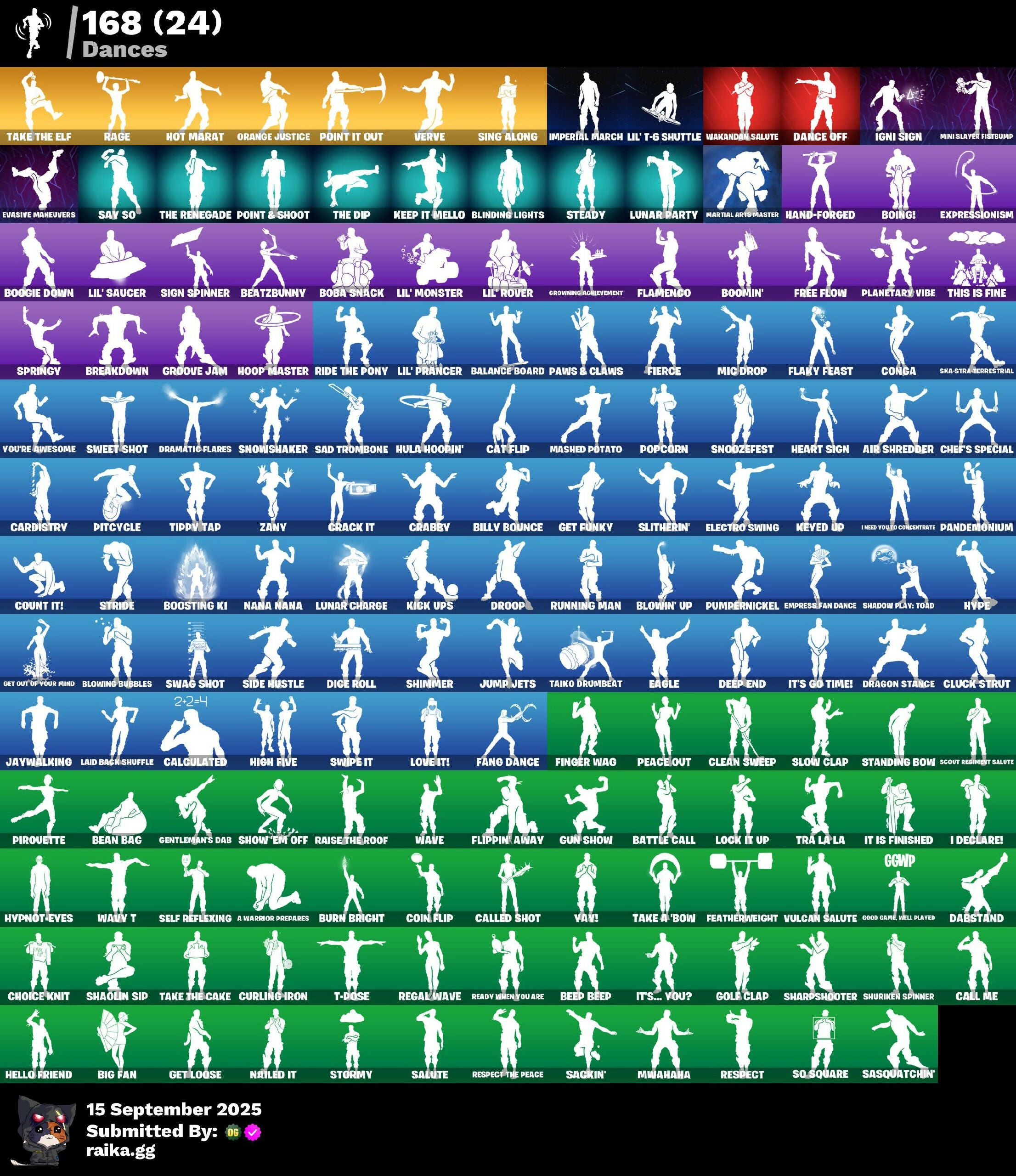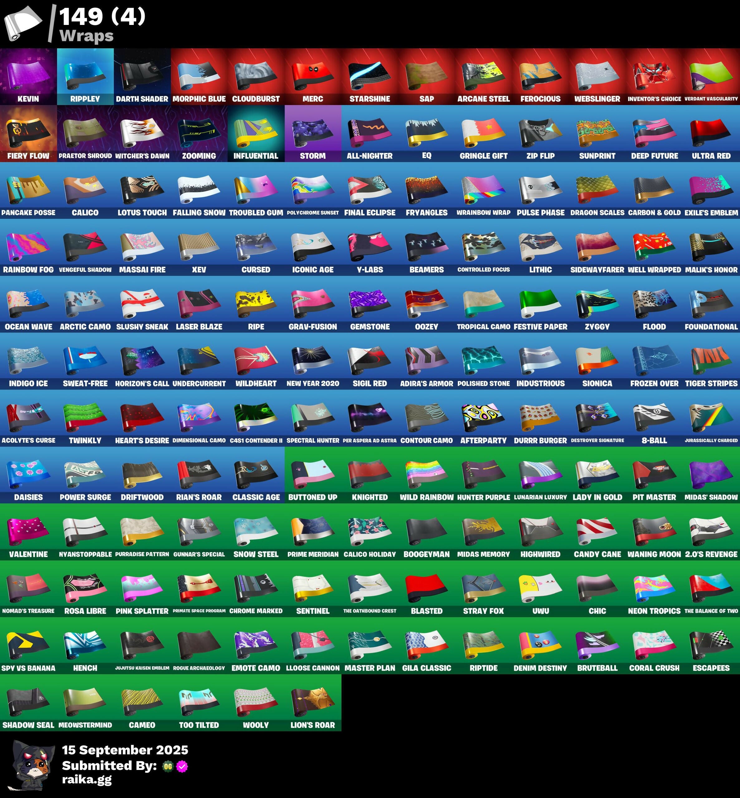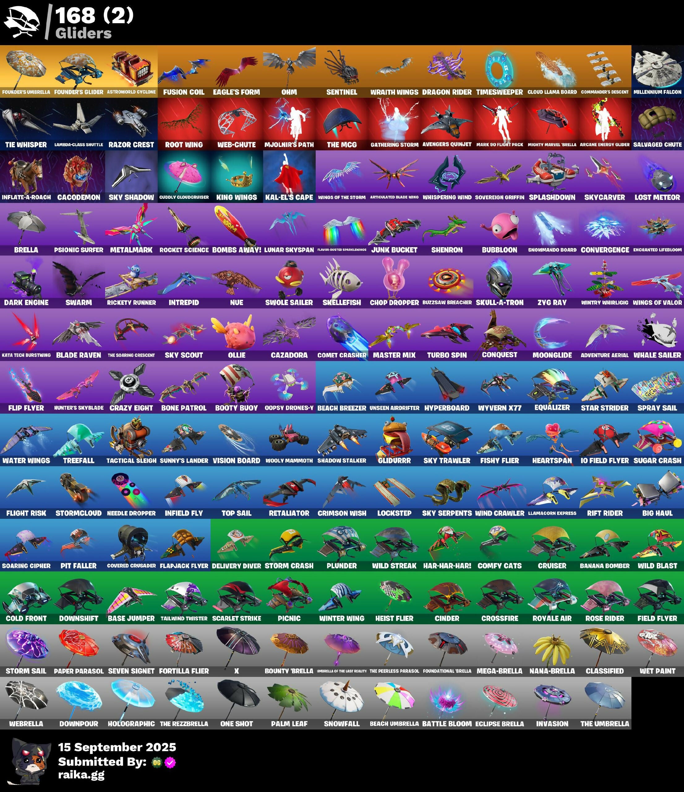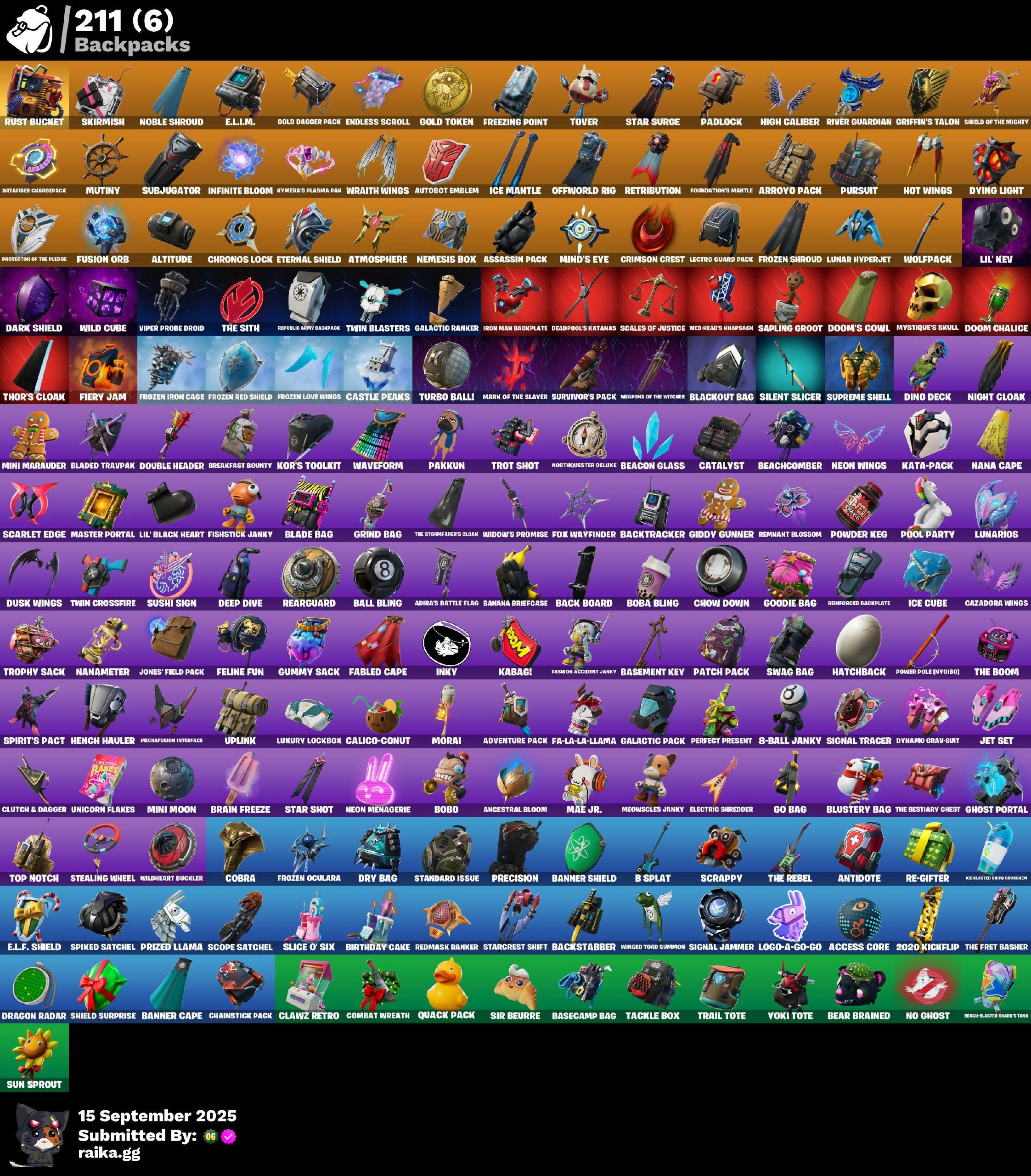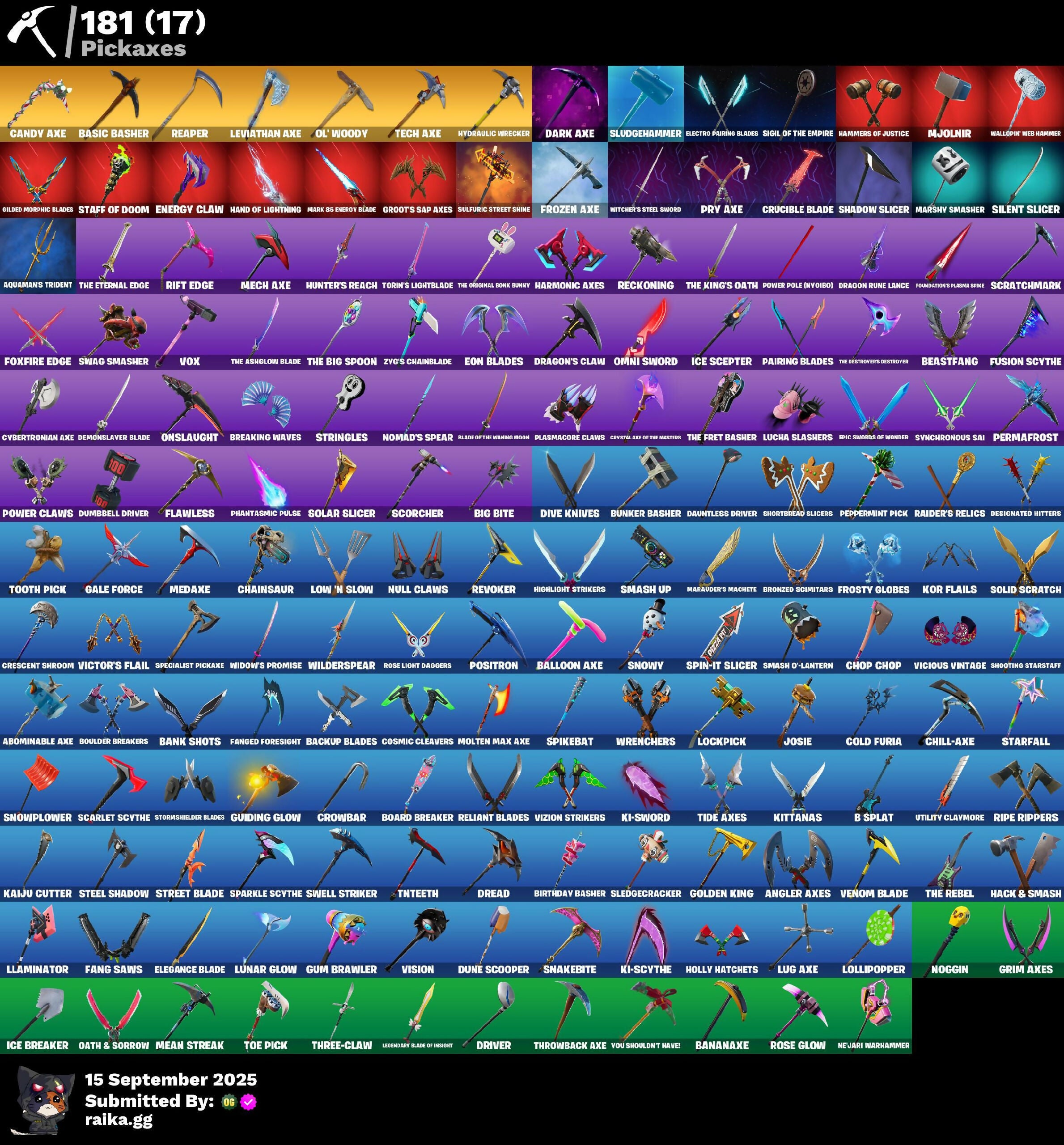 2.0's Revenge, 2020 Kickflip, 8-Ball, 8-Ball Janky, 8-Ball Vs Scratch, A Warrior Prepares, A.I.M., Abominable Axe, Access Core, Acolyte's Curse, Adira, Adira's Armor, Adira's Battle Flag, Adventure Aerial, Adventure Pack, Afterparty, Agent Jones, Agent Peely, Air Shredder, All-Nighter, Altitude, Ancestral Bloom, Angler Axes, Antidote, Antonia, Aquaman, Aquaman's Trident, Arcane Energy Glider, Arcane Steel, Arctic Adeline, Arctic Camo, Arroyo Pack, Articulated Blade Wing, Assassin Pack, Astro Antidote, Astro Jack, Astroworld Cyclone, Atmosphere, Aura, Autobot Emblem, Avengers Quinjet, B Splat, Back Board, Backstabber, Backtracker, Backup Blades, Balance Board, Ball Bling, Balloon Axe, Banana Bomber, Banana Briefcase, Bananaxe, Bank Shots, Banner Cape, Banner Shield, Base Jumper, Basecamp Bag, Basement Key, Basic Basher, Battle Bloom, Battle Call, Battlehawk, Beach Breezer, Beach Umbrella, Beach-Blasted Shark's Tail, Beachcomber, Beacon Glass, Beamers, Bean Bag, Bear Brained, Beastfang, Beatzbunny, Beep Beep, Big Bite, Big Fan, Big Haul, Billy Bounce, Birthday Basher, Birthday Cake, Blackheart, Blackout Bag, Blade Bag, Blade Of The Waning Moon, Blade Raven, Bladed Travpak, Blasted, Blinding Lights, Blizzabelle, Blowin' Up, Blowing Bubbles, Blustery Bag, Board Breaker, Boba Bling, Boba Snack, Bobo, Boing!, Bombs Away!, Bone Patrol, Boogeyman, Boogie Down, Boomin', Boosting KI, Booty Buoy, Boulder Breakers, Bounty 'Brella, Brain Freeze, Breakdown, Breakfast Bounty, Breaking Waves, Breakpoint, Brella, Brite Bomber, Bronzed Scimitars, Bruteball, Bubbloon, Bunker Basher, Bunker Jonesy, Burn Bright, Buttoned Up, Buzzsaw Breacher, C4S1 Contender II, Cacodemon, Calamity, Calculated, Calico, Calico Holiday, Calico-Coconut, Call Me, Called Shot, Cameo, Cameo Vs Chic, Candy Axe, Candy Cane, Carbide, Carbon & Gold, Cardistry, Castle Peaks, Cat Flip, Catalyst, Cazadora, Cazadora Wings, Chainsaur, Chainstick Pack, Charlotte, Chef's Special, Chic, Chill-Axe, Choice Knit, Chop Chop, Chop Dropper, Chow Down, Chrome Marked, Chronos Lock, Cinder, Classic Age, Classified, Clawz Retro, Clean Sweep, Cloud Llama Board, Cloudburst, Cluck Strut, Clutch & Dagger, Cobalt, Cobra, Codename E.L.F., Coin Flip, Cold Front, Cold Furia, Combat Wreath, Comet Crasher, Comfy Cats, Commander's Descent, Conga, Conquest, Constructor, Contour Camo, Controlled Focus, Convergence, Coral Crush, Cosmic Cleavers, Count It!, Covered Crusader, Cozy Commander, Crabby, Crack It, Crazy Eight, Crescent Shroom, Crimson Crest, Crimson Wish, Crossfire, Crowbar, Crowning Achievement, Crucible Blade, Cruiser, Crystal, Crystal Axe Of The Masters, Cuddly Cloudcruiser, Curling Iron, Cursed, Cybertronian Axe, DJ Yonder, Dabstand, Daisies, Dance Off, Dark Axe, Dark Engine, Dark Jonesy, Dark Red Knight, Dark Shield, Dark Wild Card, Darth Shader, Darth Vader, Datafiber Charge Pack, Dauntless Driver, Deadpool, Deadpool's Katanas, Deep Dive, Deep End, Deep Future, Delivery Diver, Demi, Demonslayer Blade, Denim Destiny, Designated Hitters, Destroyer Signature, Dice Roll, Dimensional Camo, Dino Deck, Dire, Dive Knives, Doctor Doom, Doggo, Doom Chalice, Doom Slayer, Doom's Cowl, Double Header, Downpour, Downshift, Dragon Radar, Dragon Rider, Dragon Rune Lance, Dragon Scales, Dragon Stance, Dragon's Claw, Dramatic Flares, Dread, Drift, Driftwood, Driver, Droop, Dry Bag, Dumbbell Driver, Dune Scooper, Durrr Burger, Dusk, Dusk Wings, Dusty, Dying Light, Dynamo Grav-Suit, E.L.F. Shield, E.L.I.M., Eagle, Eagle's Form, Eclipse Brella, Electric Shredder, Electro Pairing Blades, Electro Swing, Elegance Blade, Ember, Emote Camo, Empress Fan Dance, Enchanted Lifebloom, Endless Scroll, Energy Claw, Enforcer, Eon Blades, Epic Swords Of Wonder, Eq, Equalizer, Era, Escapees, Eternal Knight, Eternal Shield, Evasive Maneuvers, Evie, Exile's Emblem, Expressionism, Fa-La-La-Llama, Fabio Sparklemane, Fable, Fabled Cape, Fade, Falling Snow, Fang Dance, Fang Saws, Fanged Foresight, Fashion Accident Janky, Featherweight, Feline Fun, Ferocious, Festive Paper, Field Flyer, Fierce, Fiery Flow, Fiery Jam, Final Eclipse, Finger Wag, Fish Thicc, Fishstick Janky, Fishy Flier, Flaky Feast, Flamenco, Flapjack Flyer, Flawless, Flight Risk, Flip Flyer, Flippin' Away, Flood, Fortilla Flier, Foundation's Mantle, Foundation's Plasma Spike, Foundational, Foundational 'Brella, Founder's Glider, Founder's Umbrella, Fox Wayfinder, Foxfire Edge, Free Flow, Freezing Point, Frost Squad, Frostbite, Frosty Globes, Frozen Axe, Frozen Fishstick, Frozen Iron Cage, Frozen Love Ranger, Frozen Love Wings, Frozen Nog Ops, Frozen Oculora, Frozen Over, Frozen Raven, Frozen Red Knight, Frozen Red Shield, Frozen Shroud, Fryangles, Fusion, Fusion Coil, Fusion Orb, Fusion Scythe, Galactic Pack, Galactic Ranker, Gale Force, Gathering Storm, Gear Specialist Maya, Gemstone, Gentleman's Dab, Geralt of Rivia, Get Funky, Get Loose, Get Out of Your Mind, Ghost Portal, Ghoul Trooper, Giddy Gunner, Giddy-Up, Gila Classic, Gilded Morphic Blades, Ginger Gunner, Glidurrr, Go Bag, Goku Black, Gold Brutus, Gold Dagger Pack, Gold Midas, Gold Token, Golden King, Golf Clap, Goodie Bag, Grav-Fusion, Griffin's Talon, Grim Axes, Grind Bag, Gringle Gift, Groot, Groot's Sap Axes, Groove Jam, Guff Gringle, Guggimon, Guiding Glow, Gum Brawler, Gumbo, Gummy Sack, Gun Show, Gunnar's Special, Hack & Smash, Hammers Of Justice, Hand Of Lightning, Hand-Forged, Har-Har-Har!, Harlowe, Harmonic Axes, Hatchback, Haven, Heart Sign, Heart's Desire, Heartspan, Heist Flier, Hello Friend, Helsie, Hench, Hench Hauler, Heron Stance Hero, High Caliber, High Five, High Hoops, Highlight Strikers, Highwire, Highwired, Holly Hatchets, Holographic, Hoop Master, Horizon’s Call, Hot Marat, Hot Wings, Hula Hoopin', Hunter Purple, Hunter's Reach, Hunter's Skyblade, Huntress, Hybrid, Hydraulic Wrecker, Hype, Hyperboard, Hypnot-Eyes, I Declare!, IO Field Flyer, Ice Breaker, Ice Cube, Ice Mantle, Ice Scepter, Ice-Blasted Snow Cruncher, Iconic Age, Igni Sign, Imani,