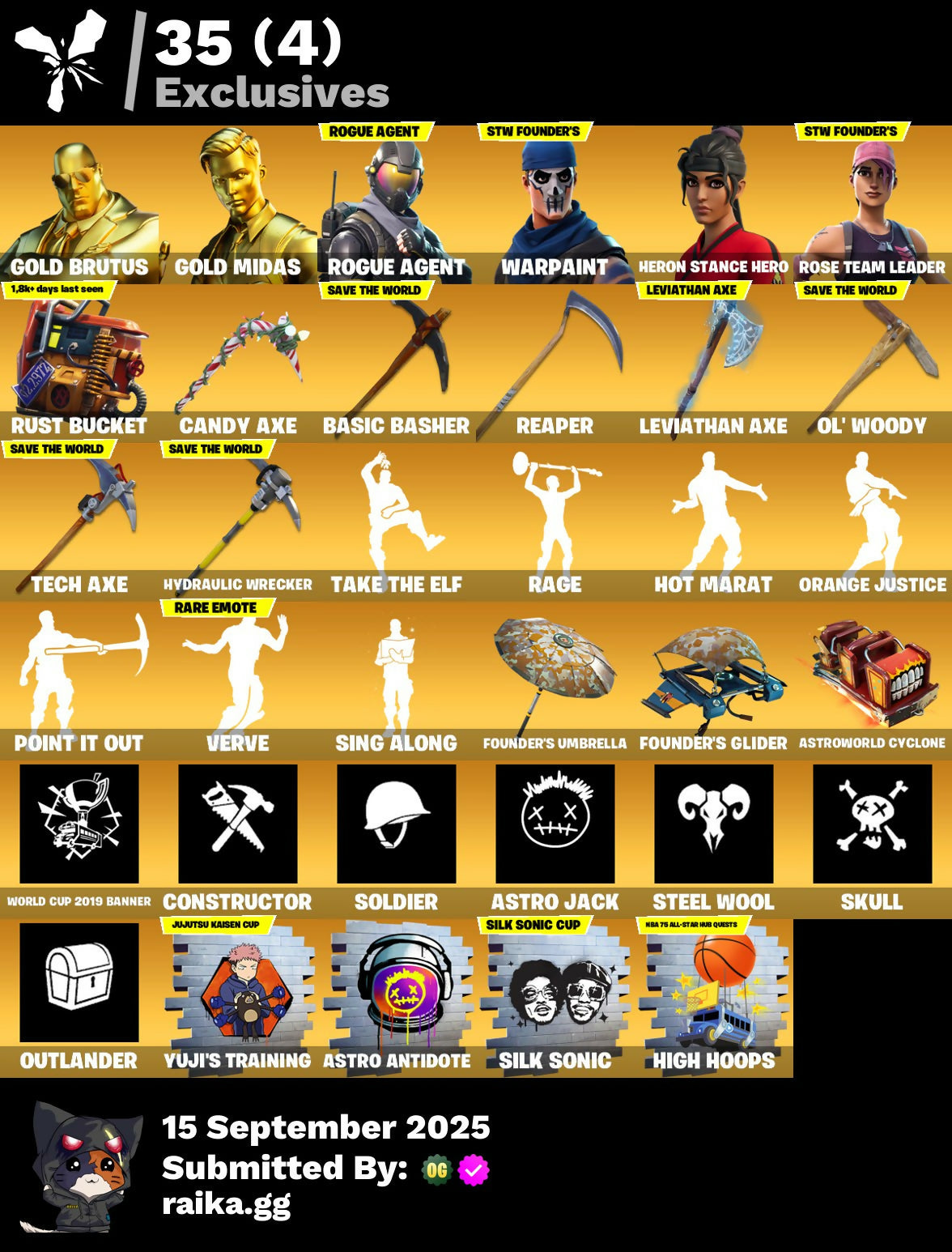 [PC/PSN/XBOX/NITTENDO] 214 skins | OG STW | Gold Brutus | Gold Midas | Rogue Agent | Heron Stance Hero | Carbide | Enforcer | The Ageless | Joey | The Visitor | Fusion | 2270 VB