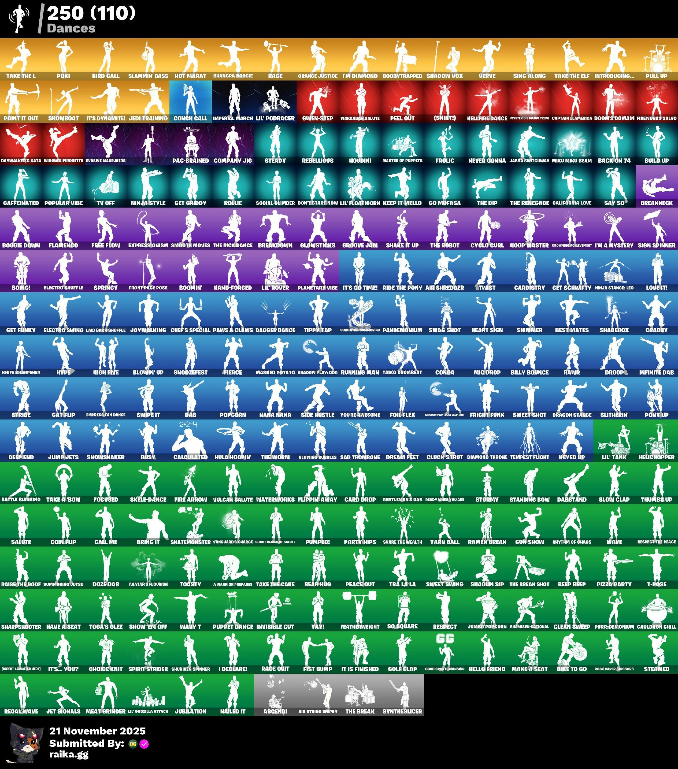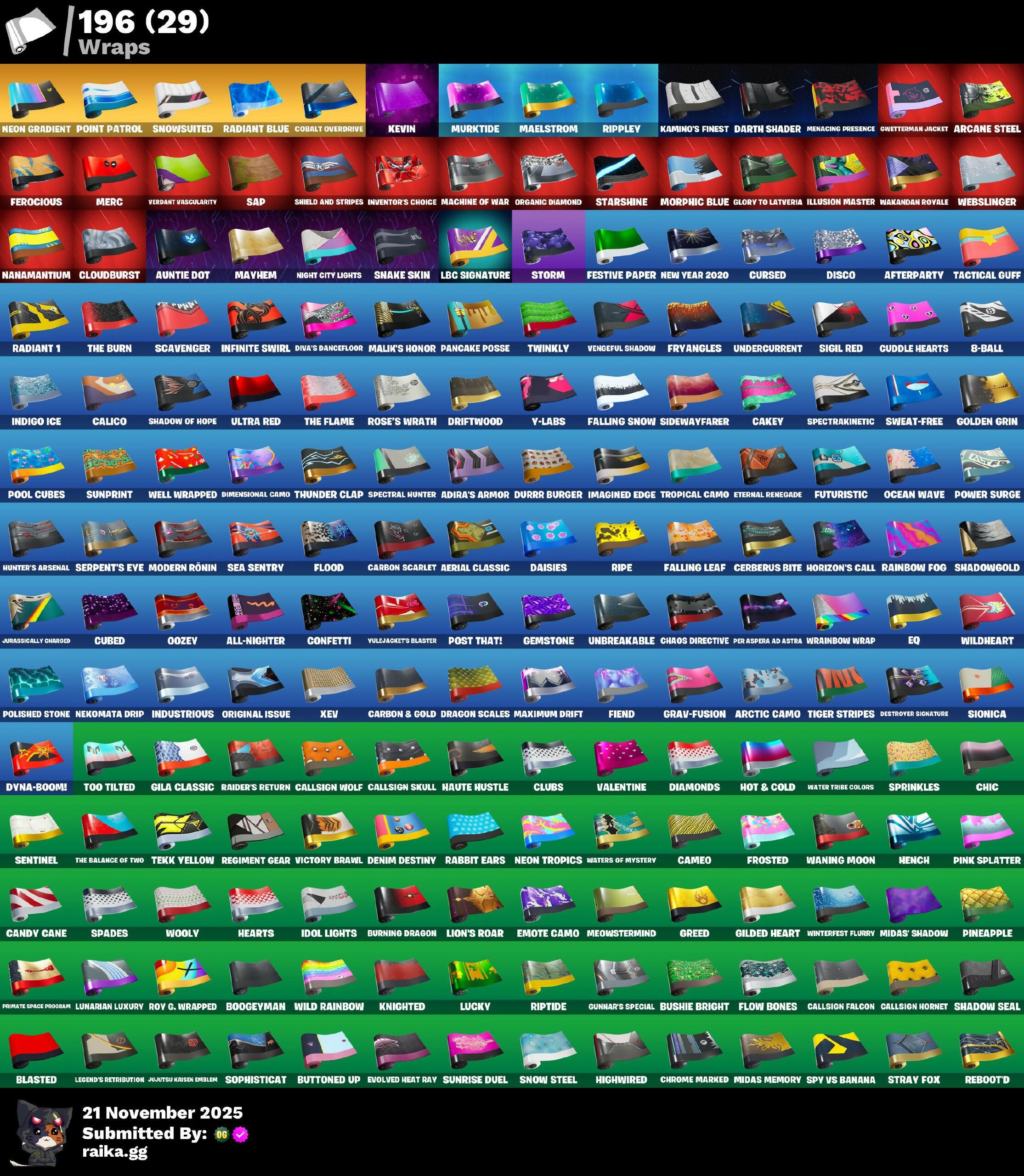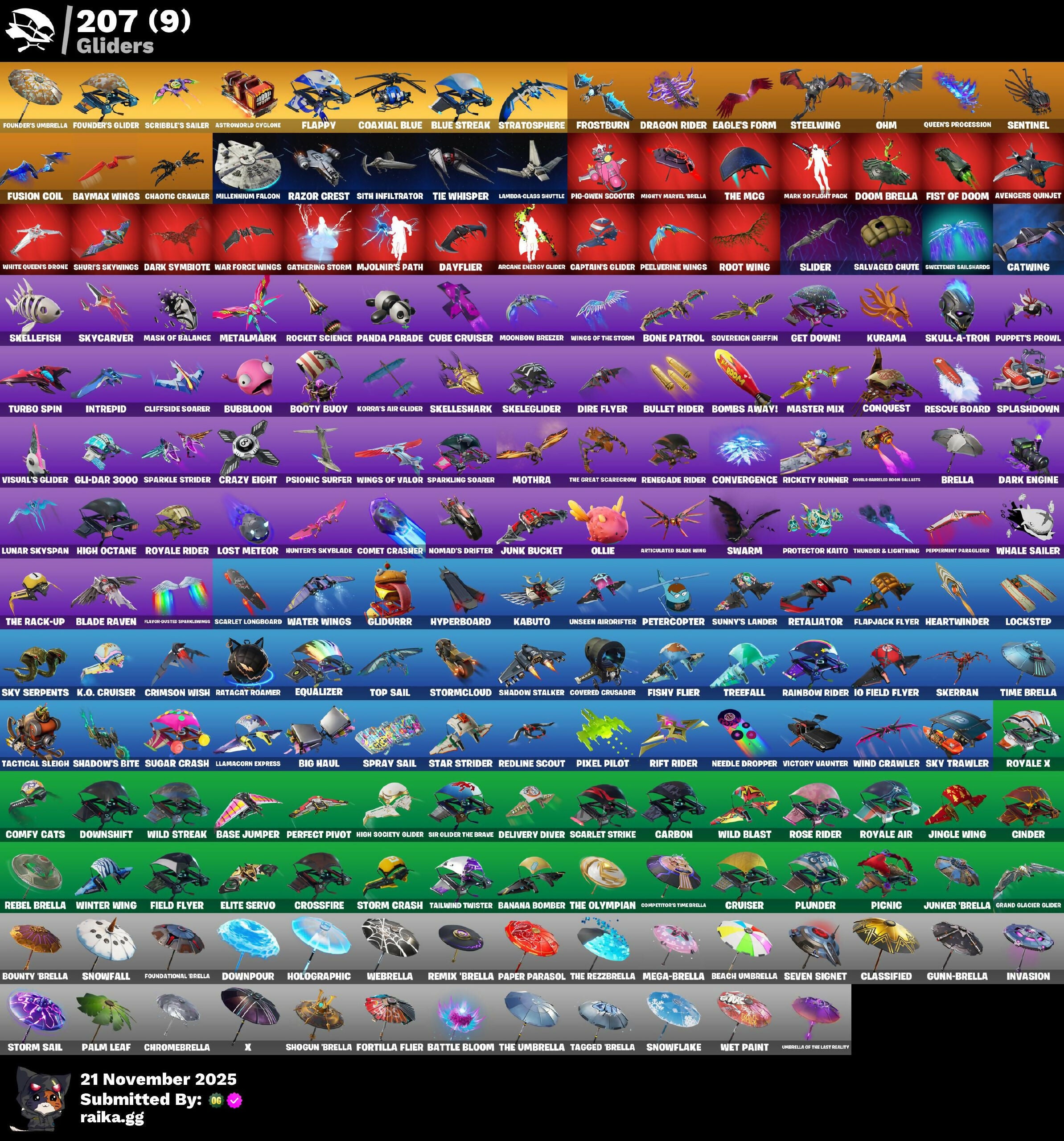 (Snikt!), 1-Ball, 10 Field Flyer, 18's Kama, 2020 Kickflip, 501st Trooper, 6-Carat Cutter, 7 Rings Smasher, 7th Battalion Trooper, 8-Ball, 8-Ball Janky, 8-Ball Vs Scratch, 999 Knives, A Warrior Prepares, A.I.M., AWR Pack, Abominable Axe, Adira, Adira's Battle Flag, Adira’s Armor, Adventure Pack, Aerial Assault Bomber, Aerial Classic, Afterparty, Agent Jones, Agent Peely, Air Shredder, All-Nighter, All-Weather Extractor, Altitude, Ancestral Bloom, Andy Fangerson, Angler Axes, Ankhoa's Clone Trooper, Antidote, Aphrodite, Apocalypse Shroud, Aquaman, Aquaman's Trident, Arcane Energy Glider, Arcane Steel, Arctic Camo, Ariana Grande, Arroyo Pack, Articulated Blade Wing, Ascend!, Astro, Astro Antidote, Astro Jack, Astroworld Cyclone, Atmosphere, Atom Eve, Atom Eye Emblem, Atom Eye Emblem Cape, Auntie Dot, Auto Clutch, Avatar Cycle, Avatar's Flourish, Avengers Quinjet, Axecalibur, Back Bloom, Back Board, Back On 74, Back-Mounted Bones Jaw, Back-Mounted Burro Toner, Backtracker, Bad Joke, Ball Bling, Balloon Axe, Bamboo-Tana, Banana Bomber, Banana Briefcase, Bananaxe, Bank Shots, Base Jumper, Basecamp Bag, Basement Key, Basic Basher, Battle Blessing, Battle Bloom, Battlehawk, Baymax Wings, Beach Bomber, Beach Umbrella, Beachcomber, Bear Hug, Beastfang, Beep Beep, Best Mates, Bhangra Boogie, Big Haul, Bike To Go, Billy Bounce, Bird Call, Birthday Cake, Birthday Slice, Blackheart, Blade, Blade Bag, Blade Raven, Blades Of Light, Blades Of The Howling Moon, Blasted, Blaze, Blowin' Up, Blowing Bubbles, Blue Shift, Blue Squire, Blue Streak, Blue Striker, Blue Team Leader, Blustery Bag, Bobo, Bogey Bag, Boing!, Bolt Blades, Bomb Bag, Bomb Bouquet, Bombs Away!, Bone Brief, Bone Patrol, Bones, Boobytrapped, Boogeyman, Boogie Down, Boomin', Booty Buoy, Boulder Breakers, Bounty 'Brella, Breakdown, Breakfast Bounty, Breaking Waves, Breakneck, Breakshore Trident, Breathless Blades, Brella, Brilliant Cutters, Bring It, Brite Board, Brite Bomber, Broken Path Make Excited, Bubbloon, Build Up, Bullet Rider, Bunker Basher, Bunker Jonesy, Burger Mart Bag, Burning Dragon, Bushie Bright, Busy, Butcher's Knife, Butcher's Tools, Buttoned Up, Caffeinated, Cake Clobberer, Cake!, Cakey, Calamity, Calculated, Calico, California Love, Call Me, Callsign Falcon, Callsign Hornet, Callsign Skull, Callsign Wolf, Cameo, Cameo Vs Chic, Candy Cane, Captain America's Shield, Captain America's Shield & Pickaxe, Captain F.I. America, Captain Jones, Captain's Glider, Carbide, Carbon, Carbon & Gold, Carbon Commando, Carbon Fiber Holster, Carbon Pack, Carbon Scarlet, Card Drop, Cardistry, Carnage, Carnage Cleaver, Cassidy Quinn, Catalyst, Catflip, Catwing, Cauldron Chill, Celebratory Slice, Cerberus, Cerberus Bite, Chainsaur, Chainstick Pack, Chaos Directive, Chaos Director, Chaotic Crawler, Charlotte, Chef's Special, Chic, Choice Knit, Chrome Marked, Chromebrella, Cinder, Classified, Claw-Chucks, Clawbox, Clawz Retro, Clean Sweep, Cliffside Soarer, Clone Trooper, Cloud Striker, Cloudburst, Clubs, Cluck Strut, Coaxial Blue, Cobalt Overdrive, Cobra, Coin Flip, Cold Furia, Combat Cue, Combat Wreath, Comet Crasher, Comfy Cats, Company Jig, Conch Call, Confetti, Conga, Conquest, Constructor, Controller, Convergence, Coruscant Guard, Cosmic Cleavers, Covered Crusader, Cozy Conch, Crabby, Crazy Eight, Crescent Shroom, Crimson Polestar, Crimson Wish, Crossfire, Crowbar, Crown Machinist, Cruiser, Crystal Fang, Crystal Llama Backstabber, Cube Cruiser, Cubed, Cubic Vortex, Cuddle Hearts, Cuphead's Katanas, Cursed, Cursed Marionette, Cyclo Curl, Cymitar, D-O-Double G, DJ Yonder, Dab, Dabstand, Dagger Dance, Daigo, Daigo's Claws, Daisies, Dark Doggo, Dark Engine, Dark Matter, Dark Symbiote, Dark Voyager, Dark Wings, Darth Maul, Darth Shader, Darth Vader, Datafiber Charge Pack, Dayflier, Daywalker's Kata, De-Rezz De-Stroyer, Deadpool, Deadpool's Katanas, Deep Dive, Deep End, Delivery Diver, Demi, Demogorgon, Demon Slayer Blade, Demon Wind Shuriken, Denim Destiny, Destroyer Signature, Diamond Diva, Diamond Throne, Diamondclaw Picker, Diamonds, Dimensional Camo, Dino Deck, Dire, Dire Flyer, Disco, Diva’s Dancefloor, Dive Knives, Doctor Doom, Dogg Treat, Don't Start Now, Doom, Doom Brella, Doom Chalice, Doom's Cloak, Doom's Cowl, Doom's Domain, Downpour, Downshift, Doze Dab, Dragon Rider, Dragon Rune Lance, Dragon Scales, Dragon Stance, Dragon's Claw, Dragoncrest, Dread, Dream Feet, Dreamer's Two-Ghut, Drift, Driftwood, Droop!, Duelists Foil, Durrr Burger, Durrr Taisho, Dusk, Dusk Wings, Dying Light, Dyna-Boom!, Dynamo Grav-Suit, Dynamo TNTina, E.L.I.M., EQ, Eagle's Form, Earth Rumble Belt, Electro Pairing Blades, Electro Shuffle, Electro Swing, Elevation, Elite Agent, Elite Servo, Ember, Ember Pick, Emma Frost, Emote Camo, Enforcer, Eon Blades, Epic Blade Of Floof, Epic Swords Of Wonder, Equalizer, Eren Jaeger, Eternal Fortune, Eternal Knight, Eternal Ranker, Eternal Renegade, Eternal Shield, Eternal Voyager, Eva, Evasive Maneuvers, Eve's Cape, Evie, Evolved Heat Ray, Expression Dance, Expressionism, FM Diamond, Fabio Sparklemane, Fable, Fabled Cape, Fade, Falling Leaf, Falling Snow, Fang Saws, Fang of the Blood Moon, Featherweight, Felina, Felina's Claw, Feline Dagger, Feline Fun, Ferocious, Festival Phaedra, Festive Paper, Field Flyer, Fiend, Fiendish Wand, Fierce, Fire Arrow, Firestarter, Fireworks Salvo, First Order, Fishstick Janky, Fishy Flier, Fist Bump, Fist of Doom, Fixer, Flamenco, Flapjack Flyer, Flappy, Flathead, Flawless, Flippin' Away, Flood, Flow Bones, Flux Silvera, Focused, Foil Flex, Fortilla Flier, Foundational 'Brella, Founder's Glider, Founder's Umbrella, Fox Wayfinder, Foxfire Edge, Free Flow, Fresh Fish, Friggle Funk, Frolic, Front-Page Pose, Frost Squad, Frostburn, Frosted, Frosted Frets, Frosty Globes, Frozen Axe, Frozen Shroud, Fry Angles, Fusion, Fusion Coil, Fusion Orb, Fusion Scythe, Future Relic Scythe, Futuristic, G-Funk '93, Gale Force, Gameplan, Gathering Storm, Gear Specialist Maya, Gemstone, Gentleman's Dab, Get D