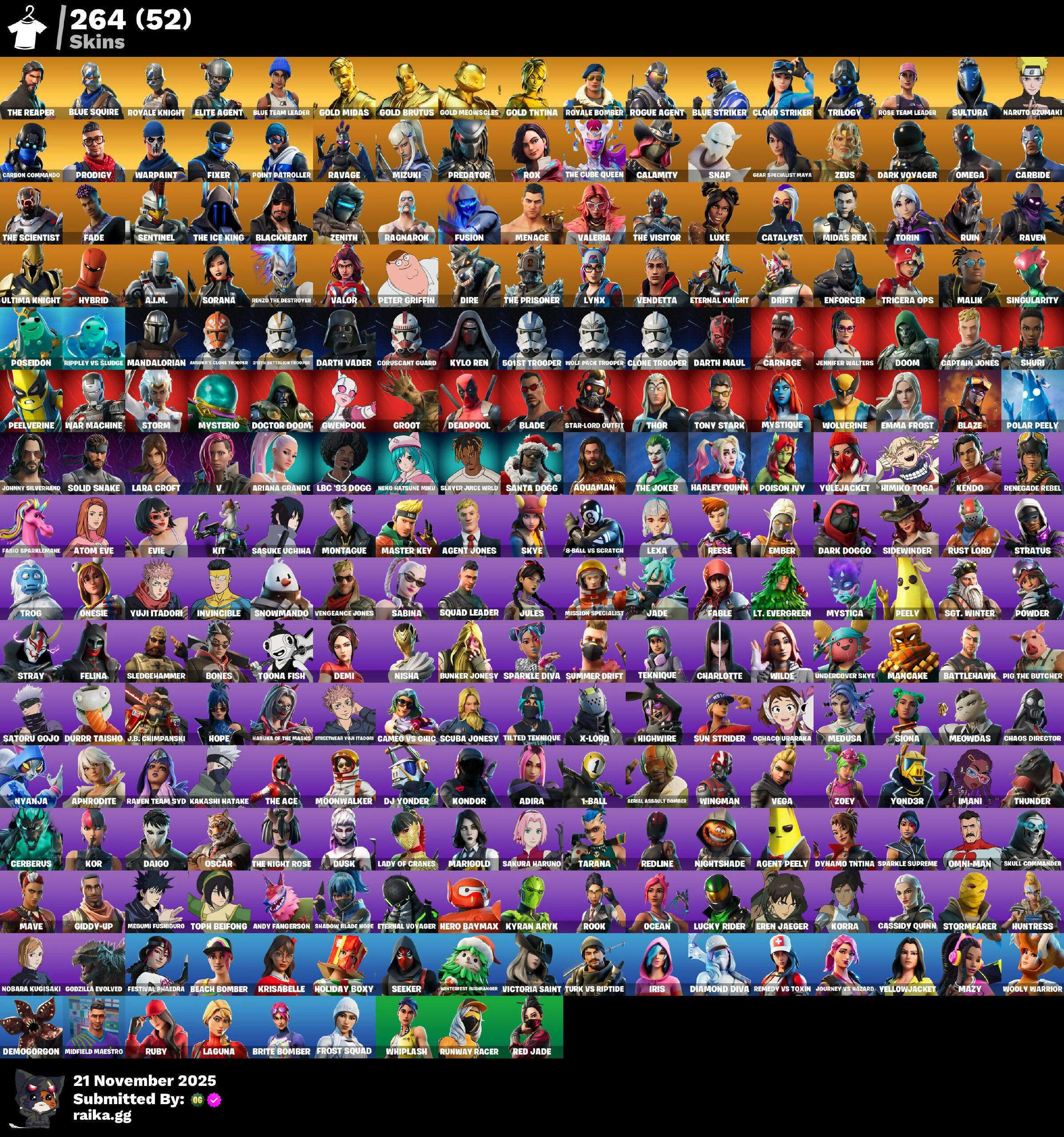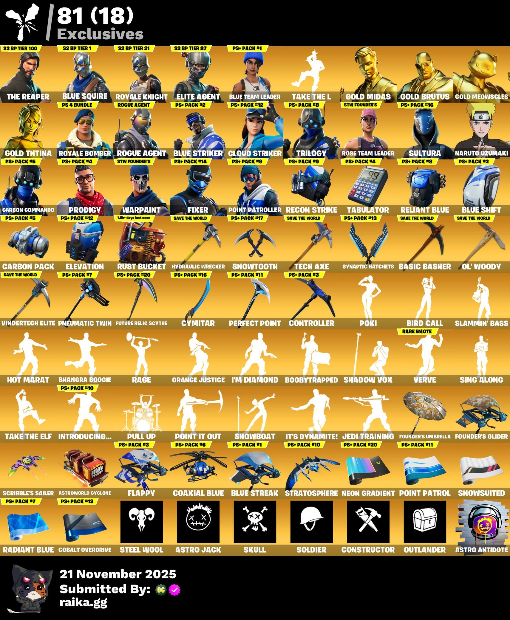 [PC/PSN/XBOX/NITTENDO] 264 skins | OG STW | The Reaper | Blue Squire | Royale Knight | Elite Agent | Blue Team Leader | Gold Midas | Gold Brutus | Gold Meowscles | 250 VB