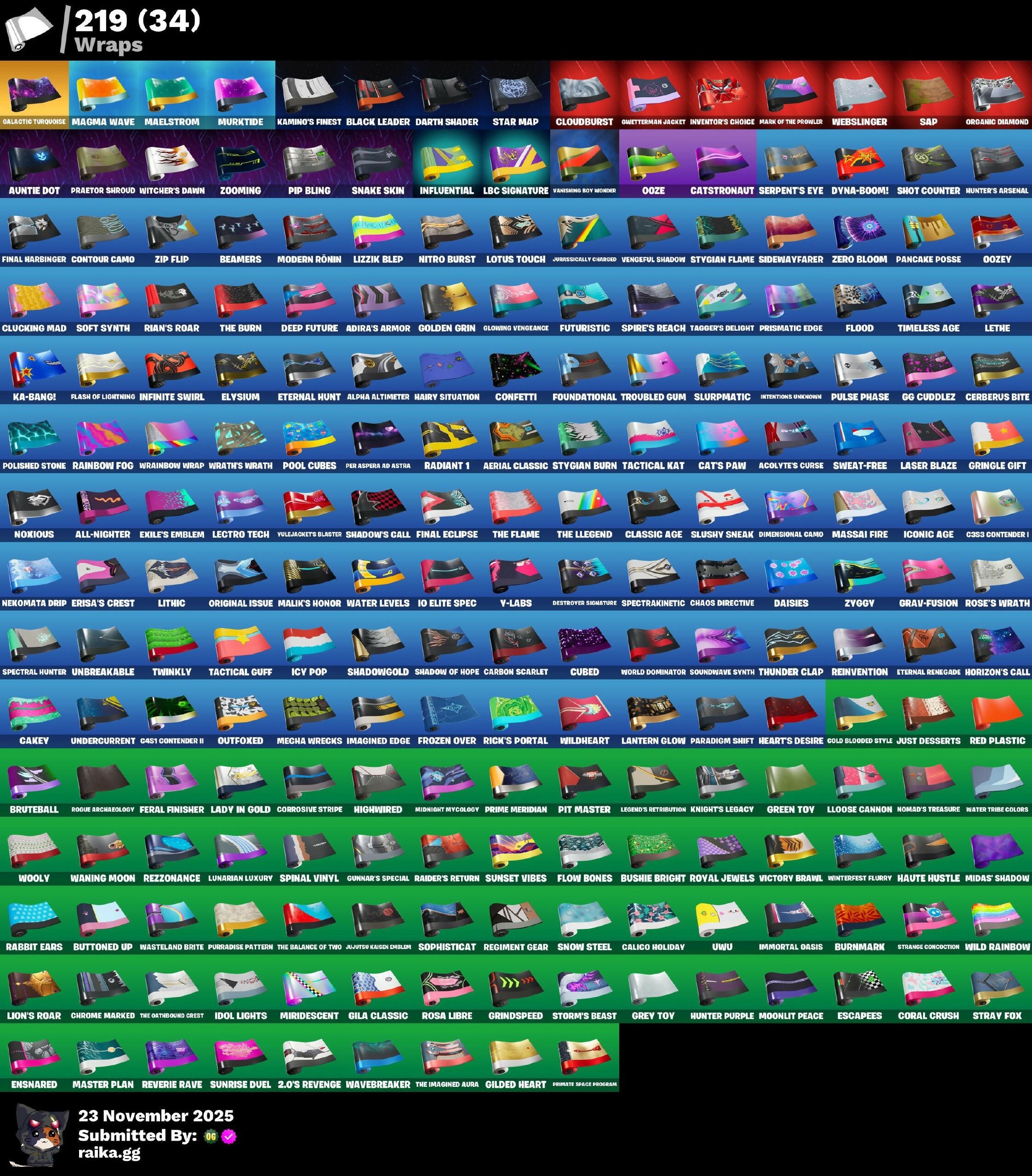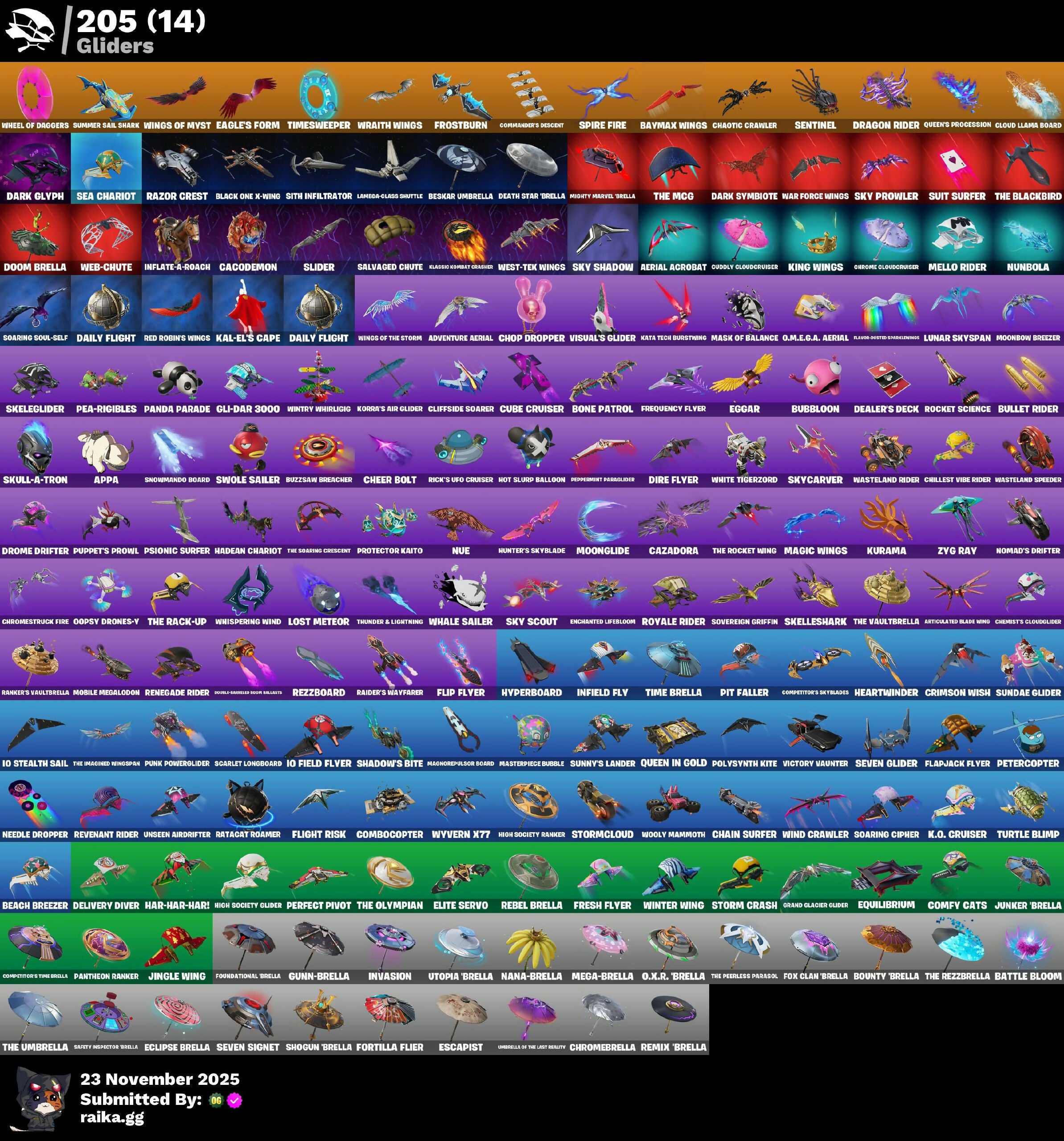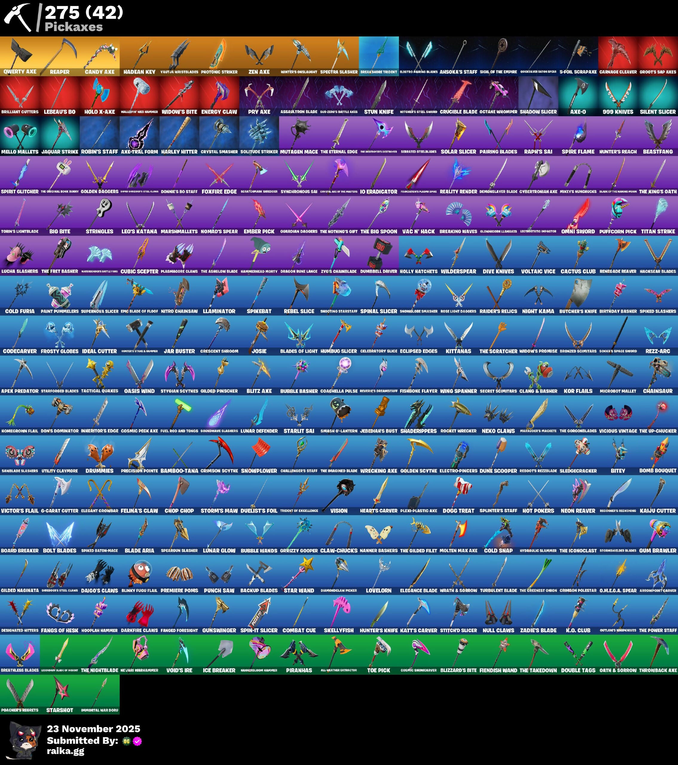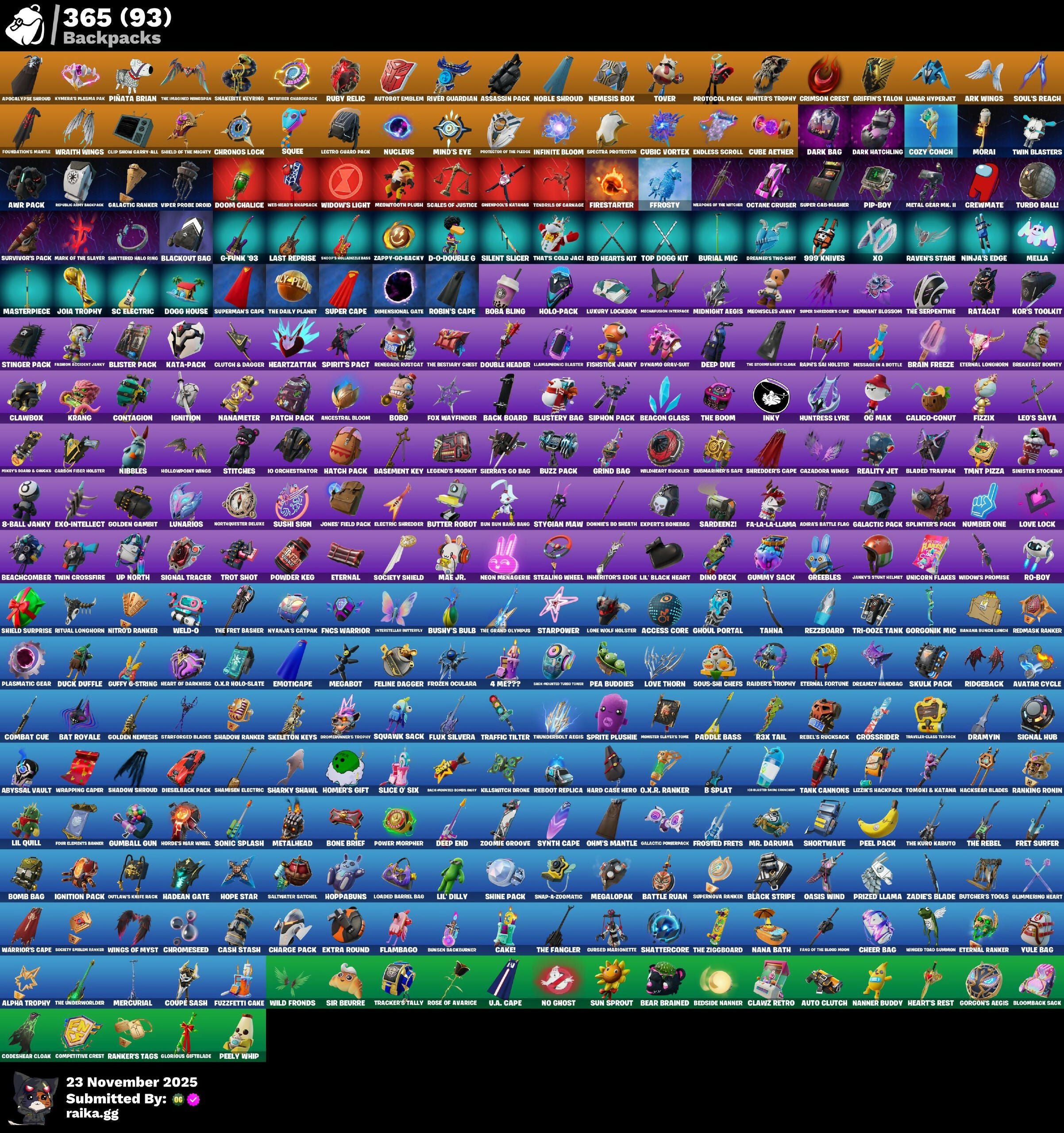 1-Ball, 10 Elite Spec, 2.0's Revenge, 4 Me???, 6-Carat Cutter, 8-Ball Janky, 9093 Knives, 999 Knives, A Warrior Prepares, AWR Pack, Abyssal Vault, Access Core, Acolyte's Curse, Adira, Adira's Armor, Adira's Battle Flag, Adventure Aerial, Aerial Acrobat, Aerial Classic, Agent Jones, Ahsoka Tano, Ahsoka's Staff, Airphorian, Alias, All-Nighter, All-Weather Extractor, Alli, Alpha Altimeter, Alpha Trophy, Ancestral Bloom, Andromeda, Andy Fancerson, Antonia, Apex Predator, Aphrodite, Apocalypse Sloth, Appa, Arcane Research, Arctic Adeline, Ares, Ark, Ark Wings, Arrowpoint Carver, Artemis, Articulated Blade Wing, Ascend!, Assassin Pack, Assault Trooper, Assaultron Blade, Auntie Dot, Aura, Auto Clutch, Autobot Emblem, Avatar Cycle, Avatar's Flourish, Aw, Shucks., Axe-O, Axe-Tral Form, Ayla Winn, Azarath Metrion Zinthos, B-Splat, Back Board, Back Mounted Bones Lucky, Back Mounted Turbo Timer, Backlash, Backup Blades, Balance Board, Bamboo-Tana, Banana Bunny Bone, Baron's Hoard, Basement Key, Bat Royale, Battle Bloom, Battle Call, Battle Prep, Battle Prep: Super, Battle Ruan, Baymax Wings, Beach Breezer, Beach Jules, Beachcomber, Beacon Glass, Beamers, Bean Bag, Bear Brained, Bear Hug, Beastfang, Beatzbunny, Bedside Nanner, Behold!, Beskar Umbrella, Big Bite, Big Fan, Billy Bounce, Bim Bam Boom, Birdarang Flourish, Birthday Basher, Bitey, Black Knight (Snow Set), Black Leader, Black One X-Wing, Black Stripe, Blackout Bag, Blade Aria, Blade of the Warning Song, Bladed Travpak, Blades of Light, Blaze, Blinky Fugu Flail, Blister Pack, Blitz Axe, Blizzabelle, Blizzard's Bite, Bloomback Sack, Bloomin' Bouquet, Blowin' Up, Blustery Bag, Board Breaker, Boba Bling, Boba Snack, Bobo, Bolt Blades, Bomb Bag, Bomb Bouquet, Bone Brief, Bone Patrol, Boogie Down, Boomin', Boots 'N' Cats, Bounty 'Brella, Brain Freeze, Breakfast Boonty, Breaking Waves, Breakshore Trident, Breathless Blades, Breezabelle, Brilliant Cutters, Brite Moves, Brite Raider, Bronzed Scimitars, Bruteball, Bubble Basher, Bubble Wands, Bubbloon, Budge, Build Up, Bullet Rider, Bun Bun Bang Bang, Burial Mic, Burn Bright, Burnmark, Bushie Bright, Bushy's Bulb, Butcher's Knife, Butcher's Tools, Butter Robot, Buttoned Up, Buzz Pack, Buzzsaw Breacher, Bytes, C3S3 Contender I, C4S1 Contender II, Cacodemon, Cactus Club, Cake!, Cakey, Calico Holiday, Calico-Conut, Called Shot, Camille, Candy Axe, Caper, Captain Ilamerica, Carbon Fiber Holster, Carbon Scarlet, Card Drop, Cardistry, Carnage, Carnage Cleaver, Cash Stash, Cat's Paw, Catstronaut, Cazadora, Cazadora Wings, Celebratory Slice, Cerberus, Cerberus Bite, Chain Surfer, Chainsaur, Challenger's Staff, Champion Kyra, Chaos Directive, Chaos Director, Chaos Origins, Chaotic Crawler, Charge Pack, Charlotte, Cheer Bag, Cheer Bolt, Chef's Special, Chemist's Cloudglider, Chicken Wing It, Chillest Vibe Rider, Chinpool's Katanas, Choice Knit, Chop Chop, Chop Dropper, Chrome Cloudcruiser, Chrome Marked, Chrome Punk, Chromebrella, Chromeseed, Chromestruck Fire, Chronos Lock, Chun-Li, Clang & Basher, Clara, Clark Kent, Classic Age, Claw-Chucks, Clawbox, Clawz Retro, Clean Sweep, Cliffside Soarer, Clip Show Carry-All, Clone Trooper, Cloud Llama Board, Cloudburst, Cluck, Clucking Mad, Clutch & Dagger, Coachella Pulse, Codecarver, Codeshear Cloak, Codsworth's Cleanup, Cold Blooded Style, Cold Furia, Cold Snap, Color Crush, Combat Cue, Combat Tech Jones, Combocopter, Comet, Comfy Cats, Commander’s Descent, Competitive Crest, Competitor's Skyblades, Competitor's Tine Brella, Conch Call, Confetti, Contagion, Contour Camo, Controller Crew, Coral Crush, Corrosive Stripe, Cosma, Cosmic Peck Axe, Cosmic Snowcarver, Count It!, Coupé Sash, Cozy Chomps, Cozy Conch, Crack It, Crescent Shroom, Crewmate, Crimson Crest, Crimson Polestar, Crimson Scythe, Crimson Wish, Crossrider, Crowning Achievement, Crucible Blade, Crystal, Crystal Axe of the Masters, Crystal Smasher, Cube Aether, Cube Cruiser, Cubed, Cubic Scepter, Cubic Vortex, Cuddly Cloudcruiser, Cursed Marionette, Cybertronian Axe, Cyclo Curl, D-D-Double G, Dagger Dance, Dahlia, Daigo, Daigo's Claws, Daily Flight, Daisies, Dark Bag, Dark Bomber, Dark Doggo, Dark Glyph, Dark Hatchling, Dark Symbiote, Dark Tricera Ops, Darkfire Claws, Darth Shader, Darth Vader, Datafied Chargpack, Deal 'Em Out, Dealer's Deck, Death Star 'Brella, Deep Dab, Deep Dive, Deep End, Deep Future, Delivery Diver, Demonslayer Blade, Designated Hitters, Destroyer Signature, Diamond Diva, Diamond Throne, Diamondclaw Picker, Dice Roll, Die With A Smile, Dieselback Pack, Dimensional Camo, Dimensional Gate, Dino Deck, Dire Flyer, Distraction Dance, Dive Knives, Dizzie, Do The Split, Doctor Slone, Dogg Treat, Doggo House, Don's Dominator, Donatello, Donnie's Bo Sheath, Donnie's Bo Staff, Doom Brella, Doom Chalice, Doom Slayer, Doombringer's Trophy, Double Header, Double Tags, Double Up, Double-Chargeled Scour Ballista, Doze Dab, Dragon Rider, Dragon Rune Lance, Dramatic Flares, Dramyin, Dreamer's Two-Shot, Dreamzy Handbag, Drome Drifter, Drummies, Duck Duffle, Duelist's Foil, Dumbbell Driver, Dune Scooper, Durrr Taisho, Dusk Knight, Dusty, Dyna-Boom!, Dynamo Grav-Suit, Dynamo TNTina, Eagles Form, Eclipse, Eclipse Brella, Eclipsed Edges, Eggar, Electric Shredder, Electro Daring Blades, Electro-Pincers, Elegance Blade, Elegant Crowbar, Elite Servo, Elysium, Ember Pick, Emoticap, Empress Fan Dance, Enchanted Lifebloom, Endless Scroll, Energy Claw, Ensnared, Epic Blade of Floof, Equilibrium, Era, Eren Jaeger, Erisa, Erisa's Crest, Escapees, Escapist, Eternal, Eternal Fortune, Eternal Hunt, Eternal Longhorn, Eternal Ranker, Eternal Renegade, Evasive Maneuvers, Evie, Evil Plan, Exile's Emblem, Exo-Intellect, Expert's Bonebag, Explorer Emilie, Expressionism, Extra Round, FFrosty, FNCS Warrior, Fa-La-La-Llama, Fabio Sparklemane, Fang Dance, Fang of the Blood Moon, Fanged Foresight, Fangs of Hesk, Fashion Accident Janky, Felina, Felina's Claw, Feline Dagger, Feral Finisher, Fiendish Wand, Final Eclipse, Final Ha