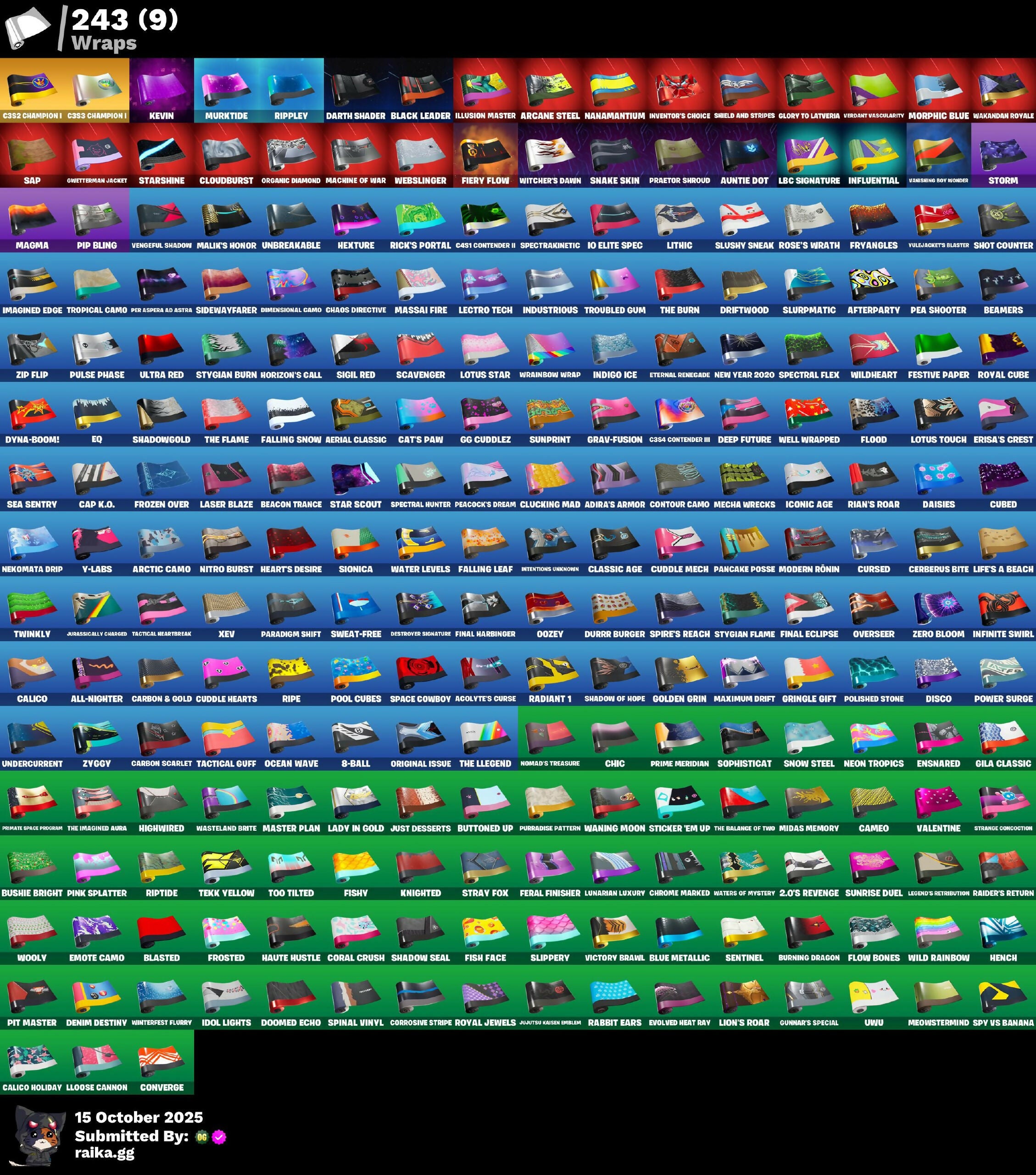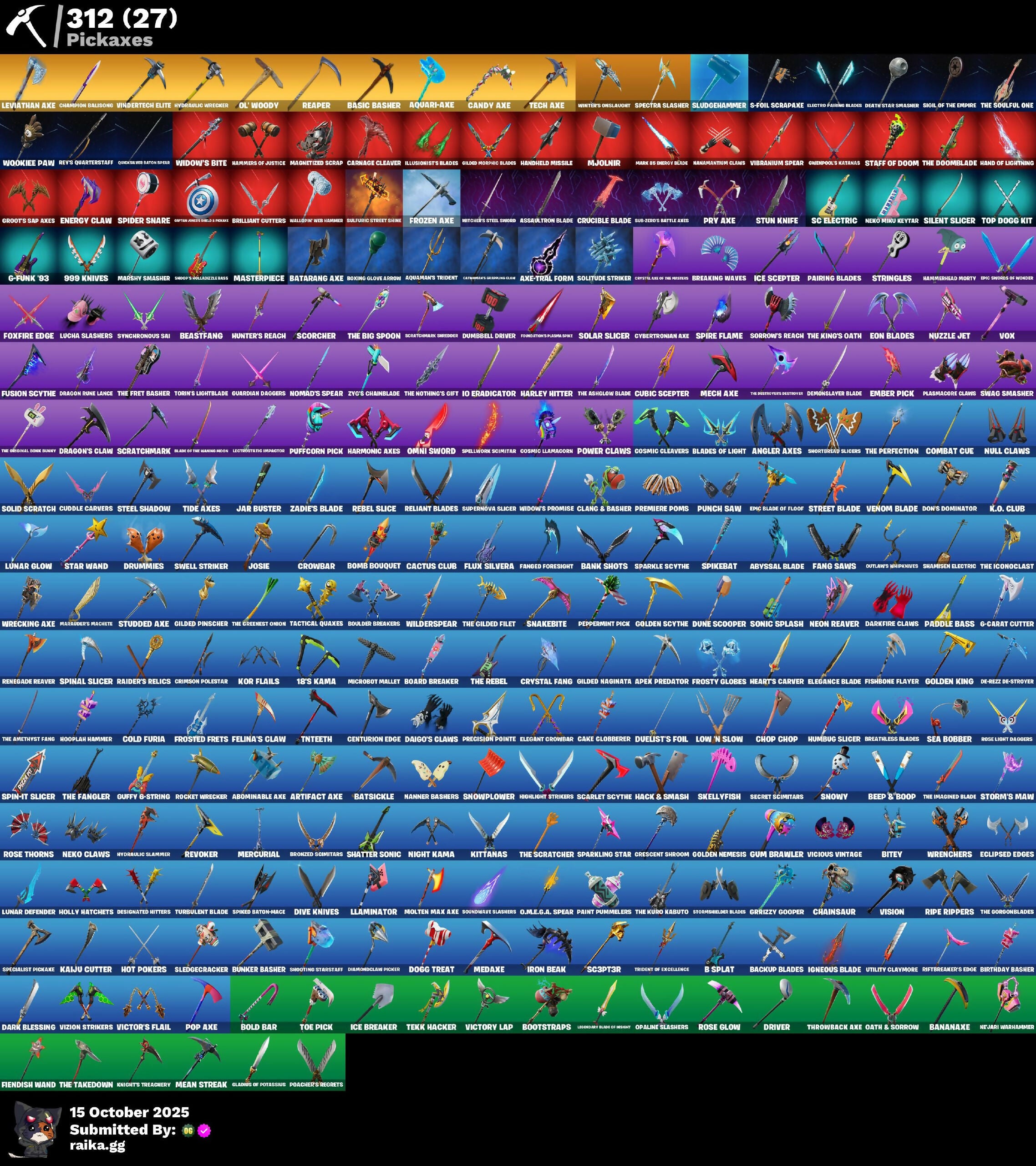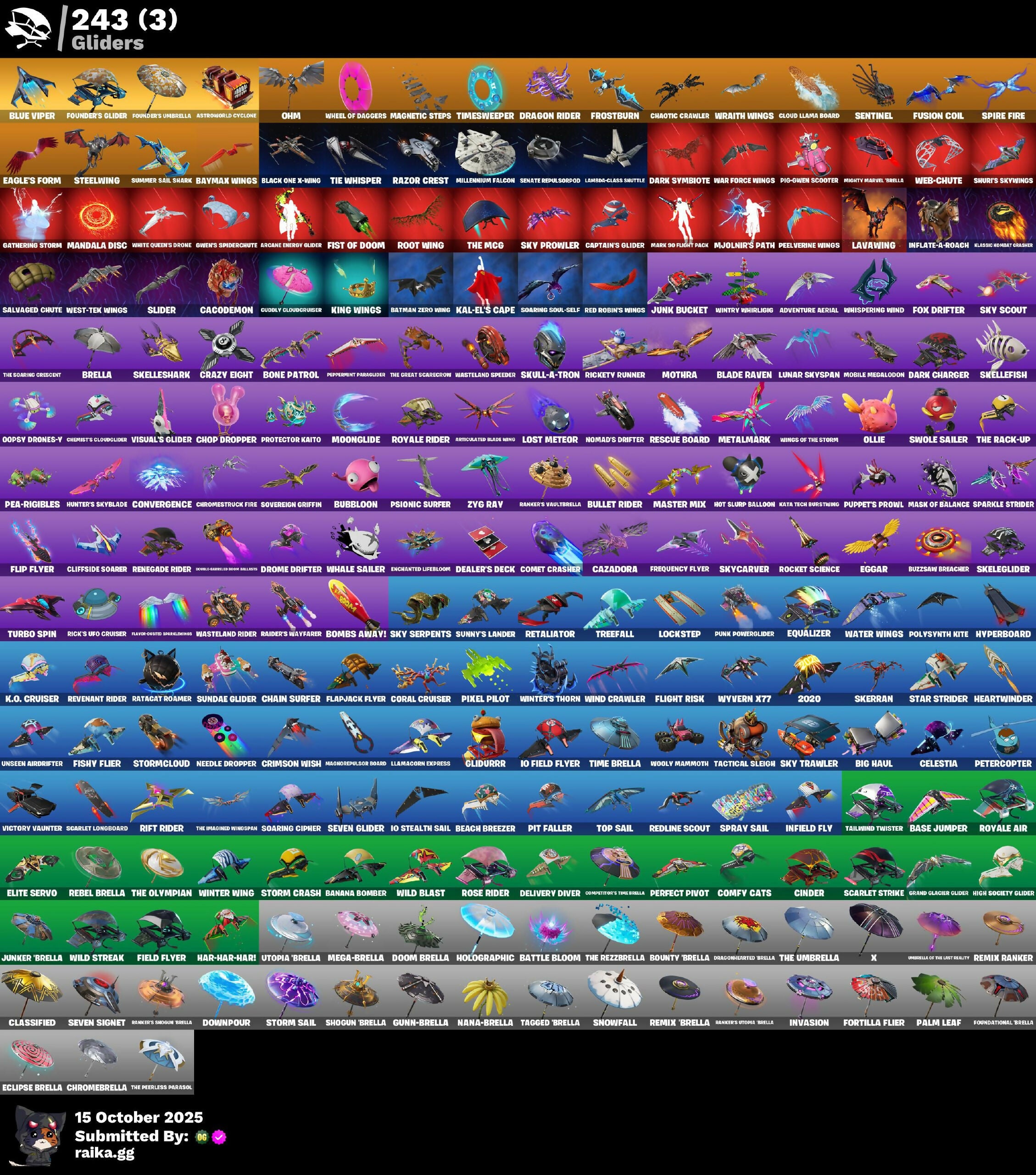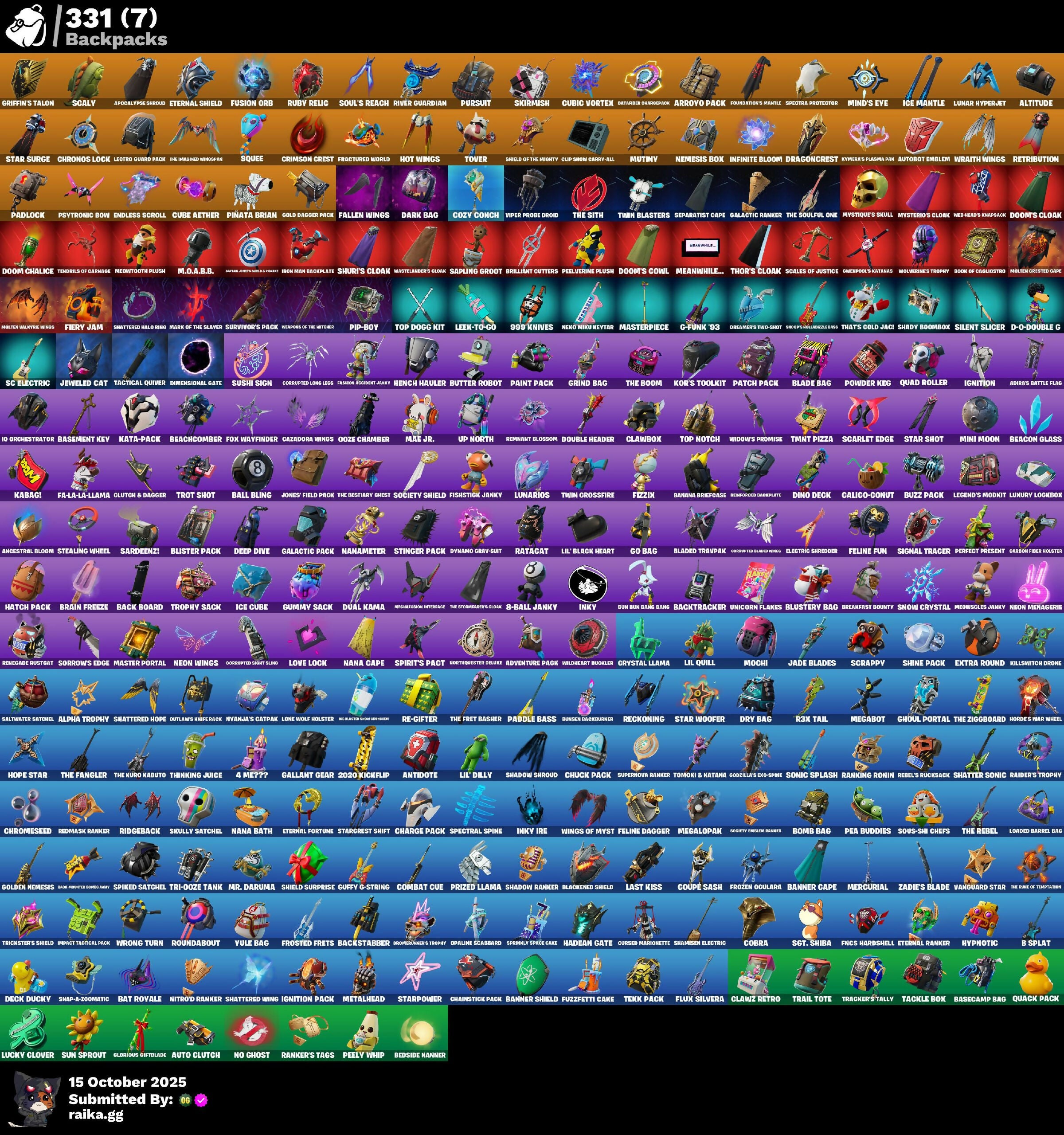 (Snikit), 10 Field Flyer, 10 Orchestrator, 10 Stealth Sail, 18's Kama, 2.O'S Revenge, 2020, 2020 Kickflip, 4 Me??, 8-Ball, 8-Ball Janky, 999 Knives, A Warrior Prepares, Abominable Axe, Absenz, Abyssal Blade, Acolyte’s Curse, Adira, Adira's Battle Flag, Adira’s Armor, Admiral Assault Bomber, Adventure Aerial, Adventure Pack, Aerial Classic, Afterparty, Agent Jones, Agent Peely, Air Horn, Air Shredder, All-Nighter, Alli, Alpha Trophy, Altitude, Ancestral Bloom, Andy Fangerson, Angler Axes, Antidote, Antonia, Apex Predator, Apocalypse Shroud, Aquaman's Trident, Aquari-Axe, Arachnrobatics, Arcane Energy Glider, Arcane Steel, Arctic Adeline, Arctic Camo, Arroyo Pack, Articulated Blade Wing, Artifact Axe, Assault Trooper, Assaultron Blade, Astroworld Cyclone, Auntie Dot, Aura, Auto Clutch, Autobot Emblem, Axe-Tral Form, Azarath Metrion Zinthos!, B Splat, B-Ball Vs Scratch, B.R.U.T.E. Gunner, Bachii, Back Board, Backpaint Voodoo Ninja, Backstabber, Backtracker, Backup Blades, Balance Board, Ball Bling, Banana Bomber, Banana Briefcase, Bananaxe, Bank Shots, Banner Cape, Banner Shield, Baron's Hoard, Base Jumper, Basecamp Bag, Basement Key, Basic Basher, Bat Royale, Batarang Axe, Batman Zero Wing, Batsickle, Battle Blessing, Battle Bloom, Baymax Wings, Beach Breezer, Beachcomber, Beacon Glass, Beacon Trance, Beamers, Bean Bag, Beastfang, Beatzbunny, Bedside Nanner, Beep 'B Boop, Beep Beep, Big Fan, Big Haul, Bike To Go, Billy Bounce, Birthday Basher, Bitey, Black Leader, Black One X-Wing, Blackened Shield, Blackheart, Blade Bag, Blade Of The Waning Moon, Blade Raven, Bladed Travpak, Blades Of Light, Blasted, Blister Pack, Blizzabelle, Blowin' Up, Blowing Bubbles, Blue Metallic, Blue Viper, Blustery Bag, Board Breaker, Boing!, Bold Bar, Bomb Bag, Bomb Bouquet, Bombs Away!, Bone Patrol, Boneless, Boogie Down, Book Of Cagliostro, Boomin', Bootsin' Cats Paws & Claws, Bootstraps, Boulder Breakers, Bounty 'Brella, Boxing Glove Arrow, Brain Freeze, Brawler, Breakfast Bounty, Breaking Waves, Breakneck, Breathless Blades, Brella, Brilliant Cutters, Brite Moves, Brite Raider, Bronzed Scimitars, Bubbloon, Bullet Rider, Bullseye, Bun Bun Bang Bang, Bunker Basher, Bunker Jonesy, Bunny Hop, Burning Dragon, Bursen Backburner, Bushie Bright, Business Hips, Butter Robot, Buttoned Up, Buzz Pack, Buzzsaw Breacher, Bytes, C3s4 Contender Ii, C4s1 Contender Ii, Cacodemon, Cactus Club, Cake Clobberer, Calico, Calico Holiday, Calico-Conut, Call Me, Cameo, Cameo Vs Chic, Candy Axe, Cap K.O., Captain Blamerica, Captain John's Shield & Pickaxe, Captain Jones, Captain's Glider, Captain-Jake's Shell & Hooker, Carbon & Gold, Carbon Fiber Holster, Carbon Scarlet, Card Drop, Cardistry, Carnage, Carnage Cleaver, Cat's Paw, Catalyst, Catflip, Cattster's Glistening Claws, Cauldron Chill, Cazadora, Cazadora Wings, Celestia, Centurion, Centurion Edge, Cerberus Bite, Chain Surfer, Chainsaur, Chainstick Pack, Champion Balisong, Chaos Agent, Chaos Directive, Chaos Director, Chaotic Crawler, Charge Pack, Charlotte, Chef's Special, Chemist's Cloudglider, Chic, Choice Knit, Chop Chop, Chop Dropper, Chrome Marked, Chrome Punk, Chromebrella, Chromeseed, Chromestruck Fire, Chronos Lock, Chuck Pack, Cinder, Clang & Basher, Clara, Clash, Classic Age, Classified, Clawbox, Clawz Retro, Clean Sweep, Cliffside Soarer, Clinical Crosser, Clip Show Carry-All, Cloud Llama Board, Cloudburst, Cluck, Cluck Strut, Clucking Mad, Clutch & Dagger, Cobalt, Cobra, Codsworth's Cleanup, Coin Flip, Cold Furia, Combat Cue, Comet Crasher, Comfy Cats, Competitor's Tintbrella, Conga, Conjure Weapon, Contour Camo, Converge, Convergence, Coral Cruiser, Coral Crush, Corrosive Stripe, Corrupted Angeline, Corrupted Insight, Corrupted Long Legs, Corrupted Shirt Silhouett, Corrupted Shotgun, Corrupted Sludge Wings, Cosmic Cleavers, Cosmic Lumacorn, Count It!, Coupe Sashi, Cozy Conch, Crack It, Crazy Eight, Crescent Shroom, Crimson Crest, Crimson Polestar, Crimson Wish, Crossbounce, Crowbar, Crucible Blade, Cryptic, Crystal, Crystal Fang, Crystal Llama, Crystals Axe Of The Mystics, Cs32 Champion 1, Cs33 Champion 1, Cube Aether, Cubed, Cubic Scepter, Cubic Vortex, Cuddle Carvers, Cuddle Hearts, Cuddle Mech, Cuddly Cloudcruiser, Cursed, Cursed Marionette, Cybertronian Axe, Cyclo Curl, D'Ark, D-O-Double G, Dabstand, Dagger Dance, Daigo, Daigo's Claws, Daisies, Dark Bag, Dark Blessing, Dark Bomber, Dark Charger, Dark Symbiote, Darkfire Claws, Darth Shader, Darth Vader, Databler Charged Pack, De-Rezz De-Stroyer, Deadpool, Dealer's Deck, Death Star Smasher, Deck Ducky, Deep Dab, Deep Dive, Deep End, Deep Future, Deimos, Delivery Diver, Demi, Demonslayer Blade, Denim Destiny, Derby Dynamo, Designated Hitters, Destroyer Signature, Diamond Diva, Diamond Throne, Diamondclaw Picker, Dice Roll, Dimensional Camo, Dimensional Gate, Dino Deck, Dirtbike Challenge, Disco, Dive Knives, Dizzie, Do The Split, Doctor Doom, Doctor Slone, Doctor Strange, Dogg Treat, Don's Dominator, Doom, Doom Brella, Doom Chalice, Doom Slayer, Doom's Cloak, Doom's Cowl, Doom's Domain, Doomed Echo, Double Header, Downpour, Doze Dab, Dragon Rider, Dragon Rune Lance, Dragon Stance, Dragon's Claw, Dragon-Hearted 'Brella, Dragoncrest, Dramatic Flares, Dream, Dreamer's Two-Shot, Dribblin', Driftwood, Driver, Drome Drifter, Dromund'ner's Trophy, Droop, Drummies, Dry Bag, Dual Kama, Duelist's Foil, Dumbbell Driver, Dummy, Dune Scooper, Durrr Burger, Durrr Taisho, Dusk Knight, Dusty, Dyna-Boom!, Dynamo, Dynamo Grav-Suit, Dynamo TNTina, Eagle's Form, Eclipse Brella, Eclipsed Edges, Eggar, Electric Shredder, Electro Farming Blades, Electro Swing, Elegance Blade, Elegant Crowbar, Elite Servo, Ember Pick, Emma Frost, Emote Camo, Empress Fan Dance, Enchanted Lifebloom, Endless Scroll, Energy Claw, Ensnared, EnvoV, Eon Blades, Epic Blade Of Floof, Epic Swords Of Wonder, Eq, Equalizer, Era, Erisa, Erisa’s Crest, Eternal Fortune, Eternal Knight, Eternal Ranker, Eternal Renegade, Eternal Shield, Eternal Voyager, Evasive Mane