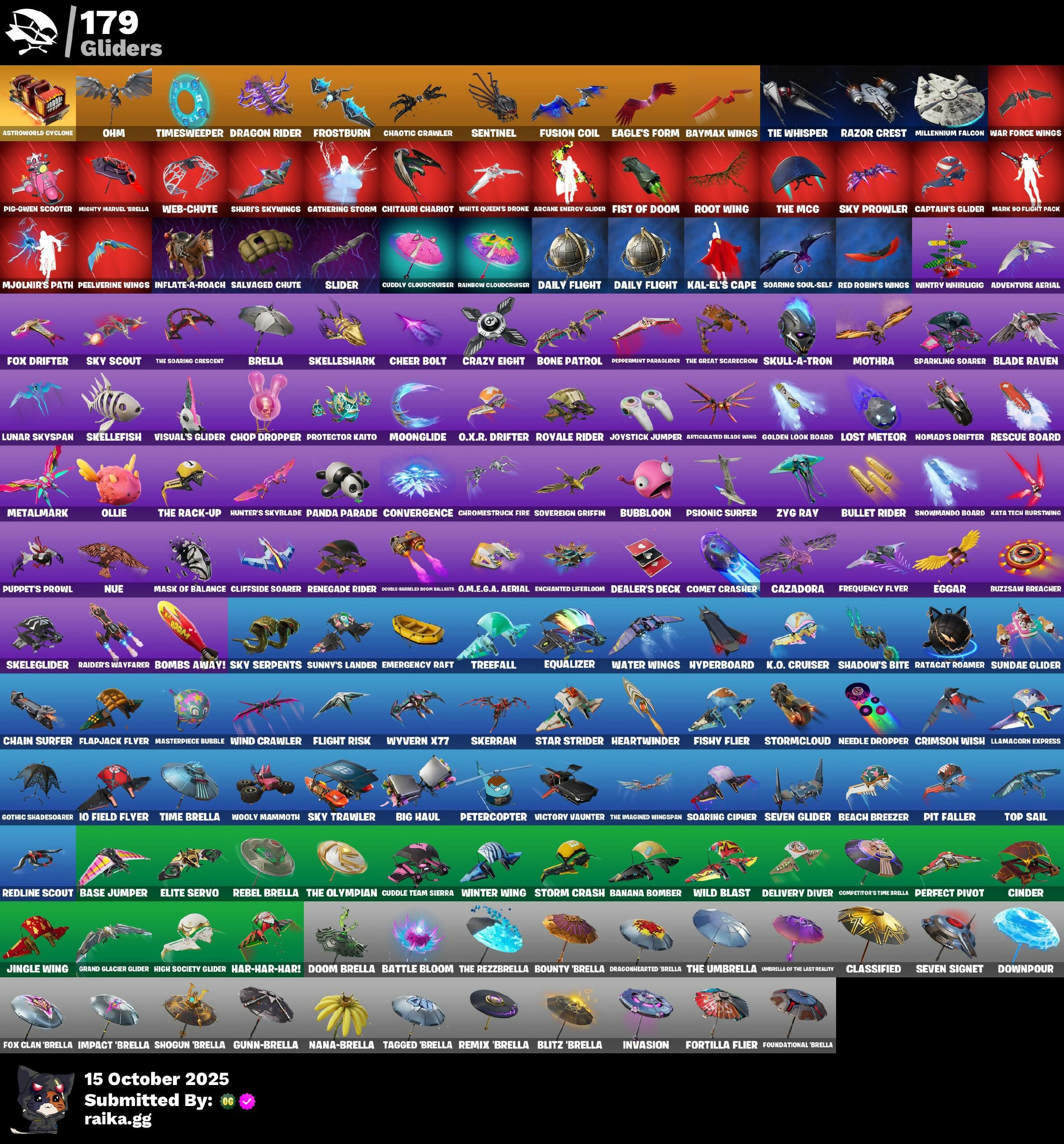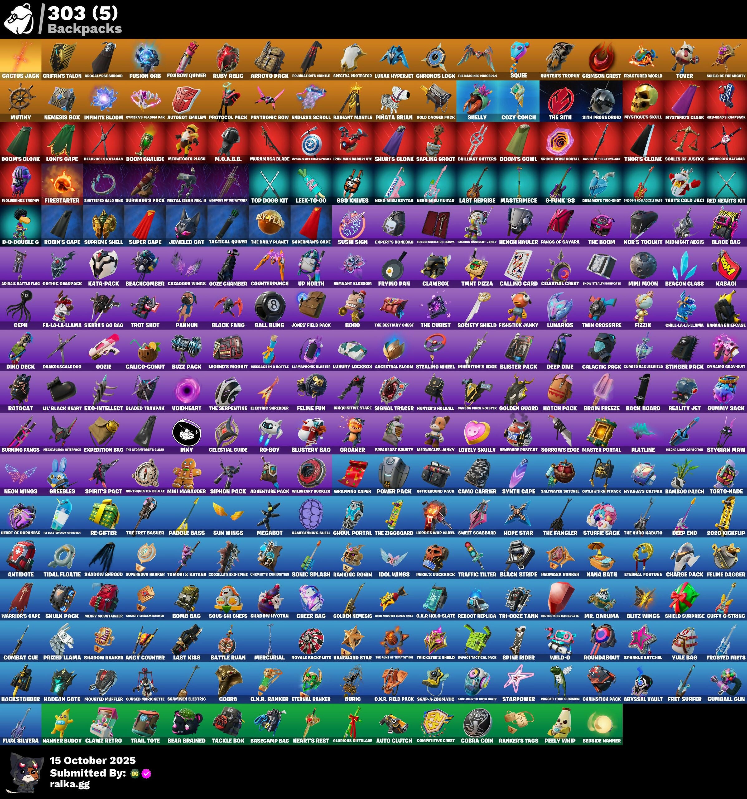 18's Kama, 2.0's Revenge, 2020 Kickflip, 8-Ball, 8-Ball Vs Scratch, 999 Knives, A Gota, A Warrior Prepares, AFK, Abyssal Vault, Acolyte's Curse, Adira, Adira's Armor, Adira's Battle Flag, Adventure Aerial, Adventure Pack, Aerial Assault Bomber, Aerial Classic, Aftermath, Afterparty, Agent Jones, Agent Patch, Agent Peely, Air Shredder, All-Nighter, Alli, Alpha Altimeter, Ancestral Bloom, Andy Fingerson, Angler Axes, Angry Counter, Antidote, Aphrodite, Apocalypse Shroud, Apprentice Evie, Aquaman, Aquaman's Trident, Arc Flail, Arcane Energy Glider, Arcane Steel, Arctic Adeline, Ares, Arroyo Pack, Articulated Blade Wing, Artifact Axe, Assassin's Mark, Astrea, Astroworld Cyclone, Auntie Dot, Auric, Auto Clutch, Autobot Emblem, Aw, Shucks., Ayla Winn, Baba Yaga, Back Board, Backstabber, Backstroke, Backup Blades, Ball Bling, Ballsy, Bamboo Patch, Bamboo-Tana, Banana Bomber, Banana Briefcase, Bananaxe, Bank Shots, Base Jumper, Basecamp Bag, Basic Basher, Battle Bloom, Battle Camper Male, Battle Ruan, Baymax Wings, Beach Breezer, Beachcomber, Beacon Glass, Beacon Trance, Beamer, Bean Bag, Bear Brained, Bear Hug, Beastfang, Bedside Nanner, Beep Beep, Behold!, Bernie, Bhangra Boogie, Big Fan, Big Haul, Bike To Go, Billy Bounce, Birdarang Flourish, Birthstone Backplate, Black Fang, Black Stripe, Blackheart, Blade, Blade Aria, Blade Bag, Blade Raven, Blade of the Warring Moon, Bladed Travpak, Blades of Light, Blasted, Blaze, Blister Pack, Blitz 'Brella, Blitz Wings, Blizzard's Bite, Blowin' Up, Blustery Bag, Bobo, Boing!, Bomb Bag, Bomb Bouquet, Bombs Away!, Bone Patrol, Boneless, Bones, Boogie Down, Boomin', Boots N' Cats, Boulder Breakers, Bounty 'Brella, Boxing Glove Arrow, Brain Freeze, Breakfast Bounty, Breakshore Trident, Breezabelle, Brella, Brilliant Cutters, Bring It Around, Brite Bomber, Bronzed Scimitars, Brush Your Shoulders, Brutus, Bubble Basher, Bubble Wands, Bubbloon, Bullet Rider, Bulletproof, Burning Dragon, Burning Fangs, Bushie Bright, Buzz Pack, Buzzsaw Breacher, Bytes, C-Click!, Cactus Jack, Calico, Calico Holiday, Calico-Conut, Call Me, Calling Card, Cameo, Cameo Vs Chic, Camo Carrier, Captain America's Shield & Frame, Captain America's Shield 3-Poké, Captain Blamerica, Captain Jones, Captain Levi, Captain Phasma, Captain's Glider, Carbon Fiber Holster, Cardistry, Cassidy Quinn, Cat's Paw, Cattitude, Cauldron Chill, Cazadora, Cazadora Wings, Celebratory Slice, Celestial Crest, Celestial Guide, Ceph, Cerberus, Cerberus Bite, Chain Surfer, Chainsaur, Chainstick Pack, Champion Aura, Champion Kyra, Chaos Agent, Chaos Directive, Chaos Director, Chaos Origins, Chaotic Crawler, Charge Pack, Charlotte, Cheer Bag, Cheer Bolt, Chef's Special, Chemist's Curiosities, Chew Toy, Chic, Chili-La-La-Llama, Chitauri Chariot, Choice Knit, Chop Chop, Chop Dropper, Chrome Marked, Chromestruck Fire, Chronos Lock, Cinder, Clark Kent, Clash, Classic Age, Classified, Clawbox, Clawz Retro, Claymation, Clean Groove, Clean Sweep, Cliffside Soarer, Cloudburst, Cluck, Clucking Mad, Cobra, Cobra Coin, Codecarver, Coin Flip, Cold Snap, Combat Cue, Comet Crasher, Competitive Crest, Competitor's Type Brella, Confetti, Conga, Contour Camo, Convergence, Coruscant Guard, Cosmic Llamacorn, Count It!, Counterpunch, Cozy Conch, Crackdown, Crazy Eight, Crazyboy, Crescent Shroom, Crimson Crest, Crimson Wish, Crooked Claw, Crow's Stealin' Briefcase, Crowning Achievement, Crystal, Crystal Axe of the Pastelis, Crystal Smasher, Cube Assassin, Cube Edge, Cuddle Carvers, Cuddle Hearts, Cuddle Mech, Cuddle Team Sierra, Cuddle Team Specialist, Cuddly Cloudcruiser, Cuddly Crusher, Cursed Eagleshield, Cursed Marionette, Cybertronian Axe, Cyclo Curl, D-O-Double G, D.m.e.d.a. Suit Alpha, Dahlia, Daigo, Daigo's Claws, Daily Flight, Daisies, Dali, Dance Off, Dance Therapy, Danica, Dark Side, Deadpool, Deadpool's Katanas, Dealer's Deck, Deep Dab, Deep Dive, Deep End, Deep Future, Deimos, Delivery Diver, Demonslayer Blade, Denim Destiny, Destroyer Signature, Diamond Throne, Diamondclaw Picker, Dice Roll, Die With A Smile, Dino Deck, Disco, Diva Fever, Diva's Dancefloor, Dive Knives, Do The Split, Doctor Doom, Dogg Treat, Doom, Doom Brella, Doom Chalice, Doom's Cloak, Doom's Cowl, Doomed Echo, Double-Barreled Boom Ballasts, Downpour, Doze Dab, Dragon Rider, Dragon Rune Lance, Dragon Stance, Dragon Steel Hybrid, Dragon's Claw, Dragonhearted 'Brella, Drakon Claws, Drakonscale Duo, Dramatic Flares, Dream Feet, Dreamer's Two-Shot, Drift Shift, Driftwood, Driver, Droop, Drummies, Dual Machettas, Duelist's Card Trick, Duelist's Foil, Dune Scooper, Durrr Taisho, Dusty Daredevil, Dye With A Smile Purple, Dyna-Boom!, Dynamic Fire, Dynamo Grav-Suit, Dynamo Tntina, Eagle's Form, Eggar, Electric Shredder, Electro Swing, Electro-Pincers, Elite Servo, Ember Pick, Emergency Raft, Emma Frost, Enchanted Lifebloom, Endless Scroll, Energy Claw, Energy Sword, Eon Blades, Epic Blade of Floof, Epic Sword of Might, Epic Swords of Wonder, Equalizer, Era, Eternal Fortune, Eternal Ranker, Eternal Renegade, Evasive Maneuvers, Everybody Loves Me, Evie, Evolved Heat Ray, Exo-Intellect, Expedition Bag, Experts Bonebag, Explorer Emilie, Expressionism, Fa-La-La-Llama, Face Palm, Fade, Falling Leaf, Fancy Footwork, Fang Dance, Fangs Of Savara, Fangs of Hesk, Fashion Accident Jinxy, Felina, Felina's Claw, Feline Dagger, Feline Fun, Ferocious, Fiendish Wand, Final Harbinger, Firestarter, Fishin', Fishstick, Fishstick Janky, Fishy Flier, Fist Bump, Fist Pump, Fist of Doom, Fizzix, Flapjack Flyer, Flapper, Flashback Breakdown, Flatline, Flight Risk, Flippin' Away, Flippin' Incredible, Flow Bones, Flux, Flux Silvera, Foil Flex, For O.L.K.R!, Fortilla Flier, Foundation's Mantle, Foundation's Plasma Spike, Foundational, Foundational 'Brella, Fox Clan 'Brella, Fox Clan Leader, Fox Drifter, Foxbow Quiver, Fractured World, Frequency Flyer, Fret Surfer, Fright Funk, Front Page Pose, Frost Squad, Frostburn, Frosted Frets, Frosty Globes, Fryangles, Frying Pan, Full Tilt, Fusion,