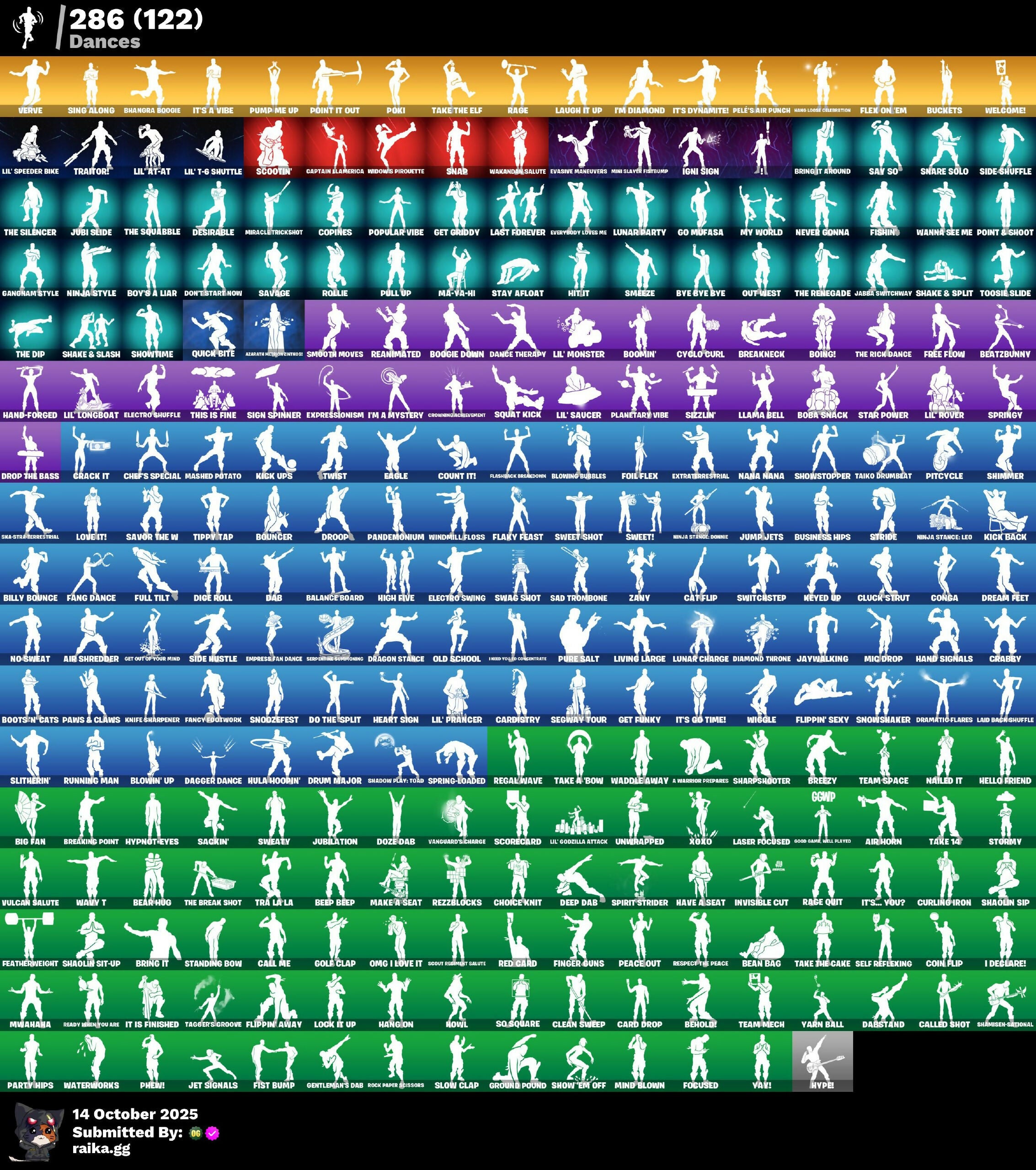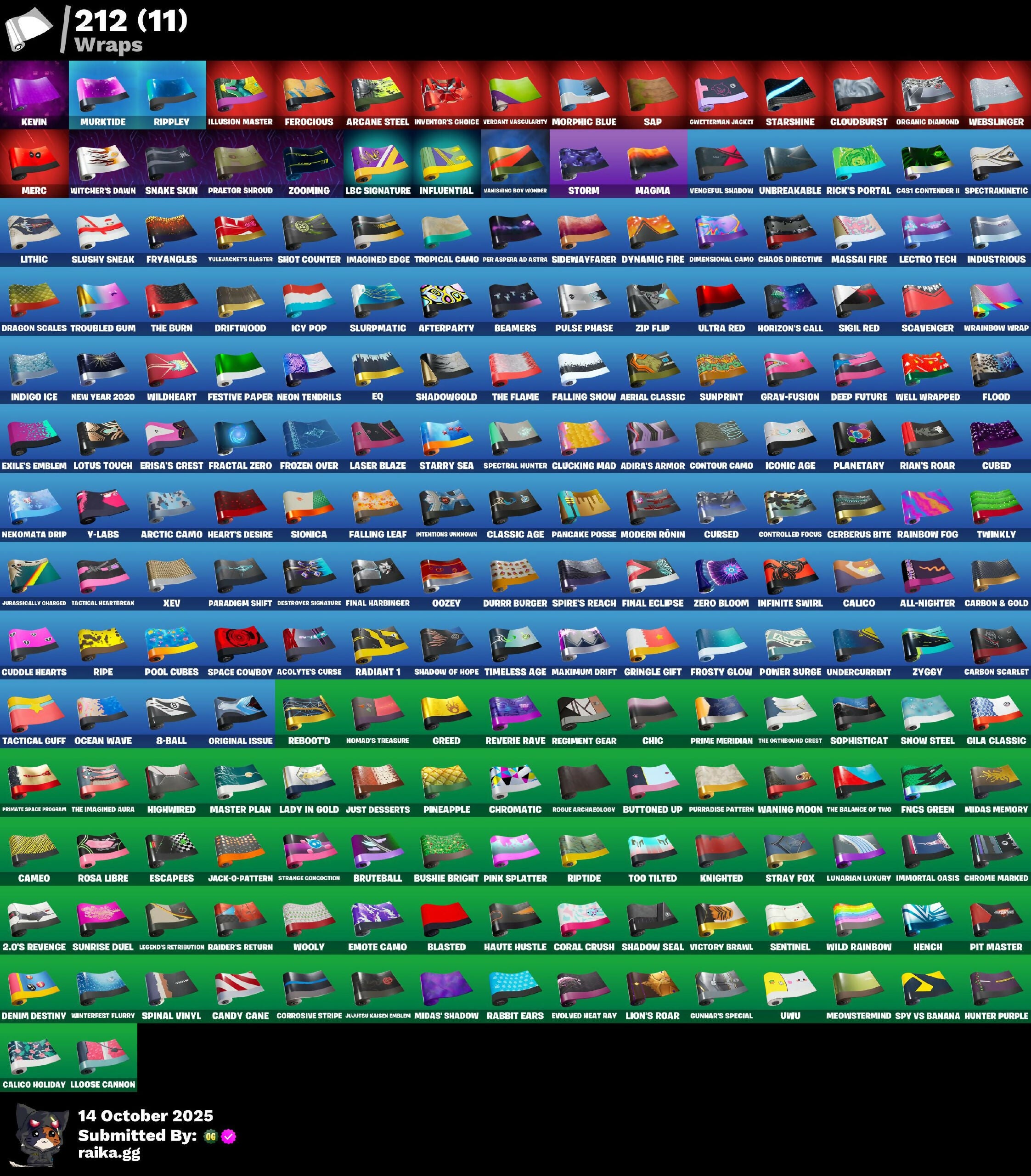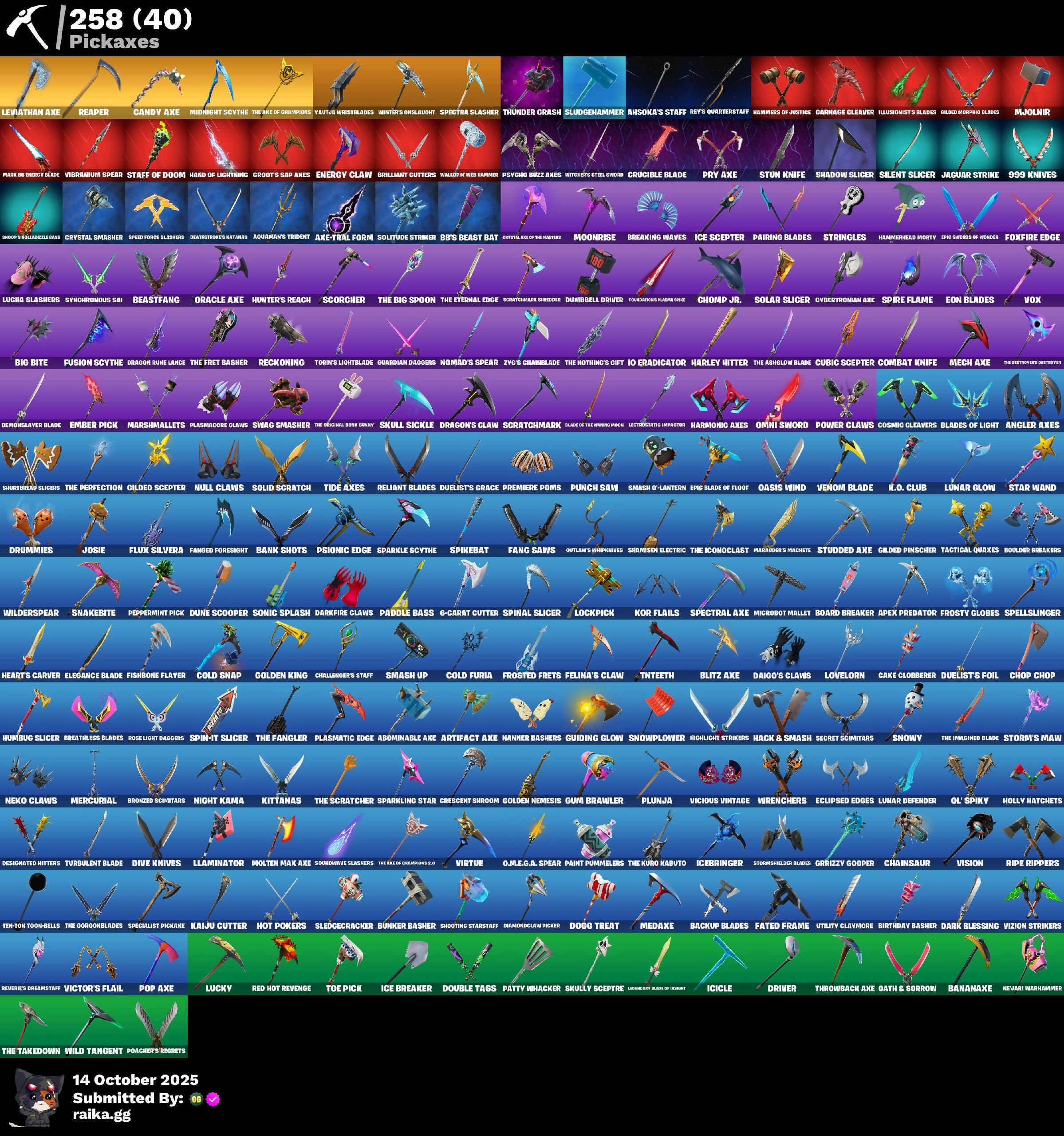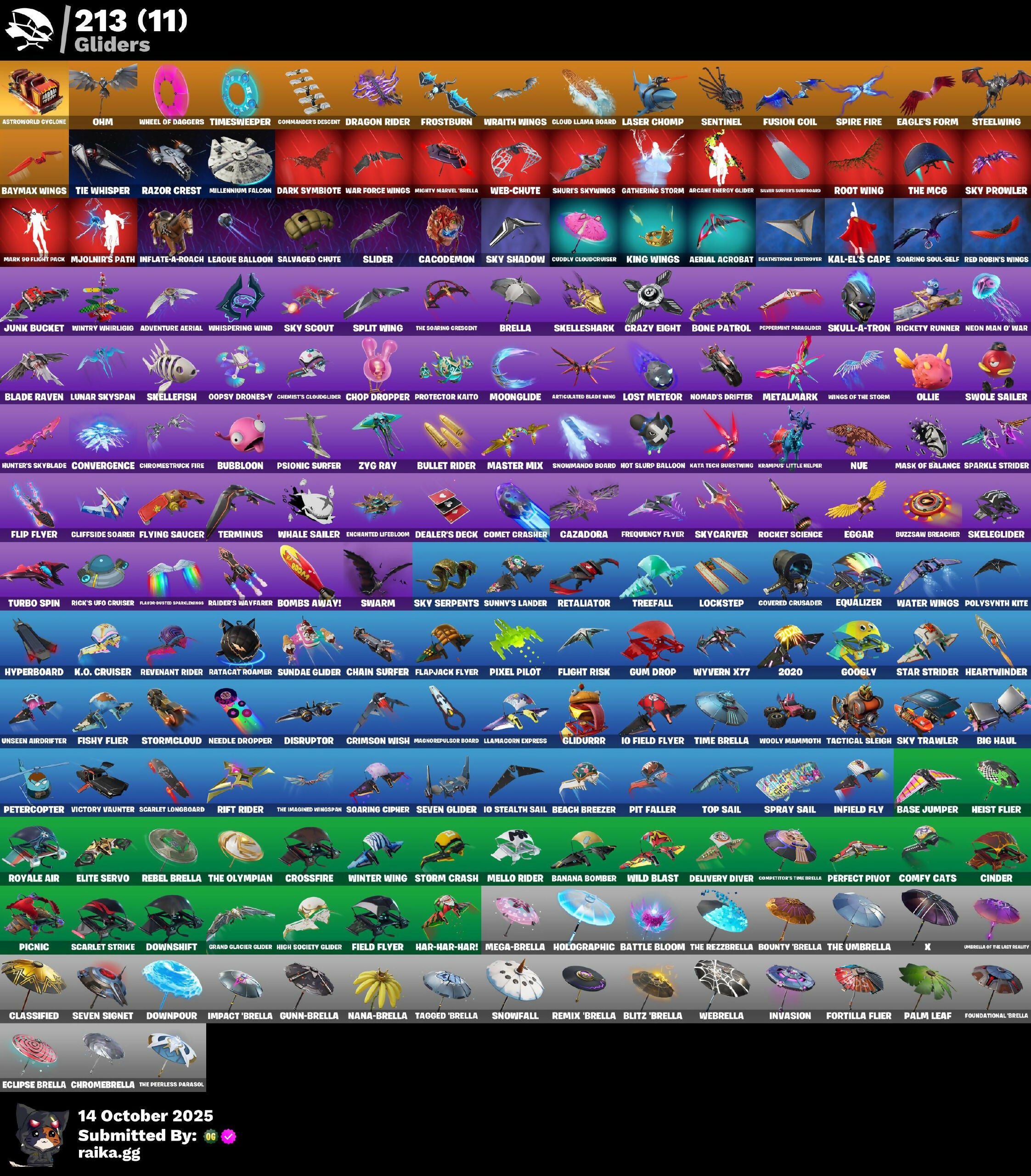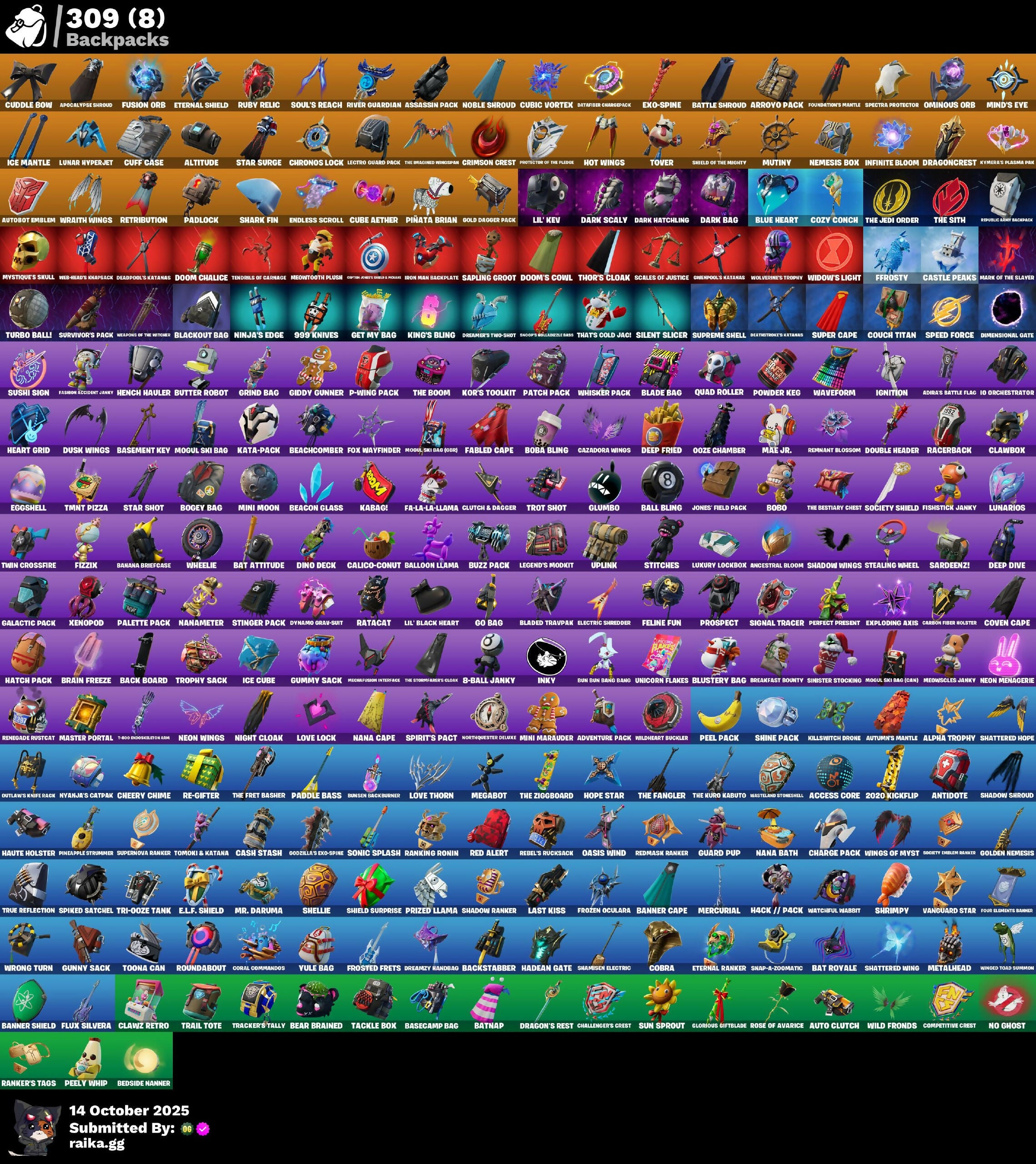 10 Field Flyer, 10 Stealth Sail, 2.0’s Revenge, 2020, 2020 Kickflip, 6-Carat Cutter, 8-Ball, 8-Ball Janky, 8-Ball vs Scratch, 999 Knives, A Warrior Prepares, Abominable Axe, Access Core, Acolyte’s Curse, Adira, Adira’s Armor, Adventure Aerial, Adventure Pack, Aerial Acrobat, Aerial Classic, Afterparty, Agent Jones, Agent Peely, Ahsoka's Staff, Air Horn, Air Shredder, All-Nighter, Alpha Trophy, Altitude, Ancestral Bloom, Angler Axes, Antidote, Antonia, Apex Predator, Apocalypse Shroud, Aquaman, Aquaman's Trident, Arcane Energy Glider, Arcane Steel, Arctic Adeline, Arctic Assassin, Arctic Camo, Arroyo Pack, Articulated Blade Wing, Artifact Axe, Assassin Pack, Astroworld Cyclone, Athleisure Assassin, Aura, Aura Analyzer, Auto Clutch, Autobot Emblem, Autumn's Mantle, Axe-Tral Form, Azarath Metrion Zinthos!, BB's Beast Bat, Back Board, Backlash, Backstabber, Backup Blades, Balance Board, Ball Bling, Balloon Llama, Banana Bomber, Banana Briefcase, Bananaxe, Bank Shots, Banner Cape, Banner Shield, Banner Trooper, Base Jumper, Basecamp Bag, Basement Key, Bat Attitude, Bat Royale, Batnap, Battle Bloom, Battle Shroud, Baymax Wings, Beach Breezer, Beachcomber, Beacon Glass, Beamers, Bean Bag, Bear Brained, Bear Hug, Beast Boy, Beastfang, Beatzbunny, Bedside Nanner, Beef Boss, Beep Beep, Behold!, Bhangra Boogie, Big Bite, Big Fan, Big Haul, Billy Bounce, Birdie, Birthday Basher, Blackheart, Blackout Bag, Blade Bag, Blade Raven, Blade of the Having Moon, Bladed Trapvak, Blades of Light, Blasted, Blitz 'Brella, Blitz Axe, Blizzabelle, Blowin' Up, Blowing Bubbles, Blue Heart, Blustery Bag, Board Breaker, Boba Bling, Boba Snack, Bobo, Bogey Bag, Boing!, Bolt, Bombs Away!, Bone Patrol, Boogie Down, Boomin', Boots'n Cats, Boulder Breakers, Bouncer, Bounty 'Brella, Boy's A Liar, Brain Freeze, Breakfast Bounty, Breaking Point, Breaking Waves, Breakneck, Breathless Blades, Breezy, Brella, Brilliant Cutters, Bring It, Bring It Around, Bronzed Scimitars, Bruteball, Bubbloon, Buckets, Bullet Rider, Bullseye, Bun Bun Bang Bang, Bunker Basher, Bunker Jonesy, Bunny Brawler, Bunnywolf, Bunsen Backburner, Burnout, Bushie Bright, Business Hips, Butter Robot, Buttoned Up, Buzz Pack, Buzzsaw Breacher, Bye Bye Bye, Bytes, C4SI Contender II, Cacodemon, Cake Clobberer, Calamity, Calico, Calico Holiday, Calico-Coconut, Call Me, Called Shot, Cameo, Cameo vs Chic, Candy Axe, Candy Cane, Captain America, Carbon & Gold, Carbon Scarlet, Card Drop, Cardistry, Carnage, Carnage Cleaver, Cash Stash, Castle Peaks, Cat Flip, Catalyst, Cazadora, Cazadora Wings, Cerberus Bite, Chain Surfer, Chainsaur, Challenger's Crest, Challenger's Staff, Championship Aura, Chaos Agent, Chaos Directive, Charge Pack, Charlotte, Cheery Chime, Chef's Special, Chemist's Cloudcutter, Chic, Chigusa, Choice Knit, Chomp Jr., Chomp Sr., Chop Chop, Chop Dropper, Chromatic, Chrome Marked, Chromebrella, Chromestruck Fire, Chronos Lock, Cinder, Classic Age, Classified, Clawbox, Clawz Retro, Clean Sweep, Cliffside Soarer, Clinical Crosser, Cloaked Shadow, Cloud Llama Board, Cloudburst, Cluck, Cluck Strut, Clucking Mad, Clutch & Dagger, Cobra, Codename E.L.F., Coin Flip, Cold Furia, Cold Snap, Combat Knife, Comet Crasher, Comfy Cats, Commander's Descent, Commando, Competitive Crest, Competitor's Time Brella, Conga, Contour Camo, Controlled Focus, Convergence, Copines, Coral Commandos, Coral Crush, Corrosive Stripe, Corrupted Voyager, Cosma, Cosmic Cleavers, Couch Titan, Count It!, Coven Cape, Covered Crusader, Cozy Conch, Crabby, Crack It, Crazy Eight, Crescent Shroom, Crimson Crest, Crimson Wish, Crossfire, Crucible Blade, Crystal Axe of the Masters, Crystal Smasher, Cube Aether, Cubed, Cubic Scepter, Cubic Vortex, Cuddle Bow, Cuddle Hearts, Cuddle Team Leader, Cuddly Cloudcrosser, Cuff Case, Curling Iron, Cursed, Cybertronian Axe, Cyclo Curl, D'ark, DJ Yonder, Dab, Dabstand, Dagger Dance, Daigo, Daigo's Claws, Dance Therapy, Dark Bag, Dark Blessing, Dark Bomber, Dark Hatchling, Dark Rex, Dark Scaly, Dark Symbiote, Dark Tricera Ops, Darkfire Claws, Deadpool, Dealer's Deck, Deathstroke Destroyer, Deathstroke Zero, Deathstroke's Katanas, Deep Dab, Deep Dive, Deep Fried, Deep Future, Delivery Diver, Demi, Demonslayer Blade, Denim Destiny, Derby Dynamo, Designated Hitters, Desirable, Destroyer Signature, Diamond Diva, Diamond Throne, Diamondclaw Picker, Dice Roll, Dimensional Camo, Dimensional Gate, Dino Deck, Disruptor, Dive Knives, Do The Split, Doctor Doom, Doctor Slone, Dogg Treat, Don't Start Now, Doom Chalice, Doom Slayer, Doom's Cowl, Double Header, Double Tags, Downpour, Downshift, Doze Dab, Dragon Rider, Dragon Rune Lance, Dragon Scales, Dragon Stance, Dragon's Claw, Dragon's Rest, Dragoncrest, Dramatico Flares, Dream, Dream Feet, Dreamer's Two-Shot, Dreamzy Handbag, Driftwood, Driver, Droop!, Drop The Bass, Drum Major, Drummies, Duelist's Foil, Duelist's Grace, Dumbbell Driver, Dummy, Dune Scooper, Durr Burger, Dusk, Dusk Knight, Dusk Wings, Dusty, Dynamic Fire, Dynamo, E.L.F. Shield, EQ, Eagle, Eagle's Form, Echo, Eclipse Brella, Eclipsed Edges, Eggar, Eggshell, Electric Shredder, Electro Shuffle, Electro Swing, Elegance Blade, Elite Servo, Ember Pick, Emote Camo, Enchanted Lifebloom, Endless Scroll, Energy Claw, Eon Blades, Epic Blade of Flood, Epic Swords of Wonder, Equalizer, Era, Erisa, Erisa’s Crest, Escapees, Eternal Knight, Eternal Ranker, Eternal Shield, Eternal Voyager, Evasive Maneuvers, Everybody Loves Me, Evie, Evolved Heat Ray, Exile’s Emblem, Exo-Spine, Exploding Axis, Expressionism, Extra Terrestrial, FNCS Green, Fa-la-la-llama, Fabio Sparklemane, Fable, Fabled Cape, Fade, Falling Leaf, Falling Snow, Fancy Footwork, Fang Dance, Fang Saws, Fanged Foresight, Fate, Fated Frame, Featherweight, Felina, Felina's Claw, Feline Fun, Ferocious, Festive Paper, Ffrosty, Field Flyer, Final Eclipse, Final Harbinger, Finger Guns, Fish Thicc, Fishbone Flayer, Fishin', Fishstick Janky, Fishy Flier, Fist Bump, Fizzix, Flaky Feast, Flapjack Flyer, Fle