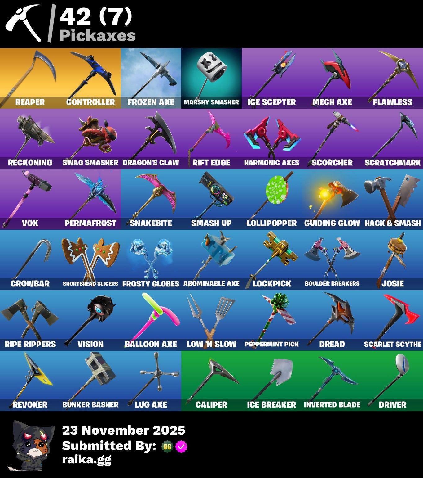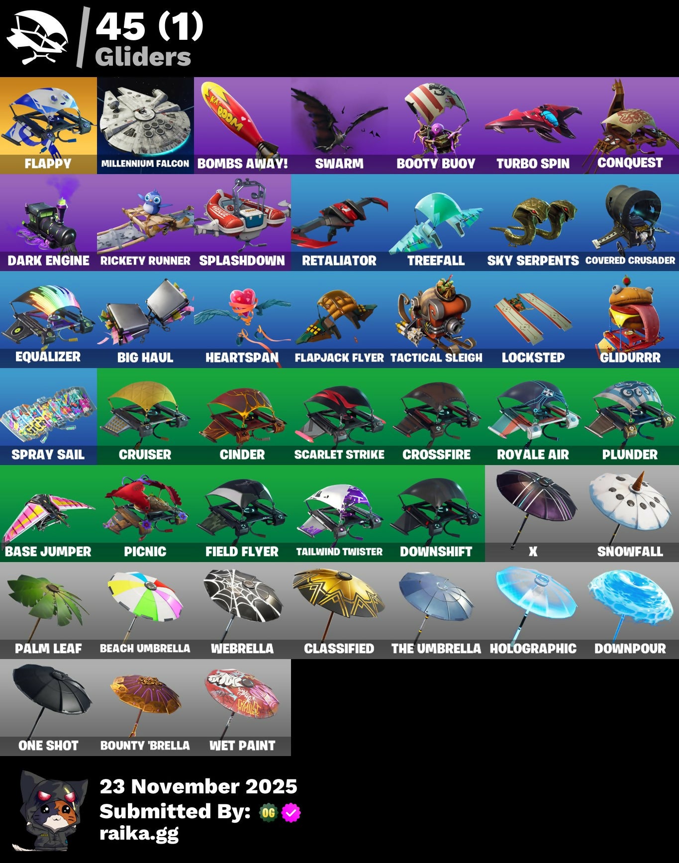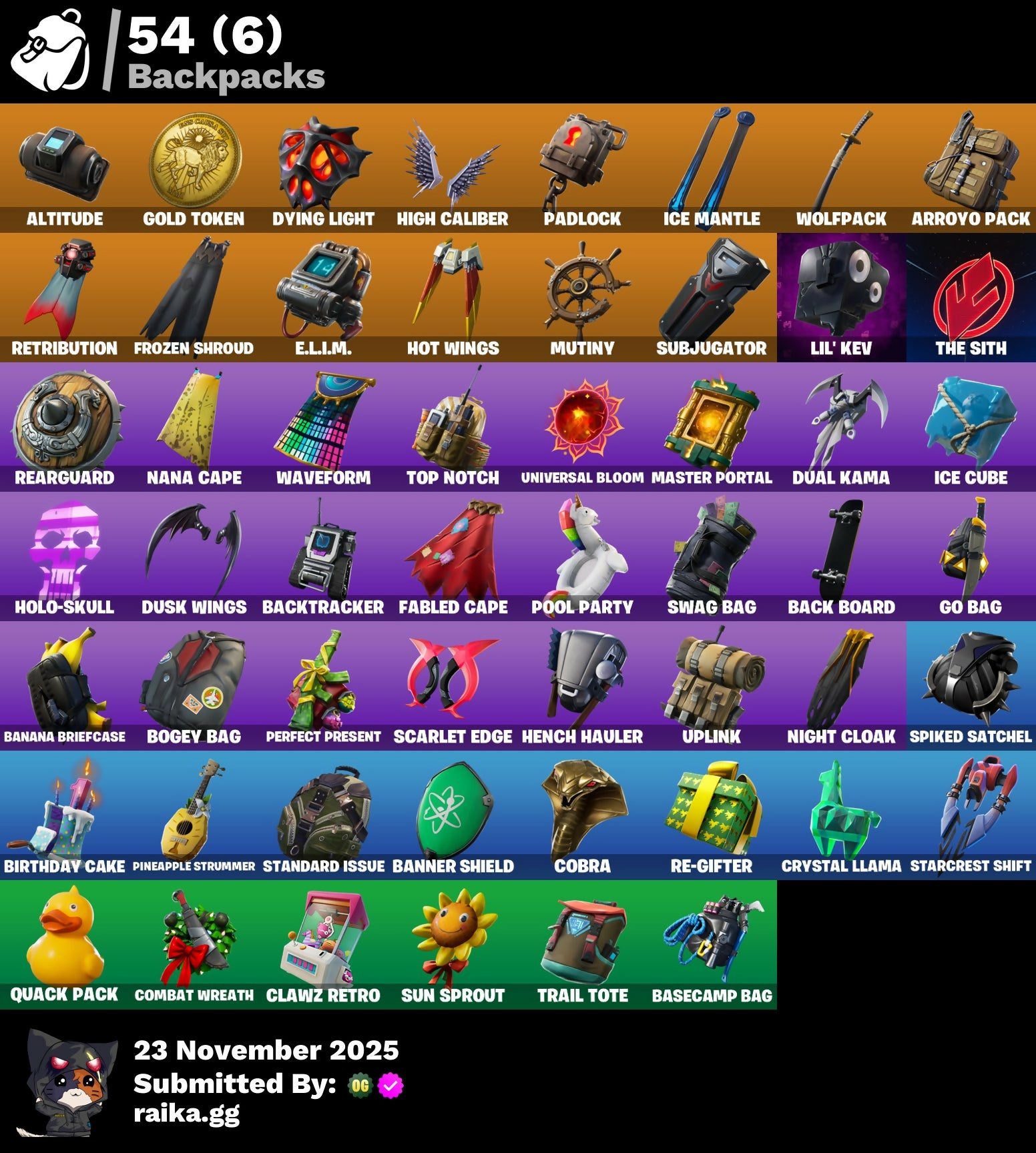 A.I.M., Abominable Axe, Agent Peely, Altitude, Arctic Camo, Arroyo Pack, Back Board, Backtracker, Balloon Axe, Banana Briefcase, Banner Shield, Base Jumper, Basecamp Bag, Beach Umbrella, Big Haul, Birthday Cake, Blackheart, Blasted, Bogey Bag, Bombs Away!, Boogeyman, Boogie Down, Booty Buoy, Boulder Breakers, Bounty 'Brella, Breakdown, Brutus, Bunker Basher, Bunker Jonesy, Calamity, Calculated, Caliper, Call Me, Callsign Skull, Carbon & Gold, Cat Flip, Chic, Cinder, Classified, Clawz Retro, Cluck Strut, Clutch, Cobra, Combat Wreath, Confetti, Conga, Conquest, Controller, Covered Crusader, Crossfire, Crowbar, Cruiser, Crystal Llama, Cuddle Hearts, Cursed, DJ Yonder, Dab, Dark Engine, Deadpool, Deep End, Demi, Dip, Dire, Disco, Downpour, Downshift, Dragon Scales, Dragon Stance, Dragon's Claw, Dread, Drift, Driftwood, Driver, Dual Kama, Durrr Burger, Dusk, Dusk Wings, Dying Light, E.L.I.M., Ember, Enforcer, Equalizer, Fable, Fabled Cape, Festive Paper, Field Flyer, Fiend, Fierce, Flamenco, Flapjack Flyer, Flappy, Flawless, Free Flow, Frosted, Frosty Globes, Frozen Axe, Frozen Shroud, Fryangles, Gear Specialist Maya, Gemstone, Gentleman's Dab, Get Funky, Giddy-Up, Glidurrr, Go Bag, Gold Token, Golf Clap, Grav-Fusion, Grimoire, Grind, Guiding Glow, Hack & Smash, Harmonic Axes, Heartspan, Hello Friend, Hench, Hench Hauler, High Caliber, Holo-Skull, Holographic, Hoop Master, Hot Marat, Hot Wings, Huntress, Hybrid, Ice Breaker, Ice Cube, Ice Mantle, Ice Scepter, Ikonik, Indigo Ice, Infinite Dab, Inverted Blade, It's Go Time!, Josie, Jubilation, Jump Jets, Jungle Scout, Keep It Mello, Knighted, Kuno, Laguna, Laid Back Shuffle, Last Forever, Laugh It Up, Lil' Kev, Lockpick, Lockstep, Lollipopper, Low 'N Slow, Lt. Evergreen, Lug Axe, Luxe, Lynx, Marked Marauder, Marshy Smasher, Master Key, Master Portal, Mech Axe, Mic Drop, Millennium Falcon, Mutiny, Nana Cape, Nana Nana, New Year 2020, Night Cloak, Nightshade, One Shot, Onesie, Orange Justice, Padlock, Palm Leaf, Peace Out, Peely, Peppermint Pick, Perfect Present, Permafrost, Picnic, Pineapple, Pineapple Strummer, Pink Splatter, Pirouette, Pitch Patroller, Plunder, Point It Out, Pool Party, Powder, Power Surge, Quack Pack, Rage Quit, Ragnarok, Rambunctious, Re-Gifter, Reanimated, Reaper, Rearguard, Reckoning, Redline, Regal Wave, Respect The Peace, Retaliator, Retribution, Revel, Revoker, Rickety Runner, Rift Edge, Ripe, Ripe Rippers, Rook, Rox, Royale Air, Ruin, Running Man, Sad Trombone, Salute, Scarlet Edge, Scarlet Scythe, Scarlet Strike, Scenario, Scorcher, Scratchmark, Sentinel, Sgt. Winter, Shadow Boxer, Sharpshooter, Shimmer, Shortbread Slicers, Sidewinder, Sign Spinner, Sing Along, Singularity, Skull Ranger, Sky Serpents, Sledgehammer, Slitherin', Slow Clap, Smash Up, Snakebite, Snoozefest, Snowfall, Snowshaker, Spiked Satchel, Splashdown, Spray Sail, Standard Issue, Starcrest Shift, Starflare, Storm, Stratus, Subjugator, Summit Striker, Sun Sprout, Sun Strider, Sunprint, Swag Bag, Swag Smasher, Swarm, Swipe It, T-Pose, Tactical Sleigh, Tailwind Twister, Take The Elf, Team Monster, The Ace, The Ice King, The Prisoner, The Sith, The Umbrella, Tiger Stripes, Too Tilted, Top Notch, Tra La La, Trail Tote, Treefall, Trog, Tropical Camo, Turbo Spin, Ultra Red, Universal Bloom, Uplink, Valentine, Vega, Vendetta, Vision, Vox, Wakandan Salute, Waveform, Webrella, Well Wrapped, Wet Paint, Widow's Pirouette, Wingman, Wolfpack, Wooly Warrior, X, Yay!, You're Awesome, Zenith