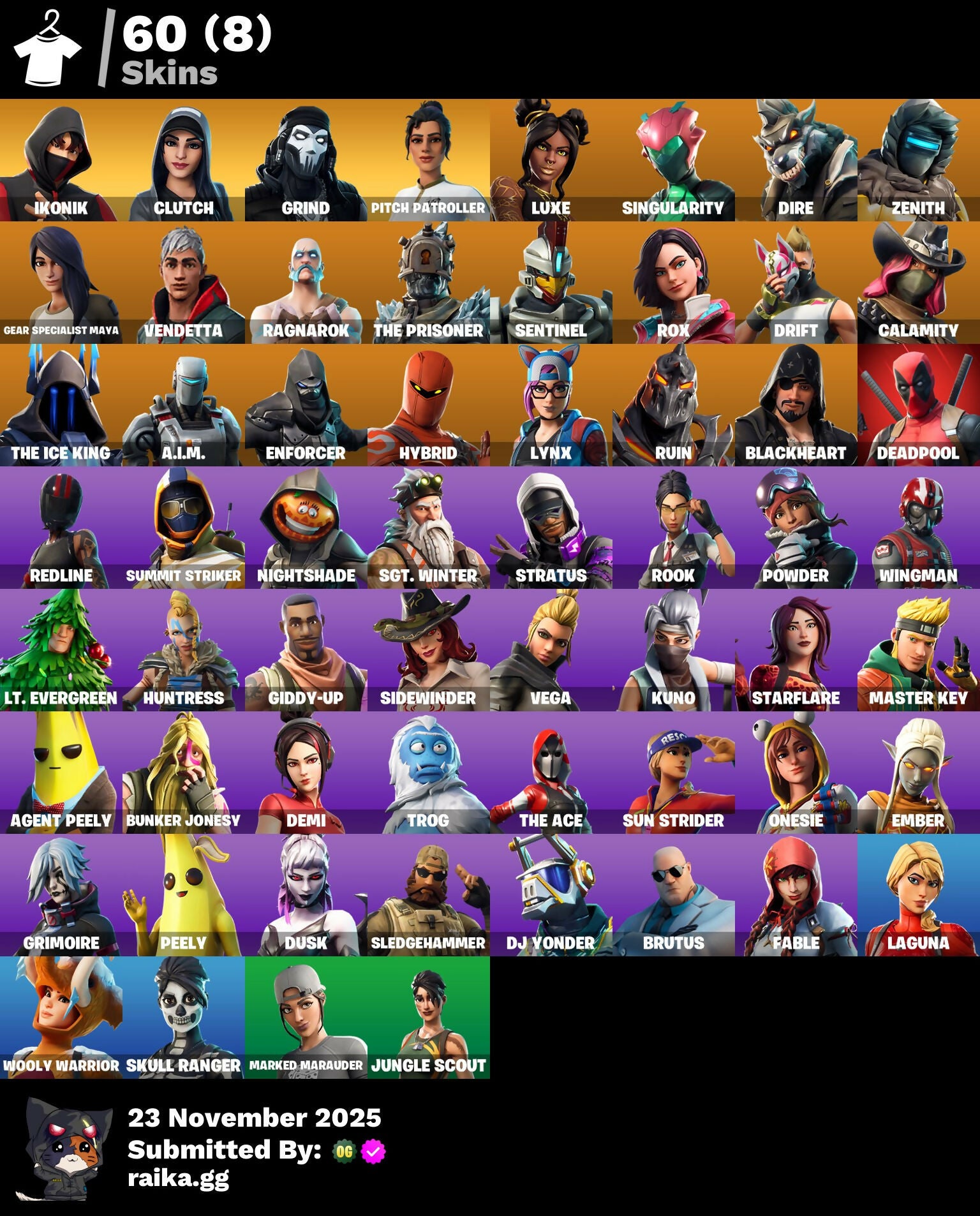 [PC/PSN/XBOX/NITTENDO] 60 skins | IKONIK | Clutch | Grind | Pitch Patroller | Luxe | Singularity | Dire | Zenith | Gear Specialist Maya | Vendetta | Ragnarok | 100 VB