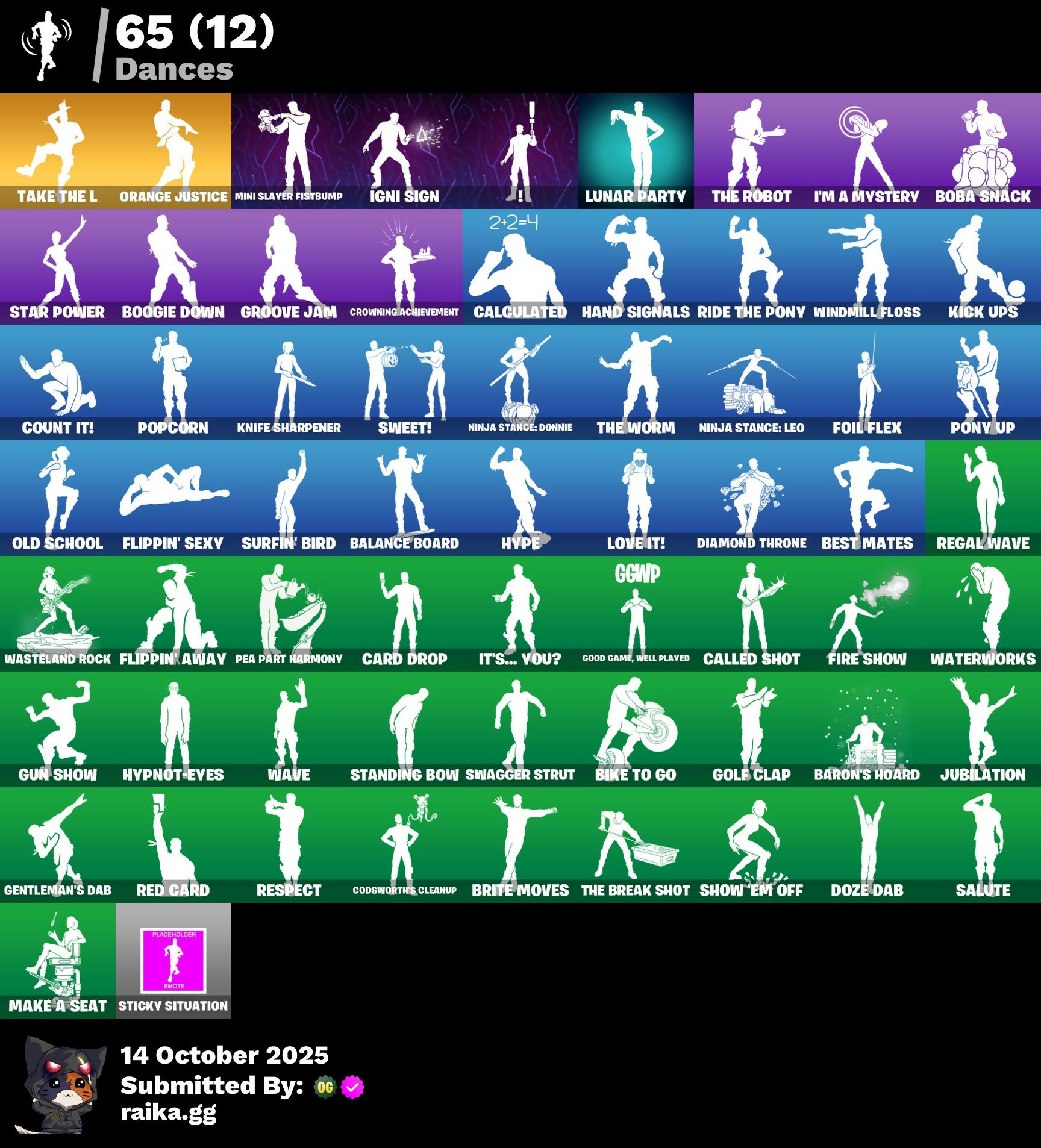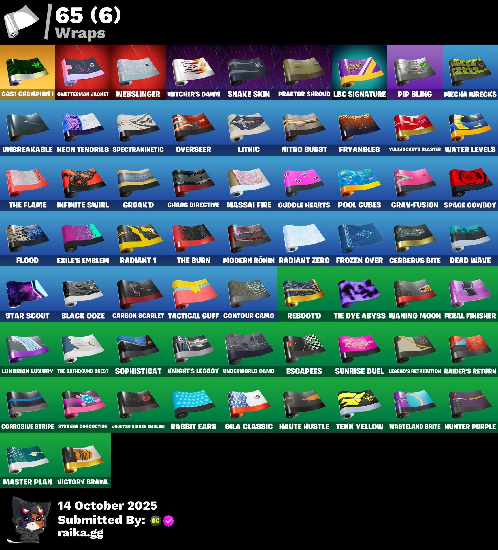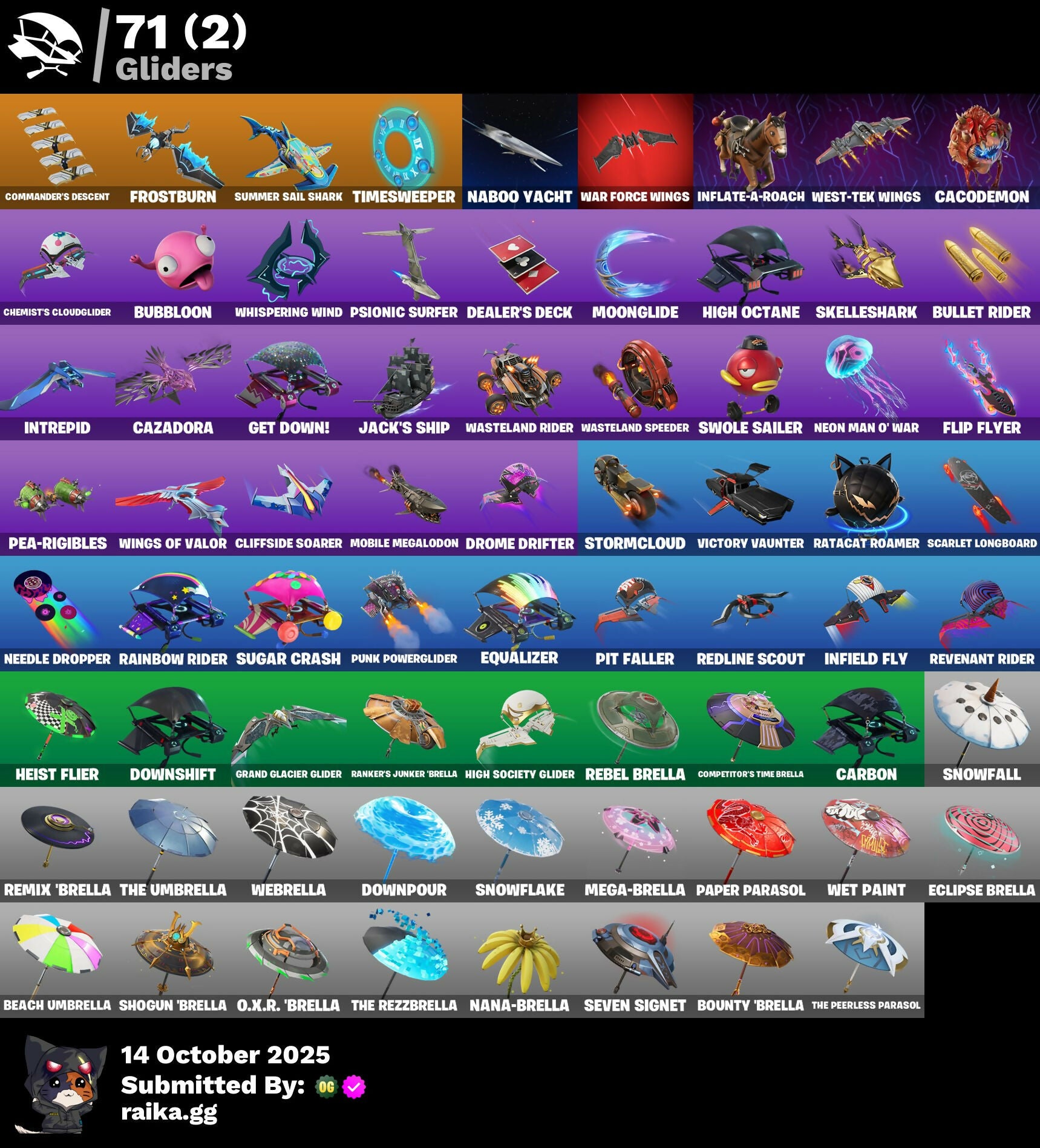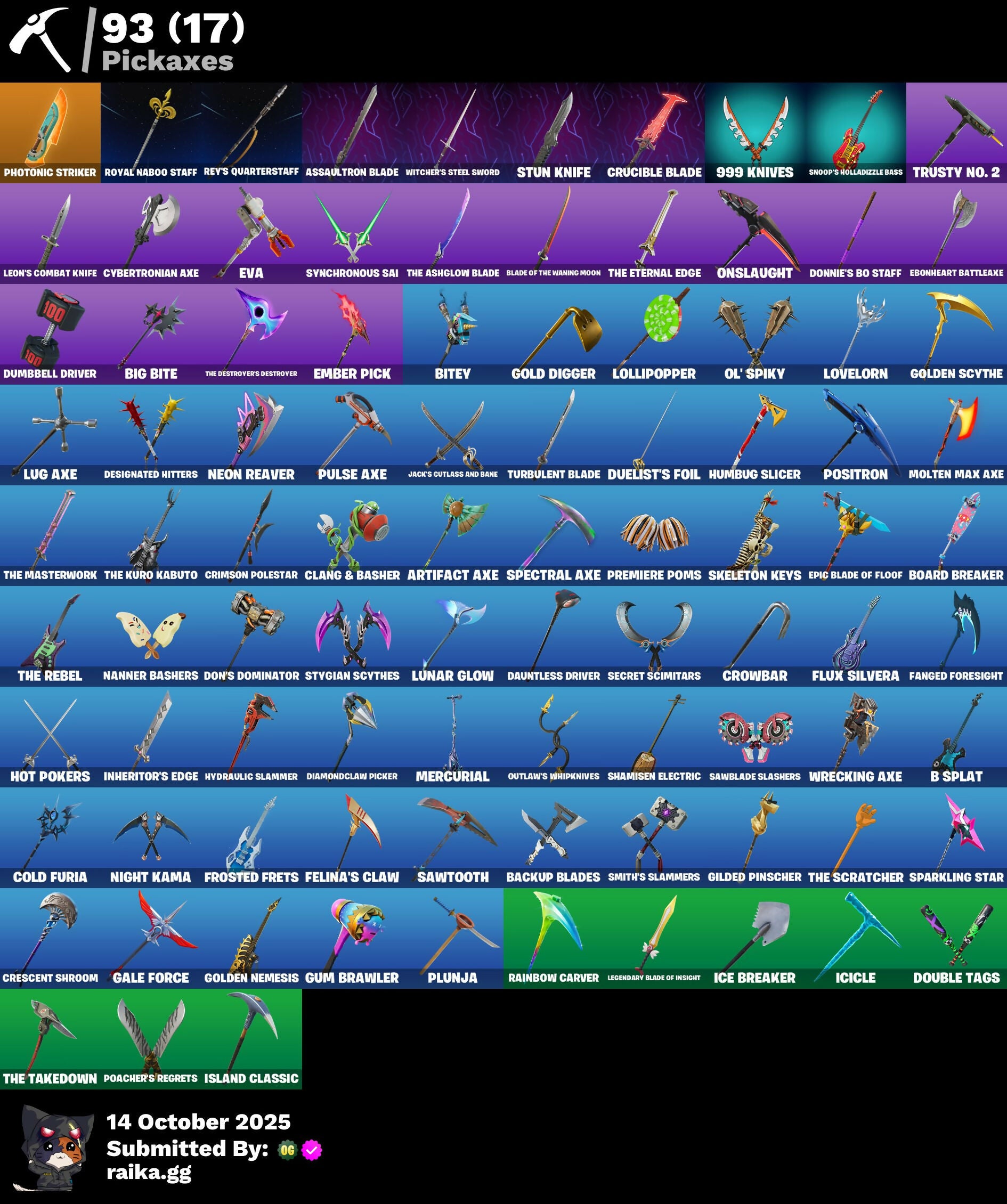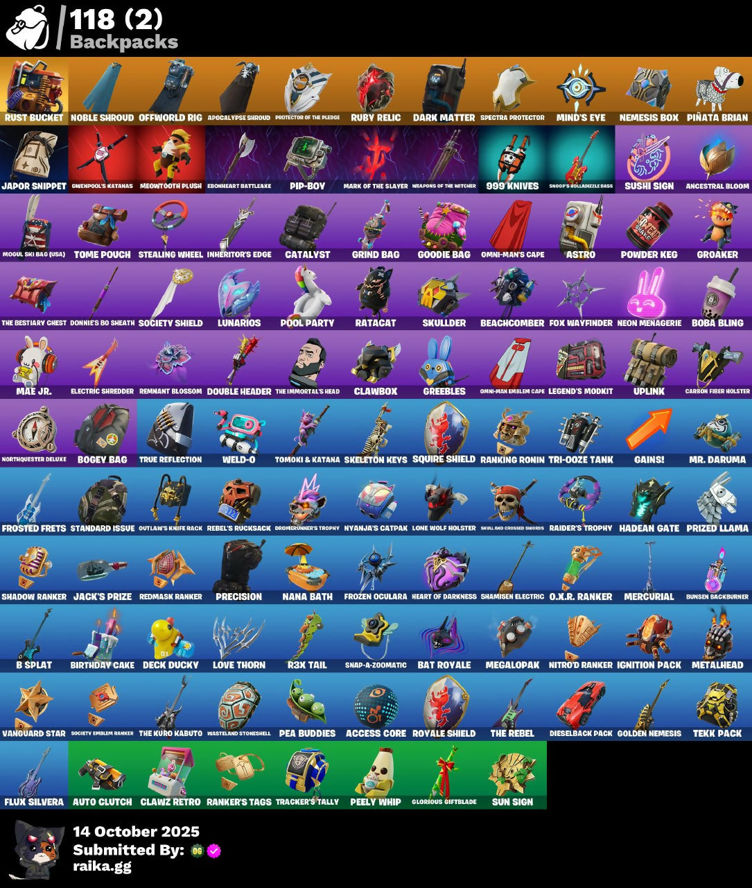 999 Knives, Access Core, Ancestral Bloom, Apocalypse Shroud, Artifact Axe, Assaultron Blade, Astro, Auto Clutch, B Splat, Backup Blades, Balance Board, Baron's Hoard, Bat Royale, Battlehawk, Beach Umbrella, Beachcomber, Best Mates, Big Bite, Bike To Go, Birthday Cake, Bitey, Black Ooze, Blade Of The Waning Moon, Blue Squire, Board Breaker, Boba Bling, Boba Snack, Bogey Bag, Boogie Down, Bounty 'brella, Brite Moves, Brite Raider, Bubbloon, Bullet Rider, Bunsen Backburner, C4S1 Champion I, Cacodemon, Calculated, Called Shot, Carbide, Carbon, Carbon Fiber Holster, Carbon Scarlet, Card Drop, Catalyst, Cazadora, Cerberus Bite, Chaos Directive, Chemist's Cloudglider, Clang & Basher, Clawbox, Clawz Retro, Cliffside Soarer, Codsworth's Cleanup, Cold Furia, Commander's Descent, Competitor's Time Brella, Contour Camo, Corrosive Stripe, Count It!, Crescent Shroom, Crimson Polestar, Crowbar, Crowning Achievement, Crucible Blade, Cuddle Hearts, Cybertronian Axe, Dark Matter, Dark Voyager, Dauntless Driver, Dead Wave, Dealer's Deck, Deck Ducky, Designated Hitters, Diamond Hanz, Diamond Throne, Diamondclaw Picker, Dieselback Pack, Don's Dominator, Donatello, Donnie's Bo Sheath, Donnie's Bo Staff, Doom Slayer, Double Header, Double Tags, Downpour, Downshift, Doze Dab, Drome Drifter, Dronerunner's Trophy, Duelist's Foil, Dumbbell Driver, Dusty, Eboneheart Battleaxe, Ebonheart Battleaxe, Echo, Eclipse Brella, Electric Shredder, Elite Agent, Elmira, Ember Pick, Epic Blade Of Floof, Equalizer, Escapees, Eva, Exile's Emblem, Explorer Emilie, Fanged Foresight, Felina, Felina's Claw, Feral Finisher, Fire Show, Flip Flyer, Flippin' Away, Flippin' Sexy, Flood, Flux Silvera, Foil Flex, Fox Wayfinder, Frostburn, Frosted Frets, Frozen Oculata, Frozen Over, Fryangles, GGWP, Gains!, Gale Force, Gentleman's Dab, Geralt of Rivia, Get Down!, Gila Classic, Gilded Pinscher, Glorious Giftblade, Gold Digger, Golden Nemesis, Golden Scythe, Golf Clap, Good Game, Well Played, Goodie Bag, Grand Glacier Glider, Grav-Fusion, Greebles, Grind Bag, Groak'd, Groaker, Groove Jam, Gum Brawler, Gun Show, Gweeterman Jacket, Gwenpool's Katanas, Hadean Gate, Hand Signals, Haute Hustle, Heart Of Darkness, Heist Flier, Helsie, High Octane, High Society Glider, Holiday Boxy, Hope, Hot Pokers, Humbug Slicer, Hunter Purple, Hydraulic Slammer, Hype, Hypnot-Eyes, I'm A Mystery, Ice Breaker, Icicle, Igni Sign, Ignition Pack, Infield Fly, Infinite Swirl, Inflate-A-Roach, Inheritor's Edge, Intrepid, Island Classic, It's... You?, Jack's Cutlass and Bane, Jack's Prize, Jack's Ship, Japor Snippet, Jubilation, Jujutsu Kaisen Emblem, Kick Ups, Knife Sharpener, Knight's Legacy, LBC Signature, Legend's Modkit, Legend's Retribution, Legendary Blade Of Insight, Leon's Combat Knife, Lithic, Lollipoppor, Lone Wolf Holster, Love It!, Love Thorn, Lovelorn, Lug Axe, Lunar Glow, Lunar Party, Lunarian Luxury, Lunarios, Mae Jr., Make A Seat, Mark Of The Slayer, Massai, Massai Fire, Master Plan, Mecha Wrecks, Mega-Brella, Megalo Don, Megalopak, Meowtooth Plush, Mercurial, Metalhead, Mind's Eye, Mini Slayer Fistbump, Mission Specialist, Mobile Megalodon, Modern Ronin, Mogul Master (USA), Mogul Ski Bag (USA), Molten Max Axe, Montague, Moonglide, Moonwalker, Mr. Dappermint, Mr. Daruma, Naboo Yacht, Nana Bath, Nana-Brella, Nanner Bashers, Needle Dropper, Nemesis Box, Neon Man O' War, Neon Menagerie, Neon Reaver, Neon Tendrils, Nezumi, Night Kama, Ninja Stance: Donnie, Ninja Stance: Leo, Nisha, Nitro Burst, Nitrod Ranker, Noble Shroud, Northquester Deluxe, Nyanja's Catpak, O.X.R. 'brella, O.X.R. Ranker, Offworld Rig, Ol' Spiky, Old School, Omega, Omni-Man, Omni-Man Emblem Cape, Omni-Man's Cape, Onslaught, Orange Justice, Oscar, Outlaw's Knife Rack, Outlaw's Whipknives, Overseer, Padmé Amidala, Paper Parasol, Party Diva, Pea Buddies, Pea Part Harmony, Pea-Rigibles, Peabody, Peely Whip, Persephone, Peter Griffin, Photonic Striker, Pip Bling, Pip-Boy, Pit Faller, Piñata Brian, Plunja, Poacher's Regrets, Pony Up, Pool Cubes, Pool Party, Popcorn, Positron, Powder Keg, Praetor Shroud, Precision, Premiere Poms, Prized Llama, Protector Of The Pledge, Psionic Surfer, Pulse Axe, Punk Powerglider, R3x Tail, Rabbit Ears, Radiant 1, Radiant Zero, Raider's Return, Raider's Trophy, Rainbow Carver, Rainbow Rider, Ranker's Junker 'brella, Ranker's Tags, Ranking Ronin, Ratacat, Ratacat Roamer, Rebel Brella, Rebel's Rucksack, Reboot'd, Recon Specialist, Red Card, Redline Scout, Redmask Ranker, Regal Wave, Remix 'brella, Remnant Blossom, Respect, Revenant Rider, Rey's Quarterstaff, Ride The Pony, Rift Knight Kieran, Ringmaster Scarr, Rogue Agent, Royal Naboo Staff, Royale Knight, Royale Shield, Ruby Relic, Runway Racer, Rust, Rust Bucket, Rust Lord, Salute, Sawblade Slashers, Sawtooth, Scarlet Defender, Scarlet Longboard, Secret Scimitars, Selene, Seven Signet, Shadow Ranker, Shamisen Electric, Shogun 'brella, Show 'Em Off, Skeleton Keys, Skelleshark, Skull And Crossed Swords, Skullder, Slayer Juice Wrld, Smith's Slammers, Snake Skin, Snap-A-Zoomatic, Snoop's Holladizzle Bass, Snowfall, Snowflake, Society Emblem Ranker, Society Shield, Solid Snake, Sophisticat, Space Cowboy, Sparkling Star, Spectra Protector, Spectrakinetic, Spectral Axe, Squad Leader, Squire Shield, Standard Issue, Standing Bow, Star Power, Star Scout, Stealing Wheel, Sticky Situation, Stormcloud, Strange Concoction, Striped Slinger, Stun Knife, Stygian Scythes, Sugar Crash, Summer Sail Shark, Sun Sign, Sunrise Duel, Surfin' Bird, Sushi Sign, Swagger Strut, Sweet!, Swole Sailer, Sylvie, Synchronous Sai, T-60 Power Armor, Tactical Guff, Take The L, Tegan, Tekk Yellow, Teknique, Tekx Pack, The Ageless, The Ashglow Blade, The Bestiary Chest, The Break Shot, The Burn, The Destroyer's Destroyer, The Eternal Edge, The Flame, The Immortal's Head, The Kuro Kabuto, The Machinist, The Masterwork, The Oathbound Crest, The Operator, The Peerless Parasol, The Reaper, The Rebel, The Rezzbrella, The Robot, The Scratcher, The Takedown, T