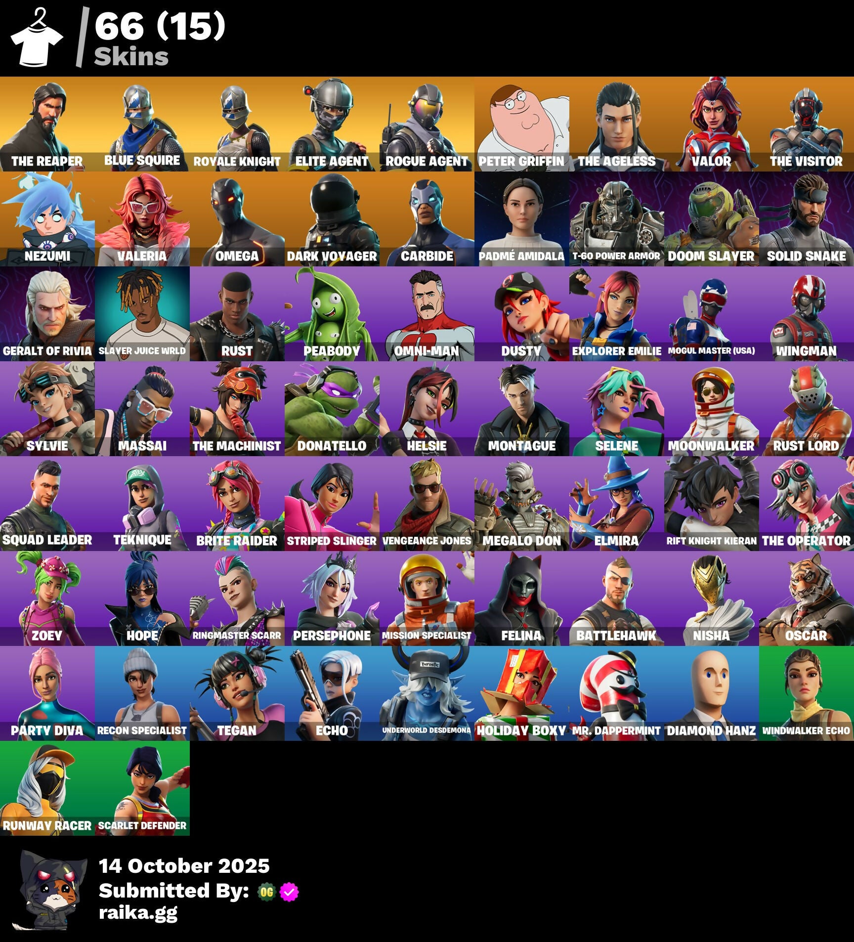[PC/PSN/XBOX/NITTENDO] 66 skins The Reaper | Blue Squire | Royale Knight | Elite Agent | Rogue Agent | Peter Griffin | The Ageless | Valor | The Visitor | Nezumi | 150 VB