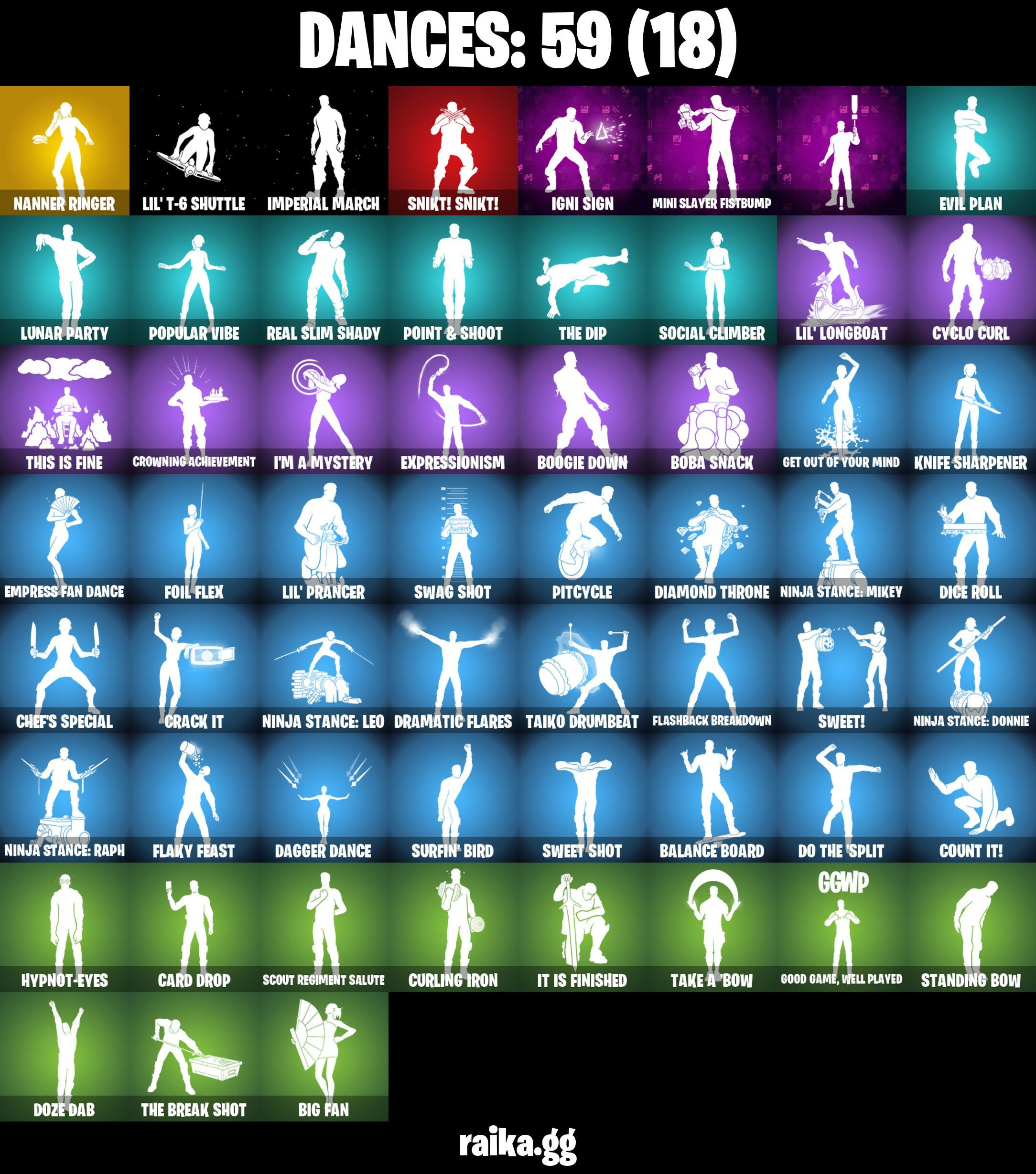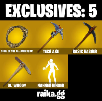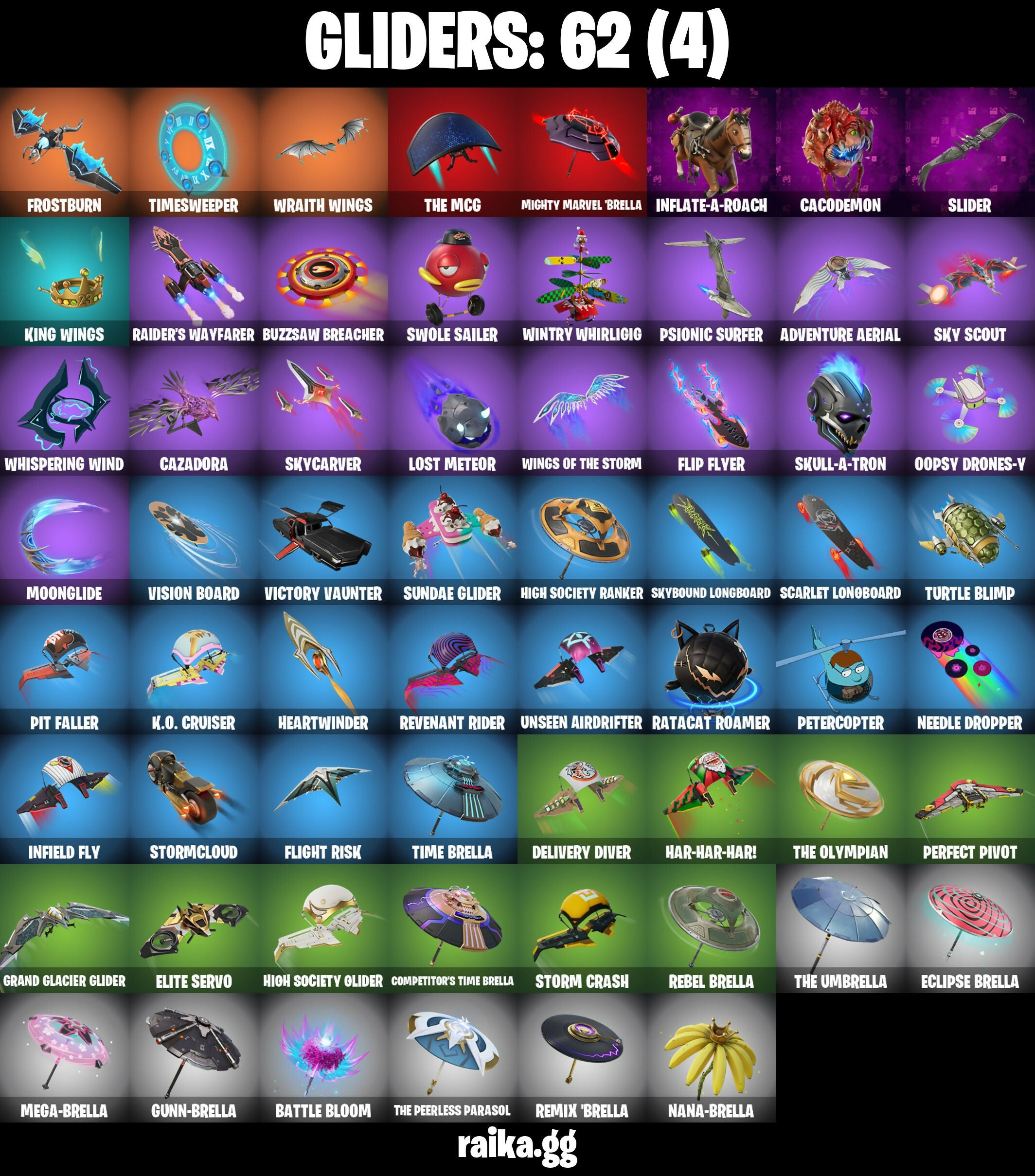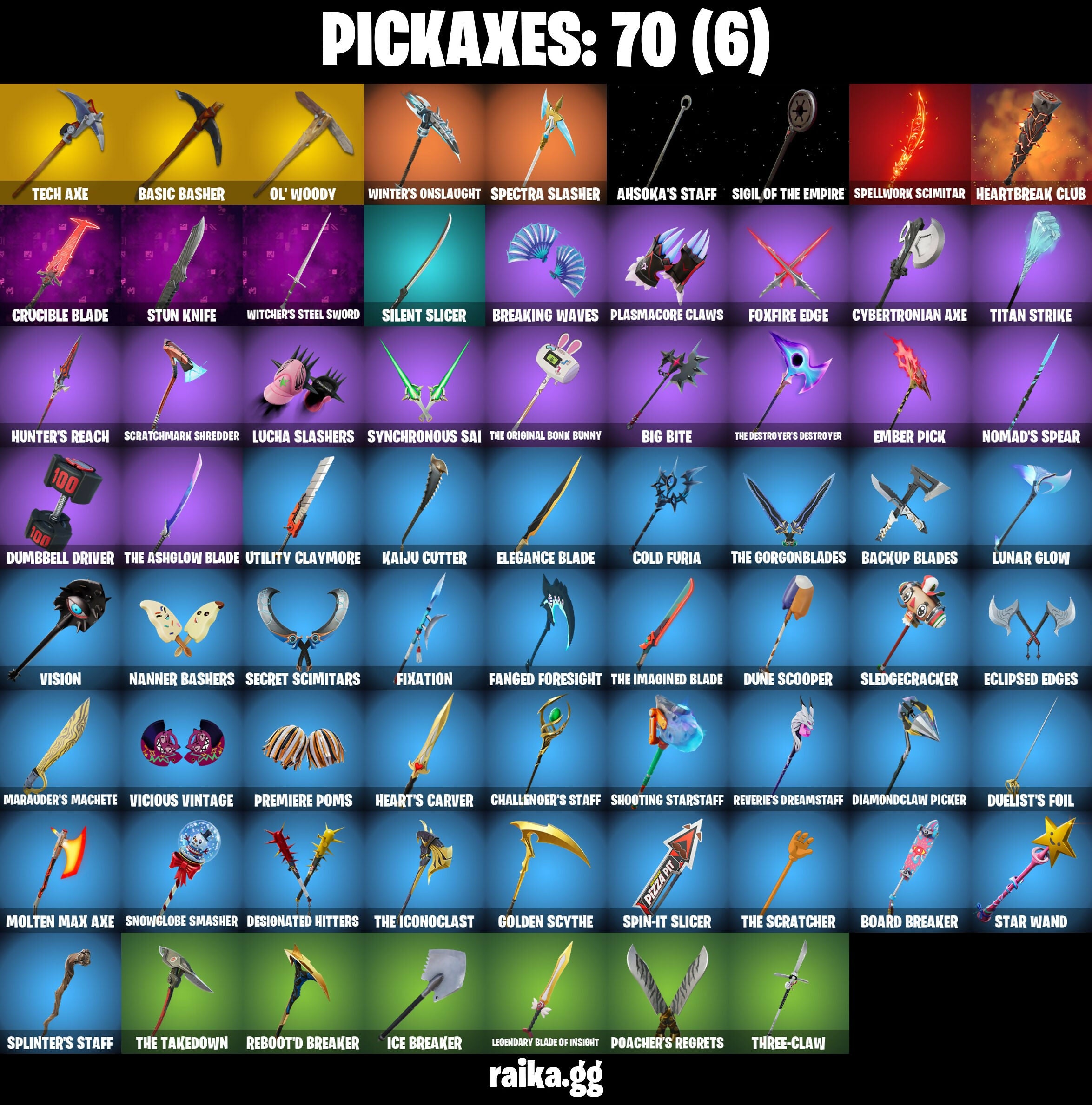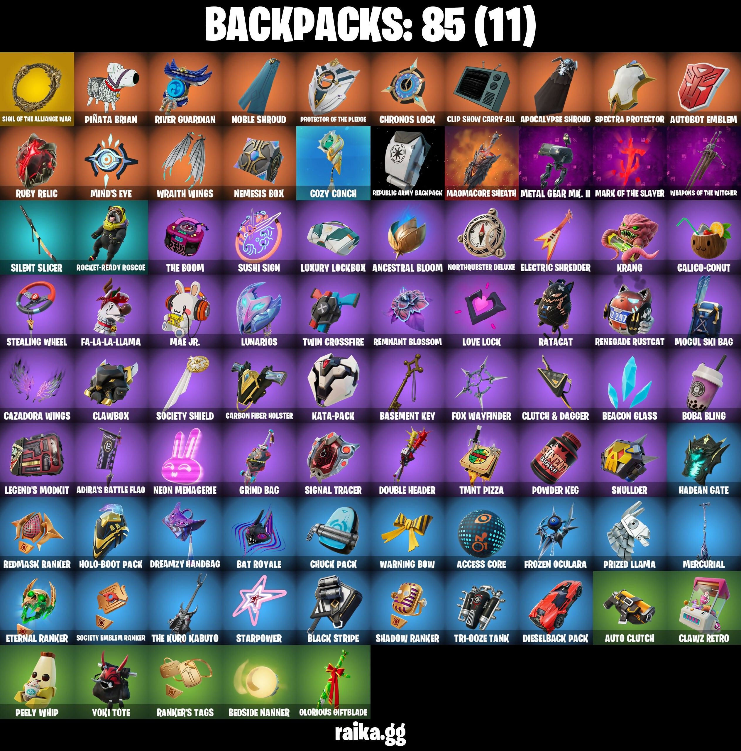 Access Core, Adira's Battle Flag, Adventure Aerial, Ahsoka's Staff, Ancestral Bloom, Antonia, Apocalypse Shroud, Arctic Adeline, Astro Armor, Aura, Auto Clutch, Autobot Emblem, Backup Blades, Balance Board, Basement Key, Basic Basher, Bat Royale, Battle Bloom, Battle-Tested, Beacon Glass, Bedside Nanner, Big Bite, Big Fan, Black Stripe, Board Breaker, Boba Bling, Boba Snack, Boogie Down, Breaking Waves, Bubblegum Highwire, Burning Ambition Valeria, Buzzsaw Breacher, Cacodemon, Calico-Conut, Caper, Carbon Fiber Holster, Card Drop, Cazadora, Cazadora Wings, Challenger's Staff, Chef's Special, Chronos Lock, Chuck Pack, Clawbox, Clawz Retro, Clip Show Carry-All, Clutch & Dagger, Cold Furia, Competitor's Time Brella, Count It!, Cozy Conch, Crack It, Crowning Achievement, Crucible Blade, Crystal, Curling Iron, Cybertronian Axe, Cyclo Curl, Dagger Dance, Dawn Duelist Nisha, Delivery Diver, Designated Hitters, Diamond Throne, Diamondclaw Picker, Dice Roll, Dieselback Pack, Do The 'Split, Double Header, Doze Dab, Dramatic Flares, Dreamzy Handbag, Duelist's Foil, Dumbbell Driver, Dune Scooper, Dusty, Eclipse Brella, Eclipsed Edges, Electric Shredder, Elegance Blade, Elite Servo, Ember Pick, Empress Fan Dance, Eren Jaeger, Eternal Ranker, Evil Plan, Expressionism, Fa-La-La-Llama, Fancy Peter Griffin, Fanged Foresight, Fixation, Flaky Feast, Flashback Breakdown, Flight Risk, Flip Flyer, Focus, Foil Flex, Fox Wayfinder, Foxfire Edge, Frostburn, Frozen Oculora, Get Out Of Your Mind, Glorious Giftblade, Golden Scythe, Good Game, Well Played, Grand Glacier Glider, Grind Bag, Guff Gringle, Gunn-Brella, Hadean Gate, Har-Har-Har!, Harbinger Armor Omegarok, Heart's Carver, Heartbreak Club, Heartbreak Ranger, Heartwinder, Helsie, High Society Glider, High Society Ranker, Holiday Boxy, Holo-Boot Pack, Hope, Hunter's Reach, Hush, Hypnot-Eyes, I'm A Mystery, Ice Breaker, Igni Sign, Imani, Imperial March, Infield Fly, Inflate-A-Roach, It Is Finished, Jackie, Joltara, K.O. Cruiser, Kado Thorne, Kaiju Cutter, Kata-Pack, King Wings, Knife Sharpener, Knight's Helm, Krang, Legend's Modkit, Legendary Blade Of Insight, Lewis Hamilton, Lil' Longboat, Lil' Prancer, Lil' T-6 Shuttle, Lorenzo The Reckless, Lost Meteor, Love Lock, Lucha Slashers, Lunar Glow, Lunar Party, Lunarios, Luxury Lockbox, Mae, Mae Jr., Magmatic Mizuki (Cover-Up Off), Maomagore Sheath, Marauder's Machete, Mariposa, Mark Of The Slayer, Mega-Brella, Mercurial, Metal Gear Mk. II, Metal Team Leader, Mighty Marvel 'Brella, Mind's Eye, Mini Slayer Fistbump, Mogul Master, Mogul Ski Bag, Molten Max Axe, Moonglide, Nana-Brella, Nanner Bashers, Nanner Ringer, Needle Dropper, Nemesis Box, Neon Menagerie, Nezumi, Ninja Stance: Donnie, Ninja Stance: Leo, Ninja Stance: Mikey, Ninja Stance: Raph, Noble Shroud, Nog Ops, Nolan Chance, Nomad's Spear, Northquester Deluxe, Ol' Woody, Old Snake, On, Oopsy Drones-V, Peely Whip, Perfect Pivot, Petercopter, Pinata Brian, Piper Pace, Pit Faller, Pitcycle, Plasmacore Claws, Poacher's Regrets, Point & Shoot, Popular Vibe, Powder Keg, Premiere Poms, Prized Llama, Protector Of The Pledge, Psionic Surfer, Purradise Meowscles, Raider's Wayfarer, Ranker's Tags, Ratacat, Ratacat Roamer, Real Slim Shady, Rebel Brella, Reboot'd Breaker, Redmask Ranker, Reef Cake Fish Thicc, Relik, Remix 'Brella, Remnant Blossom, Renegade Rustcat, Republic Army Backpack, Revenant Rider, Reverie, Reverie's Dreamstaff, Rian, River Guardian, Rocket-Ready Roscoe, Rococo Cloak-O, Rough Cut Montague, Ruby Relic, Runway Racer, Scarlet Longboard, Scout Regiment Salute, Scratchmark Shredder, Secret Scimitars, Shadow Ranker, Shock Brawler Oscar, Shooting Starstaff, Sigil Of The Alliance War, Sigil Of The Empire, Signal Tracer, Silent Slicer, Skull-A-Tron, Skullder, Sky Scout, Skybound Longboard, Skycarver, Sled Ready Guff, Sledgecracker, Slider, Snikt! Snikt!, Snowglobe Smasher, Social Climber, Society Emblem Ranker, Society Shield, Spectra Protector, Spectra Slasher, Spellwork Scimitar, Spin-It Slicer, Splinter's Staff, Standing Bow, Star Wand, Starpower, Stealing Wheel, Storm Crash, Stormcloud, Stray, Stun Knife, Sundae Glider, Sunlit Selene, Surf Witch, Surfin' Bird, Sushi Sign, Swag Shot, Sweet Shot, Sweet!, Swole Salier, Synchronous Sai, Taiko Drumbeat, Take A 'Bow, Tech Axe, The Ageless, The Ashglow Blade, The Boom, The Break Shot, The Destroyer's Destroyer, The Dip, The Gorgonblades, The Iconoclast, The Imagined Blade, The Kuro Kabuto, The McG, The Olympian, The Original Bonk Bunny, The Peerless Parasol, The Scratcher, The Takedown, The Umbrella, This Is Fine, Thrasher Massai, Three-Claw, Thunder, Time Breaker Lil Split, Time Breaker Renegade Lynx, Time Brella, Timesweeper, Titan Strike, Tmnt Pizza, Trace, Traditional Khaby, Trailblazer Tai, Tri-Ooze Tank, Turtle Blimp, Twin Crossfire, Underground Jones, Underworld Desdemona, Unseen Airdrifter, Utility Claymore, Vicious Vintage, Victory Vaunter, Viper School, Vision, Vision Board, Warning Bow, Weapons Of The Witcher, Whispering Wind, Wings Of The Storm, Winter's Onslaught, Winterfest Bushranger, Wintersong Mystica, Wintry Whirligig, Witcher's Steel Sword, Wraith Wings, Yoki Tote