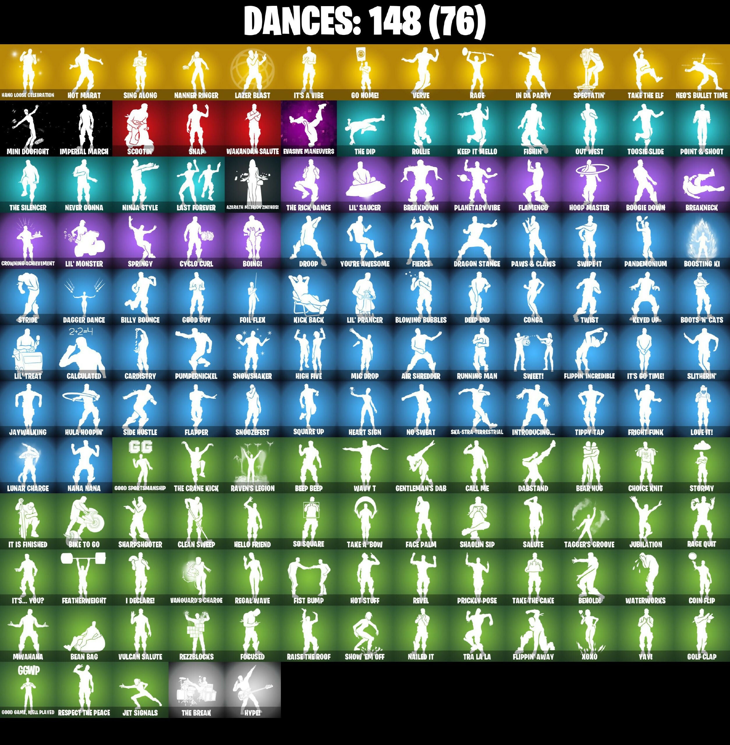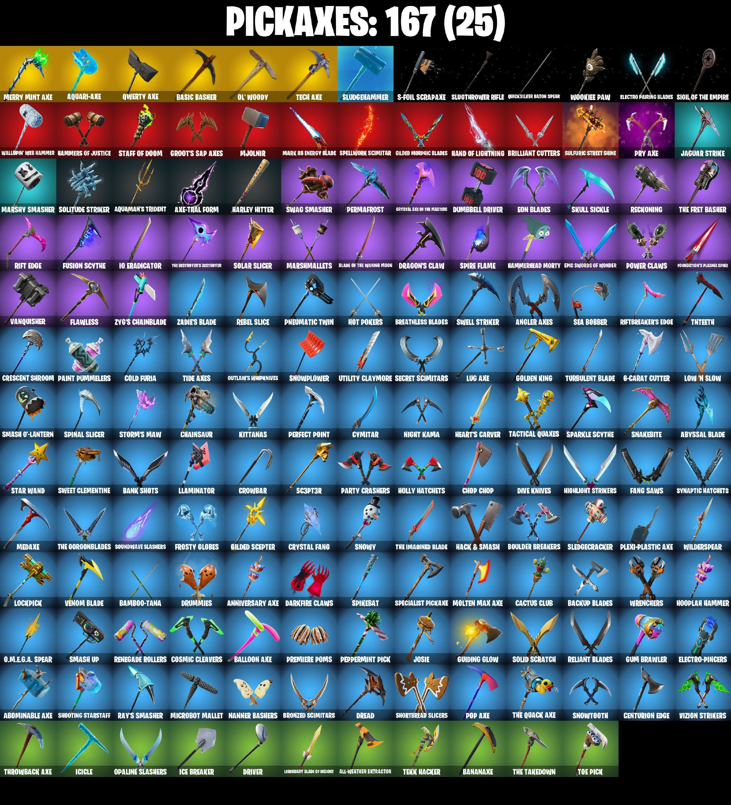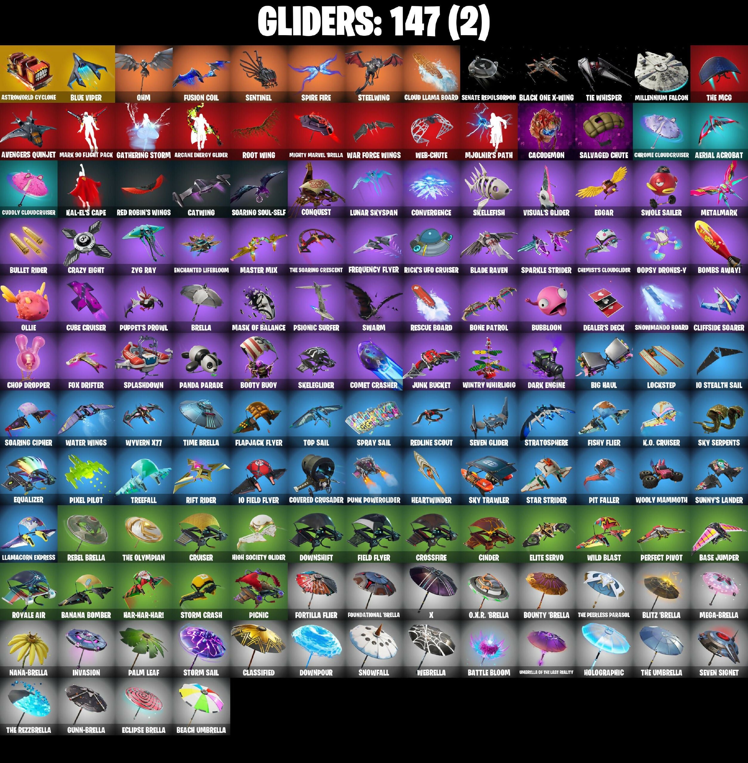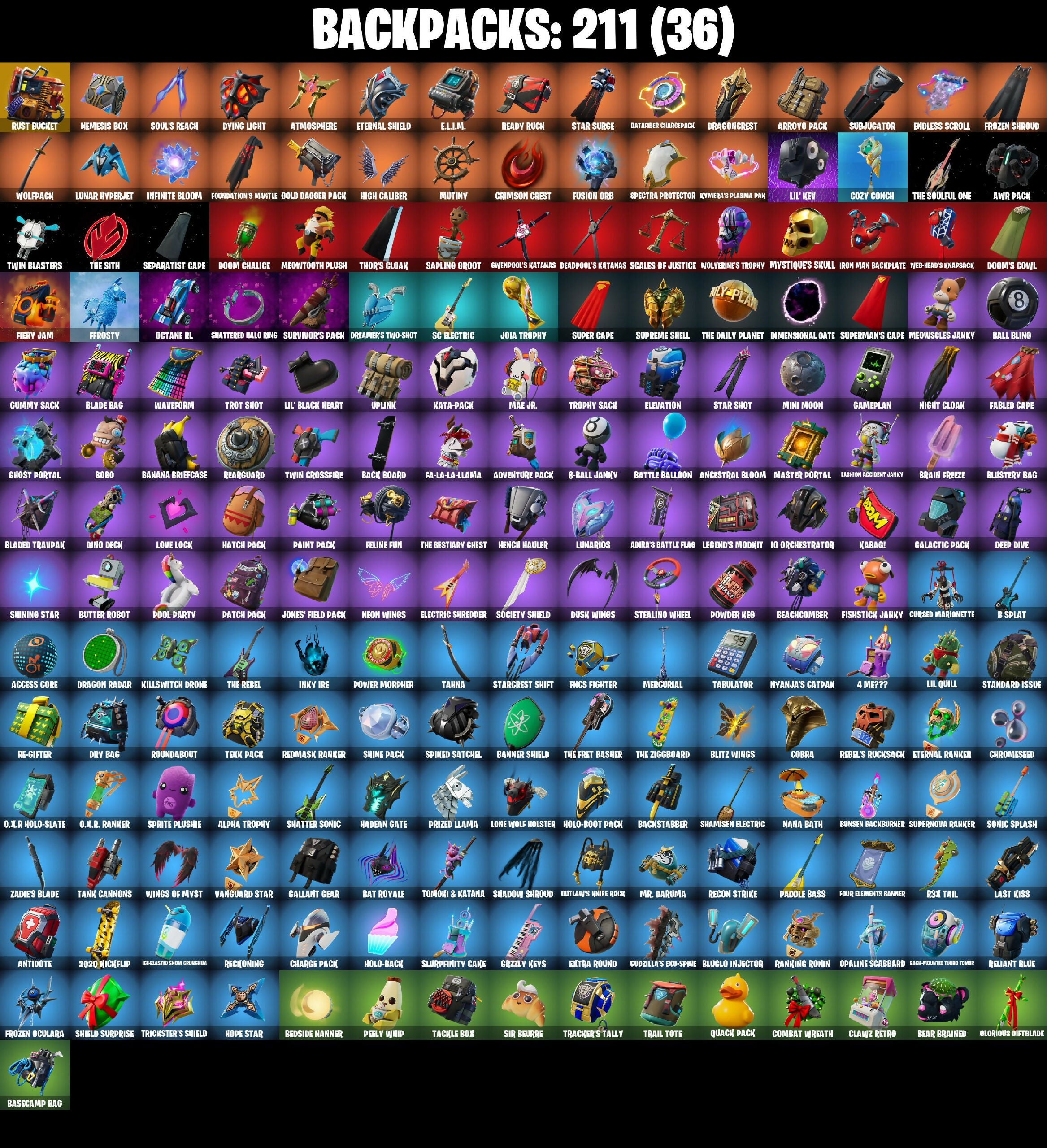10 Eradicator, 10 Field Flyer, 10 Stealth Sail, 2020 Kickflip, 4 Me???, 6-Carat Cutter, 8-Ball Janky, 8-Ball Vs Scratch, A.I.M., AWR Pack, Abominable Axe, Absenz, Abyssal Blade, Access Core, Adira's Battle Flag, Adventure Pack, Aerial Acrobat, Agent Jones, Agent Jones (Jump 31), Agent Peely, Air Shredder, All-Weather Extractor, Alpha Trophy, Always Fantabulous, Ancestral Bloom, Angler Axes, Anniversary Axe, Antidote, Aquaman, Aquaman's Trident, Aquari-Axe, Arcane Energy Glider, Arctic Adeline, Arroyo Pack, Arthur Curry, Astra, Astroworld Cyclone, Atmosphere, Aura, Avengers Quinjet, Axe-Tral Form, Azarath Metrion Zinthos!, B Splat, Back Board, Back-Mounted Turbo Tower, Backstabber, Backup Blades, Ball Bling, Balloon Axe, Bamboo-Tana, Banana Bomber, Banana Briefcase, Bananaxe, Bank Shots, Banner Shield, Base Jumper, Basecamp Bag, Basic Basher, Bat Royale, Battle Balloon, Battle Bloom, Beach Umbrella, Beachcomber, Bean Bag, Bear Brained, Bear Hug, Bedside Nanner, Beep Beep, Behold!, Big Haul, Bike To Go, Billy Bounce, Black Eternal Knight, Black One X-wing, Black Werewolf, Blackheart, Blade Bag, Blade Of The Waning Moon, Blade Raven, Bladed Travpak, Blitz Wings, Blitz ’Brella, Blizzabelle, Blowing Bubbles, Blue Viper, Bluglo Injector, Blustery Bag, Bob Cut, Bobo, Boing!, Bombs Away!, Bone Patrol, Boogie Down, Boosting Ki, Boots 'N Cats, Booty Buoy, Boulder Breakers, Bounty ’Brella, Brain Freeze, Breakdown, Breakneck, Breathless Blades, Brilliant Cutters, Bronzed Scimitars, Bubbloon, Bullet Rider, Bullseye, Bunsen Backburner, Burnoff, Butter Robot, Cacodemon, Cactus Club, Calamity, Calculated, Call Me, Cameo Vs Chic, Cardistry, Catalyst, Catwing, Centurion, Centurion Edge, Chainsaur, Charge Pack, Chemist’s Cloudglider, Choice Knit, Chop Chop, Chop Dropper, Chrome Cloudcruiser, Chromeseed, Cinder, Clark Kent, Classic Wolverine, Classified, Clawz Retro, Clean Sweep, Cliffside Soarer, Cloud Llama Board, Cloud Striker, Cluck, Cluck (Slurpy), Cobra, Coin Flip, Cold Furia, Combat Wreath, Comet Crasher, Conga, Conquest, Convergence, Corrupted, Cosmic Cleavers, Covered Crusader, Cozy Conch, Crazy Eight, Crescent Shroom, Crimson Crest, Crossfire, Crowbar, Crowned, Crowning Achievement, Cruiser, Crystal Axe Of The Masters, Crystal Fang, Cube Cruiser, Cuddly Cloudcruiser, Cursed Marionette, Cyclo Curl, Cyimitar, DJ Yonder, Dabstand, Dagger Dance, Dark, Dark Engine, Darkfire Claws, Datafiber Chargepack, Deadpool, Deadpool's Katanas, Dealer’s Deck, Deep Dive, Deep End, Diamond Diva, Dimensional Oate, Dino Deck, Dire, Dive Knives, Dizzie, Doctor Doom, Doctor Slone, Doctor Slone (Prismatic), Doom Chalice, Doom's Cowl, Downpour, Downshift, Dragon Radar, Dragon Stance, Dragon's Claw, Dragoncrest, Dread, Dreamer's Two-Shot, Drift, Driver, Droop, Droopy, Drummies, Dry Bag, Dumbbell Driver, Dusk, Dusk Knight, Dusk Wings, Dying Light, E.L.I.M., Eclipse Brella, Eggar, Electric Shredder, Electro Pairing Blades, Electro-Pincers, Elevation, Elite Servo, Ember, Enchanted Lifebloom, Endless Scroll, Enforcer, Eon Blades, Epic Swords Of Wonder, Equalizer, Eternal, Eternal Knight, Eternal Ranker, Eternal Shield, Eternal Voyager, Evasive Maneuvers, Extra Round, FNCS Fighter, Fa-La-La-Llama, Fable, Fabled Cape, Face Palm, Fade, Fang Saws, Fashion Accident Janky, Featherweight, Feline Fun, Field Flyer, Fierce, Fiery Jam, Fishin', Fishstick Janky, Fishy Flier, Fist Bump, Fixer, Flamenco, Flapjack Flyer, Flapper, Flawless, Flippin' Away, Flippin' Incredible, Focused, Foil Flex, Fortilla Flier, Foundation's Mantle, Foundation's Plasma Spike, Foundational ’Brella, Four Elements Banner, Fox Drifter, Frequency Flyer, Fright Funk, Frost Squad, Frosty, Frosty Globes, Frozen Oculara, Frozen Shroud, Fusion, Fusion Coil, Fusion Orb, Fusion Scythe, Galactic Pack, Gallant Gear, Gameplan, Gathering Storm, Gear Specialist Maya, Gentleman's Dab, Ghost Portal, Ghoul Trooper, Giddy-Up, Gilded Morphic Blades, Gilded Reality, Gilded Scepter, Glorious Offblade, Go Home!, God Emperor Doom, Godzilla's Exo-Spine, Gold, Gold Brutus, Gold Dagger Pack, Gold Meowscles, Gold Midas, Golden King, Golf Clap, Good Game, Well Played, Good Guy, Good Sportsmanship, Grey, Grizzly Keys, Groot, Groot's Sap Axes, Guff Gringle, Guggimon, Guggimon (Prismatic), Guiding Glow, Gum Brawler, Gumbo, Gummy Sack, Gunn-Brella, Gwenpool's Katanas, Hack & Smash, Hadean Gate, Hammerhead Morty, Hammers Of Justice, Hand Of Lightning, Hang Loose Celebration, Happy Kit, Har-Har-Har!, Harley Hitter, Harley Quinn, Harlowe, Hatch Pack, Haven, Hazard, Headpiece, Heart Sign, Heart's Carver, Heartwinder, Hello Friend, Helmet, Hench Hauler, High Caliber, High Five, High Society Glider, Highlight Strikers, Holiday Boxy, Holly Hatchets, Holo-Back, Holo-Boot Pack, Holographic, Hoodie, Hoop Master, Hooplah Hammer, Hope Star, Hot Marat, Hot Pokers, Hot Stuff, Hula Hoopin', Huntress, Hybrid, Hype!, I Declare!, IO Orchestrator, Ice Breaker, Ice-Blasted Snow Crammer, Icicle, Imperial March, In Da Party, Infinite Bloom, Inky Ire, Introducing..., Invasion, Iris, Iron Man Backplate, It Is Finished, It's Go Time!, It's a Vibe, It's... You?, Jaguar Strike, Jaywalking, Jennifer Walters, Jet Signals, Joey, Joja Trophy, Jones' Field Pack, Josie, Journey Vs Hazard, Jubilation, Jules, Junk Bucket, K.O. Cruiser, Kabag!, Kal-El’s Cape, Kata-Pack, Keep It Mello, Kev, Keyed Up, Kick Back, Killswitch Drone, Kit, Kittanas, Krisabelle, Kymera, Kymera's Plasma Pak, Lara Croft, Lara Groot (Gold Anniversary), Last Forever, Last Kiss, Lazer Blast, Legend's Modkit, Legendary Blade Of Insight, Lil Quill, Lil' Black Heart, Lil' Kev, Lil' Monster, Lil' Prancer, Lil' Saucer, Lil' Treat, Llamacorn Express, Llaminator, Lockpick, Lockstep, Lone Wolf Holster, Love It!, Love Lock, Low 'n Slow, Lt. Evergreen, Lt. John Llama, Lug Axe, Lunar Charge, Lunar Hyperjet, Lunar Skyspan, Lunarios, Luxe, Mae Jr., Major Glory, Mark 85 Energy Blade, Mark 90 Flight Pack, Marshmallets, Marshy Smasher, Mask, Mask Of Balance, Mask 