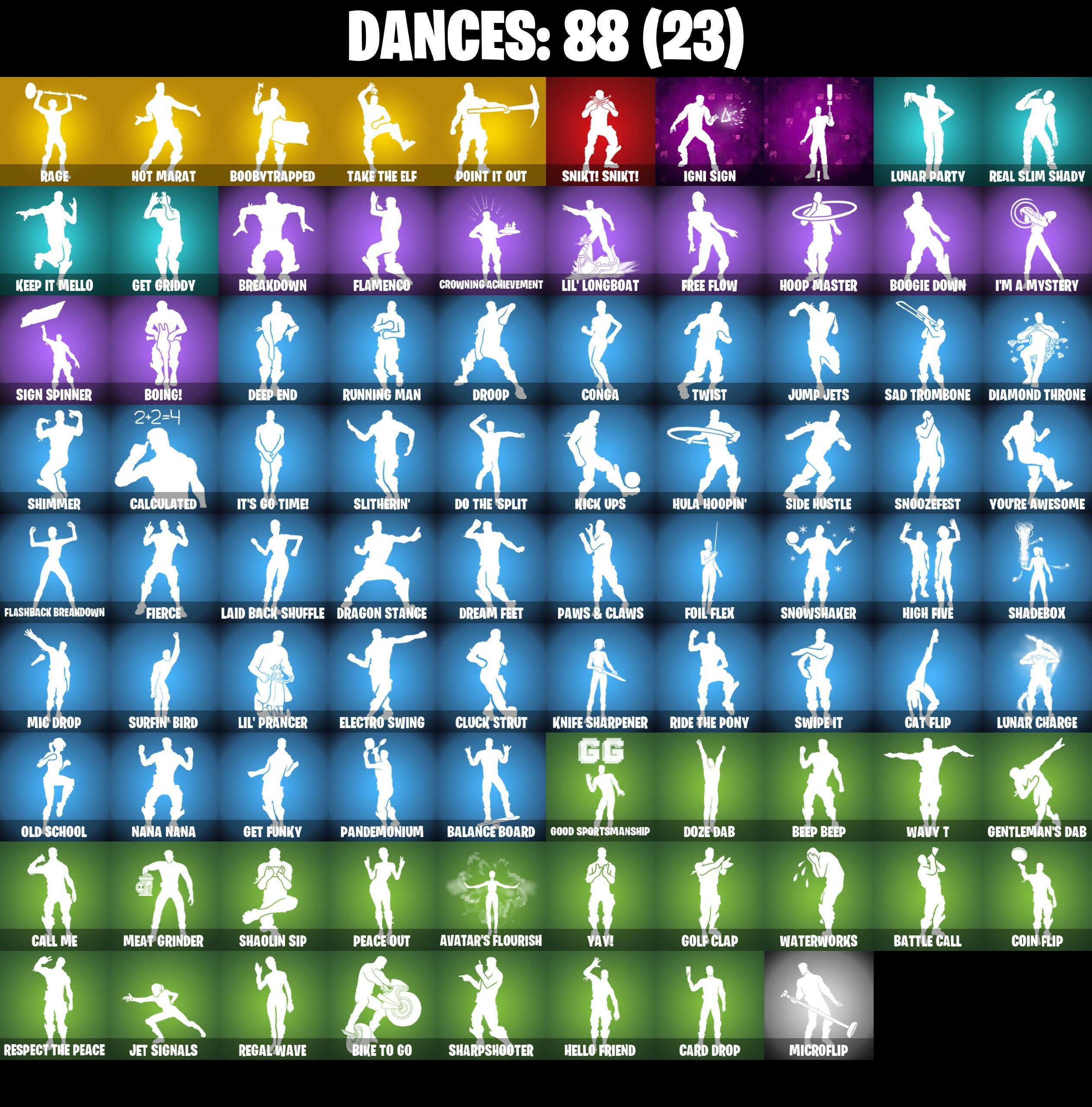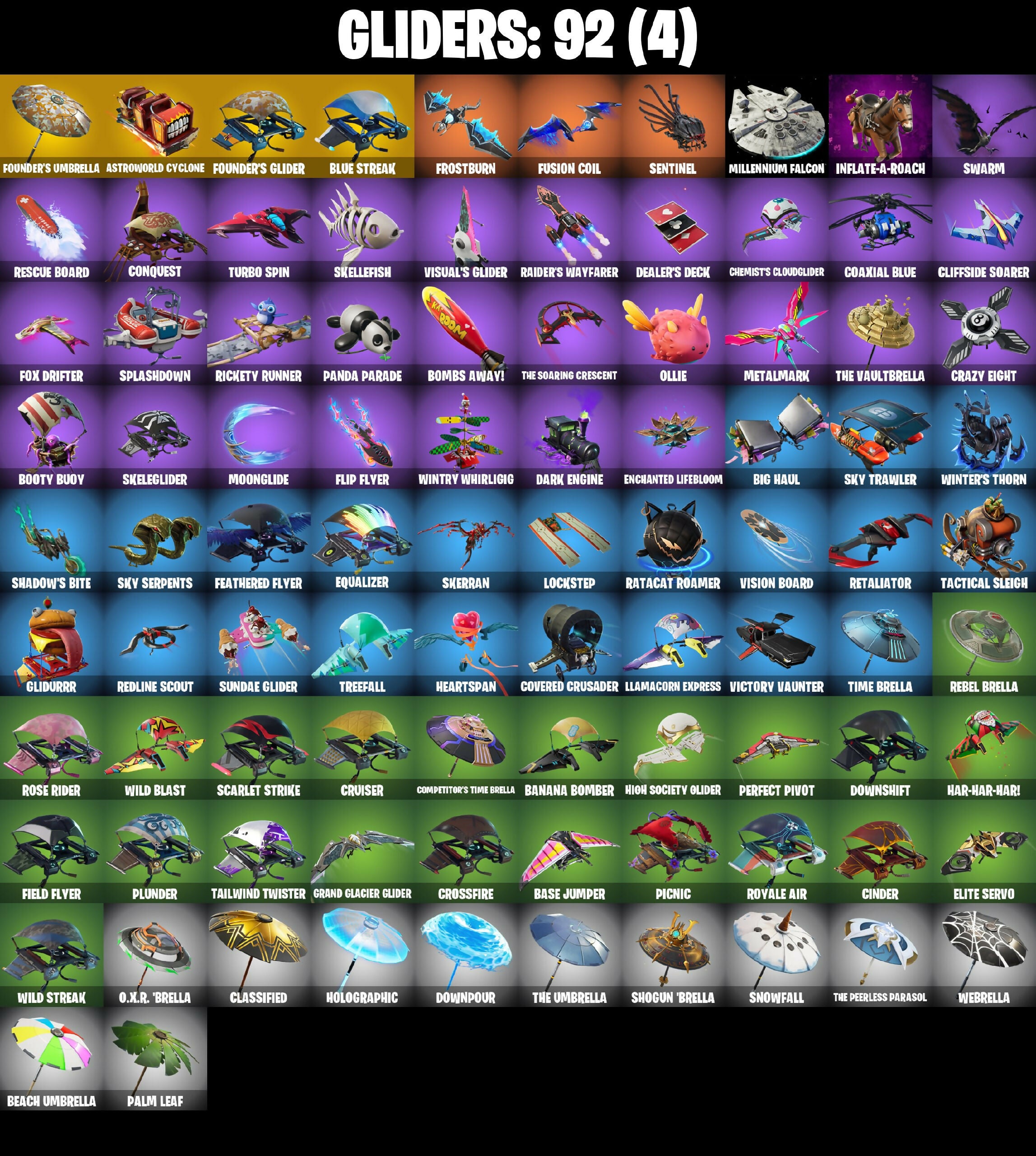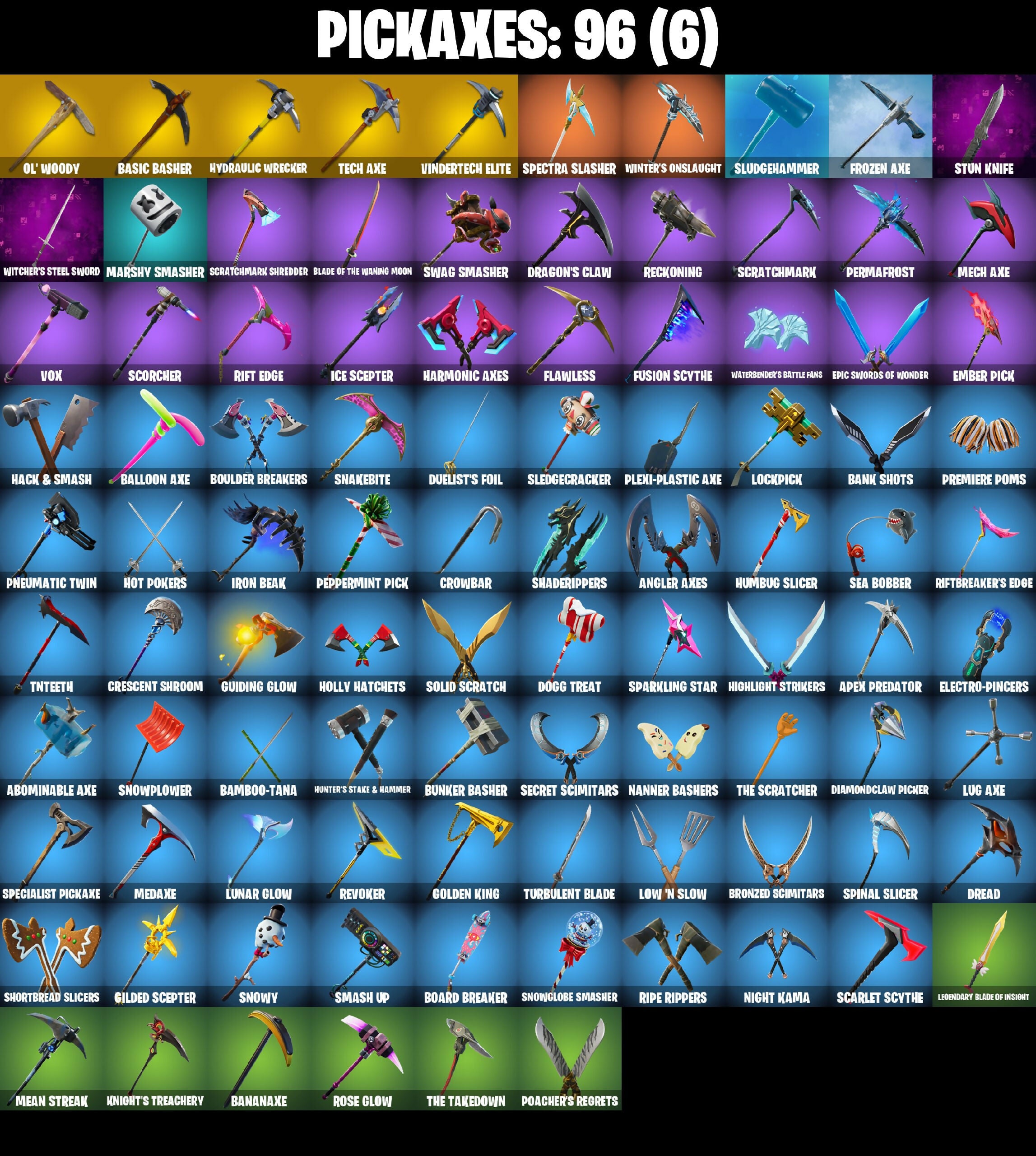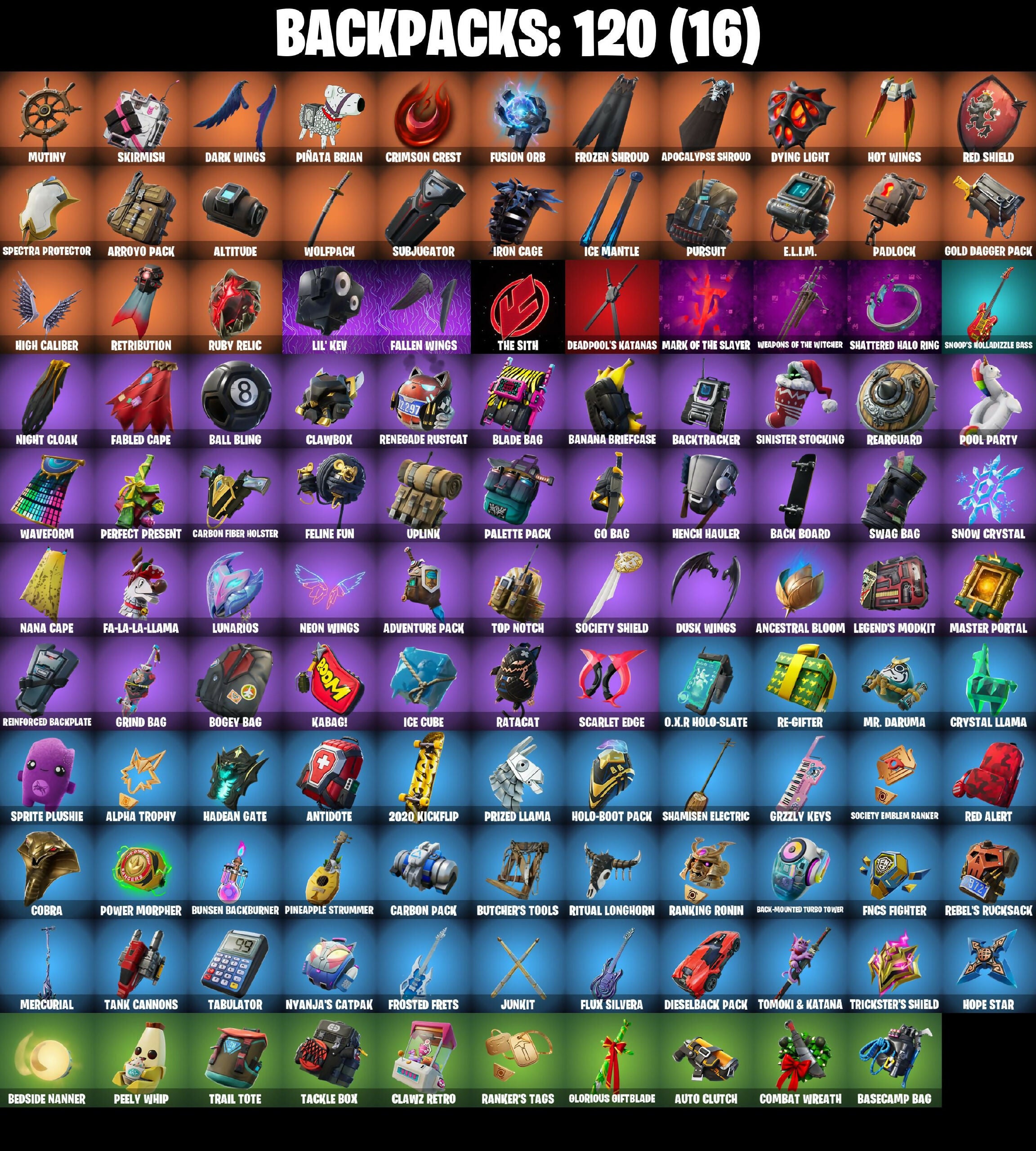 2020 Kickflip, 8-Ball VS Scratch, A.I.M., Abominable Axe, Adventure Pack, Agent Peely, Alpha Trophy, Altitude, Ancestral Bloom, Angler Axes, Antidote, Apex Predator, Apocalypse Shroud, Arctic Adeline, Arroyo Pack, Astroworld Cyclone, Auto Clutch, Avatar's Flourish, Back Board, Back-Mounted Turbo Tower, Backtracker, Balance Board, Ball Bling, Balloon Axe, Bamboo-Tana, Banana Bomber, Banana Briefcase, Bananaxe, Bank Shots, Base Jumper, Basecamp Bag, Basic Basher, Battle Bus Balloon, Battle Call, Beach Umbrella, Bedside Nanner, Beep Beep, Big Haul, Bike To Go, Black Werewolf, Blackheart, Blade Bag, Blade Of The Waning Moon, Blue Streak, Blue Team Leader, Board Breaker, Bogey Bag, Boing!, Bombs Away!, Boobytrapped, Boogie Down, Booty Buoy, Boulder Breakers, Breakdown, Brite Bomber, Bronzed Scimitars, Brutus, Bullseye, Bunker Basher, Bunker Jonesy, Bunsen Backburner, Burning Ambition Valeria, Butcher's Tools, Calamity, Calculated, Call Me, Cameo VS Chic, Carbon Commando, Carbon Fiber Holster, Carbon Pack, Card Drop, Cat Flip, Cerberus, Chemist's Cloudglider, Cinder, Classified, Clawbox, Clawz Retro, Cliffside Soarer, Clinical Crosser, Cluck Strut, Coaxial Blue, Cobalt, Cobra, Coin Flip, Combat Wreath, Competitor's Time Brella, Conga, Conquest, Corrupted, Covered Crusader, Crazy Eight, Crescent Shroom, Crimson Crest, Crossfire, Crowbar, Crowning Achievement, Cruiser, Crystal Llama, DJ Yonder, Dark, Dark Engine, Dark Wings, Dawn Duelist Nisha, Deadpool, Deadpool's Katanas, Dealer's Deck, Deep End, Demi, Diamond Throne, Diamondclaw Picker, Dieselback Pack, Dire, Do The 'Split, Dogg Treat, Downpour, Downshift, Doze Dab, Dragon Stance, Dragon's Claw, Dread, Dream Feet, Drift, Droop, Duelist's Foil, Dusk, Dusk Wings, Dying Light, E.L.I.M., Electro Swing, Electro-Pincers, Elite Servo, Ember, Ember Pick, Enchanted Lifebloom, Enforcer, Epic Swords Of Wonder, Equalizer, FNCS Fighter, Fa-La-La-Llama, Fable, Fabled Cape, Fallen Love Ranger, Fallen Wings, Fancy Peter Griffin, Feathered Flyer, Feline Fun, Field Flyer, Fierce, Flamenco, Flashback Breakdown, Flawless, Flip Flyer, Flux Silvera, Foil Flex, Founder's Glider, Founder's Umbrella, Fox Drifter, Free Flow, Frostburn, Frosted Frets, Frozen Axe, Frozen Shroud, Fusion, Fusion Coil, Fusion Orb, Fusion Scythe, Gear Specialist Maya, Gentleman's Dab, Geralt Of Rivia, Get Funky, Get Griddy, Giddy-Up, Gilded Scepter, Glidurr, Glorious Giftblade, Go Bag, Gold, Gold Dagger Pack, Golden King, Golf Clap, Good Sportsmanship, Grand Glacier Glider, Grind Bag, Grzzly Keys, Guiding Glow, Hack & Smash, Hadean Gate, Har-Har-Har!, Harbinger Armor Omegarok, Harmonic Axes, Heartspan, Hello Friend, Hench Hauler, High Caliber, High Five, High Society Glider, Highlight Strikers, Holiday Boxy, Holly Hatchets, Holo-Boot Pack, Holographic, Hoop Master, Hope, Hope Star, Hot Marat, Hot Pokers, Hot Wings, Hula Hoopin', Humbug Slicer, Hunter's Stake & Hammer, Huntress, Hybrid, Hydraulic Wrecker, I'm A Mystery, Ice Cube, Ice Mantle, Ice Scepter, Igni Sign, Inflate-A-Roach, Iron Beak, Iron Cage, It's Go Time!, Jet Signals, Journey VS Hazard, Jump Jets, Junkit, Kabag!, Keep It Mello, Kick Ups, Knife Sharpener, Knight's Helm, Knight's Treachery, Korra, Laguna, Laid Back Shuffle, Legend's Modkit, Legendary Blade Of Insight, Lil Split, Lil' Kev, Lil' Longboat, Lil' Prancer, Llamacorn Express, Lockpick, Lockstep, Low 'N Slow, Lt. Evergreen, Lug Axe, Lunar Charge, Lunar Glow, Lunar Party, Lunarios, Luxe, Lynx, Mark of the Slayer, Marked Marauder, Marshy Smasher, Mask, Mask Off, Massai, Master Key, Master Portal, Mean Streak, Meat Grinder, Mech Axe, Medaxe, Meowscles, Mercurial, Metalmark, Mic Drop, Microflip, Millennium Falcon, Montague, Moonglide, Mr. Daruma, Mutiny, Nana Cape, Nana Nana, Nanner Bashers, Neon Wings, Night Cloak, Night Kama, Nightshade, Nisha, Nyanja's Catpak, O.X.R Holo-Slate, O.X.R. 'Brella, Ol' Woody, Old School, Ollie, Omegarok, Onesie, Oscar, Padlock, Palette Pack, Palm Leaf, Panda Parade, Pandemonium, Paws & Claws, Peace Out, Peely, Peely Whip, Peppermint Pick, Perfect Pivot, Perfect Present, Permafrost, Peter Griffin, Picnic, Pineapple Strummer, Piñata Brian, Plexi-Plastic Axe, Plunder, Pneumatic Twin, Poacher's Regrets, Point It Out, Pool Party, Powder, Power Morpher, Premiere Poms, Prized Llama, Prodigy, Pursuit, Rage, Ragnarok, Raider's Wayfarer, Ranker's Tags, Ranking Ronin, Ratacat, Ratacat Roamer, Ravage, Raven, Re-Gifter, Real Slim Shady, Rearguard, Rebel Brella, Rebel's Rucksack, Reckoning, Red Alert, Red Knight, Red Shield, Red-Nosed Raider, Redline, Redline Scout, Regal Wave, Reinforced Backplate, Remedy VS Toxin, Renegade Lynx, Renegade Rustcat, Rescue Board, Respect The Peace, Retaliator, Retribution, Revoker, Rickety Runner, Ride The Pony, Rift Edge, Riftbreaker's Edge, Ripe Rippers, Rippley VS Sludge, Ritual Longhorn, Ronin, Rook, Rose Glow, Rose Rider, Rose Team Leader, Rough Cut Montague, Rox, Royale Air, Ruby, Ruby Relic, Ruin, Running Man, Runway Racer, Sad Trombone, Scarlet Defender, Scarlet Edge, Scarlet Scythe, Scarlet Strike, Scorcher, Scratchmark, Scratchmark Shredder, Sea Bobber, Secret Scimitars, Selene, Sentinel, Sgt. Winter, Shadebox, Shaderippers, Shadow's Bite, Shamisen Electric, Shanta, Shaolin Sip, Sharpshooter, Shattered Halo Ring, Shimmer, Shock Brawler Oscar, Shogun 'Brella, Shortbread Slicers, Side Hustle, Sidewinder, Sign Spinner, Singularity, Sinister Stocking, Skeleglider, Skellefish, Skerran, Skirmish, Skull Ranger, Sky Serpents, Sky Trawler, Skye, Sled Ready Guff, Sledgecracker, Sledgehammer, Slitherin', Sludgehammer, Smash Up, Snakebite, Snikt! Snikt!, Snoop's Holladizzle Bass, Snoozefest, Snorkel Ops, Snow Crystal, Snowfall, Snowglobe Smasher, Snowplower, Snowshaker, Snowy, Society Emblem Ranker, Society Shield, Solid Scratch, Sparkling Star, Specialist Pickaxe, Spectra Knight, Spectra Protector, Spectra Slasher, Spinal Slicer, Splashdown, Sprite Plushie, Stage 4, Stage 4 - No Ponytail, Stage 5, Stage 6 - No Shoulder Pad, S