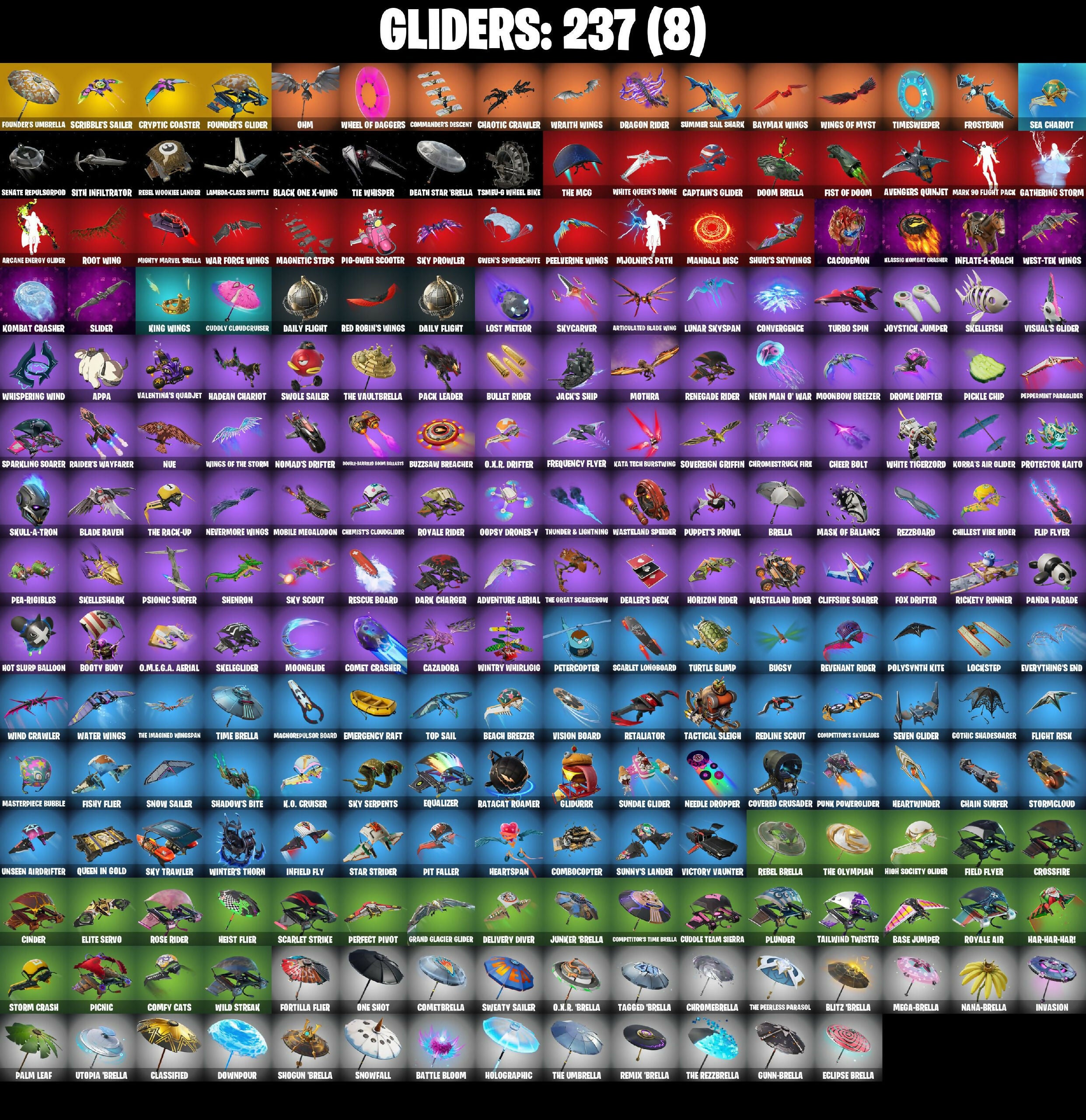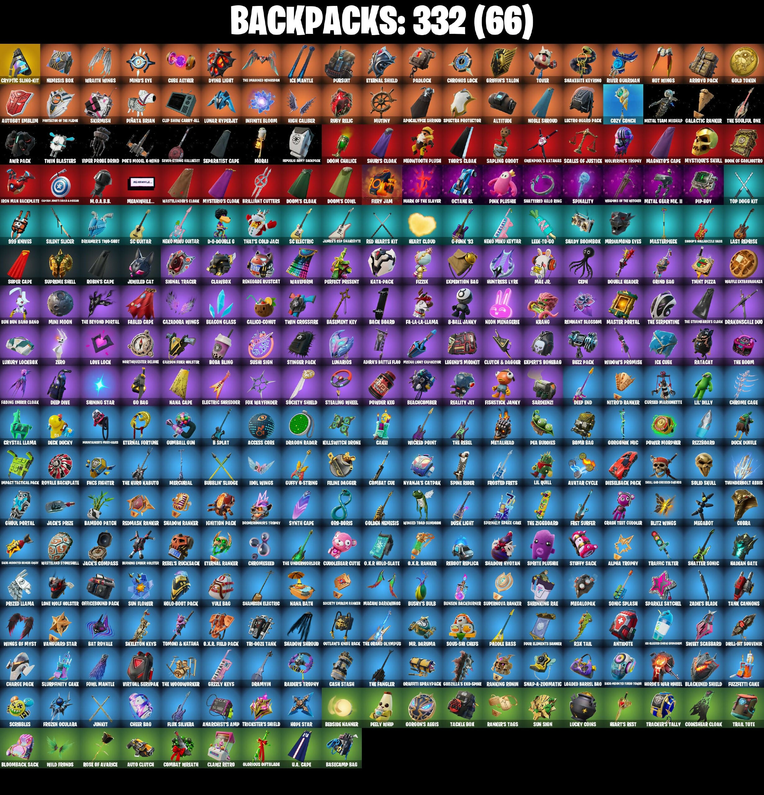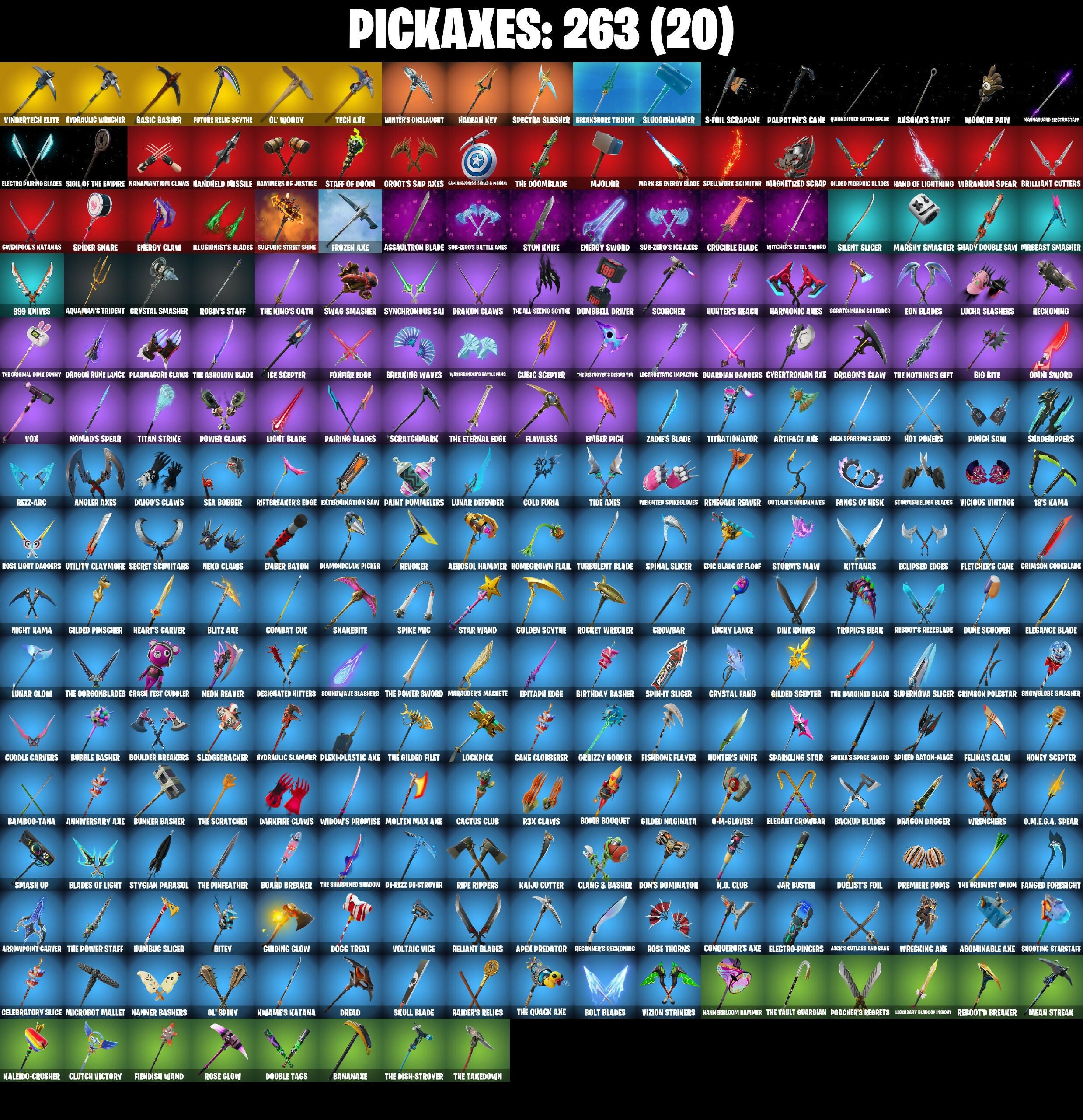 (Snikt!), 1-Ball, 18's Kama, 8-Ball Janky, 999 Knives, AFK, AWR Pack, Abominable Axe, Access Core, Adira, Adira's Battle Flag, Adventure Aerial, Aerial Assault Bomber, Aerosol Hammer, Agent Patch, Ahsoka Tano, Ahsoka's Staff, Air Horn, Air Shredder, Alpha Trophy, Altitude, Anarchist's Amp, Andy Fangerson, Angler Axes, Anniversary Axe, Antidote, Antonia, Apex Predator, Aphrodite, Apocalypse Shroud, Appa, Apprentice Evil, Aquaman, Aquaman's Trident, Arachromatics, Arcane Energy Glider, Arcane Research, Arctic Adeline, Arrowpoint Carver, Arroyo Pack, Artemis, Arthur Curry, Articulated Blade Wing, Artifact Axe, Ascension Nezomi, Ash Thicc, Assalutron Blade, Astra, Astro Armor, Aurelian, Auto Clutch, Autobot Emblem, Avatar Cycle, Avatar's Flourish, Avengers Quinjet, Aw, Shucks., Ayla Winn, B Splat, Back Board, Back-Mounted Turbo Thump, Backbeat Bow, Backup Blades, Balance Board, Balanced, Bamboo Patch, Bamboo-Tana, Bananaxe, Barbara Carpenter, Baron's Hoard, Base Jumper, Basecamp Bag, Basement Key, Basic Basher, Bat Royale, Battle Blessing, Battle Bloom, Battle Bus Balloon, Battle Call, Battle Gamer Mae, Battle-Tested, Baymax Wings, Beach Breezer, Beachcomber, Beacon Glass, Bear Hug, Beast Blastin', Beatzbunny, Bedside Manner, Beep Beep, Behold!, Benzo The Destroyer, Bi-Han, Big Bite, Big Dill, Big Fan, Bike To Go, Birdarang Flourish, Birthday Basher, Bitey, Black Knight (The Original Skin), Black One X-Wing, Black Panther (Sword), Black Queen, Blackened Shield, Blackheart, Blade, Blade Raven, Blades of Light, Blazing Fire Cerberus, Blitz 'Brella, Blitz Axe, Blitz Wings, Blizzard Bomber, Bloomback Sack, Blowin' Up, Board Breaker, Boba Bling, Boba Snack, Bolt Blades, Bomb Bag, Bomb Bouquet, Bone Breaker, Bones, Boobytrapped, Boogie Down, Book of Cagliostro, Boop!, Boosting KI, Booty Buoy, Boulder Breakers, Bovi Go, Breaking Waves, Breakshore Trident, Brella, Brilliant Cutters, Brit Hatune Minu, Brite Moves, Bubble Basher, Bubblegum Highwire, Bubblin' Sludge, Bugsy, Bullet Rider, Bun Bun Bano Bano, Bunker Basher, Bunker Jonesy, Bunsen Backburner, Burning Amber, Burning Ember Holster, Bushy's Bulb, Buzz Pack, Buzzsaw Breacher, Bytes, Cacodemon, Cactus Club, Cake Clobberer, Cake!, Calamity, Calico-Conut, Call Me, Called Shot, Camo War Machine, Captain Elamerica, Captain James T. Kirk & McKirk, Captain John's Dead's Buckler, Captain Jones, Captain Phasma, Captain's Glider, Carbon Fiber Holster, Card Drop, Cash Stash, Cassidy Quinn, Cat-Flip, Catwoman Comic Cover Outfit, Cauldron Chill, Cazadora, Cazadora Wings, Celebratory Slice, Ceph, Cerberus, Chain Surfer, Chalked Up 1-Ball, Champion Siren, Chaos Director, Chaotic Crawler, Charge Pack, Charging Up, Check The Map, Cheer Bag, Cheer Bolt, Chef's Special, Chemist's Cloudglider, Chess Master, Chillest Vibe Rider, Chrombrella, Chrome Cage, Chrome Punk, Chromeseed, Chromestruck Fire, Chronos Lock, Cinder, Clang & Basher, Classic Kombat Crusher, Classic Peelverine, Classic Wolverine, Classified, Clawbox, Clawz Retro, Cliffside Soarer, Clip Show Carry-All, Clone Trooper, Club President Alex, Cluck Strut, Clutch & Dagger, Clutch Victory, Cobra, Codeshear Cloak, Codsworth's Cleanup, Cold Blooded Ace, Cold Furia, Collector Radd Tajhree, Combat Clue, Combat Cue, Combat Elite, Combat Wreath, Combocopter, Comet Crasher, Cometbrella, Comfy Cats, Commander's Descent, Competitor's Skyblades, Competitor's Time Brella, Conch Call, Conga, Conjure Weapon, Conqueror's Axe, Conqueror's Claim, Convergence, Cosmic Legacy, Count It!, Couple Team Specialist, Covered Crusader, Cozy Conch, Crab Walkin', Crack It, Crash Test Cuddler, Crimson Codeblade, Crimson Polestar, Crossfire, Crowbar, Crowning Achievement, Crucible Blade, Cryptic Coaster, Cryptic Sling-Kit, Crystal, Crystal Fang, Crystal Llama, Crystal Smasher, Cube Aether, Cubic Scepter, Cuddle Carvers, Cuddle King, Cuddle Team Sierra, Cuddlebear Cutie, Cuddly Cloudcruiser, Curling Iron, Cursed Jack Sparrow, Cursed Marionette, Cybertronian Axe, Cyborg, Cyclo Curl, D-O-Double G, DJ Yonder, Dagger Dance, Daido, Daigo's Claws, Daily Flight, Dancefloor Diva, Dark, Dark Charger, Dark Gwenpool, Dark-Mounted Hood Army, Darkfire Claws, Darklings Dirts Raider, Darth Vader, Dawn Duelist Nisha, De-Rezz De-Stroyer, Dealer's Deck, Death Star 'Brella, Deck Ducky, Deep Dive, Deep End, Delivery Diver, Demon Hunter Hope, Denied., Detonated Hitters, Diamond Throne, Diamondclaw Picker, Dice Roll, Diddy Jo, Die With A Smile, Die With It, Dieselback Pack, Dillinger The Reerk, Dino Megazord, Dirtbike Challenge, Disassemble, Disc Spartan, Diva Fever, Dive Knives, Do The Split, Doctor Doom, Doctor Strange, Dogg Treat, Don's Dominator, Doom, Doom Brella, Doom Chalice, Doom Slayer, Doom's Cloak, Doom's Cowl, Doom's Domain, Double Header, Double Tags, Downpour, Doze Dab, Dr Myetta & Small Simon, Dragon Claws, Dragon Dagger, Dragon Dagger's Song, Dragon Radar, Dragon Rider, Dragon Rune Lance, Dragon Stance, Dragon Steel Hybrid, Dragon's Claw, Dramatic Flares, Dramvin, Draxonscale Duo, Dread, Dreamer's Two-Shot, Drill-Bit Souvenir, Drome Drifter, Dromedariners Trophy, Droop, Drum Major, Duck Duffle, Duelist's Card Trick, Duelist's Foil, Dumbbell Driver, Dune Scooper, Durrr Taisho, Dusk Knight, Dusk Light, Dusty, Dying Light, Dynamo Tntina, Dynamo Tntona-A, Eagle, Eclipse Brella, Eclipsed Edges, Electric Shredder, Electro Pairing Blades, Electro-Pincers, Elegance Blade, Elegant Crowbar, Elite Servo, Elven, Elysian Artemis, Ember, Ember Baton, Ember Pick, Emergency Raft, Emma Frost, Empress-San Dance, Energized Godzilla, Energy Claw, Energy Sword, Eon Blades, Epic Blade of Floof, Epitaph Edge, Equalizer, Era, Eren Jaeger, Erisa, Eternal Fortune, Eternal Knight, Eternal Ranker, Eternal Shield, Everything's End, Evie, Expedition Bag, Expert's Bonebag, Expressionism, Extermination Saw, FNCS Fighter, Fa-La-La-Llama, Fabled Cape, Fade, Fading Ember Cloak, Fancy Peter Griffin, Fang Dance, Fanged Foresight, Fangs of Hesk, Feel The Force, Felina, Felina's C