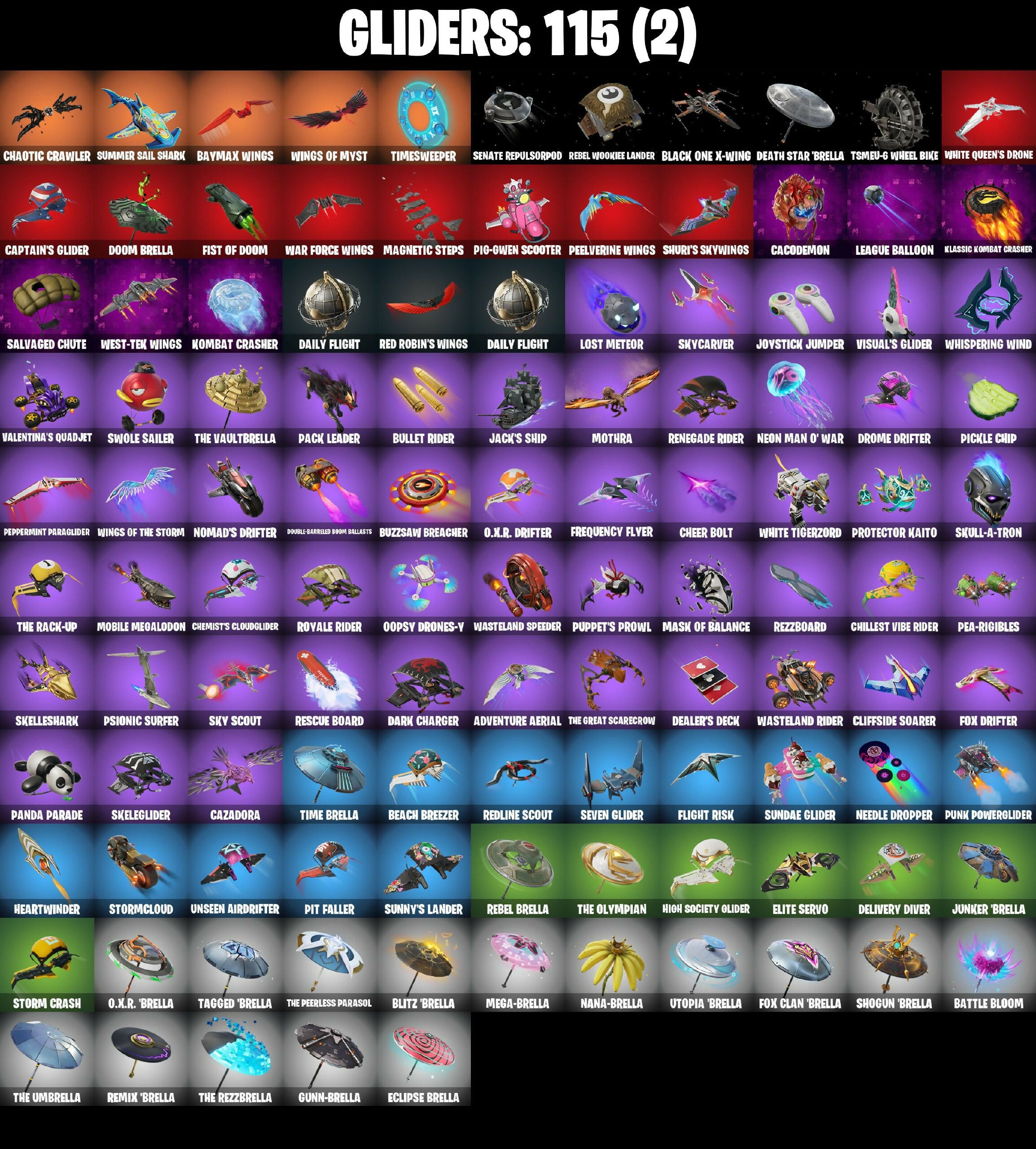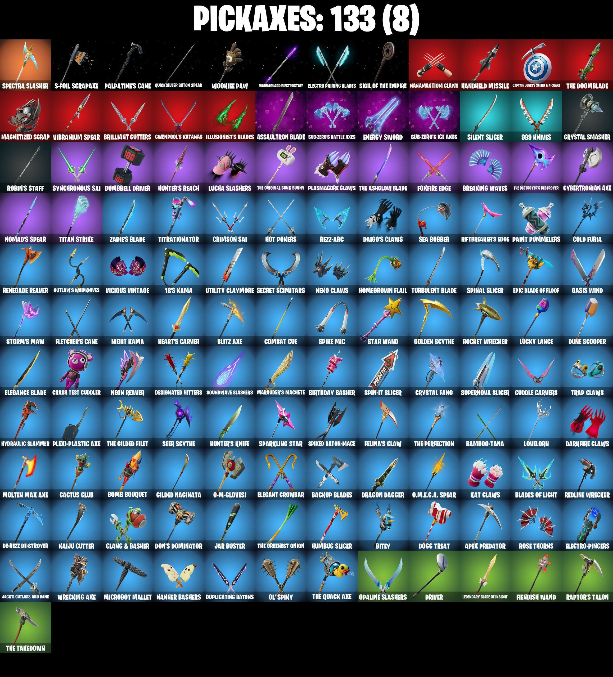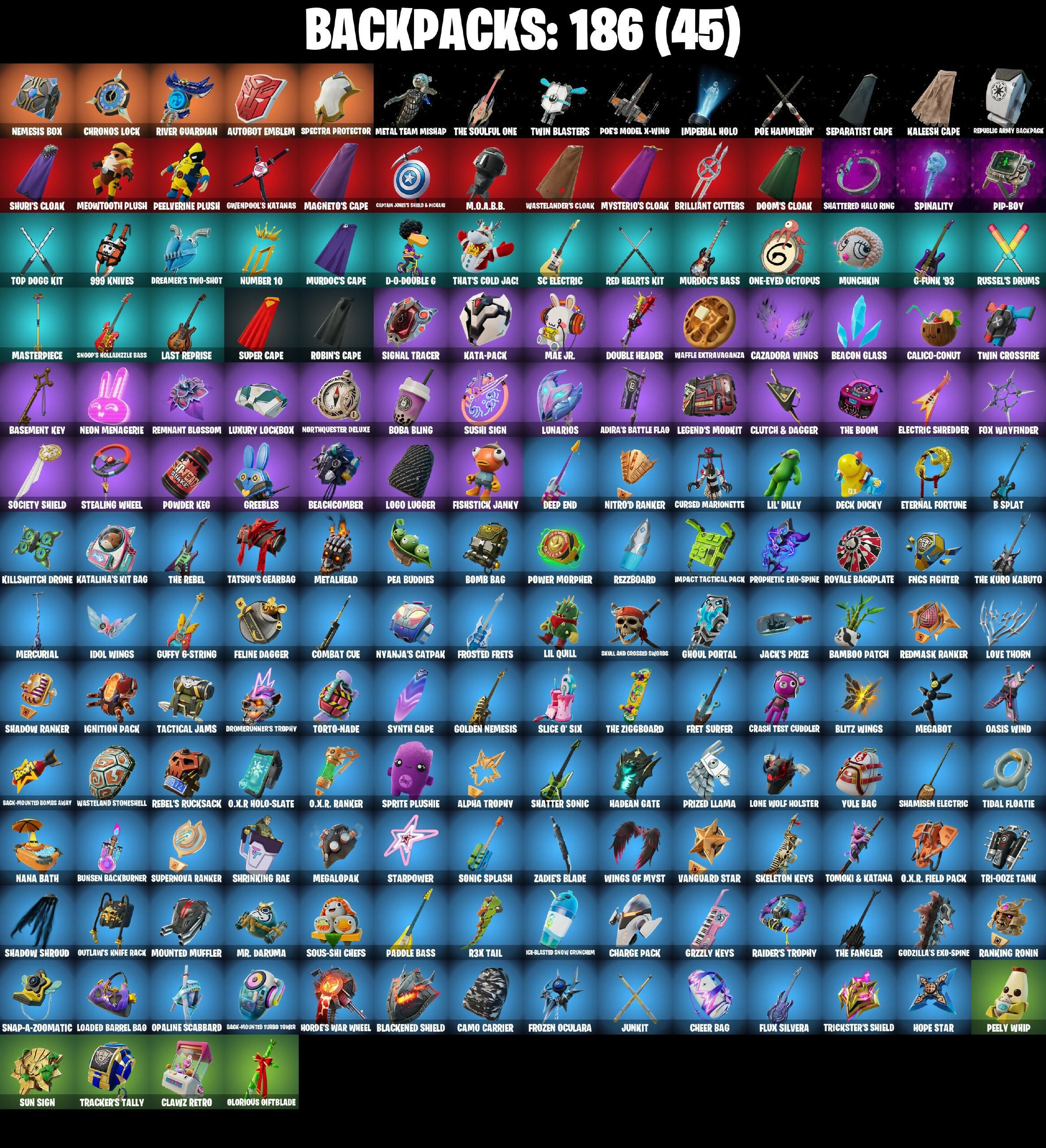 !Eclipse Brella, (Snikt!), 1-Ball, 18's Kama, 999 Knives, Adira's Battle Flag, Adventure Aerial, Aerial Assault Bomber, Agent Patch, Alpha Trophy, Andy Fangerson, Antonia, Apex Predator, Apprentice Evie, Arcane Research, Assaultron Blade, Augury, Aura, Autobot Emblem, Aw, Shucks., B Splat, Back-Mounted Bombs Away!, Back-Mounted Turbo Tower, Backup Blades, Bamboo Patch, Bamboo-Tana, Baron's Hoard, Basement Key, Battle Blessing, Battle Bloom, Battle Gamer Mae, Baymax Wings, Beach Breezer, Beachcomber, Beacon Glass, Bernie, Bi-Han, Big Dill, Bike To Go, Birdarang Flourish, Birthday Basher, Bitey, Black One X-Wing, Black Panther (Shuri), Black Queen, Blackened Shield, Blades Of Light, Blitz 'Brella, Blitz Axe, Blitz Wings, Block Egret T-60 Power Armor, Boba Bling, Bomb Bag, Bomb Bouquet, Boogie Down, Breaking Waves, Brilliant Cutters, Brite Moves, Brite Raider, Bullet Rider, Bunsen Backburner, Burnoff, Buzz Beat, Buzzsaw Breacher, Cacodemon, Cactus Club, Calico-Conut, Call Me, Camo Carrier, Camo War Machine, Captain America's Shield & Pickaxe, Captain Jones, Captain Jones (Pen & Ink), Captain Jones's Shield & Pickaxe, Captain Lamerica, Captain's Glider, Cassidy Quinn, Cauldron Chill, Cazadora, Cazadora Wings, Chalked Up 1-Ball, Chaos Director, Chaotic Crawler, Charge Pack, Cheer Bag, Cheer Bolt, Chef's Special, Chemists Cloudglider, Chillest Vibe Rider, Chord Kahele, Chronos Lock, Clang & Basher, Classic Peelverine, Clawz Retro, Clean Sweep, Cliffside Soarer, Clix, Clix Groove, Clutch & Dagger, Codsworth's Cleanup, Cold Furia, Combat Cue, Count It!, Crack It, Crash Test Cuddler, Crimson Sai, Crowning Achievement, Crystal Fang, Crystal Smasher, Cuddle Carvers, Cursed Marionette, Cybertronian Axe, D-O-Double G, Daigo, Daigo's Claws, Daily Flight, Danica, Dark Charger, Darkfire Claws, Darklands Brite Raider, De-Rezz De-Stroyer, Dealer's Deck, Dealm Cassidy Quinn, Death Star 'Brella, Deck Ducky, Deep End, Delivery Diver, Demon Hunter Hope, Designated Hitters, Dice Roll, Die With A Smile, Die With A Smile Bruno, Dill With It, Dillinger The Other, Dino Megazord, Disassemble, Dogg Treat, Don's Dominator, Doom, Doom Brella, Doom's Cloak, Doom's Domain, Double Barrelled Boom Ballasts, Double Header, Dragon Dagger, Dragon Dagger's Song, Dramatic Flares, Dreamer's Two-Shot, Driver, Drome Drifter, Dromerunner's Trophy, Duelist's Card Trick, Dumbbell Driver, Dune Scooper, Dupli-Kate, Duplicating Batons, Duplikates, Durrr Taisho, Dusk Knight, Dynamo TNTona-H, Dynamo Tntina, Electric Shredder, Electro Pairing Blades, Electro-Pincers, Elegance Blade, Elegant Crowbar, Eleven, Elite Servo, Emma Frost, Emperor Palpatine, Energized Godzilla, Energy Sword, Epic Blade Of Floof, Era, Eren Jaeger, Eternal Fortune, Explorer Emilie, Expressionism, FNCS Fighter, Fang Dance, Feel The Force, Felina, Felina's Claw, Feline Dagger, Fiendish Wand, Fire Show, Fireworks Salvo, Fish Thicc, Fishstick Janry, Fist Bump, Fist Of Doom, Flaky Feast, Flashback Breakdown, Fletcher Kane, Fletcher's Cane, Flight Risk, Flippin' Away, Flux Silvera, Foil Flex, For O.X.R!, Force Lightning, Fox Clan 'Brella, Fox Drifter, Fox Wayfinder, Foxfire Edge, Frequency Flyer, Fret Surfer, Frosted Frets, Frozen Oculara, Frozen Treat Cart, Full Moon Fletcher Kane, G-Funk '93, General Grievous, General's War Table, Get Griddy, Get Out Of Your Mind, Ghoul Portal, Gilded Naginata, Glorious Giftblade, Godzilla Evolved, Godzilla's End-Spine, Golden Nemesis, Golden Scythe, Good Sportsmanship, Greebles, Green Ranger, Grizzly Keys, Guffy 6-String, Gunn-Brella, Gwen-Step, Gwenpool, Gwenpool's Katanas, Hadean Gate, Hairpin, Handheld Missile, Haylee Skye, Heart Sign, Heart's Carver, Heartwinder, Helichopper, Hellfire Dance, Helmet On, Hero Baymax, High Society Glider, Highwire, Holiday Boxy, Homegrown Flail, Hope Star, Horde's War Wheel, Hot Pokers, Humbug Slicer, Hunter's Knife, Hunter's Reach, Hydraulic Slammer, Hype!, Hypnot-Eyes, I'm The Visual, Ice Spice, Ice-Blasted Snow Cruncher, Idol Wings, Ignition Pack, Illusionist's Blades, Illusory Mysterio, Imani, Impact Tactical Pack, Imperial Holo, Imperial March, Invisible Cut, Iridia Vayne, It Is Finished, It's Chemistry!, Jack's Cutlass And Bane, Jack's Prize, Jack's Ship, Jade, Jar Buster, Jet Signals, Job Well Done, Joss, Joystick Jumper, Junker 'Brella, Junkit, Kaiju Cutter, Kaleesh Cape, Kat Claws, Kata-Pack, Katalina, Katalina's Kit Bag, Keisha Cross, Kendo, Khaby Lame, Killswitch, Killswitch Drone, Kintsugi Daigo, Klassic Kombat Crasher, Knight's Helm, Kombat Crasher, Kyran Aryk, LBC 93 Dogg, Lady Of Cranes, Last Reprise, Leafy Longboardin', League Balloon, Legend's Modkit, Legendary Blade Of Insight, Lightrider, Lil Quill, Lil Split, Lil' Dilly, Lil' Ducky Train, Lil' Ghost, Lil' Godzilla Attack, Lil' Resistance Bomber, Lil' Tank, Lionel Messi, Loaded Barrel Bag, Logo Lugger, Lone Wolf Holster, Lorenzo, Lost Meteor, Love Thorn, Lovelorn, Lt. Ripp Slade, Lucha Slashers, Lucky Lance, Lucky Nyanja, Lunarios, Luxury Lockbox, M.O.A.B.B., Mae, Mae Jr., Magnetic Steps, Magnetized Scrap, Magneto, Magneto's Cape, Magonaguard Electrostaff, Make A Seat, Marauder's Machete, Mariposa, Mask Of Balance, Masterpiece, Mega-Brella, Megabot, Megalo Don, Megalopak, Meowdas, Meowtooth Plush, Mercurial, Metal Team Mishap, Metalhead, Microbot Mallet, Microflip, Midnight Skye, Mini Dogfight, Mobile Megalodon, Molten Max Axe, Morgan Mvst, Mothra, Mounted Muffler, Mr. Dappermint, Mr. Daruma, Munchkin, Murdoc, Murdoc's Bass, Murdoc's Cape, Mysterio, Mysterio's Cloak, Mysterio's Magic Trick, Mystica, Nana Bath, Nana-Brella, Nanner Bashers, Nanomantium Claws, Needle Dropper, Neko Claws, Neko Hatsune Miku, Nemesis Box, Neon Man O' War, Neon Menagerie, Neon Reaver, Night Hunter Scarr, Night Kama, Ninja Stance: Donnie, Ninja Stance: Leo, Nitro Fusion Megalo Don, Nitro'd Ranker, Nolan Chance, Nomad's Drifter, Nomad's Spear, Northquester Deluxe, Number 10, Nyanja, Nyanja's Catpak, O-M-Gloves!, O.M.E.G.A. Spear, O.X.R Holo-Slate, O.X.R Rank