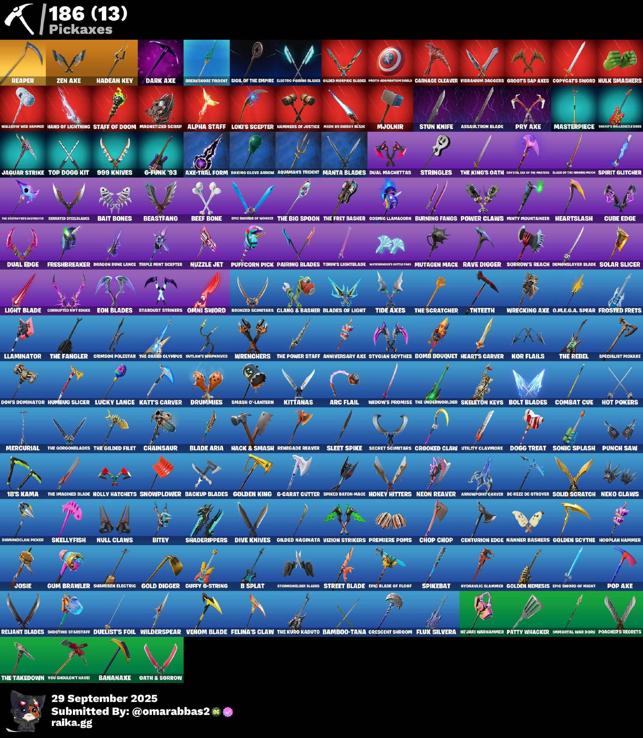 1-Ball, 18's Kama, 6-Carat Cutter, 999 Knives, Adira, Aftermath, Agent Jones, Agent Peely, Air Shredder, Alli, Alpha Staff, Andy Fangerson, Anniversary Axe, Aphrodite, Aquaman, Aquaman's Trident, Arc Flail, Ares, Arrowpoint Carver, Artemis, Assaultron Blade, Avatar's Flourish, Axe-Tral Form, Azarath Metron Zinthos!, B Splat, Backlash, Backup Blades, Bait Bones, Bamboo-Tana, Bananaxe, Bash, Bean Bag, Beast Boy, Beastfang, Beef Bone, Beef Boss, Beep Beep, Bhangra Boogie, Billy Bounce, Bitey, Black Belt Brawler, Black Manta, Black Panther, Blade Aria, Blade Of The Waning Moon, Blades Of Light, Blinding Lights, Blowin' Up, Bolt Blades, Bomb Bouquet, Bone Boss, Bone Ravage, Boogie Down, Boomin', Boots 'N' Cats, Boxing Glove Arrow, Breakshore Trident, Brite Moves, Brite Raider, Bronzed Scimitars, Brutus, Buckets, Burning Fangs, Bushranger, Call Me, Captain America, Captain Marvel, Cardistry, Carnage, Carnage Cleaver, Centurion, Centurion Edge, Cerberus, Chainsaur, Chaos Agent, Chaos Director, Chaos Origins, Charlotte, Chimichanga!, Choice Knit, Chop Chop, Clang & Basher, Clean Sweep, Cluck, Codsworths Cleanup, Coin Flip, Combat Cue, Conch Call, Copycat's Sword, Corrupted Rift Edges, Cosmic Llamacorn, Crescent Shroom, Crimson Polestar, Crooked Claw, Crowning Achievement, Crystal Axe Of The Masters, Cube Assassin, Cube Edge, Cuddle Team Leader, Cyclo Curl, Dark Axe, Dark Jonesy, Dark Red Knight, Dark Tricera Ops, Dark Wild Card, Darth Vader, De-Rezz De-Stroyer, Deadpool, Deimos, Demonslayer Blade, Diamond Diva, Diamond Throne, Diamondclaw Picker, Disco Fever, Dive Knives, Doctor Doom, Dogg Treat, Don's Dominator, Dragon Rune Lance, Dream Feet, Driftwalker, Drummies, Dual Edge, Dual Machettas, Duelist's Foil, Dusk Knight, Dynamo Tntina, Electro Pairing Blades, Electro Swing, Elmira, Eon Blades, Epic Blade Of Floof, Epic Sword Of Might, Epic Swords Of Wonder, Eternal Knight, Evasive Maneuvers, Evie, Fabio Sparklemane, Fade, Felina, Felina's Claw, Fire Show, Fishskull, Flippin' Away, Flux Silvera, Focused, Foil Flex, Fresh Aura, Freshbreaker, Frosted Frets, G-Funk '93, Galaxia, Galaxy Scout, Gear Specialist Maya, Get Griddy, Ghoul Trooper, Gilded Morphic Blades, Gilded Naginata, Go Mufasa, Godzilla Evolved, Gold Digger, Golden King, Golden Nemesis, Golden Scythe, Good Guy, Good Sportsmanship, Green Arrow, Groot, Groot's Sap Axes, Guffy 6-String, Guggimon, Gum Brawler, Gumbo, Gunnar, Hack & Smash, Hadean Kev, Hades, Hammers Of Justice, Hand Of Lightning, Hand Signals, Hand-Forged, Hang Loose, Hangtime, Harlowe, Have A Seat, Haven, Heart Sign, Hearts Carver, Heartslash, Helichopper, Holiday Roxy, Holly Hatchets, Honey Hitters, Hooplah Hammer, Hope, Hot Pokers, Howl, Huddle Hero, Hulk Smashers, Humbug Slicer, Hydraulic Slammer, I'm A Mystery, Immortal War Doru, Imperial March, Infinite Dab, Invisible Cut, Iris, Island Vibes, It Is Finished, It's... You?, J.B. Chimpanski, Jabba Switchway, Jade, Jaguar Strike, Jennifer Walters, Jet Signals, Jing, Joey, John Wick, Jolly Jammer, Josie, Jules, Kakashi Hatake, Karateka Jones, Katt, Katt's Carver, Kendo, Keyed Up, Kit, Kittanas, Kondor, Kor, Kor Flails, Korra, Krisabelle, Kymera, Kyran Arvk, LBC '93 Dogg, Lady of Cranes, Lara Croft, Lexa, Light Blade, Lil' Godzilla Attack, Lil' Monster, Lil' Prancer, Lil' Rover, Lil' Saucer, Llambro, Llaminator, Loki Laufeyson, Loki's Scepter, Love It!, Love Ranger, Lt. John Llama, Lucky Lance, Lunar Charge, Magnetized Scrap, Make A Seat, Malik, Mancake, Mandalorian, Manta Blades, Mark 85 Energy Blade, Masterpiece, Mave, Maven, Mecha Cuddle Master, Mecha Strike Commander, Medusa, Megalo Don, Members Only, Menace, Meowdas, Meowscles, Mercurial, Merry Marauder, Midas, Minty Bomber, Minty Mountaineer, Mjolnir, Montague, Moonlit Mystery, Mutagen Mace, Mwahaha, My World, Mystique, Mystley, Nailed It, Nanner Bashers, Naruto Uzumaki, Ne'Jari Warhammer, Neko Claws, Neon Reaver, Neymar Jr, Ninja Stance Donnie, Ninja Stance Leo, Ninja Stance Mikey, Ninja Stance Raph, Ninja Style, Nisha, Null Claws, Nuzzle Jet, Nyanja, O.M.E.G.A. Spear, Oath & Sorrow, Ocean, Omni Sword, Oro, Oscar, Out With The Old, Outlaw's Whipknives, Pairing Blades, Pandemonium, Patty Whacker, Paws & Claws, Pea Part Harmony, Peabody, Persephone, Peter Griffin, Phantom Meowscles, Pickin', Pizza Party, Planetary Vibe, Poacher's Regrets, Polar Peely, Pop Axe, Poseidon, Power Claws, Powerhouse, Premiere Poms, Proto-Adamantium Shield, Pry Axe, Puffcorn Pick, Punch Saw, Purr-Demonium, Quick Bite, Rabbit Raider, Rapscallion, Rave Digger, Raven Team Syd, Raz, Ready When You Are, Reaper, Rebirth Raven, Recon Ranger, Reese, Relaxed Fit Jonesy, Reliant Blades, Renegade Reaver, Renegade Rebel, Revel, Rhythm Of Chaos, Ringmaster Scarr, Rogue Spider Knight, Rollie, Ronin, Rust, Sabina, Santa Dogg, Sayara, Scootin', Scuba Jonesy, Secret Scimitars, Seeker, Serpentine Summoning, Serrated Steelblades, Shadebox, Shaderrippers, Shadow Boxer, Shamisen Electric, Shamisen-Sational, Shanta, Shaolin Sit-Up, Shooting Starstaff, Show 'Em Off, Shuriken Spinner, Side Hustle, Sierra, Sigil Of The Empire, Sing Along, Siona, Sizzle, Ska-Stra-Terrestrial, Skatemonster, Skeletara, Skeleton Keys, Skellemint Oro, Skellyfish, Skull Squad Leader, Skull Trooper, Skye, Slayer Juice Wrld, Sleet Spike, Smash O'-Lantern, Snap, Snoop's Walldazzle Bass, Snow Stealth Slone, Snowplower, So Square, Solar Slicer, Solid Scratch, Solid Snake, Sonic Splash, Sorrow's Reach, Southpaw, Specialist Pickaxe, Spider-Man, Spider-Man (No Way Home), Spikebat, Spiked Baton-Mace, Spirit Glitcher, Spirit Hunter Sanko, Springy, Staff Of Doom, Staff Stand, Stardust Strikers, Steady, Storm, Stormfarer, Stormshielder Blades, Stormy, Street Blade, Striker Specialist, Stringles, Stun Knife, Stygian Scythes, Summer Drift, Summer Skye, Sunny, Sweet Swing, Swish, T-60 Power Armor, Take The Cake, Tarana, Taskmaster, Tempest Flight, The Big Spoon, The Break Shot, The Burning Wolf, The Crane Kick, The Cube Queen, The Destroyer's Destroyer, T