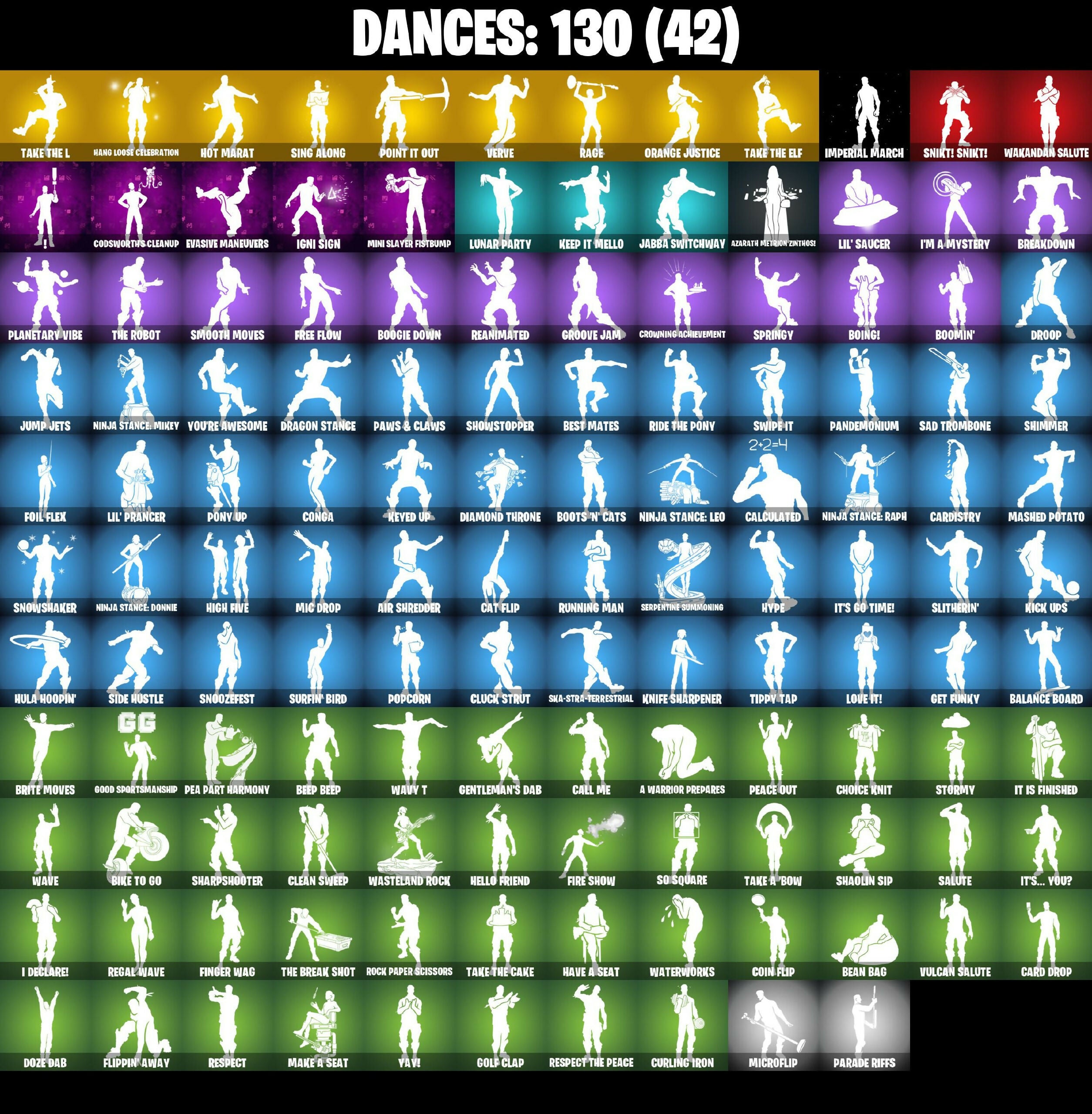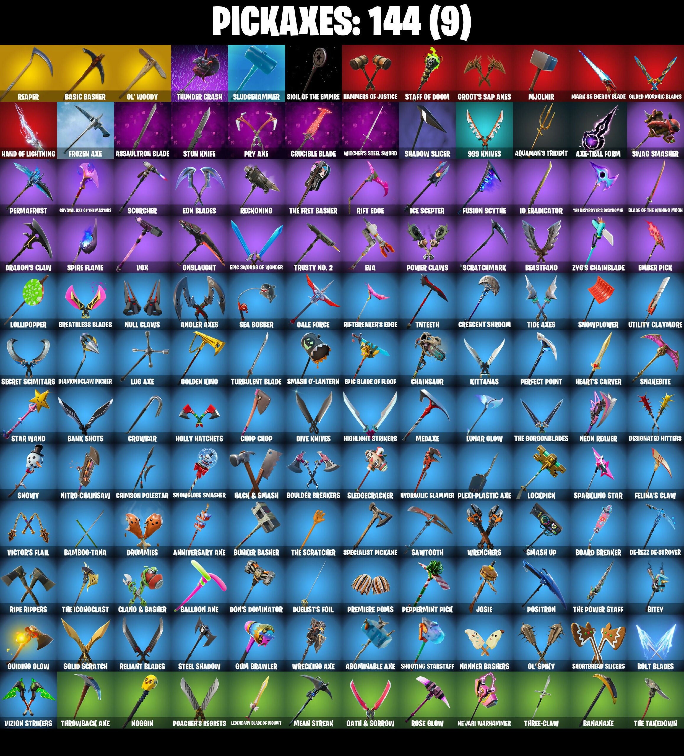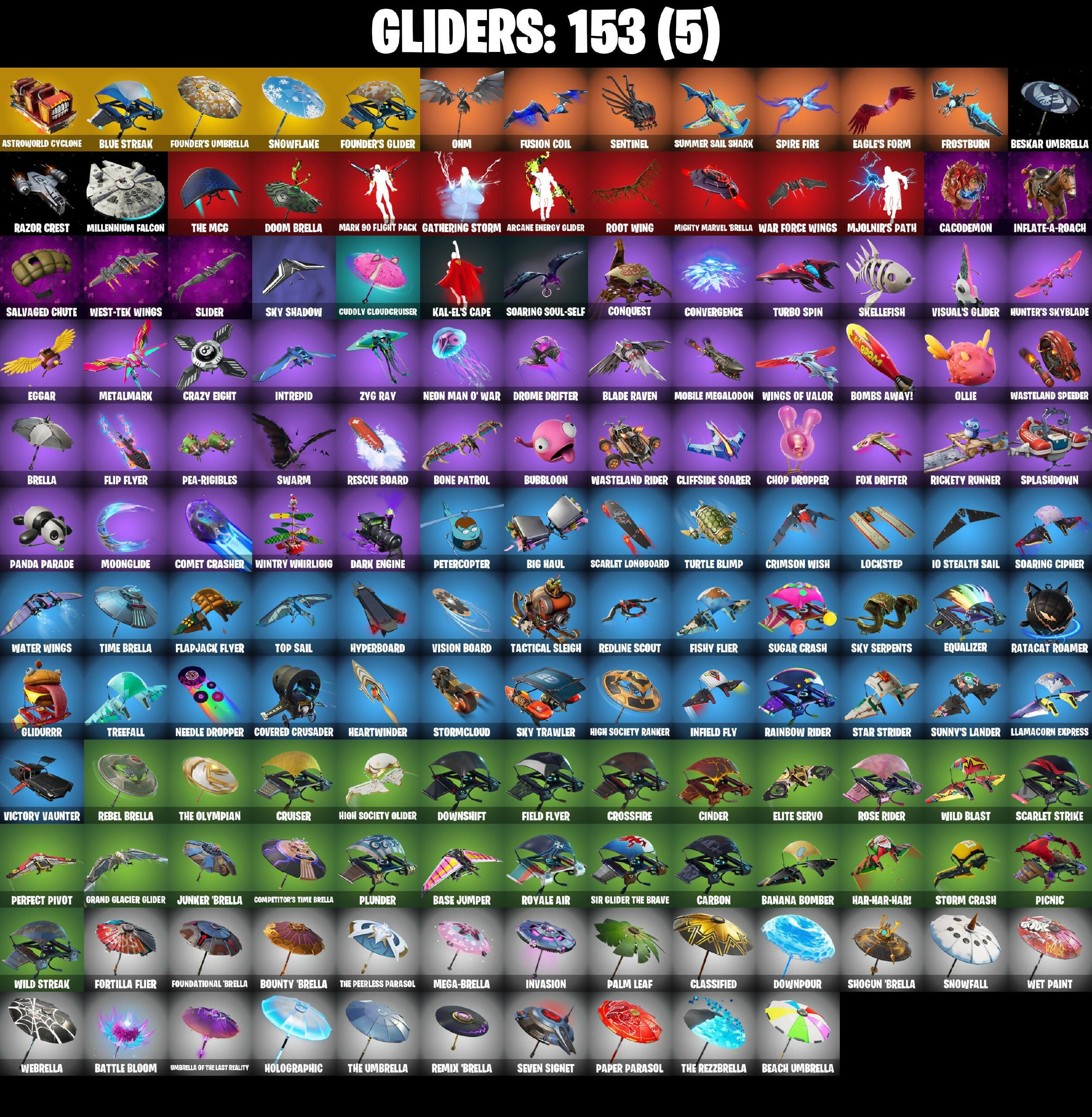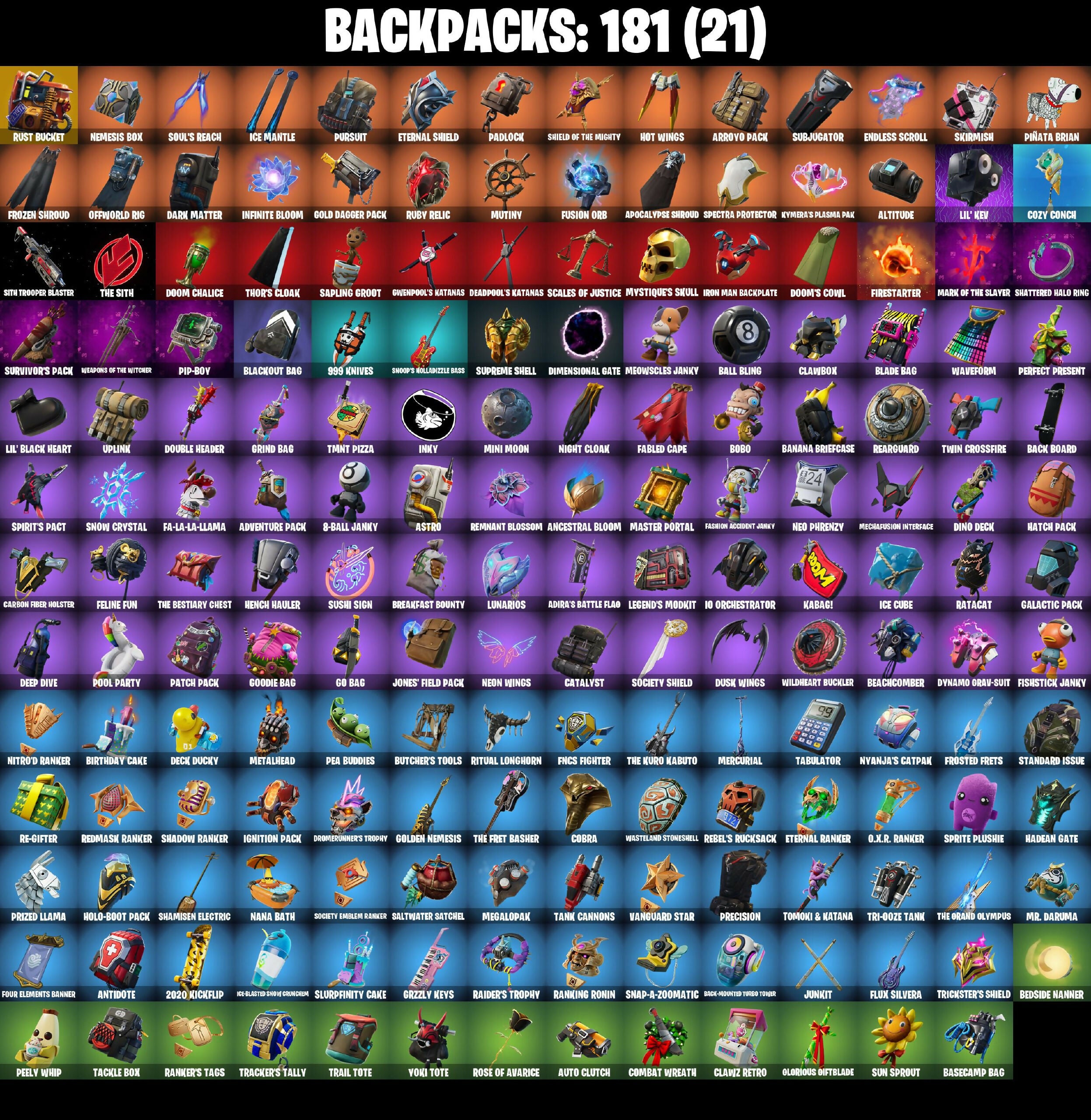 10 Orchestrator, 2020 Kickflip, 8-Ball Janky, 8-Ball Vs Scratch, 999 Knives, A Warrior Prepares, Abominable Axe, Adira's Battle Flag, Adventure Pack, Agent Jones, Agent Jones (Jump 31), Agent Peely, Air Shredder, Altitude, Ancestral Bloom, Angler Axes, Anniversary Axe, Antidote, Apocalypse Shroud, Aquaman, Aquaman's Trident, Arcane Energy Glider, Arctic Adeline, Arroyo Pack, Assaultron Blade, Astro, Astro Armor, Astroworld Cyclone, Auto Clutch, Axe-Tral Form, Azarath Metrion Zinthos!, Back Board, Back-Mounted Turbo Tower, Balance Board, Ball Bling, Balloon Axe, Bamboo-Tana, Banana Bomber, Banana Briefcase, Bananaxe, Bank Shots, Base Jumper, Basecamp Bag, Basic Basher, Battle Bloom, Battle Bus Balloon, Battlehawk, Beach Umbrella, Beachcomber, Bean Bag, Beastfang, Bedside Nanner, Beep Beep, Beskar Umbrella, Best Mates, Big Haul, Bike To Go, Birthday Cake, Bitey, Blackheart, Blackout Bag, Blade Bag, Blade Of The Waning Moon, Blade Raven, Blaze, Blizzabelle, Blue Streak, Blue Team Leader, Board Breaker, Bobo, Boing!, Bolt Blades, Bombs Away!, Bone Patrol, Boogie Down, Boomin', Boots 'N' Cats, Boulder Breakers, Bounty 'Brella, Breakdown, Breakfast Bounty, Breathless Blades, Brella, Brite Moves, Brite Raider, Bubloon, Bullseye, Bunker Basher, Bunker Jonesy, Burning Ambition Valeria, Butcher's Tools, Cacodemon, Calamity, Calculated, Call Me, Cameo Vs Chic, Carbide, Carbon, Carbon Fiber Holster, Card Drop, Cardistry, Cat Flip, Catalyst, Chainsaur, Challenger Oblique - Flame, Charlotte, Choice Knit, Chop Chop, Chop Dropper, Cinder, Clang & Basher, Classified, Clawbox, Clawz Retro, Clean Sweep, Cliffside Soarer, Cluck, Cluck (Slurpy), Cluck Strut, Cobra, Codsworth's Cleanup, Coin Flip, Combat Wreath, Comet Crasher, Competitor's Time Brella, Conga, Conquest, Convergence, Corrupted, Covered Crusader, Cozy Conch, Crazy Eight, Crescent Shroom, Crimson Polestar, Crimson Wish, Crossfire, Crowbar, Crowning Achievement, Crucible Blade, Cruiser, Crystal, Crystal Axe Of The Masters, Cuddly Cloudcruiser, Curling Iron, Dark Engine, Dark Matter, Dark Voyager, Dawn Duelist Nisha, De-Rezz De-Stroyer, Deadpool, Deadpool's Katanas, Deck Ducky, Deep Dive, Designated Hitters, Diamond Throne, Diamondclaw Picker, Dimensional Gate, Dino Deck, Dive Knives, Dj Yonder, Doctor Doom, Doctor Slone, Don's Dominator, Doom Brella, Doom Chalice, Doom Slayer, Doom's Cowl, Double Header, Downpour, Downshift, Doze Dab, Dragon Stance, Dragon's Claw, Drift, Drome Drifter, Dromerunner's Trophy, Droop, Droopy, Drummies, Duelist's Foil, Dusk, Dusk Wings, Dusty, Dynamo Grav-Suit, EVA, Eagle's Form, Eggar, Elite Agent, Elite Servo, Ember Pick, Endless Scroll, Enforcer, Eon Blades, Epic Blade Of Floof, Epic Swords Of Wonder, Equalizer, Eternal Knight, Eternal Ranker, Eternal Shield, Evasive Maneuvers, FNCS Fighter, Fa-La-La-Llama, Fable, Fabled Cape, Fade, Fancy Peter Griffin, Fashion Accident Janky, Felina's Claw, Feline Fun, Field Flyer, Finger Wag, Fire Show, Firestarter, Fishstick, Fishstick Janky, Fishy Flier, Flapjack Flyer, Flip Flyer, Flippin' Away, Flux Silvera, Foil Flex, Fortilla Flier, Foundational 'Brella, Founder's Glider, Founder's Umbrella, Four Elements Banner, Fox Drifter, Free Flow, Frostburn, Frosted Frets, Frozen Axe, Frozen Shroud, Fusion, Fusion Coil, Fusion Orb, Fusion Scythe, Galactic Pack, Gale Force, Gathering Storm, Gear Specialist Maya, Gentleman's Dab, Geralt Of Rivia, Get Funky, Giddy-Up, Gilded Morphic Blades, Glidurr, Glorious Giftblade, Go Bag, Gold, Gold Brutus, Gold Dagger Pack, Gold Midas, Golden King, Golden Nemesis, Golf Clap, Good Sportsmanship, Goodie Bag, Grand Glacier Glider, Grind Bag, Grizzly Keys, Groot, Groot's Sap Axes, Groove Jam, Guff Gringle, Guggimon, Guiding Glow, Gum Brawler, Gwenpool's Katanas, Hack & Smash, Hadean Gate, Hammers Of Justice, Hand Of Lightning, Hang Loose Celebration, Happy Kit, Har-Har-Har!, Hatch Pack, Have A Seat, Heart's Carver, Heartwinder, Hello Friend, Hench Hauler, High Five, High Society Glider, High Society Ranker, Highlight Strikers, Holiday Boxy, Holly Hatchets, Holo-Boot Pack, Holographic, Hope, Hot Marat, Hot Wings, Hula Hoopin', Hunter's Skyblade, Huntress, Hybrid, Hydraulic Slammer, Hype, Hyperboard, I Declare!, I'm A Mystery, IO Eradicator, IO Stealth Sail, Ice Cube, Ice Mantle, Ice Scepter, Ice-Blasted Snow Crunch, Igni Sign, Ignition Pack, Imperial March, Infield Fly, Infinite Bloom, Inflate-A-Roach, Inky, Intrepid, Invasion, Iron Man Backplate, It Is Finished, It's Go Time!, It's... You?, Jabba Switchway, Jennifer Walters, Joey, Jones' Field Pack, Josie, Journey Vs Hazard, Jules, Jump Jets, Junker 'Brella, Junkit, Kabac!, Kal-El's Cape, Keep It Mello, Kev, Keyed Up, Kick Ups, Kit, Kittanas, Knife Sharpener, Kondor, Krisabelle, Kymera, Kymera's Plasma Pak, Lara Croft, Legend's Modkit, Legendary Blade Of Insight, Lexa, Lil' Black Heart, Lil' Kev, Lil' Prancer, Lil' Saucer, Liteshow, Llamacorn Express, Lockpick, Lockstep, Lollipopper, Love It!, Lt. Evergreen, Lug Axe, Lunar Glow, Lunar Party, Lunarios, Lynx, Maeve, Make A Seat, Mandalorian, Mangcake, Mark 85 Energy Blade, Mark 90 Flight Pack, Mark Of The Slayer, Mashed Potato, Mask Off, Masked Scuba Jonesy, Massai, Master Portal, Mean Streak, Mechafusion Interface, Medaxe, Mega-Brella, Megalo Don, Megalopak, Menace, Meowscles, Meowscles Janky, Mercurial, Metalarmark, Metalhead, Mic Drop, Microflip, Mighty Marvel Brella, Millennium Falcon, Mini Moon, Mini Slayer Fistbump, Mission Specialist, Mjolnir, Mjolnir's Path, Mobile Megalodon, Montague, Moonglide, Moonwalker, Mr. Daruma, Mutiny, Mystique, Mystique's Skull, Nana Bath, Nanner Bashers, Ne'Jari Warhammer, Needle Dropper, Nemesis Box, Neo Phrenzy, Neo Versa, Neon Man O' War, Neon Reaver, Neon Wings, Neymar Jr, Night Cloak, Nightshade, Ninja Stance: Donnie, Ninja Stance: Leo, Ninja Stance: Mikey, Ninja Stance: Raph, Nisha, Nitro Chainsaw, Nitro Fusion Mbado Don, Nitro'd Ranker, Noggin, Null Claws, Nyanja's Catpak, O.X.R. Ranker, Oath & Sorrow, Ocean, Off