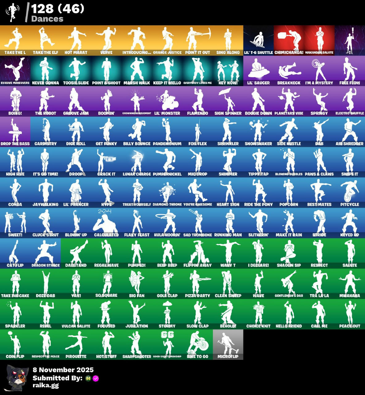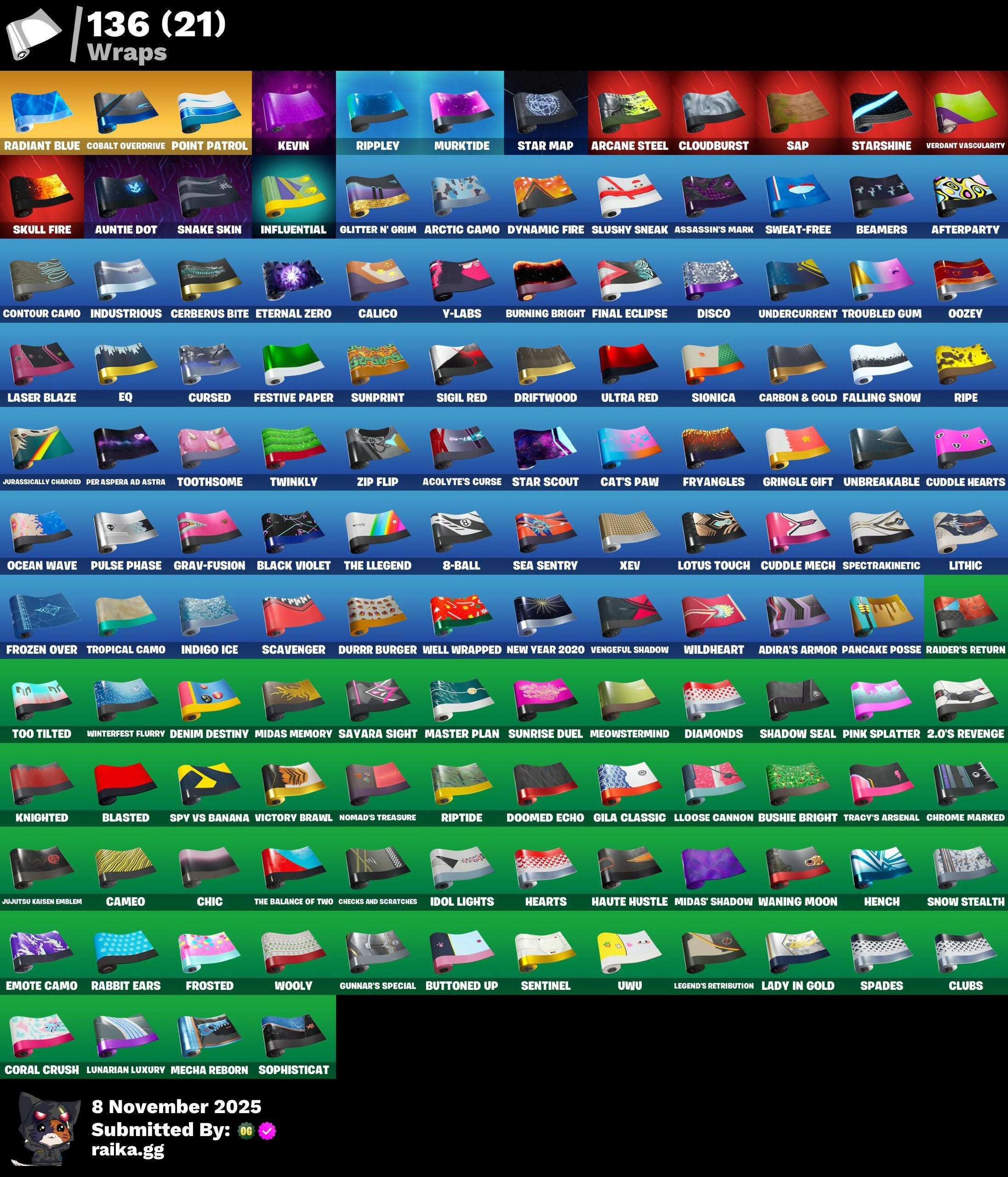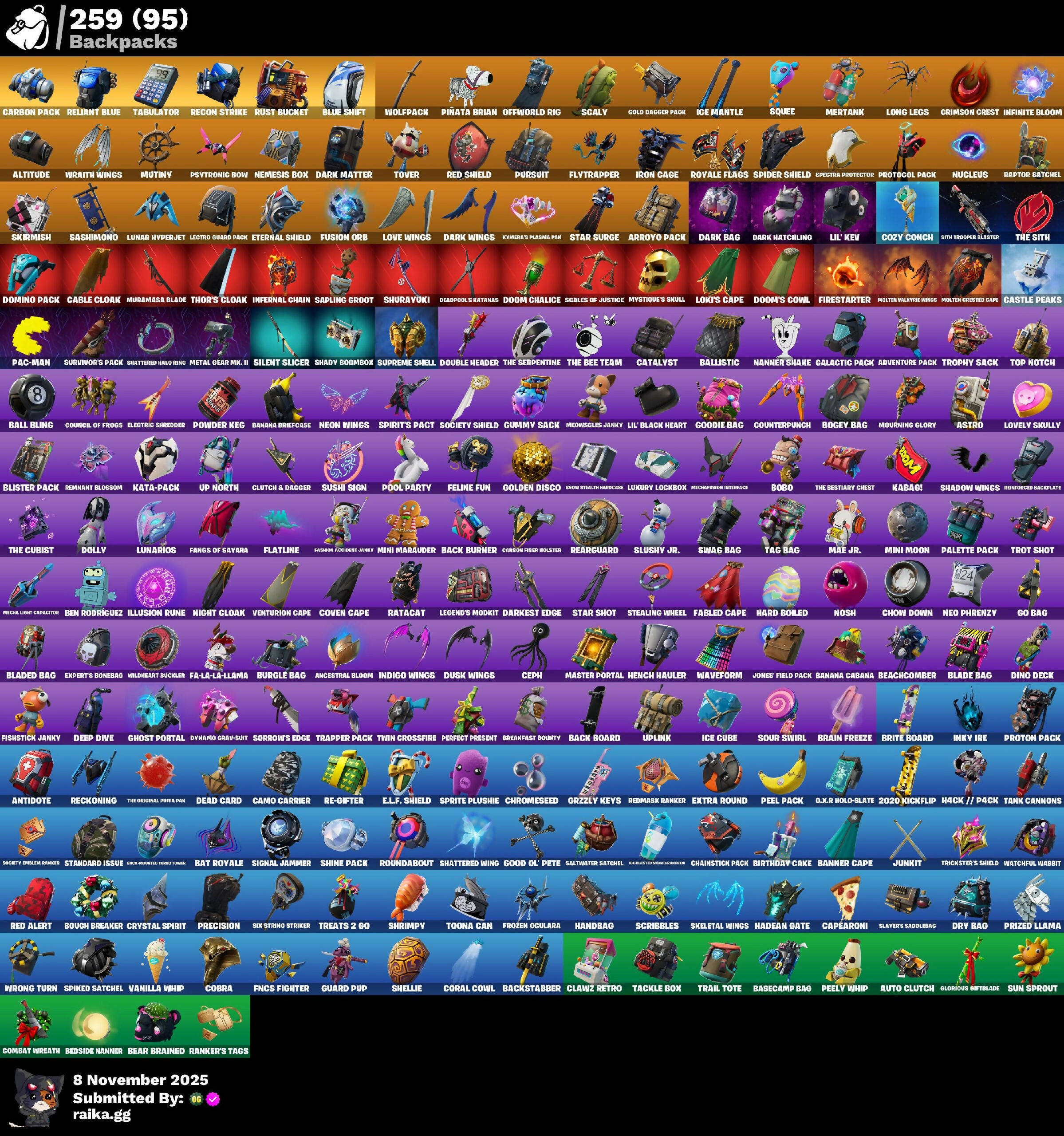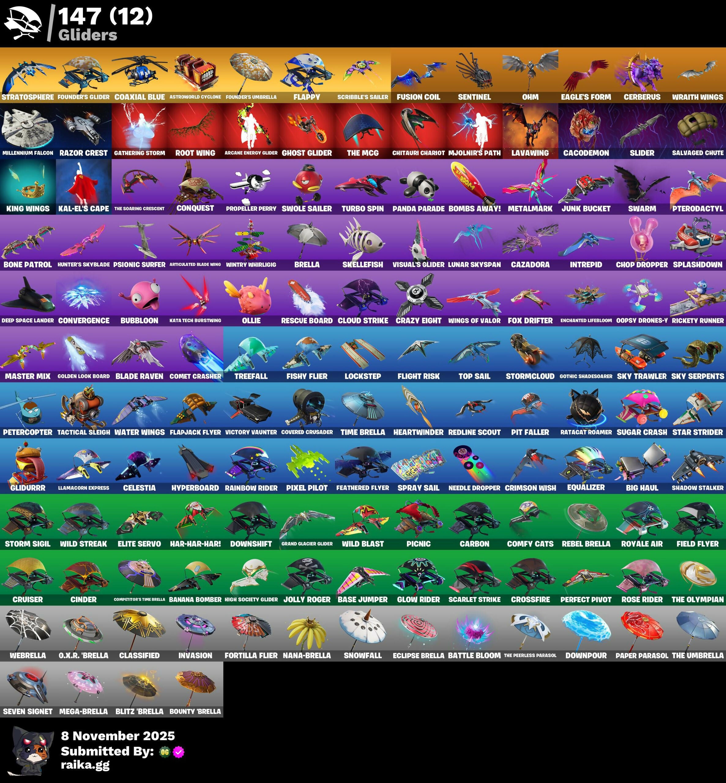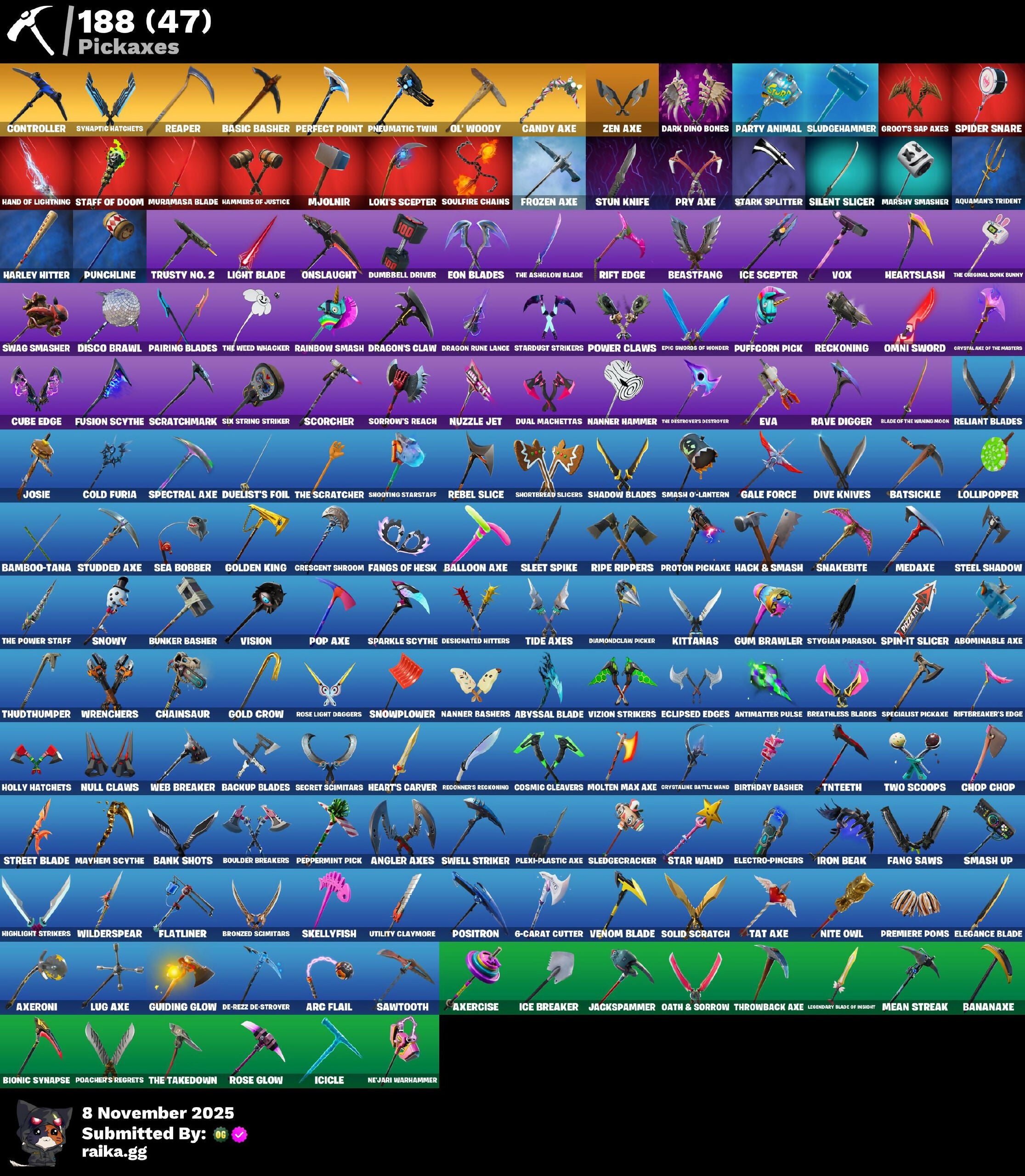 2.0's Revenge, 2020 Kickflip, 8-Ball, 8-Ball vs Scratch, Ab5enz, Abominable Axe, Abstrakt, Abyssal Blade, Acolyte's Curse, Adira's Armor, Adventure Pack, Aftermath, Afterparty, Agent Jones, Agent Peely, Air Shredder, Alli, Altitude, Ancestral Bloom, Angler Axes, Antidote, Antimatter Pulse, Antonia, Aquaman, Aquaman's Trident, Arachne, Arc Flail, Arcane Energy Glider, Arcane Steel, Arctic Adeline, Arctic Assassin, Arctic Camo, Arroyo Pack, Articulated Blade Wing, Assassin's Mark, Astro, Astroworld Cyclone, Auntie Dot, Aura, Auto Clutch, Axercise, Axeroni, Back Board, Back Burner, Back-Mounted Turbo Tonfa, Backstabber, Backup Blades, Ball Bling, Ballistic, Balloon Axe, Bamboo-Tana, Banana Bomber, Banana Briefcase, Banana Cabana, Bananaaxe, Bank Shots, Banner Cape, Base Jumper, Basecamp Bag, Basic Basher, Bat Royale, Batsickle, Battle Bloom, Battlehawk, Beach Bomber, Beachcomber, Beamers, Bear Brained, Beastfang, Bedside Nanner, Beep Beep, Behold!, Ben Rodriguez, Bender Bending Rodriguez, Best Mates, Big Fan, Big Haul, Big Mouth, Bike To Go, Billy Bounce, Bionic Synapse, Birthday Basher, Birthday Cake, Black Violet, Blackheart, Blacklight, Blade Bag, Blade Raven, Blade of the Waning Moon, Bladed Bag, Blasted, Blaze, Blister Pack, Blitz 'Brella, Blowin' Up, Blowing Bubbles, Blue Shift, Blue Striker, Bobo, Bogey Bag, Boing!, Bombs Away!, Bone Patrol, Bonehead, Boogie Down, Boomin', Bough Breaker, Boulder Breakers, Bounty 'Brella, Brain Freeze, Breakfast Bounty, Breakneck, Breakpoint, Breathless Blades, Brella, Brite Board, Bronzed Scimitars, Brutus, Bryne, Bubloon, Bullseye, Bunker Basher, Bunker Jonesy, Bunnymoon, Burgle Bag, Burning Bright, Bushie Bright, Buttoned Up, Cable, Cable Cloak, Cacodemon, Calamity, Calculated, Calico, Call Me, Cameo, Cameo vs Chic, Camo Carrier, Candy Axe, Capearoni, Carbide, Carbon, Carbon & Gold, Carbon Commando, Carbon Fiber Holster, Carbon Pack, Cardistry, Castle Peaks, Cat Flip, Cat's Paw, Catalyst, Catrina, Cazadora, Celestia, Ceph, Cerberus, Cerberus Bite, Chainsaur, Chainstick Pack, Checks and Scratches, Chic, Chigusa, Chimichanga!, Chitauri Chariot, Choice Knit, Chop Chop, Chop Dropper, Chow Down, Chrome Marked, Chromeseed, Cinder, Classified, Clawz Retro, Clean Sweep, Cloaked Shadow, Cloaked Star, Cloud Strike, Cloudburst, Clubs, Cluck Strut, Clutch & Dagger, Coaxial Blue, Cobalt, Cobalt Overdrive, Cobra, Codename E.L.F., Coin Flip, Cold Furia, Combat Wreath, Comet Crasher, Comfy Cats, Competitor's Time Brella, Conga, Conquest, Constructor, Contour Camo, Controller, Convergence, Coral Cowl, Coral Crush, Cosmic Cleavers, Council of Frogs, Counterpunch, Coven Cape, Covered Crusader, Cozy Conch, Crack It, Crazy Eight, Crescent Shroom, Crimson Crest, Crimson Scout, Crimson Wish, Crossfire, Crowning Achievement, Cruiser, Crystal Axe of the Masters, Crystal Spirit, Crystalline Battle Wand, Cube Assassin, Cube Edge, Cuddle Hearts, Cuddle Mech, Cursed, DJ Yonder, Dab, Dabstand, Dark Bag, Dark Bomber, Dark Dino Bones, Dark Hatchling, Dark Matter, Dark Tricera Ops, Dark Voyager, Dark Wings, Darkest Edge, Dazzle, De-Rezz De-Stroyer, Dead Card, Deadpool, Deadpool's Katanas, Deep Dive, Deep Space Lander, Degavined Dribbler, Deimos, Delirium, Denim Destiny, Designated Hitters, Diamond Diva, Diamond Throne, Diamondclaw Picker, Diamonds, Dice Roll, Diecast, Dino Deck, Dire, Disco, Disco Brawl, Dive Knives, Dizzie, Doctor Doom, Doggo, Dolly, Dolph, Domino, Domino Pack, Doom Chalice, Doom's Cowl, Doomed Echo, Double Header, Downpour, Downshift, Doze Dab, Dragon Rune Lance, Dragon Stance, Dragon's Claw, Dream, Drift, Driftwood, Droop, Drop The Bass, Dry Bag, Dual Machettas, Duelist's Foil, Dumbbell Driver, Dummy, Durrr Burger, Dusk, Dusk Wings, Dynamic Fire, Dynamo Grav-Suit, E.L.F. Shield, Eagle's Form, Eclipse Brella, Eclipsed Edges, Electric Shredder, Electro Shuffle, Electro-Pincers, Elegance Blade, Elite Agent, Elite Servo, Emote Camo, Enchanted Lifebloom, Eon Blades, Epic Swords of Wonder, Eq, Equalizer, Eternal Knight, Eternal Shield, Eternal Zero, Etheria, Eva, Evasive Maneuvers, Everybody Loves Me, Evie, Expert's Bonebag, Extra Round, FNCS Fighter, Fa-La-La-Llama, Fable, Fabled Cape, Fade, Falling Snow, Fanatic, Fang Saws, Fangs of Hesk, Fangs of Sayara, Fashion Accident Janky, Feathered Flyer, Feline Fun, Festive Paper, Field Flyer, Final Eclipse, Firestarter, Fish Thicc, Fishstick, Fishstick Janky, Fishy Flier, Fixer, Flaky Feast, Flamenco, Flapjack Flyer, Flappy, Flatline, Flatliner, Flight Risk, Flippin' Away, Flytrap, Flytrapper, Focused, Foil Flex, Fortilla Flier, Founder's Glider, Founder's Umbrella, Fox Drifter, Free Flow, Frosted, Frozen Axe, Frozen Fishstick, Frozen Nog Ops, Frozen Oculara, Frozen Over, Fryangles, Funk Ops, Fusion, Fusion Coil, Fusion Orb, Fusion Scythe, G-Carat Cutter, Galactic Pack, Galaxy Scout, Gale Force, Gathering Storm, Gear Specialist Maya, Gentleman's Dab, Get Funky, Ghost Glider, Ghost Portal, Ghost Rider, Ghoul Trooper, Giddy-Up, Gila Classic, Glidurrr, Glitter N' Grim, Glorious Giftblade, Glow Rider, Go Bag, Gold Crow, Gold Dagger Pack, Gold Midas, Golden Disco, Golden King, Golden Look Board, Golf Clap, Good Ol' Pete, Good Sportsmanship, Goodie Bag, Gothic Shadesoarer, Grand Glacier Glider, Grav-Fusion, Gringle Gift, Grizzly Keys, Groot, Groot's Sap Axes, Groove Jam, Guard Pup, Guggimon, Guiding Glow, Gum Brawler, Gumbo, Gummy Fishstick, Gummy Sack, Gunnar's Special, H4ck // P4ck, Hack & Smash, Hadean Gate, Hammers of Justice, Hand of Lightning, Handbag, Har-Har-Har!, Hard Boiled, Harley Hitter, Harley Quinn, Haute Hustle, Haven, Heart Sign, Heart's Carver, Hearts, Heartslash, Heartwinder, Hello Friend, Hench, Hench Hauler, Hey Now!, High Five, High Society Glider, Highlight Strikers, Holiday Boxy, Holly Hatchets, Hope, Hot Marat, Hot Stuff, Hula Hoopin', Hunter's Skyblade, Huntress, Hybrid, Hype, Hyperboard, I Declare!, I'm A Mystery, Ice Breaker, Ice Cube, Ice Mantle, Ice Scepter, Icicle, Idol Lights, Illusion Rune, Indigo