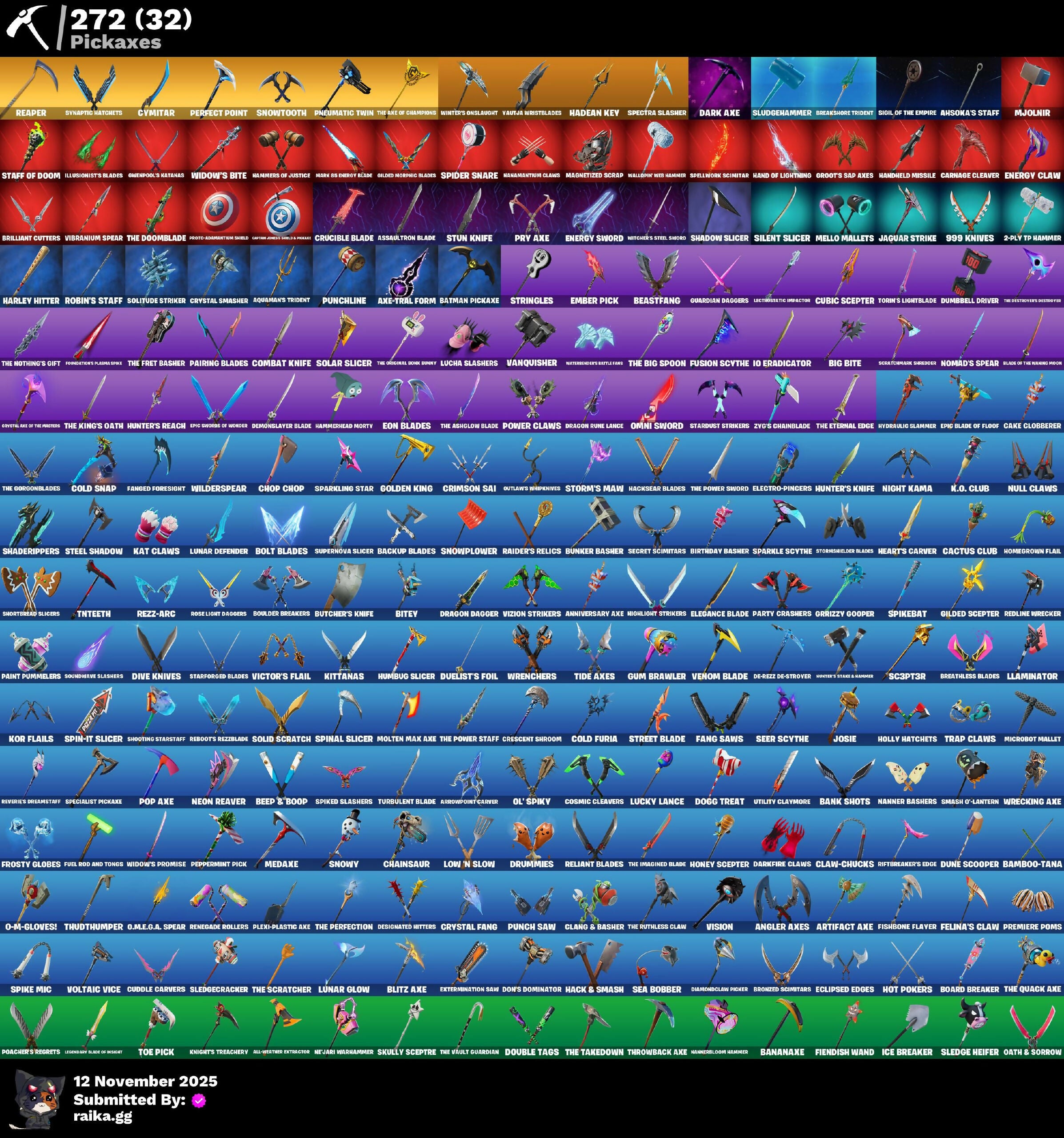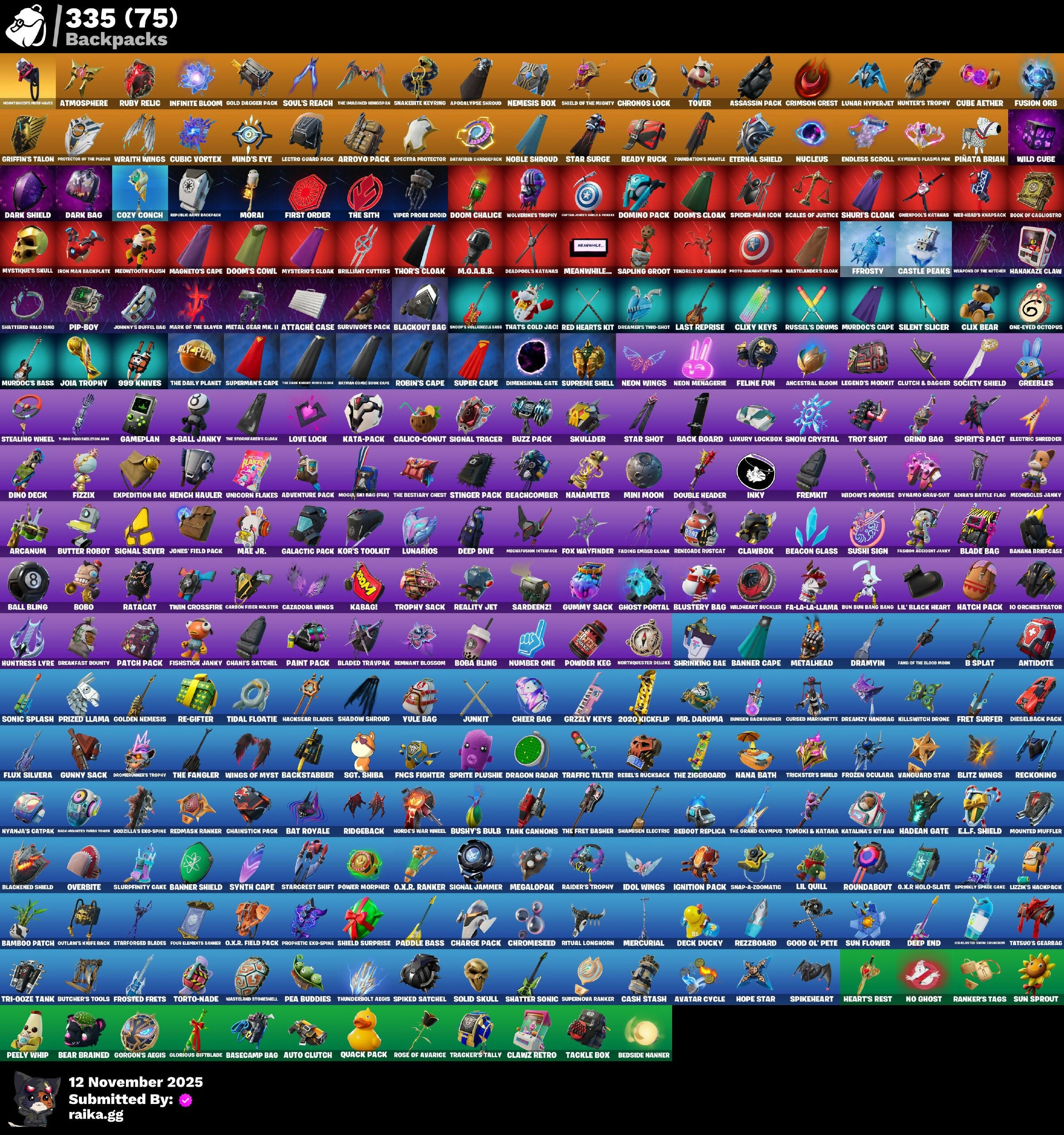 (SNIKT!), 1-800 Endoskeleton Arm, 10 Field Flyer, 10 Stealth Sail, 2-Ply Tp Hammer, 2020, 2020 Kickflip, 8-Ball Janky, 8-Ball vs Scratch, 999 Knives, A Warrior Prepares, Adaro's Battle Flag, Adira, Adventure Aerial, Adventure Pack, Aerial Acrobat, Agent Jones, Agent Patch, Agent Peely, Ahsoka Tano, Ahsoka's Staff, Air Shredder, All-Weather Extractor, Ancestral Bloom, Andromeda, Angler Axes, Anniversary Axe, Antidote, Antonia, Aphrodite, Apocalypse Shroud, Appa, Aquaman, Aquaman's Trident, Arachrobatics, Arcane Energy Glider, Arcane Research, Arcanum, Arctic Adeline, Arrowpoint Carver, Arroyo Pack, Artemis, Articulated Blade Wing, Artifact Axe, Assassin Pack, Assaultron Blade, Astroworld Cyclone, Atmosphere, Augury, Auto Clutch, Avatar Cycle, Avatar’s Flourish, Aw, Shucks., Axe-Tral Form, Azarath Metrion Zinthos!, B Splatt, Back Board, Back Unounted Turbo Torch, Backstabber, Backup Blades, Balance Board, Ball Bling, Bamboo Patch, Bamboo-Tana, Banana Bomber, Banana Briefcase, Bananaxe, Bank Shots, Banner Cape, Banner Shield, Base Jumper, Basecamp Bag, Bat Royale, Bat Signal, Batman Comic Book Cape, Batman Comic Book Outfit, Batman Pickaxe, Battle Bloom, Battle Gamer Mae, Batwing, Beach Breezer, Beachcomber, Beacon Glass, Bean Bag, Bear Brained, Beastfang, Bedside Manner, Beep & Boop, Beep Beep, Bernie, Big Bite, Big Haul, Bike to Go, Birdarang Flourish, Birthday Basher, Bitey, Bizcochito, Black Ranger, Blackened Shield, Blackout Bag, Blade Bag, Blade Of The Waning Moon, Blade Raven, Bladed Travpak, Blinding Lights, Blitz 'Brella, Blitz Axe, Blitz Wings, Blizzard Bomber, Blowing Bubbles, Blowin’ Up, Blue Viper, Blustery Bag, Board Breaker, Boba Bling, Boba Snack, Bobo, Boing!, Bolt Blades, Bombs Away!, Bone Patrol, Boogie Down, Book Of Cagliostro, Boomin’, Boosting Ki, Boots ‘n’ Cats, Boulder Breakers, Bounce Wit It, Bounty 'Brella, Breakfast Bounty, Breakneck, Breakpoint, Breakshore Trident, Breathless Blades, Brella, Brilliant Cutters, Brite Moves, Brite Raider, Bronzed Scimitars, Bubbloon, Buckle Up, Bullet Rider, Bun Bun Bang Bang, Bunker Basher, Bunsen Blackburner, Bushy's Bulb, Butcher's Knife, Butcher's Tools, Butter Robot, Buzz Beat, Buzz Pack, Buzzsaw Breacher, Bytes, Cacodemon, Cactus Club, Cake Clobberer, Calico-Conut, Call Me, Called Shot, Cameo vs Chic, Captain America, Captain America's Shield & Holder, Captain Ilamerica, Captain Jones, Captain Jones’s Shield & Pickaxe, Captain's Glider, Carbon Fiber Holster, Card Drop, Cardistry, Carnage, Carnage Cleaver, Carolina, Cash Stash, Castle Peaks, Catalyst, Cauldron Chill, Cazadora, Cazadora Wings, Celestia, Cerberus, Chain Surfer, Chainsaur, Chainstick Pack, Chani, Chanti's Satchel, Charge Pack, Charlotte, Cheer Bag, Cheer Bolt, Chillest Vibe Rider, Choice Knit, Chop Chop, Chop Dropper, Christie's Cloudglider, Chrome Punk, Chromebrella, Chromeseed, Chromestruck Fire, Chronos Lock, Clang & Basher, Clark Kent, Classified, Claw-Chucks, Clawbox, Clawz Retro, Clean Sweep, Cliffside Soarer, Clix, Clix Bear, Clix Groove, Clixy Keys, Clone Trooper, Cloudy Cloudcutter, Cluck, Clutch, Clutch & Dagger, Codename E.L.F., Codename: DJ Trophy, Coin Flip, Cold Furia, Combat Knife, Combat Tech Jules, Combocopter, Comet Crasher, Comfy Cats, Comfy Chomps, Commander's Descent, Competitor's Time Brella, Conch Call, Conjure Weapon, Convergence, Cosmic Cleavers, Count It!, Cozy Conch, Crack It, Crashbella, Crazy Eight, Crescent Shroom, Crimson Crest, Crimson Sai, Crimson Wish, Crossworties Cleanup, Crowning Achievement, Crucible Blade, Crystal Axe Of The Pranksters, Crystal Fang, Crystal Smasher, Cube Aether, Cube Cruiser, Cubic Scepter, Cubic Vortex, Cuddle Carvers, Cursed Marionette, Cyclo Curl, Cymitar, Dabstand, Dagger Dance, Daily Flight, Dalgona Destroyer, Dance Monkey, Danica, Dark Axe, Dark Bag, Dark Bomber, Dark Charger, Dark Jonesy, Dark Red Knight, Dark Shield, Dark Symbiote, Dark Wild Card, Darkfire Claws, Darth Vader, Datafiber Chargepack, Ddaki Defender, De-Rezz De-Stroyer, Deadpool, Deadpool's Katanas, Dealer's Deck, Deck Ducky, Deep Dive, Deep End, Demonslayer Blade, Designated Hitters, Diamond Throne, Diamondclaw Picker, Dice Roll, Die with a Smile, Dieselback Pack, Dimensional Gate, Dino Deck, Dino Megazord, Dire Flyer, Dive Knives, Do the Split, Doctor Doom, Doctor Slone, Doctor Strange, Dogg Treat, Domino, Domino Pack, Don's Dominator, Doom, Doom Brella, Doom Chalice, Doom Slayer, Doom's Cloak, Doom's Cowl, Doom's Domain, Double Header, Double Tags, Downpour, Doze Dab, Dragon Dagger, Dragon Dagger's Song, Dragon Radar, Dragon Rider, Dragon Rune Lance, Dramyin, Dreamer's Two-Shot, Dreamy Wardbag, Drome Drifter, Droop, Drummies, Duelist's Foil, Dumbbell Driver, Dune Scooper, Dusk Knight, Dusty, Dynamo Grav-Suit, E.L.F. Shield, Eagle's Form, Eclipse Brella, Eclipsed Edges, Eggar, Electric Shredder, Electro-Pincers, Electrostatic Impactor, Elegance Blade, Elite Servo, Ember Pick, Emergency Raft, Emma Frost, Enchanted Lifebloom, Endless Scroll, Energy Claw, Energy Sword, Eon Blades, Epic Blade Of Floof, Epic Swords Of Wonder, Era, Erisa, Eternal Knight, Eternal Shield, Eternal Voyager, Evasive Maneuvers, Evie, Evil Plan, Expedition Bag, Explorer Emilie, Extermination Saw, FNCS Fighter, Fa-La-La-Llama, Fabio Sparklemane, Fade, Fading Ember Cloak, Fang Dance, Fang Of The Blood Moon, Fang Saws, Fanged Foresight, Fashion Accident Janky, Featherweight, Felina, Felina's Claw, Feline Fun, Festival Lace, Ffrosty, Field Flyer, Fiendish Wand, Fire Show, Fireworks Salvo, First Order, Fish Thicc, Fishbone Flayer, Fishstick Janky, Fishy Flier, Fist Bump, Fist of Doom, Fixer, Fizzix, Flaky Feast, Flapjack Flyer, Flashback Breakdown, Flavor-Dusted Sparkllingos, Flight Risk, Flip Flyer, Flippin’ Away, Flux Silvera, Flying Stone Fighter, Foil Flex, For Q.X.R!, Fortilla Flier, Foundation's Mantle, Foundation's Plasma Spike, Foundational 'Brella, Four Elements Banner, Fox Drifter, Fox Wayfinder, Fremkit, Frequency Flyer, Fret Surfer, Frost Squa