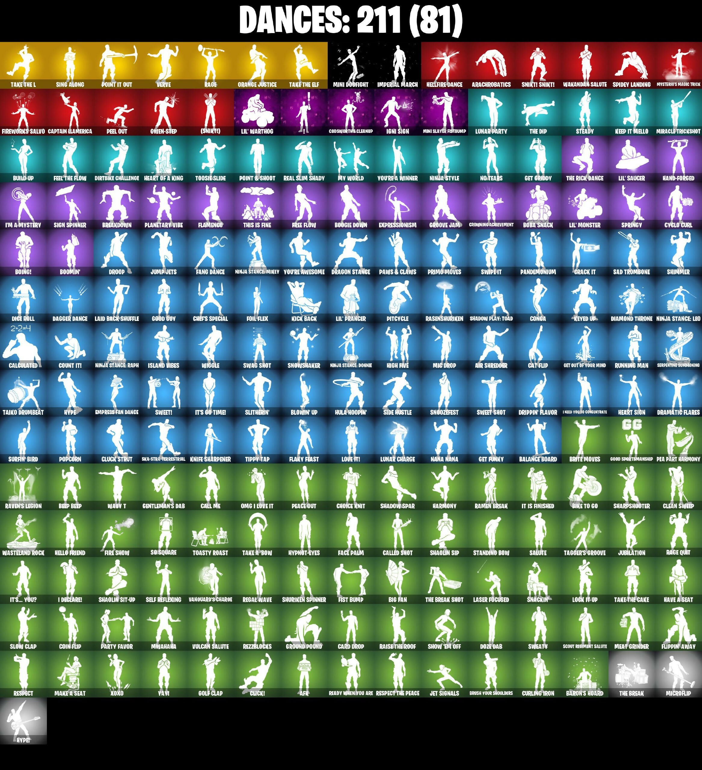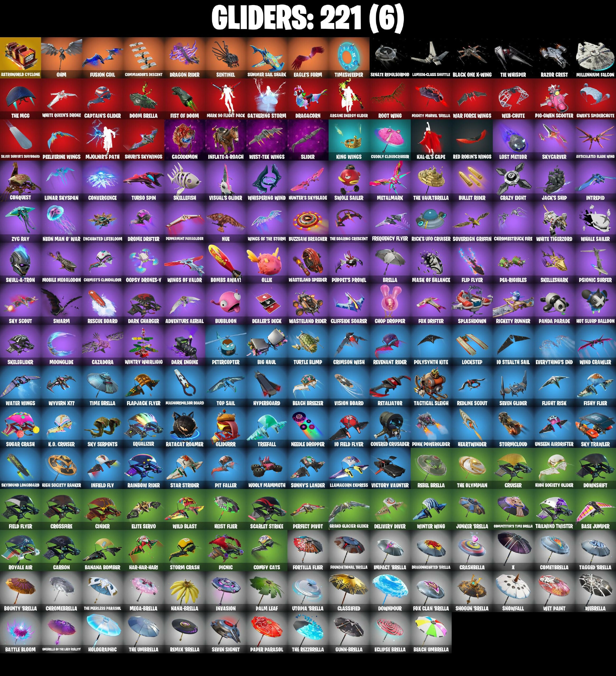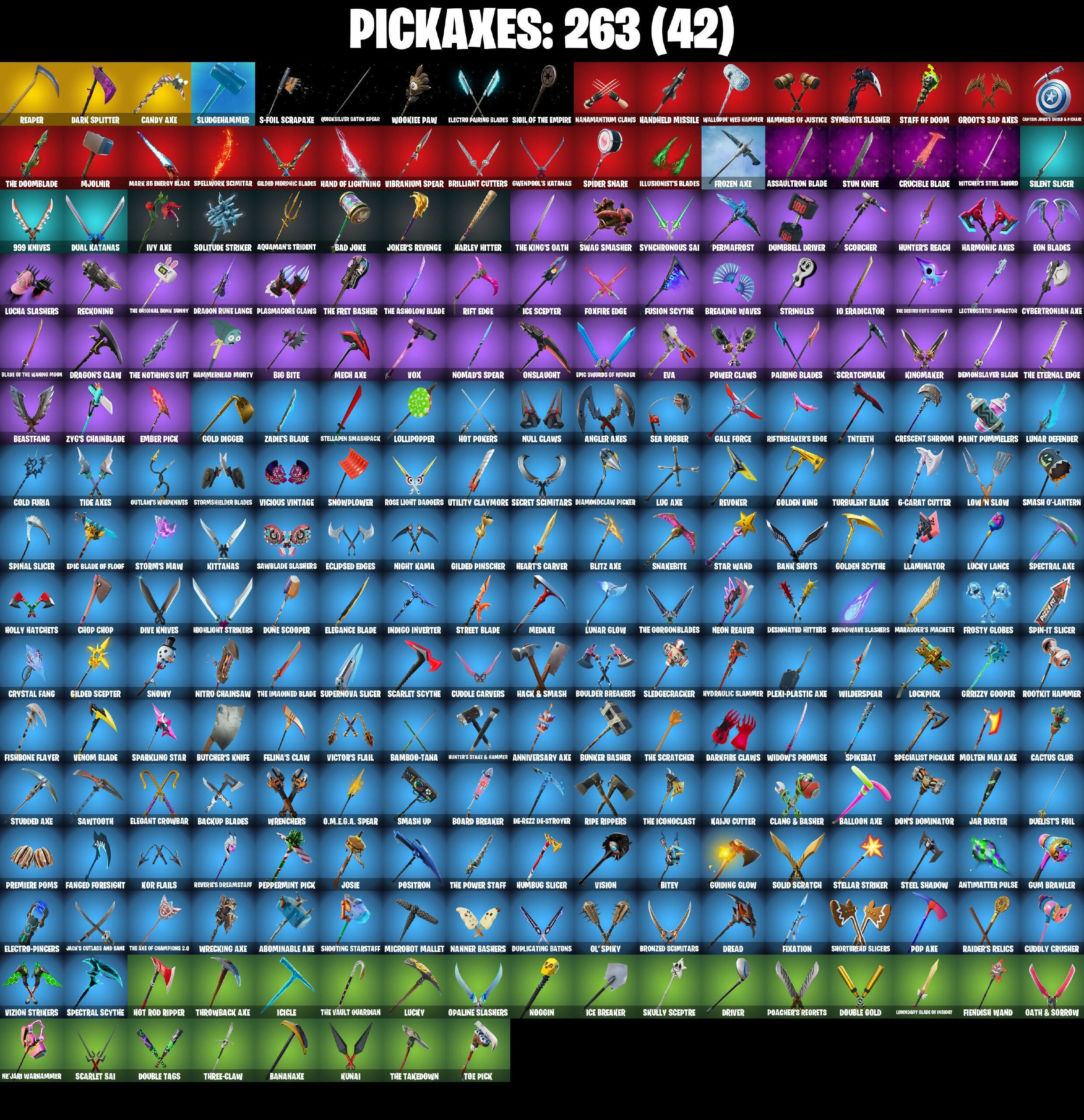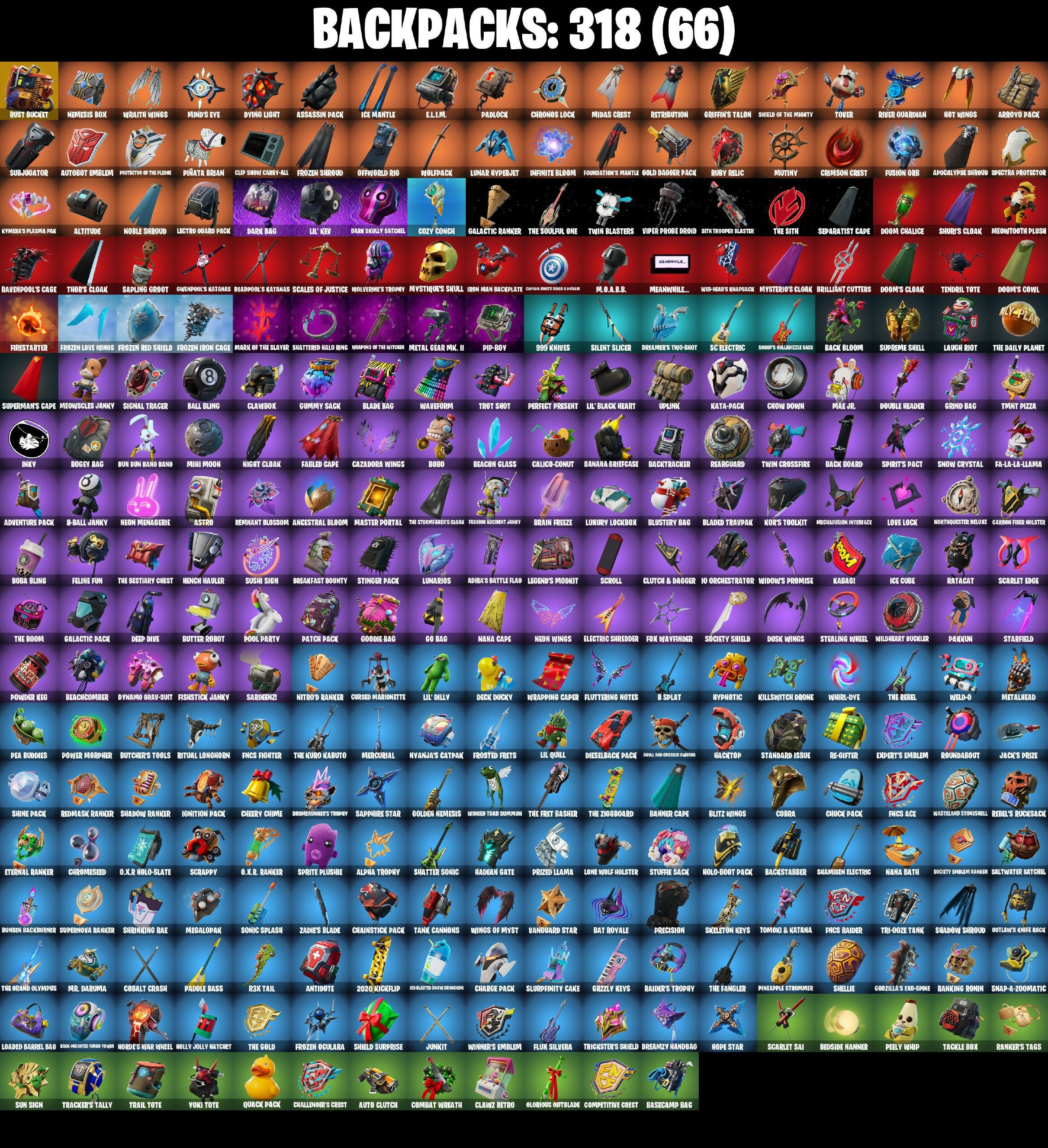 (Snikt!), 10 Field Flyer, 10 Stealth Sail, 1992 Fusion Armallo Don, 2020 Kickflip, 6-Carat Cutter, 8-Ball Janky, 8-Ball Vs Scratch, 999 Knives, A.I.M., Abominable Axe, Adira, Adira’s Battle Flag, Adventure Aerial, Adventure Pack, Afk, Agent Peely, Air Shredder, Alpha Trophy, Altitude, Ancestral Bloom, Angler Axes, Anniversary Axe, Antidote, Antimatter Pulse, Antonia, Apocalypse Shroud, Aquaman, Aquaman's Trident, Arachrobatics, Arcane Energy Glider, Arctic Adeline, Arroyo Pack, Arthur Curry, Articulated Blade Wing, Ascension Nezumi, Assassin Pack, Assaultron Blade, Astro, Astro Armor, Astroworld Cyclone, Aura, Aurelian, Auto Clutch, Autobot Emblem, B Splat, Back Bloom, Back Board, Back-Hunted Turbo Yordle, Backstabber, Backtracker, Backup Blades, Bad Joke, Balance Board, Ball Bling, Balloon Axe, Bamboo-Tana, Banana Bomber, Banana Briefcase, Bananaxe, Bank Shots, Banner Cape, Banner Trooper, Baron's Hoard, Base Jumper, Basecamp Bag, Bat Royale, Battle Bloom, Battle Bus Balloon, Battle-Tested, Battlehawk, Beach Breezer, Beach Umbrella, Beachcomber, Beacon Glass, Beastfang, Bedside Nanner, Beep Beep, Big Bite, Big Fan, Big Haul, Bike To Go, Bitey, Black One X-Wing, Black Panther (Guard), Black Queen, Black Queen (4 In 1 From Bundle), Black Werewolf, Blackheart, Blade Bag, Blade of the Waning Moon, Bladed Travpak, Blaze, Blitz Axe, Blitz Wings, Blowin' Up, Blustery Bag, Board Breaker, Boba Bling, Boba Snack, Bobo, Bogey Bag, Boing!, Bombs Away!, Boogie Down, Boomin', Boulder Breakers, Bounty Brella, Brain Freeze, Breakdown, Breakfast Bounty, Breaking Waves, Brella, Brilliant Cutters, Brite Moves, Brite Raider, Bronzed Scimitars, Brush Your Shoulders, Bubblegum Megawire, Bubbloon, Build Up, Bullet Rider, Bullpen Breaker Dusty, Bun Bun Bang Bang, Bunker Basher, Bunker Jonesy, Bunsen Backburner, Burning Ambition Valeria, Burnoff, Butcher's Knife, Butcher’s Tools, Butter Robot, Buzzsaw Breacher, Bytes, Cacodemon, Cactus Club, Calamity, Calculated, Calico-Conut, Call Me, Called Shot, Cameo Vs Chic, Candy Axe, Caper, Captain America's Shield & Pugilie, Captain Jones, Captain Jones’s Sands & Hoodie, Captain Lamerica, Captain's Glider, Carbide, Carbon, Card Drop, Cardon Fiber Holster, Cat Flip, Catalyst, Cazadora, Cazadora Wings, Chainstick Pack, Challenger’s Crest, Champion Kyra, Champion Siren, Charge Pack, Charlotte, Cheery Chime, Chef's Special, Chemist's Cloudglider, Choice Knit, Chop Chop, Chop Dropper, Chow Down, Chrome Punk, Chromebrella, Chromesedo, Chromestruck Fire, Chronos Lock, Chuck Pack, Cinder, Clang & Basher, Clark Kent, Classic Wolverine, Classified, Clavez Retro, Clawbox, Clean Sweep, Click!, Cliffside Soarer, Clip Show Carry-All, Club President Else, Cluck Strut, Clutch & Dagger, Cobalt Crash, Cobalt Snowfoot, Cobra, Codsworth's Cleanup, Coin Flip, Cold, Cold Furia, Combat Wreath, Cometbrella, Comfy Cats, Commander's Descent, Competitive Crest, Competitor's Time Brella, Conga, Conquest, Convergence, Corrupted, Count It!, Covered Crusader, Cozy Conch, Crack It, Crashbella, Crazy Eight, Crescent Shroom, Crimson Crest, Crimson Wish, Crossfire, Crowning Achievement, Crucible Blade, Cruiser, Crystal, Crystal Fang, Cuddle Carvers, Cuddly Cloudcruiser, Cuddly Crusher, Curling Iron, Cursed Marionette, Cybertronian Axe, Cyclo Curl, DJ Yonder, Dagger Dance, Dali, Dark, Dark Bag, Dark Bomber, Dark Charger, Dark Engine, Dark Gwenpool, Dark Skully, Dark Skully Satchel, Dark Splitter, Darkfire Claws, Darth Vader, Dawn Duelist Nisha, De-Rezz De-Stroyer, Deadpool, Deadpool’s Katanas, Dealer's Deck, Deck Ducky, Deep Dive, Delivery Diver, Demi, Demonslayer Blade, Designated Hitters, Diamond Diva, Diamond Throne, Diamondclaw Picker, Dice Roll, Dieselback Pack, Dire, Dirtbike Challenge, Dive Knives, Doctor Doom, Doctor Slone, Doggo, Don's Dominator, Doom, Doom Brella, Doom Chalice, Doom Slayer, Doom’s Cloak, Doom’s Cowl, Double Gold, Double Header, Double Tags, Downpour, Downshift, Doze Dab, Dragacorn, Dragon Rider, Dragon Rune Lance, Dragon Stance, Dragon's Claw, Dragonhearted Brella, Dramatic Flares, Dread, Dreamer’s Two-Shot, Dreamzy Handbag, Drift, Drippin' Flavor, Driver, Drome Drifter, Dromrunner’s Trophy, Droop, Dual Katanas, Duelist's Foil, Dumbbell Driver, Dune Scooper, Duplicating Batons, Dusk, Dusk Knight, Dusk Wings, Dusty, Dying Light, Dynamo Grav-Suit, E.L.I.M., Eagle's Form, Eclipse Brella, Eclipsed Edges, Electric Shredder, Electro Pairing Blades, Electro-Pincers, Electrostatic Impactor, Elegance Blade, Elegant Crowbar, Elite Servo, Ember Pick, Emma Frost, Empress Fan Dance, Enchanted Lifebloom, Enforcer, Eon Blades, Epic Blade of Floof, Epic Swords of Wonder, Equalizer, Era, Eternal Ranker, Eva, Everything's End, Evie, Expert’s Emblem, Expressionism, FNCS Ace, FNCS Fighter, FNCS Raider, Fa-La-La-Llama, Fable, Fabled Cape, Face Palm, Fade, Fancy Peter Griffin, Fang Dance, Fanged Foresight, Fashion Accident Janky, Feel The Flow, Felina, Felina's Claw, Feline Fun, Field Flyer, Fiendish Wand, Fire Show, Firestarter, Fireworks Salvo, Fish Thicc, Fishbone Flayer, Fishstick, Fishtstick Janky, Fishy Flier, Fist Bump, Fist Of Doom, Fixation, Flaky Feast, Flamenco, Flapjack Flyer, Flight Risk, Flip Flyer, Flippin' Away, Fluttering Notes, Flux Silvera, Focus, Foil Flex, Fortilla Flier, Foundational Brella, Foundation’s Mantle, Fox Clan 'Brella, Fox Drifter, Fox Wayfinder, Foxfire Edge, Free Flow, Frequency Flyer, Frost Squad, Frosted Frets, Frosty Globes, Frozen Axe, Frozen Iron Cage, Frozen Love Ranger, Frozen Love Wings, Frozen Ocjulara, Frozen Raven, Frozen Red Knight, Frozen Red Shield, Frozen Shroud, Fusion, Fusion Coil, Fusion Orb, Fusion Scythe, Galactic Pack, Galactic Ranker, Gale Force, Gathering Storm, Gear Specialist Maya, Gentleman's Dab, Geralt Of Rivia, Get Funky, Get Giddy, Get Out Of Your Mind, Giddy-Up, Gilded Morphic Blades, Gilded Pinscher, Gilded Scepter, Glidurrr, Glorious Outblade, Go Bag, God Emperor Doom, Godzilla’s Exo-Spine, Gold Brutus, Gold D