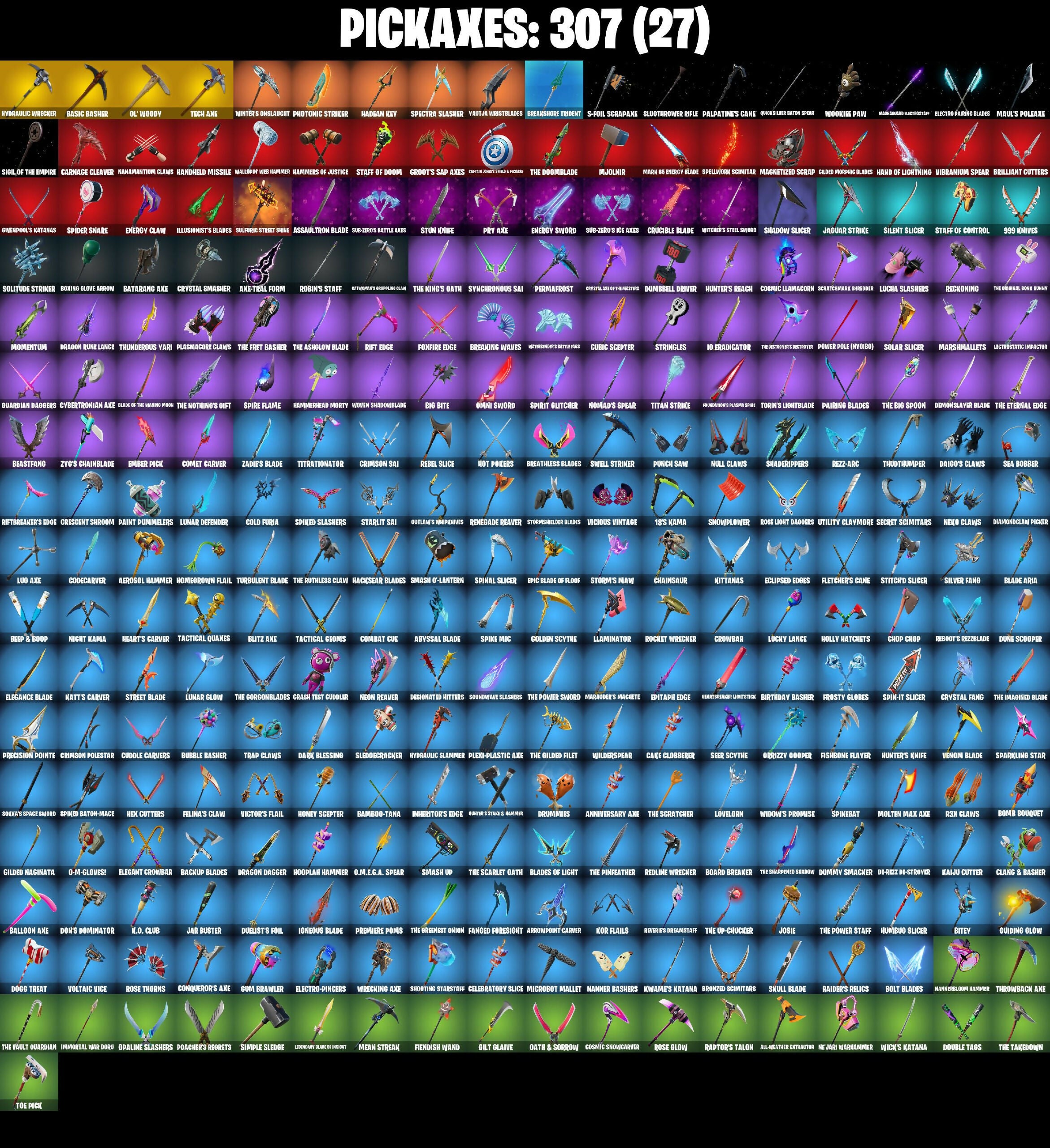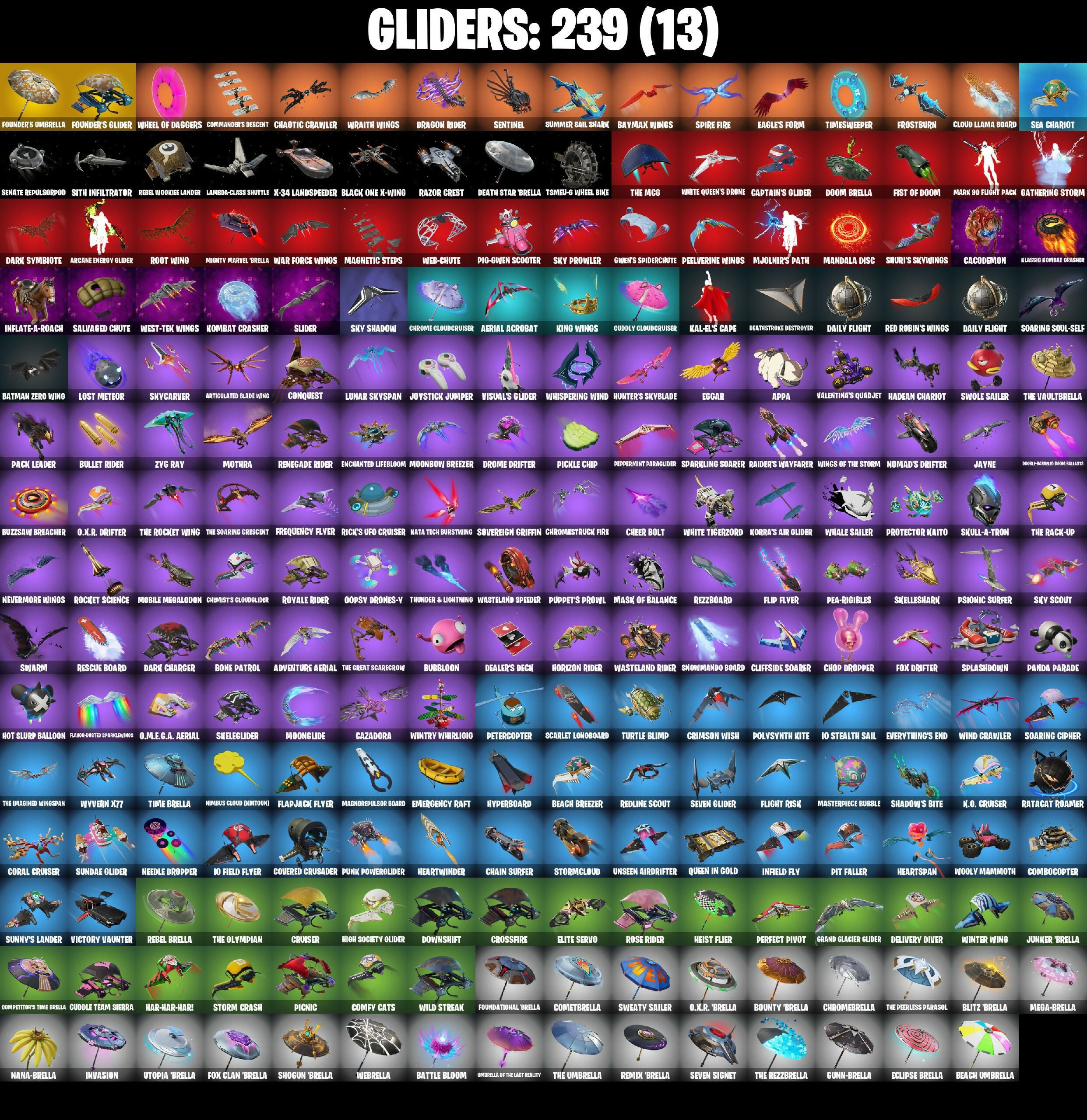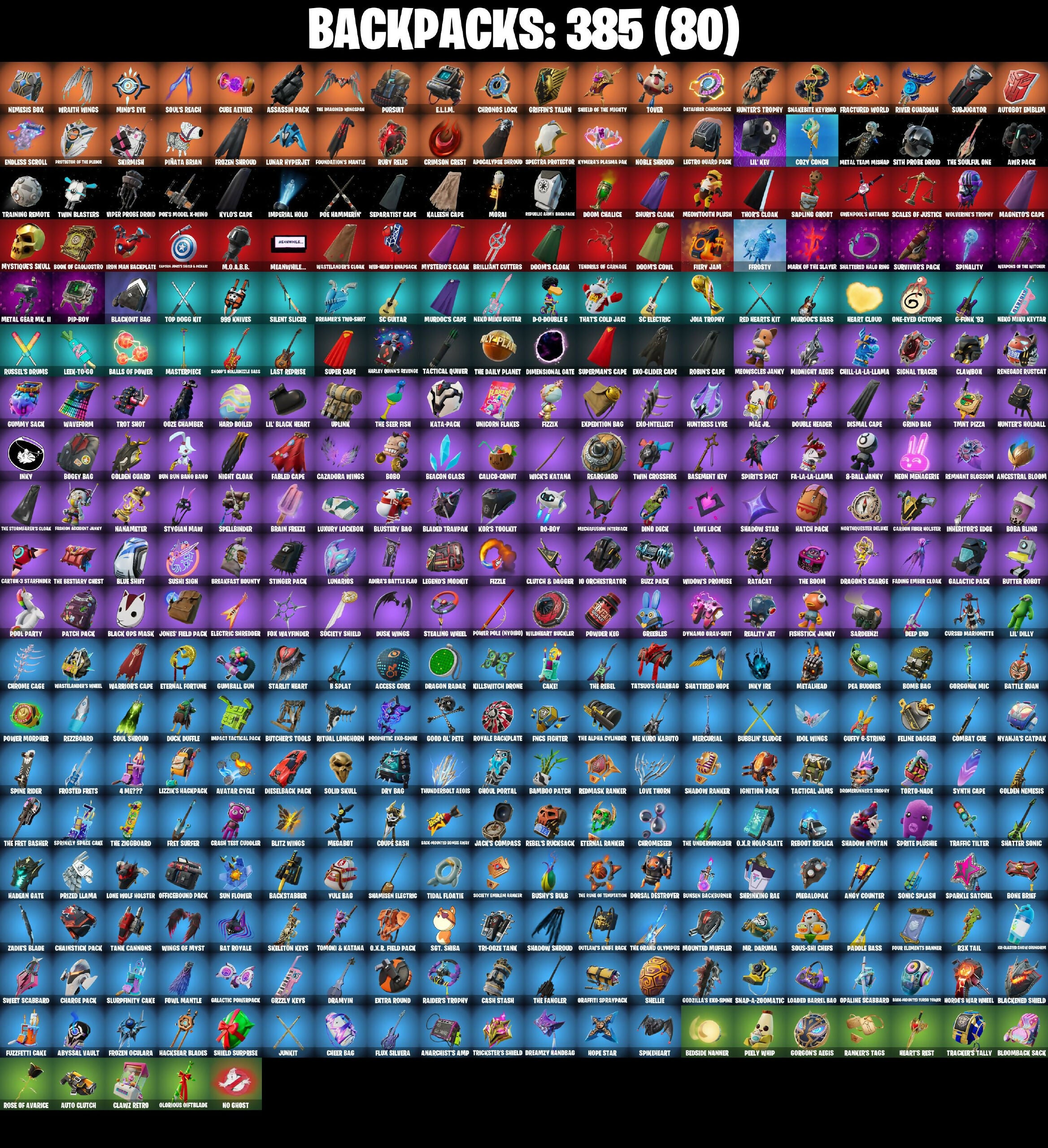 (Snikit!), 10 Field Flyer, 10 Stealth Sail, 18'S Kama, 4 Metz!, 8-Ball Janky, 999 Knives, A Warrior Prepares, A.I.M., AWR Pack, Abszne, Abyssal Blade, Abyssal Vault, Access Core, Adira, Adira's Battle Flag, Adventure Aerial, Aerial Acrobat, Aerosol Hammer, Agent Jones, Agent Jones Gengar, Agent Patch, Ahsoka Tano, All-Weather Extractor, Anarchist's Amp, Ancestral Bloom, Andy Fangerson, Angy Counter, Anniversary Axe, Antonia, Aphrodite, Apocalypse Shroud, Appa, Apprentice Evie, Arachrobatics, Arcane Energy Glider, Arcane Research, Arctic Adeline, Ares, Armored, Arrowpoint Carver, Artemis, Articulated Blade Wing, Ascension Nizomi, Assassin Pack, Assaultron Blade, Astral Ace, Astro Armor, Augury, Aurelian, Auto Clutch, Autobot Emblem, Avatar Cycle, Avatar's Flourish, Avi, Shucks., Avla Winn, Ax-Eternal Form, Ayda, Azarath Metrion Zinthos, B Splat, Back-Rounted Turbo Player, Backstabber, Backup Blades, Balance Board, Balanced, Balloon Axe, Balls of Power, Bamboo Patch, Bamboo-Tana, Baron's Hoard, Basement Key, Basic Basher, Bat Royale, Batarang Axe, Batman Zero Wing, Battle Blessing, Battle Bloom, Battle Gamer Mave, Battle Ruin, Baymax Wings, Beach Breezer, Beach Umbrella, Beacon Glass, Bean Bag, Beastfang, Bedside Manner, Beep & Boop, Bernie, Big Bite, Big Doll, Big Fan, Bike To Go, Birdarang Flourish, Birthday Basher, Bitey, Black One X-Wing, Black Ops Mask, Black Panther (Guard), Black Queen, Blackened Shield, Blackout Bag, Blade Aria, Blade Of The Waning Moon, Bladed Trapvak, Blades Of Light, Blazing Fire Crossbow, Blitz Axe, Blitz Brella, Blitz Wings, Bloomback Sack, Blowin' Up, Blue Shift, Blue Striker, Blustery Bag, Bluzabelle, Board Breaker, Boba Bling, Boba Snack, Bobo, Bogey Bag, Bolt Blades, Bomb Bag, Bomb Bouquet, Bone Breaker, Bone Brief, Bone Patrol, Bones, Boogie Down, Book of Cagliostro, Boomin', Boots N' Cats, Bounty Brella, Bow! Go, Boxing Glove Arrows, Brain Freeze, Brainiac, Brawler, Breakdown, Breakfast Bounty, Breaking Waves, Breakshore Trident, Breathless Blades, Brian, Brilliant Cutters, Brite Moves, Brite Raider, Britta Fortune Mini, Bronzed Scimitars, Bubble Basher, Bubblin' Sludge, Bubloon, Bullet Rider, Bun Bun Bano Bano, Bunsen Backburner, Bushy's Bulbs, Busy, Butcher's Tools, Butter Robot, Buzz Beat, Buzz Pack, Buzzsaw Breacher, Bytes, Cacodemon, Cake Clobberer, Cake!, Calamity, Calculated, Calico-Donut, Called Shot, Candy War Machine, Captain Invadita, Captain Jones, Captain Llamerica, Captain Phasma, Captain's Glider, Carbon Fiber Holster, Cardistry, Carmine Rosso, Carnage, Carnage Cleaver, Cartoon-X Starfinder, Cash Stash, Cassidy Quinn, Castaway Jonesy, Castor, Cauldron Chill, Cazadora, Cazadora Wings, Celebratory Slice, Cerberus, Chain Surfer, Chainsaur, Chainstick Pack, Chalker Up Q-Ball, Chaos Agent, Chaos Director, Chaotic Crawler, Charge Pack, Charlotte, Cheer Bag, Cheer Bolt, Chef's Special, Chemist's Cloudglider, Chewbacca, Chill-La-La-Llama, Choice Knit, Chop Chop, Chop Dropper, Chrombrella, Chrome Cage, Chrome Cloudcruiser, Chrome Punk, Chromessed, Chromestruck Fire, Chronos Lock, Clang & Basher, Clanit Retro, Clara, Clark Kent, Classic Pellegrino, Clawbox, Clean Sweep, Click, Cliffside Soarer, Clone Trooper, Cloud Llama Board, Cloud Team Specialist, Cluck (Slurp!), Clutch & Dagger, Codecarver, Codsworth's Cleanup, Cold Blood A.D.C., Cold Blood Red, Cold Furia, Combat Cue, Combat Elite, Combat Tech Jules, Combocopter, Comet Carver, Cometbrella, Comfy Cats, Commander's Descent, Competitor's Time Brella, Conch Call, Conjure Weapon, Conqueror's Axe, Conqueror's Claim, Conquest, Contract Giller, Controller Crew, Coral Cruiser, Corsicant Guard, Cosmic Legacy, Cosmic Llamacorn, Cosmic Snowcarver, Count It!, Coupé Sash, Covered Crusader, Cozy Conch, Crack It, Crash Test Cuddler, Crescent Shroom, Crimson Crest, Crimson Polestar, Crimson Power Bro, Crimson Sai, Crimson Wish, Crossfire, Crowbar, Crowning Achievement, Crucible Blade, Cruiser, Crystal Ball Of The Masters, Crystal Fang, Crystal Smasher, Cube Aether, Cubic Scepter, Cuddle Carvers, Cuddle Team Sierra, Cuddly Cloudcruiser, Curling Iron, Cursed Marionette, Cybertronian Axe, Cyclo Curl, D-Double G, Dagger Dance, Dahlia, Daigo, Daigo's Claws, Daily Flight, Dancefloor Diva, Danica, Dark, Dark Blessing, Dark Charger, Dark Dodgo, Dark Gwenpool, Dark Side, Dark Symbiote, Dark Water's mt Roaming Omen, Darklands Sith Raider, Darth Maul, Darth Vader, Datablade Chardex, Day Ryder, De-Rezz De-Stroyer, Deadpool's Katana, Dealer's Deck, Death Star Brella, Death's Clutch, Deathstrike Destroyer, Deep End, Deerus, Delivery Diver, Dellenor The Other, Demon Hunter Rogue, Demon Slayer Blade, Desolated Hitters, Dezire, Diamond Throne, Diamondclaw Picker, Dice Roll, Die With A Smile, Die With a Smile Bruno, Dieselback Pack, Dill With It, Dimensional Gate, Dino Deck, Dino Megazord, Diploper Emilie, Dirtbike Challenge, Disassemble, Disc Knight, Dismal Cape, Diva Fever, Djurr Taisho, Do The 'Split, Doctor Doom, Doctor Slone, Doctor Strange, Dogg Treat, Doll, Don's Dominator, Doom, Doom Brella, Doom Chalice, Doom Slayer, Doom's Cloak, Doom's Cowl, Doom's Domain, Doombringer's Trophy, Dorsal Destroyer, Double Header, Double Tags, Double-Barrelled Boom Ballasts, Downshift, Doze Dab, Dragon Dagger, Dragon Dagger's Song, Dragon Radar, Dragon Rider, Dragon Rune Lance, Dragon's Charge, Dramatic Flares, Dramvin, Draw Kill Guard, Dreamer's Two-Shot, Dreamzy Handbag, Drift, Drome Drifter, Droopy, Drumline, Drummies, Dry Bag, Duck Duffla, Duelist's Card Trick, Duelist's Foil, Dumbbell Driver, Dummy Smacker, Dune Scooper, Dusk, Dusk Wings, Dusty, Dynamo Grav-Suit, Dynamo Tintina, Dynamo Tintoon-A, Eagle's Form, Ecggr, Eclipse Brella, Eclipsed Edges, Electric Shredder, Electro-Pincers, Elegance Blade, Elegant Crowbar, Elite Servo, Ellm, Elysian Artemis, Ember Pick, Emergency Raft, Emma Frost, Emo-Glider Cape, Emo-Intellect, Emperor Palpatine, Empress Fan Dance, Enchanted Lifebloom, Endeavour, Endless Scroll, Energized Godzilla, Energy