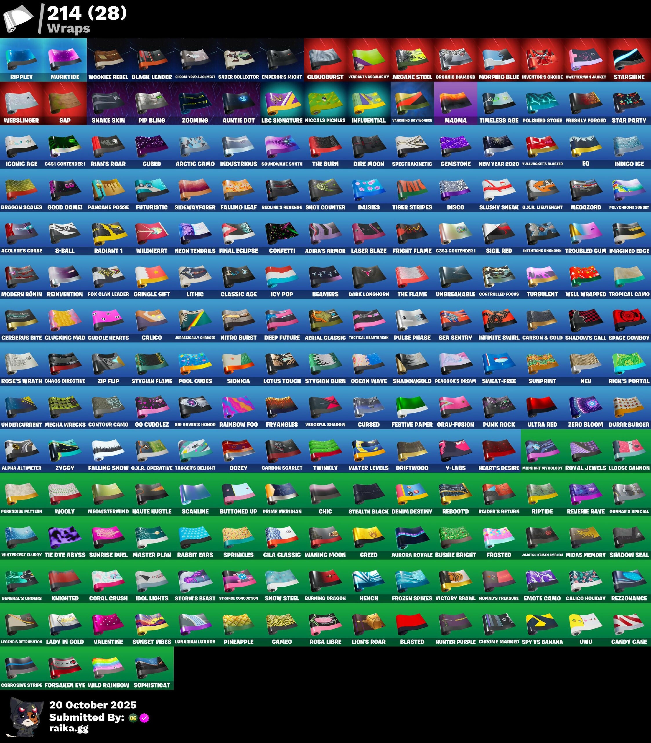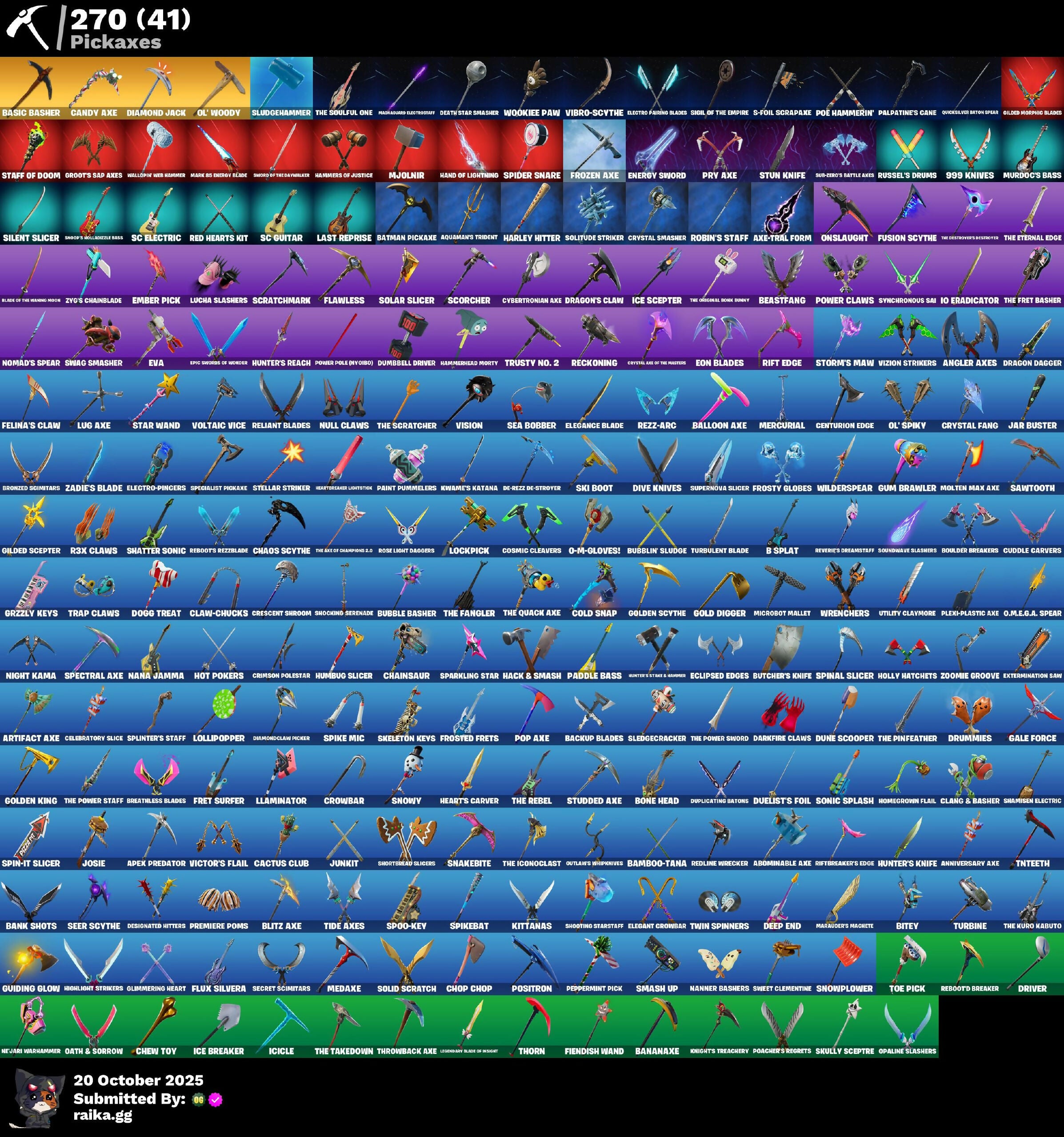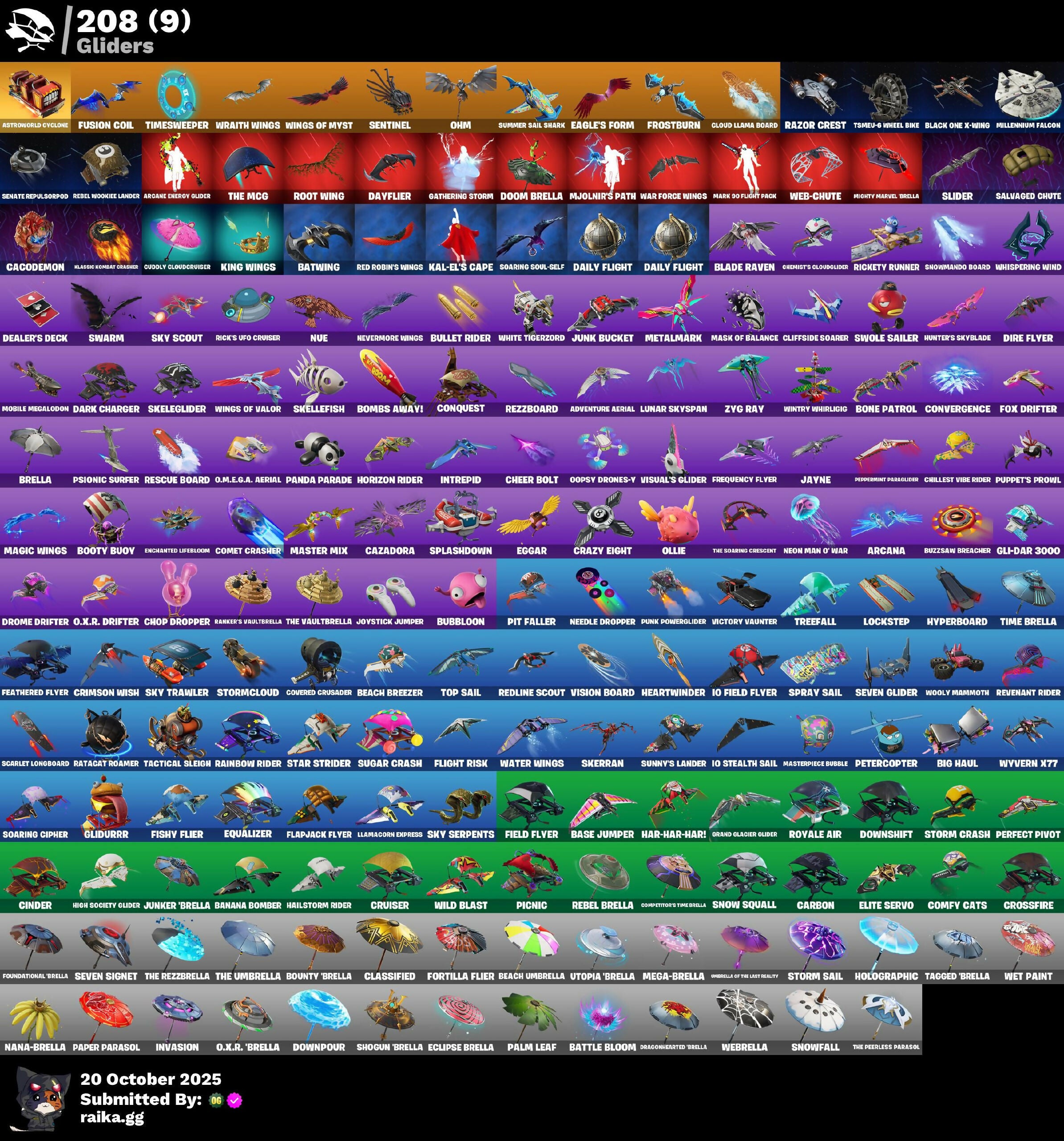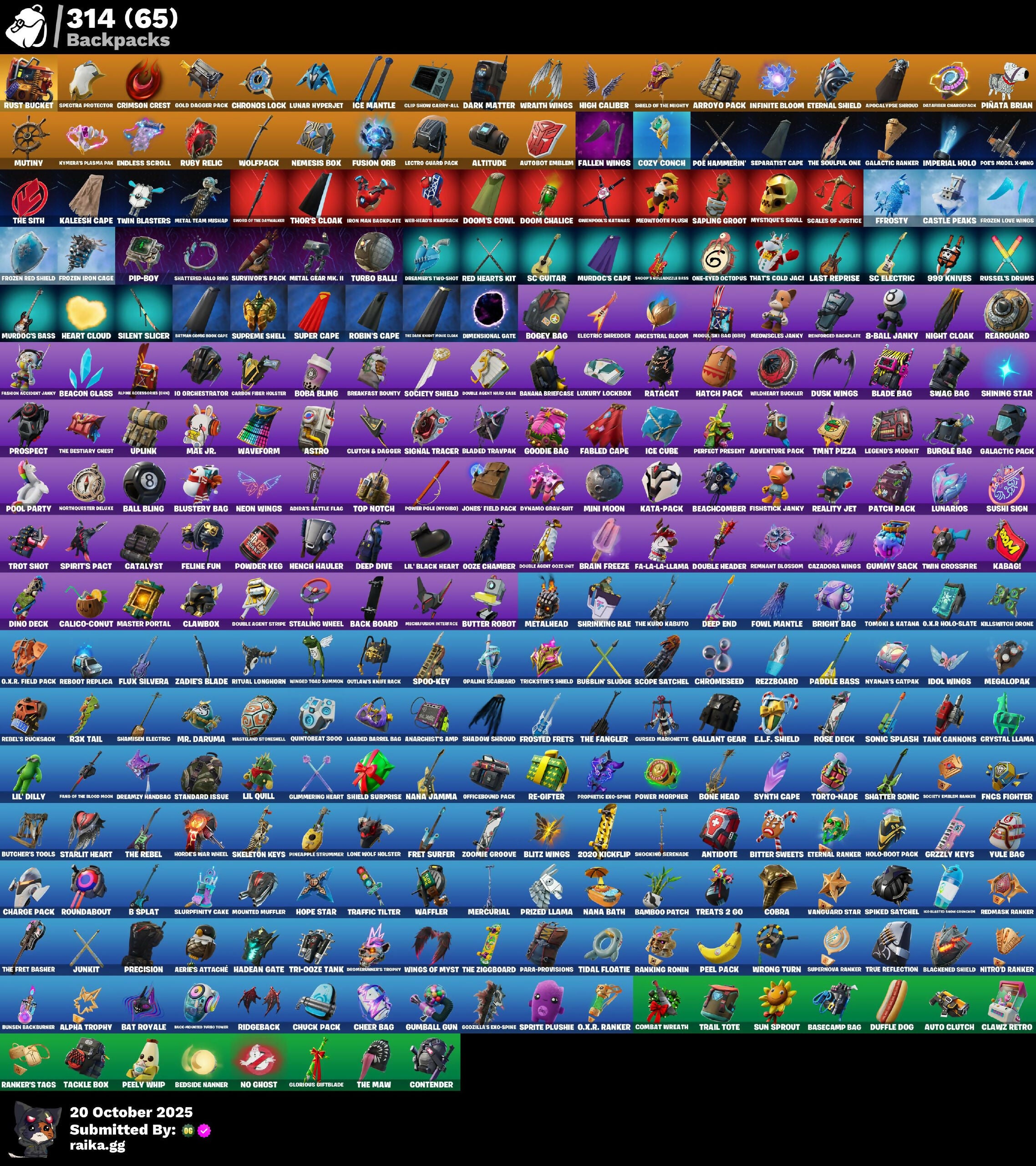10 Field Flyer, 10 Orchestrator, 10 Stealth Sail, 2020 Kickflip, 8-Ball, 8-Ball Janky, 8-Ball Vs Scratch, 999 Knives, Abominable Axe, Acolyte's Curse, Adira's Armor, Adira's Battle Flag, Adventure Aerial, Adventure Pack, Aerial Classic, Aerie's Attaché, Agent Jones, Agent Patch, Agent Peely, Air Shredder, Alpha Altimeter, Alpha Trophy, Alpine Accessories (NKA), Alpine Ace (Chn), Altitude, Anarchist’s Amp, Ancestral Bloom, Angler Axes, Anniversary Axe, Antidote, Antonia, Apex Predator, Apocalypse Shroud, Apprentice Evie, Aquaman's Trident, Arcana, Arcane Energy Glider, Arcane Research, Arcane Steel, Arctic Adeline, Arctic Assassin, Arctic Camo, Arroyo Pack, Artifact Axe, Ascend!, Assault Trooper, Astra, Astro, Astroworld Cyclone, Augury, Auntie Dot, Aurora Royale, Auto Clutch, Autobot Emblem, Aw, Shucks., Axe-Tral Form, Ayla Winn, B Splat, Back Board, Backlash, Backup Blades, Ball Bling, Balloon Axe, Bamboo Patch, Bamboo-Tana, Banana Bomber, Banana Briefcase, Bananaxe, Bank Shots, Baron's Hoard, Base Jumper, Basecamp Bag, Basic Basher, Bat Royale, Batman Comic Book Cape, Batman Comic Book Outfit, Batman Pickaxe, Battle Bloom, Battle Call, Battle Damer Mae, Battlehawk, Batwing, Beach Breezer, Beach Umbrella, Beachcomber, Beacon Glass, Beamers, Bean Bag, Beastfang, Bedside Nanner, Beep Beep, Bernie, Best Mates, Big Fan, Big Haul, Bike To Go, Billy Bounce, Bird Call, Birdaring Flourish, Bitey, Bitter Sweets, Black Leader, Black One X-wing, Black-Whited Turbo Tower, Blackened Shield, Blackheart, Blade, Blade Bag, Blade Of The Waning Moon, Blade Raven, Bladed Travpak, Blasted, Blitz Axe, Blitz Wings, Blowing Bubbles, Blustery Bag, Boba Bling, Bogey Bag, Boing!, Bombs Away!, Bone Breaker, Bone Head, Bone Patrol, Boogie Down, Boomin', Bootsin' Cats, Booty Buoy, Boulder Breakers, Bounty 'Brella, Bow Go, Brain Freeze, Breakfast Bounty, Breaking Point, Breathless Blades, Brella, Bright Bag, Brilliant Striker, Bronzed Scimitars, Brush Your Shoulders, Bubble Basher, Bubblin' Sludge, Bubblin’ Sludge, Bubbloon, Bullet Rider, Bullseye, Bunnymoon, Bunsen Backburner, Burgle Bag, Burning Dragon, Burnoff, Bushie Bright, Busy, Butcher's Knife, Butcher's Tools, Butter Robot, Buttoned Up, Buzz Beat, Buzzsaw Breacher, C3s3 Contender 1, C4s1 Contender 1, Cacodemon, Cactus Club, Calamity, Calculated, Calico, Calico Holiday, Calico-Coconut, Call Me, Cameo, Cameo Vs Chic, Candy Axe, Candy Cane, Cap Kick, Caper, Captain Phasma, Captain Talon, Carbide, Carbon, Carbon & Gold, Carbon Fiber Holster, Carbon Scarlet, Card Drop, Cardistry, Castle Peaks, Cat Flip, Catalyst, Cauldron Chill, Cazadora, Cazadora Wings, Celebratory Slice, Centurion, Centurion Edge, Cerberus Bite, Chainsaur, Chaos Agent, Chaos Directive, Chaos Double Agent, Chaos Scythe, Charge Pack, Cheer Bag, Cheer Bolt, Chemist's Cloudglider, Chew Toy, Chic, Chill Count, Chillest Vibe Rider, Choice Knit, Chop Chop, Chop Dropper, Chrome Marked, Chrome Punk, Chromeseed, Chronos Lock, Chuck Pack, Cinder, Clang & Basher, Classic Age, Classic Kombat Crasher, Classified, Claw-Chucks, Clawbox, Clawz Retro, Clean Sweep, Cliffside Soarer, Cloud Llama Board, Cloudburst, Cluck, Clucking Mad, Clutch & Dagger, Cobalt, Cobra, Codename E.L.F., Coin Flip, Cold Snap, Color Crush, Combat Wreath, Comet Crasher, Comfy Cats, Competitor's Time Brella, Confetti, Conga, Conquest, Contender, Contour Camo, Controlled Focus, Convergence, Coral Crush, Corrosive Stripe, Cosmic Cleavers, Count It!, Covered Crusader, Cozy Commander, Cozy Conch, Cozy Jonesy, Crabby, Crack It, Crazy Eight, Crescent Shroom, Crimson Crest, Crimson Polestar, Crimson Wish, Criss-Cross, Crossfire, Crowbar, Crowning Achievement, Cruiser, Crusher, CryStall Llama, Crystal, Crystal Fang, Crystal Smasher, Cubed, Cuddle Carvers, Cuddle Hearts, Cuddly Cloudcruiser, Curling Iron, Cursed, Cursed Marionette, Cybertronian Axe, DJ Yonder, Dab, Dabstand, Daily Flight, Daisies, Danica, Dark Charger, Dark Longhorn, Dark Matter, Dark Voyager, Darkfire Claws, Datafiber Charged Pack, Dayflier, Daywalker's Kata, De-Rezz De-Stroyer, Deadpool, Dealer's Deck, Death Star Smasher, Deep Dive, Deep End, Deep Future, Denied, Denim Destiny, Designated Hitters, Diamond Jack, Diamond Throne, Diamondclaw Picker, Dice Roll, Die With A Smile, Die With A Smile Bruno, Dimensional Gate, Dino Deck, Dino Megazord, Dip, Dire, Dire Flyer, Dire Moon, Disco, Dive Knives, Doctor Doom, Doctor Slone, Dogg Treat, Doom Brella, Doom Chalice, Doom's Cowl, Double Agent Hush, Double Agent Ird Case, Double Agent Ooze Unit, Double Agent Stripe, Double Header, Downpour, Downshift, Doze Dab, Dragon Dagger, Dragon Daggers Song, Dragon Scales, Dragon Stance, Dragon's Claw, Dragonhearted 'Brella, Dramatic Flares, Dreamer's Two-Shot, Dreamzy Handbag, Dribblin', Drift, Driftwood, Driver, Drome Drifter, Dromedary's Trophy, Droop, Drop The Bass, Drummies, Duelist's Foil, Duffle Dog, Dumbbell Driver, Dummy, Dune Scooper, Dupli-Kate, Duplicating Batons, Duplikates, Durr Burger, Dusk, Dusk Knight, Dusk Wings, Dynamo Grav-Suit, E.L.F. Shield, Eagle's Form, Echo, Eclipse Brella, Eclipsed Edges, Eggar, Electric Shredder, Electro Shuffle, Electro-Pincers, Elegance Blade, Elegant Crowbar, Elite Agent, Elite Servo, Ember, Ember Pick, Emote Camo, Emperor Palpatine, Emperor's Might, Enchanted Lifebloom, Endless Scroll, Energy Sword, Eon Blades, Eq, Equalizer, Era, Eternal Knight, Eternal Ranker, Eternal Shield, Eva, Evasive Maneuvers, Everybody Loves Me, Evil Plan, Extermination Saw, FNCS Fighter, Fa-La-La-Llama, Fable, Fabled Cape, Face Palm, Fade, Fallen Love Ranger, Fallen Wings, Falling Leaf, Falling Snow, Fang Dance, Fang Of The Blood Moon, Fashion Accident Janky, Feathered Flyer, Feel The Force, Feelin' Jaunty, Felina's Claw, Feline Fun, Festival Phaedra, Festive Paper, Ffrosty, Field Flyer, Fiendish Wand, Fierce, Final Eclipse, Fish Thicc, Fishstick Janky, Fishy Flier, Fist Bump, Flaky Feast, Flamenco, Flapjack Flyer, Flawless, Flight Risk, Flippin' Away, Flux Silvera, Focu