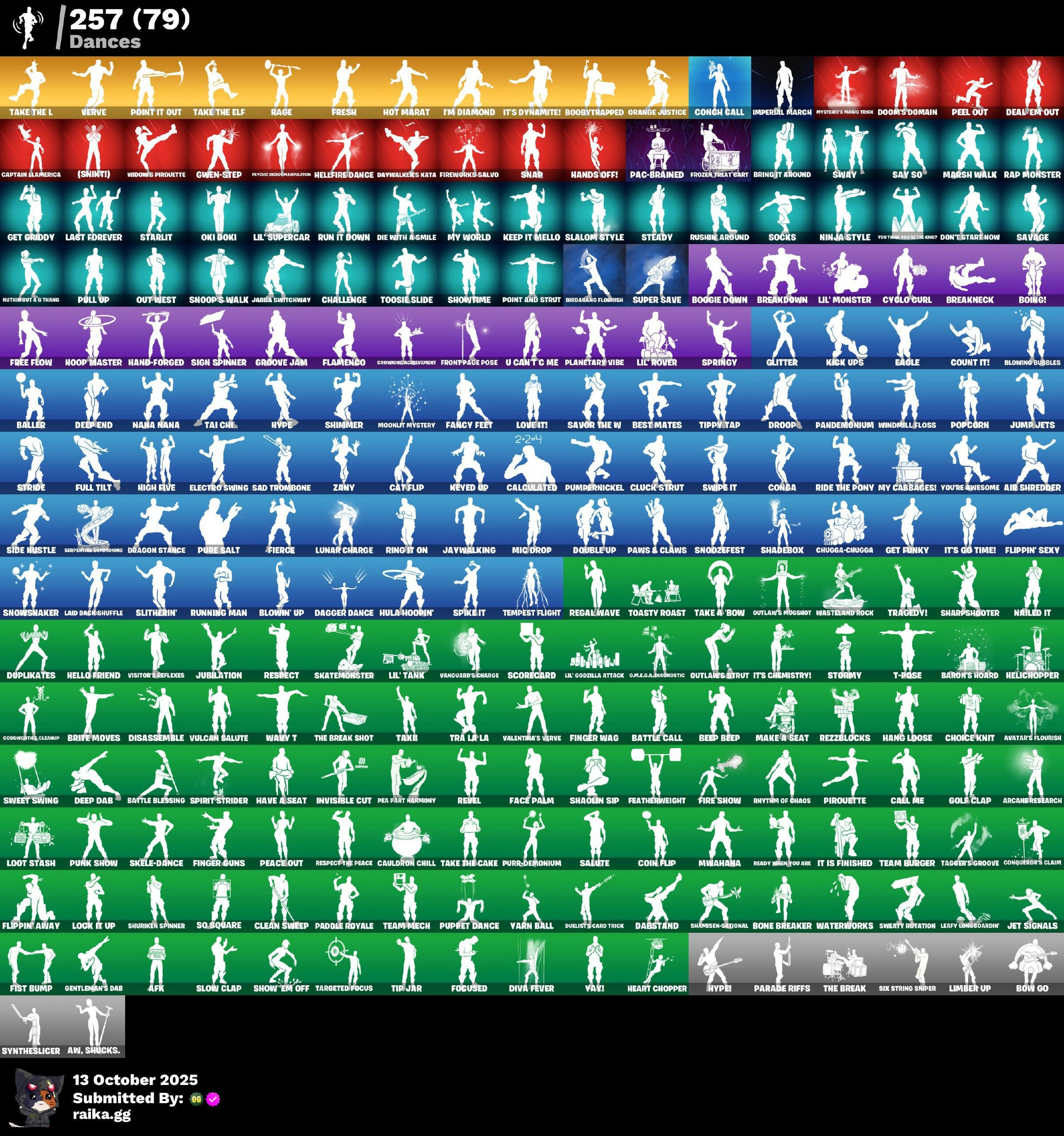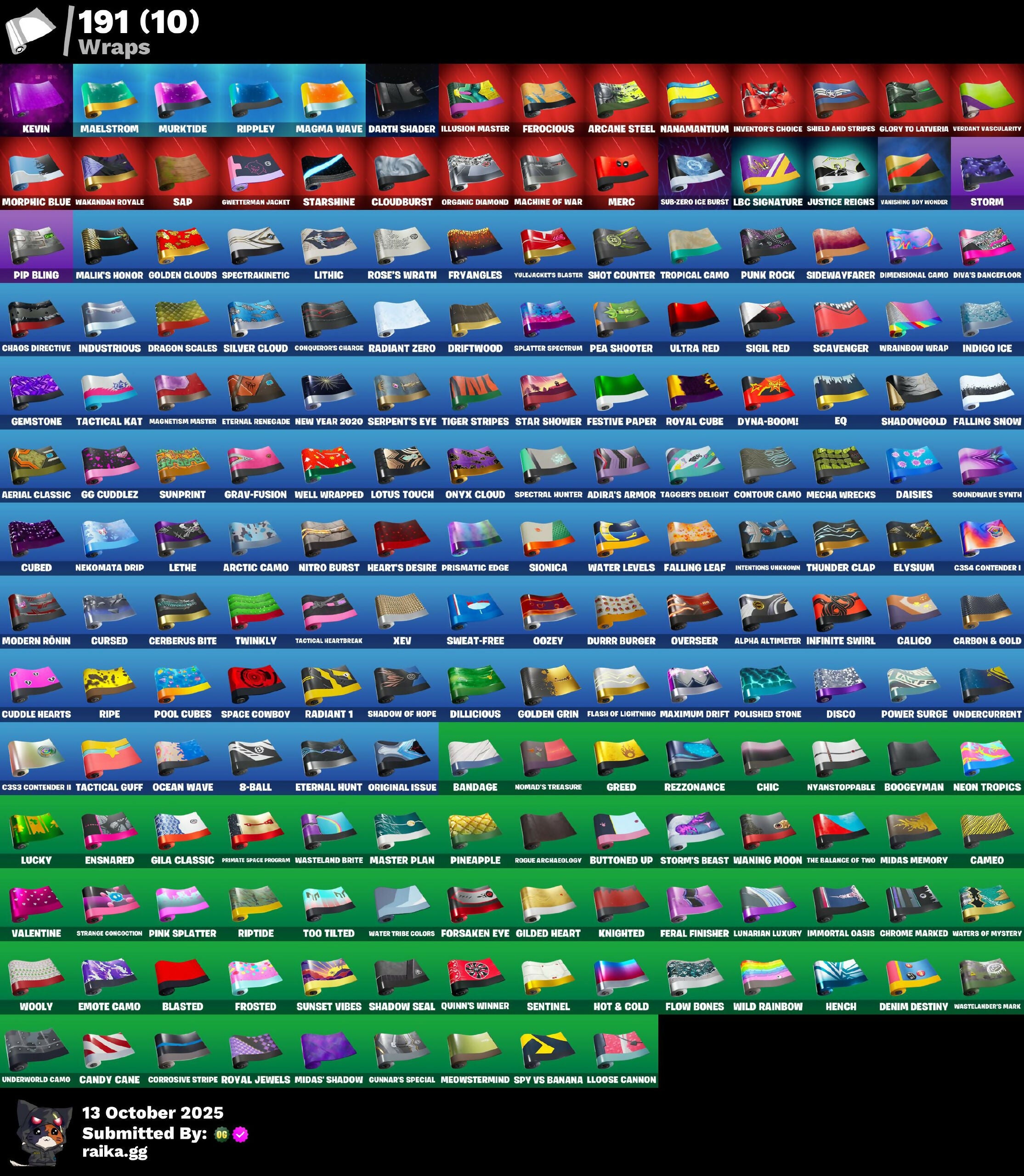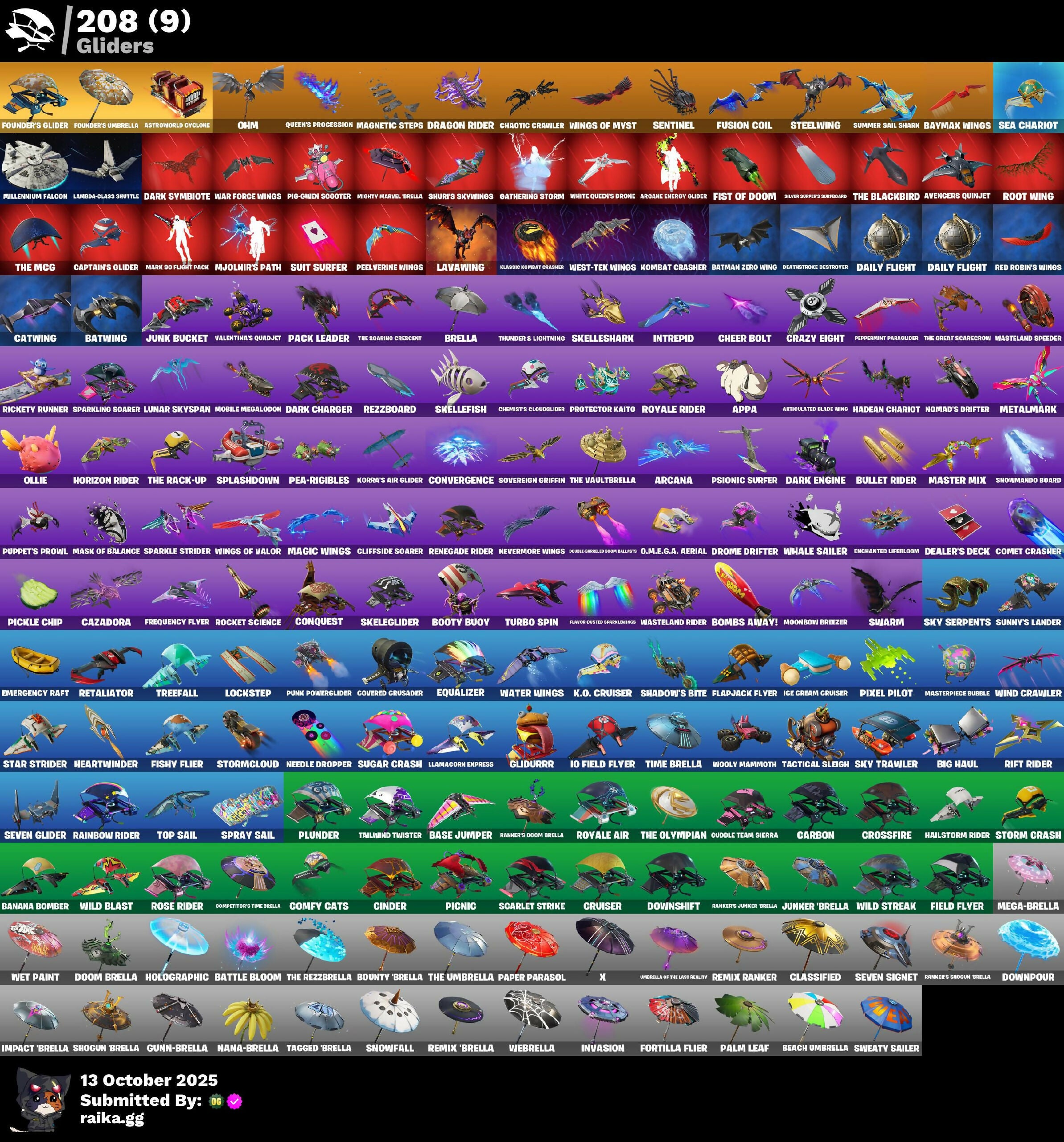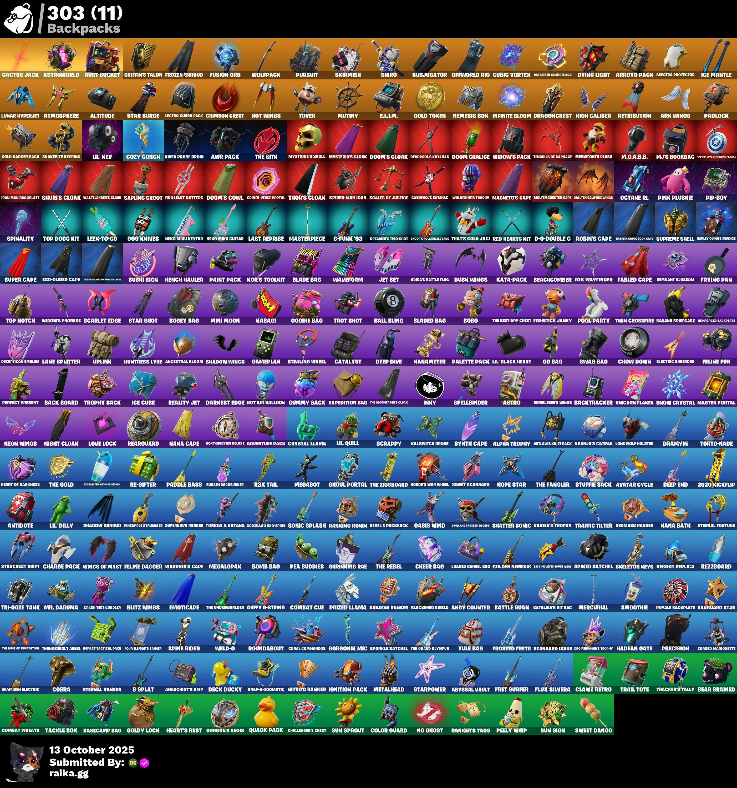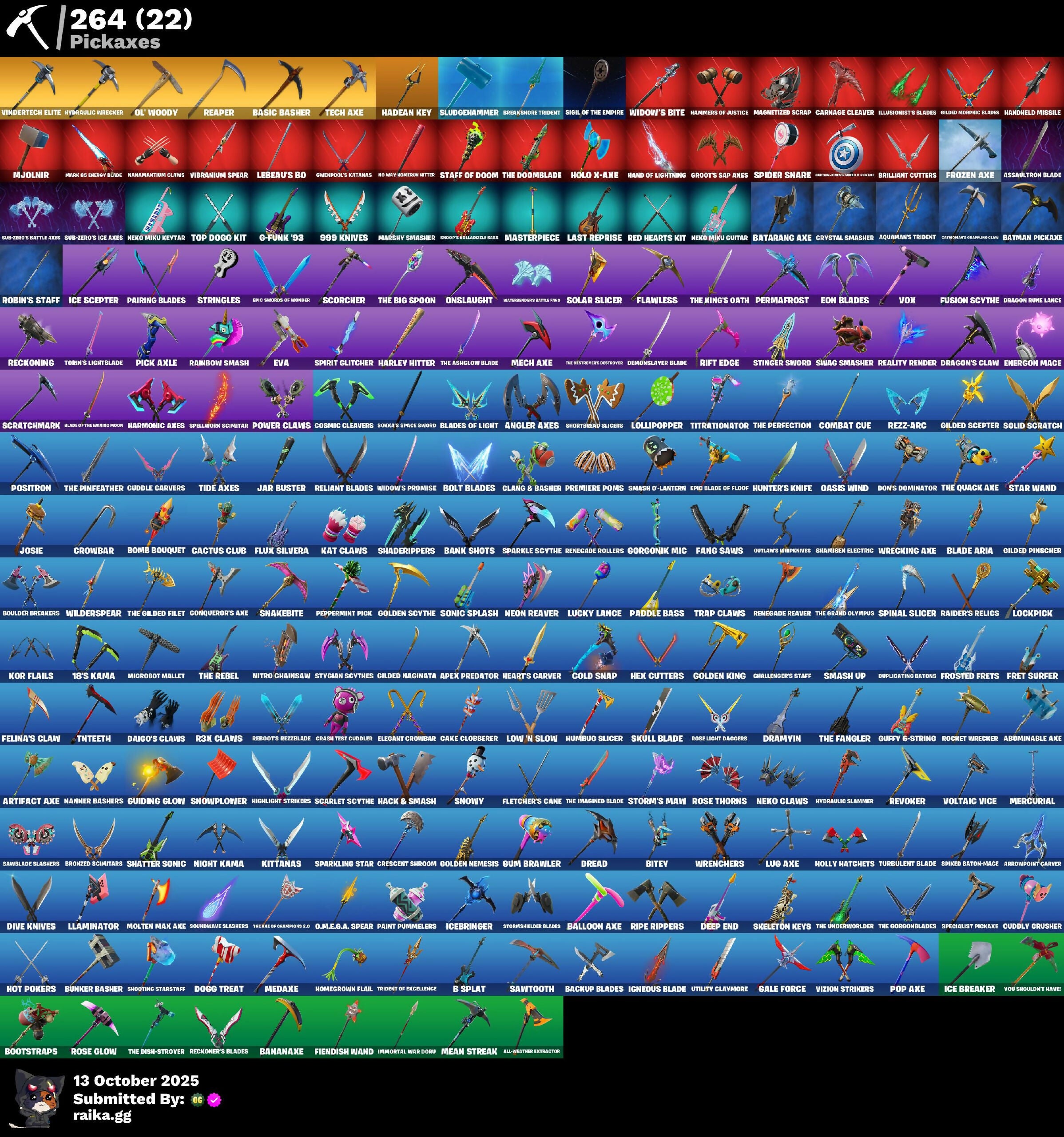 1-Ball, 18's Kama, 2020 Kickflip, 8-Ball, 8-Ball vs Scratch, 999 Knives, A.I.M., AWR Pack, Abominable Axe, Abyssal Vault, Adira, Adira's Armor, Adventure Pack, Aerial Assault Bonner, Aerial Classic, Afk, Agent Peely, Air Shredder, All-Weather Extractor, Alpha Altimeter, Alpha Trophy, Altitude, Anarchist's Amp, Ancestral Bloom, Andy Fanderson, Angler Axes, Angy Counter, Antidote, Apex Predator, Aphrodite, Appa, Aquaman, Aquaman's Trident, Arcana, Arcane Energy Glider, Arcane Research, Arcane Steel, Arctic Camo, Ares, Ark, Ark Wings, Armor & Battle Flag, Armored Batman Zero, Arrowpoint Carver, Arroyo Pack, Artemis, Articulated Blade Wing, Artifact Axe, Assaultron Blade, Astro, Astro Jack, Astroworld, Astroworld Cyclone, Atmosphere, Aura, Avatar Cycle, Avatar's Flourish, Avengers Quinjet, Aw, Shucks., B Splat, B.R.U.T.E. Gunner, Back Board, Backtracker, Backup Blades, Ball Bling, Baller, Balloon Axe, Banana Bomber, Banana Briefcase, Bananaxe, Bandage, Bank Shots, Baron's Hoard, Base Jumper, Basecamp Bag, Basic Basher, Batarang Axe, Batman Doom BGK Outfit, Batman Pickaxe, Batman Zero Wing, Battle Blessing, Battle Bloom, Battle Call, Battle Ruin, Battlebus, Battlehawk, Batwing, Baymax Wings, Beach Umbrella, Beachcomber, Bear Brained, Beep Beep, Bernie, Best Mates, Big Dill, Big Haul, Bitey, Black Widow Outfit, Blackened Shield, Blackheart, Blade Aria, Blade Bag, Blade Of The Waxing Moon, Bladed Bag, Blades Of Light, Blasted, Blitz Wings, Blizzabelle, Blowin' Up, Blowing Bubbles, Bobo, Bogey Bag, Boing!, Bolt Blades, Bomb Bag, Bomb Bouquet, Bombs Away!, Bone Breaker, Bones, Boobytrapped, Boogeyman, Boogie Down, Bootstraps, Booty Buoy, Bot Air Balloon, Boulder Breakers, Bounty 'Brella, Bow Go, Breakdown, Breakneck, Breakshore Trident, Brella, Brilliant Cutters, Bring It Around, Brite Bomber, Brite Moves, Brite Raider, Broadrang Flourish, Bronzed Scimitars, Bullet Rider, Bumblebee, Bumblebee's Wings, Bunker Basher, Bunker Jonesy, Bunsen Backburner, Buttoned Up, C3S3 Contender II, C3S4 Contender I, Cactus Club, Cactus Jack, Cake Clobberer, Calamity, Calculated, Calico, Call Me, Cameo, Cameo vs Chic, Candy Cane, Captain America, Captain America's Shield & Pickaxe, Captain Jones, Captain's Glider, Carbide, Carbon, Carbon & Gold, Carmine Rosso, Carnage, Carnage Cleaver, Cassidy Quinn, Castor, Cat Flip, Catalyst, Catwing, Catwoman Zero, Cauldron Chill, Cazadora, Cerberus, Cerberus Bite, Challenge, Challenger's Crest, Challenger's Staff, Champion Kuno, Chaos Directive, Chaos Director, Chaotic Crawler, Charge Pack, Charlotte, Cheer Bag, Cheer Bolt, Chemist's Cloudglider, Chic, Choice Knit, Chord Kahele, Chow Down, Chrome Marked, Chugga-Chugga, Cinder, Clang & Basher, Classified, Clawz Retro, Clean Sweep, Cliffside Soarer, Cloaked Shadow, Cloaked Star, Cloudburst, Cluck Strut, Cobalt, Cobra, Cogsworth's Cleanup, Coin Flip, Cold Snap, Color Guard, Combat Cue, Combat Wreath, Comet Crasher, Comfy Cats, Competitor's Time Brella, Conch Call, Conga, Conqueror's Axe, Conqueror's Charge, Conqueror's Claim, Conquest, Contour Camo, Convergence, Coral Commandos, Corrosive Stripe, Cosmic Cleavers, Count It!, Covered Crusader, Cozy Conch, Crash Test Cuddler, Crazy Eight, Crescent Shroom, Crimson Crest, Crossfire, Crowbar, Crowning Achievement, Cruiser, Crystal, Crystal Llama, Crystal Smasher, Cubed, Cubic Vortex, Cuddle Carvers, Cuddle Hearts, Cuddle Team Sierra, Cuddly Crusher, Cursed, Cursed Marionette, Cyclo Curl, D-O-Double G, DJ Yonder, Dabstand, Dagger Dance, Daigo, Daigo's Claws, Daily Flight, Daisies, Dali, Danica, Dark Charger, Dark Engine, Dark Symbiote, Darkest Edge, Darth Shader, Darth Vader, Daywalker's Kata, Deadpool, Deadpool's Katanas, Deal'em Out, Dealer's Deck, Deathstroke Destroyer, Decepticon Emblem, Deck Ducky, Deep Dab, Deep Dive, Deep End, Demi, Demonslayer Blade, Denim Destiny, Desert Dominator, Die With A Smile, Die With a Smile Bikini, Dillicious, Dimensional Camo, Dire, Disassemble, Disco, Diva Fever, Diva's Dancefloor, Dive Knives, Doctor Doom, Dogg Treat, Doggo, Don's Dominator, Don't Start Now, Doom, Doom Brella, Doom Chalice, Doom's Cloak, Doom's Cowl, Doom's Domain, Doombringer's Trophy, Double Up, Double-Barreled Boom Ballista, Downpour, Downshift, Dragon Rider, Dragon Rune Lance, Dragon Scales, Dragon Stance, Dragon's Claw, Dragoncrest, Dramvin, Dramyin, Dread, Dreamer's Two-Shot, Drift, Driftwood, Drome Drifter, Droop, Duelist's Card Trick, Dupli-Kate, Duplicates, Duplicating Batons, Durrr Burger, Dusk, Dusk Knight, Dusk Wings, Dying Light, Dyna-Boom!, Dynamo TNTina, E.L.I.M., EQ, Eagle, Electric Shredder, Electro Swing, Elegant Crowbar, Elysium, Ember, Emergency Raft, Emma Frost, Emote Camo, Emoticape, Enchanted Lifebloom, Energon Mace, Enforcer, Ensnared, Eon Blades, Epic Blade Of Flood, Epic Swords Of Wonder, Equalizer, Eternal Fortune, Eternal Hunt, Eternal Ranker, Eternal Renegade, Eternal Voyager, Eva, Evie, Exo-Gilder Cape, Expedition Bag, Fabio Sparklemane, Fable, Fabled Cape, Face Palm, Fade, Falling Leaf, Falling Snow, Fancy Feet, Fang Saws, Featherweight, Felina, Felina's Claw, Feline Dagger, Feline Fun, Feral Finisher, Ferocious, Festive Paper, Field Flyer, Fiendish Wand, Fierce, Finger Guns, Finger Wag, Fire Show, Fireworks Salvo, Fishstick Janky, Fishy Flier, Fist Bump, Fist Of Doom, Flamenco, Flapjack Flyer, Flash Of Lightning, Flavor-Dusted Sparkwings, Flawless, Fletcher Kane, Fletcher's Cane, Flippin' Away, Flippin' Sexy, Flow Bones, Flux Silvera, Focused, Forsaken Eye, Fortilla Flier, Founder's Glider, Founder's Umbrella, Four Elements Banner, Fox Wayfinder, Free Flow, Frequency Flyer, Fresh, Fret Surfer, Frog, Frontpage Pose, Frosted, Frosted Frets, Frozen Axe, Frozen Shroud, Frozen Treat Cart, Fryangles, Frying Pan, Full Tilt, Fusion, Fusion Coil, Fusion Orb, Fusion Scythe, G-Funk '93, GG Cuddlez, Gale Force, Gameplan, Gathering Storm, Gear Specialist Maya, Gemstone, Gentleman's Dab, Get Funky, Get Griddy, Ghoul Portal, Ghoul Trooper, Giddy-Up, Gideon's Katanas,