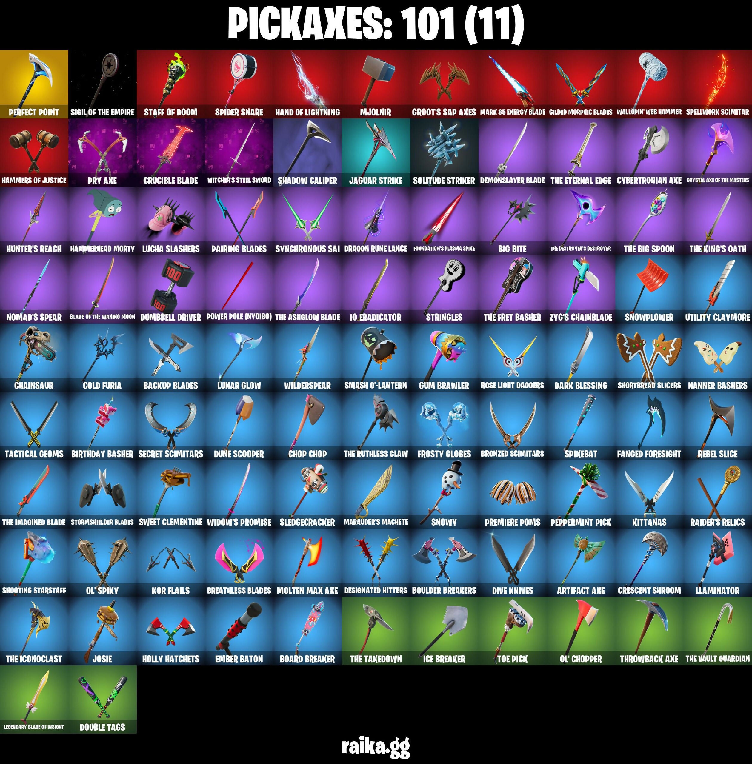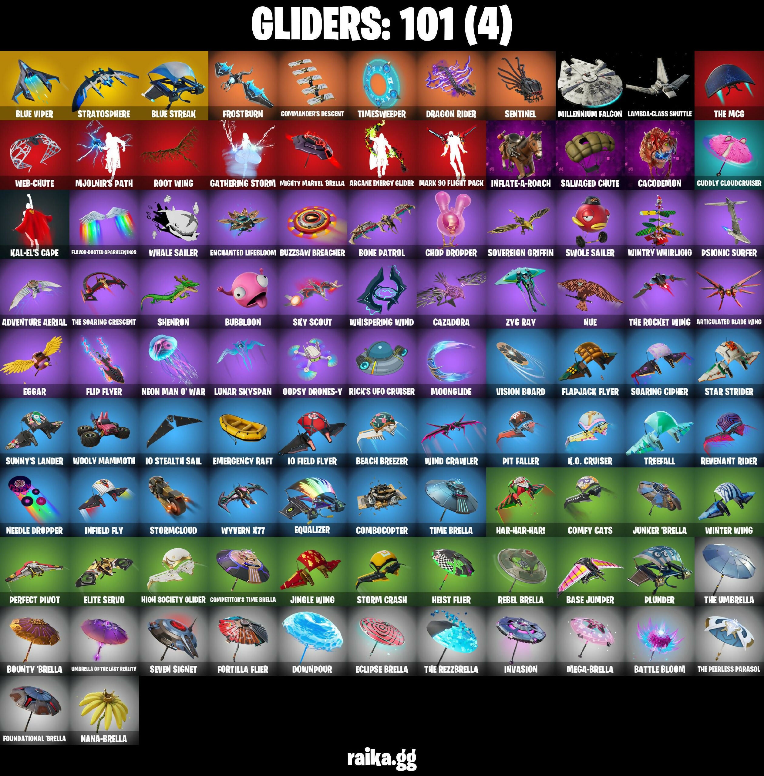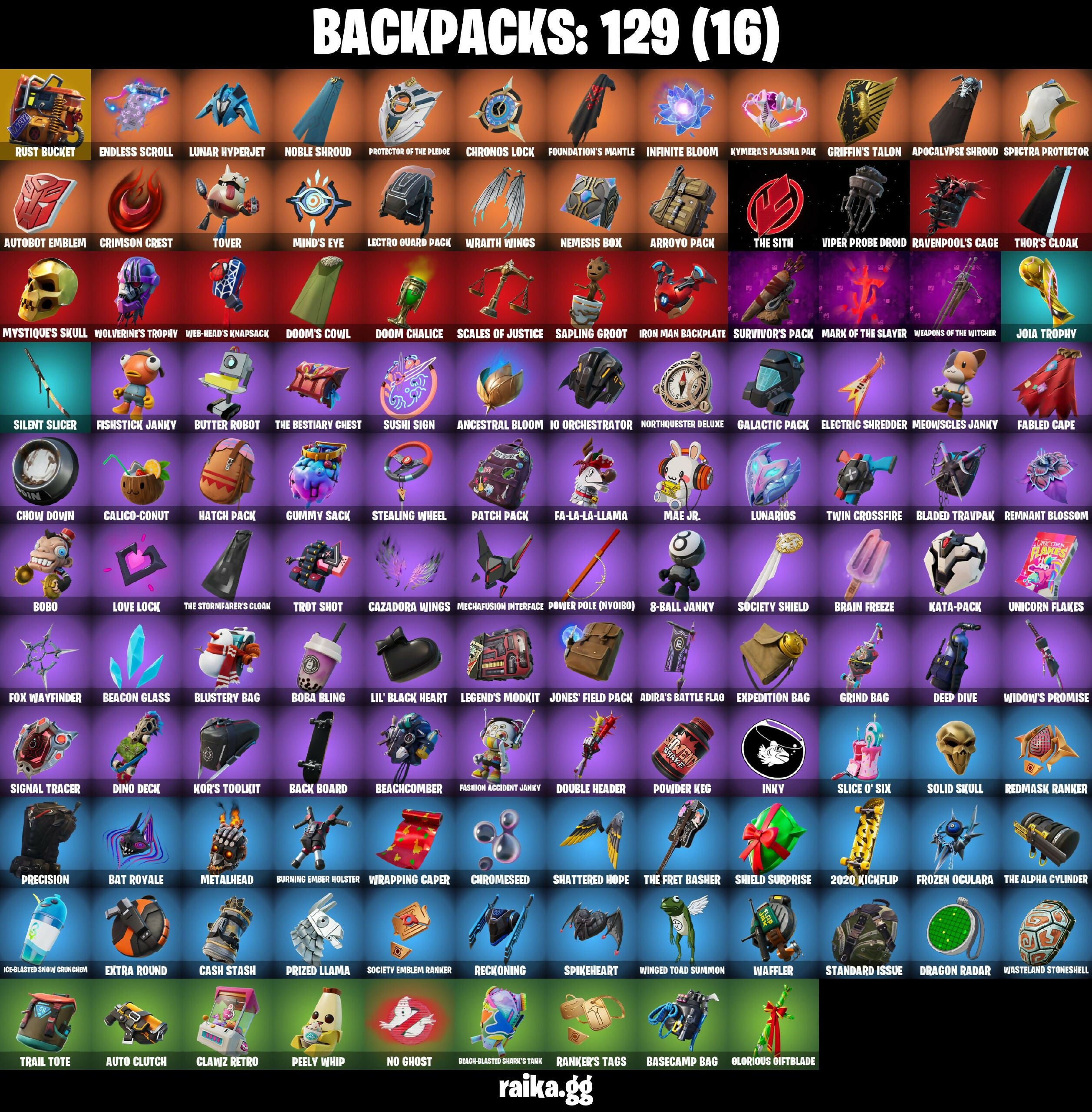 2020 Kickflip, 8-Ball Janky, A Warrior Prepares, Adira's Battle Flag, Adventure Aerial, Agent Jones (Jump 31), Ancestral Bloom, Apocalypse Shroud, Arcane Energy Glider, Arctic Adeline, Arm The Pumpkin!, Arroyo Pack, Articulated Blade Wing, Artifact Axe, Ascension Nezumi, Astro Armor, Astro Jack, Auto Clutch, Autobot Emblem, Back Board, Backup Blades, Balance Board, Base Jumper, Basecamp Bag, Bat Royale, Battle Bloom, Battle Call, Battle-Tested, Beach Breezer, Beach-Blasted Shark's Tank, Beachcomber, Beacon Glass, Bean Bag, Bear Hug, Behold!, Big Bite, Big Fan, Bim Bam Boom, Birthday Basher, Blade Of The Waning Moon, Bladed Travpak, Blowin' Up, Blue Streak, Blue Team Leader, Blue Viper, Blustery Bag, Board Breaker, Boba Bling, Boba Snack, Bobo, Bone Patrol, Boogie Down, Boosting Ki, Boots 'N' Cats, Boulder Breakers, Bounty 'Brella, Brain Freeze, Breaking Point, Breathless Blades, Bronzed Scimitars, Bubloon, Bulletproof, Bullpen Brawler Dusty, Burning Ember Holster, Butter Robot, Buzzsaw Breacher, Cacodemon, Calico-Conut, Call Me, Called Shot, Cardistry, Cash Stash, Cazadora, Cazadora Wings, Chainsaur, Charging Up, Charlotte, Choice Knit, Chop Chop, Chop Dropper, Chow Down, Chrome Punk, Chromeseed, Chronos Lock, Classic Wolverine, Clawz Retro, Clean Sweep, Click!, Club President Helsie, Cluck, Cold Blooded Ace, Cold Furia, Color Crush, Combocopter, Comfy Cats, Commander's Descent, Competitor's Time 'Brella, Count It!, Crescent Shroom, Crimson Crest, Crowning Achievement, Crucible Blade, Crystal Axe Of The Masters, Cuddly Cloudcruiser, Curling Iron, Cybertronian Axe, Cyclo Curl, D'ark, Dagger Dance, Dark Blessing, Dark Side, Darth Vader, Deep Dive, Demonslayer Blade, Designated Hitters, Dino Deck, Dive Knives, Dizzie, Doctor Slone, Doggo, Doom Chalice, Doom's Cowl, Double Header, Double Tags, Downpour, Doze Dab, Dragon Radar, Dragon Rider, Dragon Rune Lance, Dramatic Flares, Dumbbell Driver, Dune Scooper, Eclipse Brella, Eggar, Electric Shredder, Electro Swing, Elite Servo, Ember Baton, Emergency Raft, Enchanted Lifebloom, Endless Scroll, Equalizer, Evasive Maneuvers, Expedition Bag, Extra Round, Fa-La-La-Llama, Fabio Sparklemane, Fabled Cape, Fang Dance, Fanged Foresight, Fashion Accident Janky, Finger Wag, Fishtick Janky, Fixer, Flapjack Flyer, Flavor-Dusted Sparklewings, Flip Flyer, Flippin' Away, Focused, Foil Flex, Fortilla Flier, Foundation's Mantle, Foundation's Plasma Spike, Foundational 'Brella, Fox Wayfinder, Frost Squad, Frostburn, Frosty Globes, Frozen Oculara, Fusion! Hah!!, Galactic Pack, Gathering Storm, Gentleman's Dab, Get Out Of Your Mind, Gilded Morphic Blades, Glorious Giftblade, God Emperor Doom, Golf Clap, Good Guy, Griffin's Talon, Grind Bag, Groot's Sap Axes, Guff Gringle, Guggimon, Gum Brawler, Gummy Sack, Hammerhead Morty, Hammers Of Justice, Hand Of Lightning, Hand-Forged, Hang On, Har-Har-Har!, Hatch Pack, Headpiece, Heartburst, Heist Flier, Hello Friend, Helmet, High Society Glider, Hit It, Holiday Boxy, Holly Hatchets, Hot Stuff, Hunter's Reach, Hypnot-Eyes, I Declare!, I Need You To Concentrate, IO Field Flyer, IO Stealth Sail, Ice Breaker, Ice-Blasted Snow Crunch, Igni Sign, Imperial March, Indiana Jones, Infield Fly, Infinite Bloom, Inflate-A-Roach, Inky, Introducing..., Invasion, Io Eradicator, Io Orchestrator, Iron Man Backplate, It Is Finished, It's A Vibe, It's... You?, Jaguar Strike, Jennifer Walters, Jingle Wing, Job Well Done, Joia Trophy, Jones' Field Pack, Josie, Jun-Hwan, Junker 'Brella, K.O. Cruiser, Kal-El's Cape, Kalamadness, Kata-Pack, Keep It Mello, Kick Back, Kittanas, Kor Flails, Kor's Toolkit, Krisabelle, Kymera, Kymera's Plasma Pak, Lambda-Class Shuttle, Lara Croft, Lectro Guard Pack, Legend's Modkit, Legendary Blade Of Insight, Lil' Black Heart, Lil' Monster, Lil' Prancer, Lil' Rover, Lil' Saucer, Llaminator, Lock It Up, Lorenzo The Reckless, Love It!, Love Lock, Lt. John Llama, Lucha Slashers, Lunar Charge, Lunar Glow, Lunar Hyperjet, Lunar Party, Lunar Skyspan, Lunarios, Mae Jr., Make A Seat, Marauder's Machete, Mark 85 Energy Blade, Mark 90 Flight Pack, Mark Of The Slayer, Marked Marauder, Mechafusion Interface, Mega-Brella, Meowscles Janky, Metalhead, Mighty Marvel 'Brella, Millennium Falcon, Min-Joon, Mina Park, Mind's Eye, Mini Slayer Fistbump, Mjolnir, Mjolnir's Path, Molten Max Axe, Moonglide, Mwahaha, My Idol!, Mystique's Skull, Nailed It, Nana-Brella, Nanner Bashers, Needle Dropper, Nemesis Box, Neon Man O' War, Neymar Jr, Ninja Stance: Leo, No Ghost, Noble Shroud, Nomad's Spear, Northquester Deluxe, Nue, Off, Ol' Chopper, Ol' Spiky, On, Oopsy Drones-Y, Orange Justice, Paddle Royale, Pairing Blades, Patch Pack, Peely Whip, Peppermint Pick, Perfect Pivot, Perfect Point, Pit Faller, Pizza Party, Plunder, Point & Shoot, Point Patrol, Polar Peely, Ponytail, Powder Keg, Power Pole (Nvoibo), Power Pole (Nyoibo), Precision, Premiere Poms, Prized Llama, Protector Of The Pledge, Pry Axe, Psionic Surfer, Punk Storm, Purradise Meowscles, Rage Quit, Raider's Relics, Ranker's Tags, Ravenpool, Ravenpool's Cage, Raz, Ready When You Are, Rebel 'Brella, Rebel Slice, Reckoning, Red Card, Redmask Ranker, Regal Hunter Mariposa, Regal Hunter Relik, Regal Hunter Rian, Regal Hunter Trace, Regal Wave, Remnant Blossom, Respect The Peace, Revenant Rider, Rick Sanchez, Rick's UFO Cruiser, Rock Paper Scissors, Rollie, Ronin (Cape), Root Wing, Rose Light Daggers, Runway Racer, Rust Bucket, Salute, Salvaged Chute, Sandstone Joey, Sapling Groot, Scales Of Justice, Scootin', Secret Scimitars, Self Reflexing, Sentinel, Seven Signet, Shadow Boxer, Shadow Caliper, Shadow Play: Toad, Shadow Spar, Shanty For A Squad, Shaolin Sip, Sharpshooter, Shattered Hope, Shenron, Shield Surprise, Shimmer Specialist, Shooting Starstaff, Shortbread Slicers, Shuriken Spinner, Sigil Of The Empire, Signal Tracer, Silent Slicer, Silver Foil, Sing Along, Ska-Stra-Terrestrial, Skull Ranger, Sky Scout, Sled Ready Guff, Sledgecracker, Slice O' Six, Smash O'-Lantern, Snap, Snikt! Snikt!,