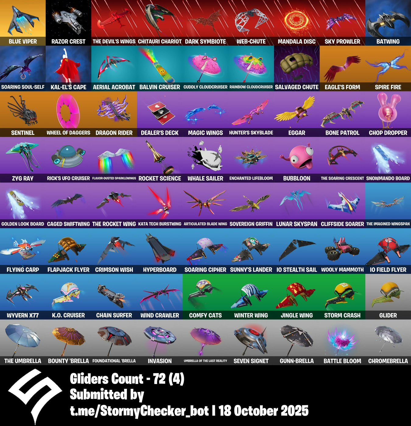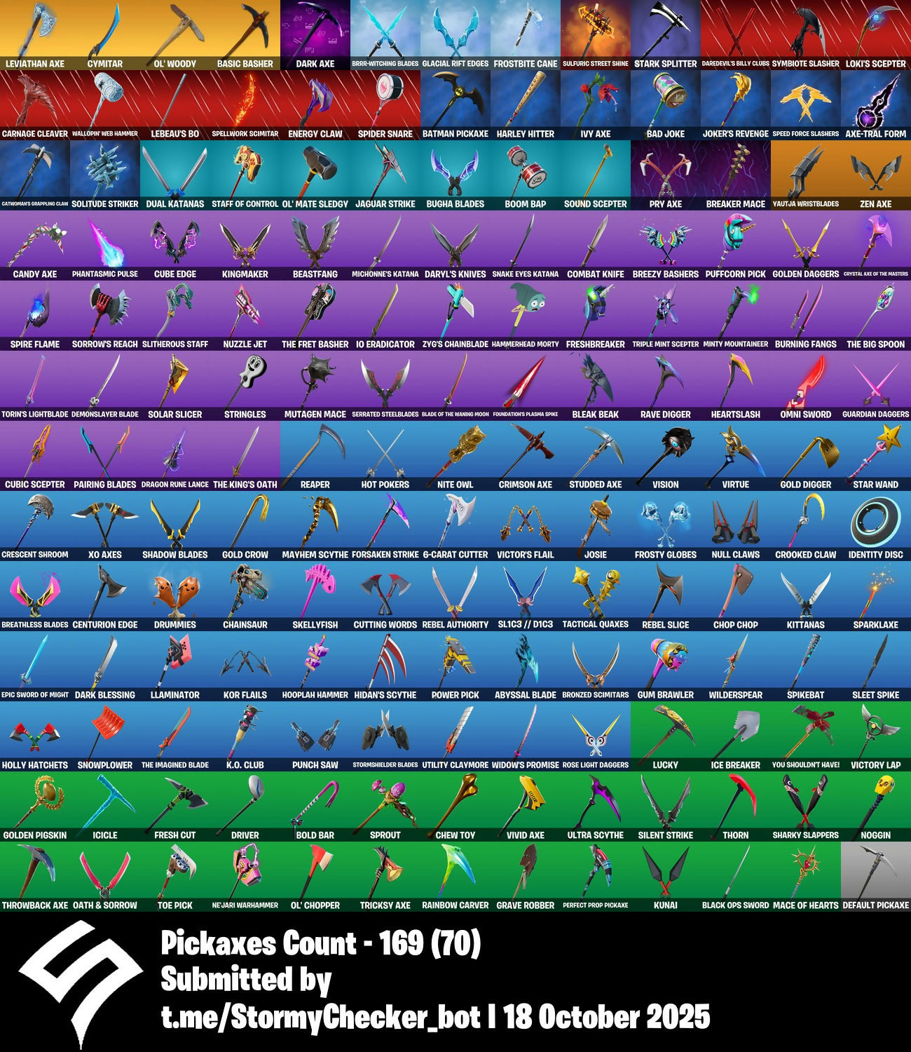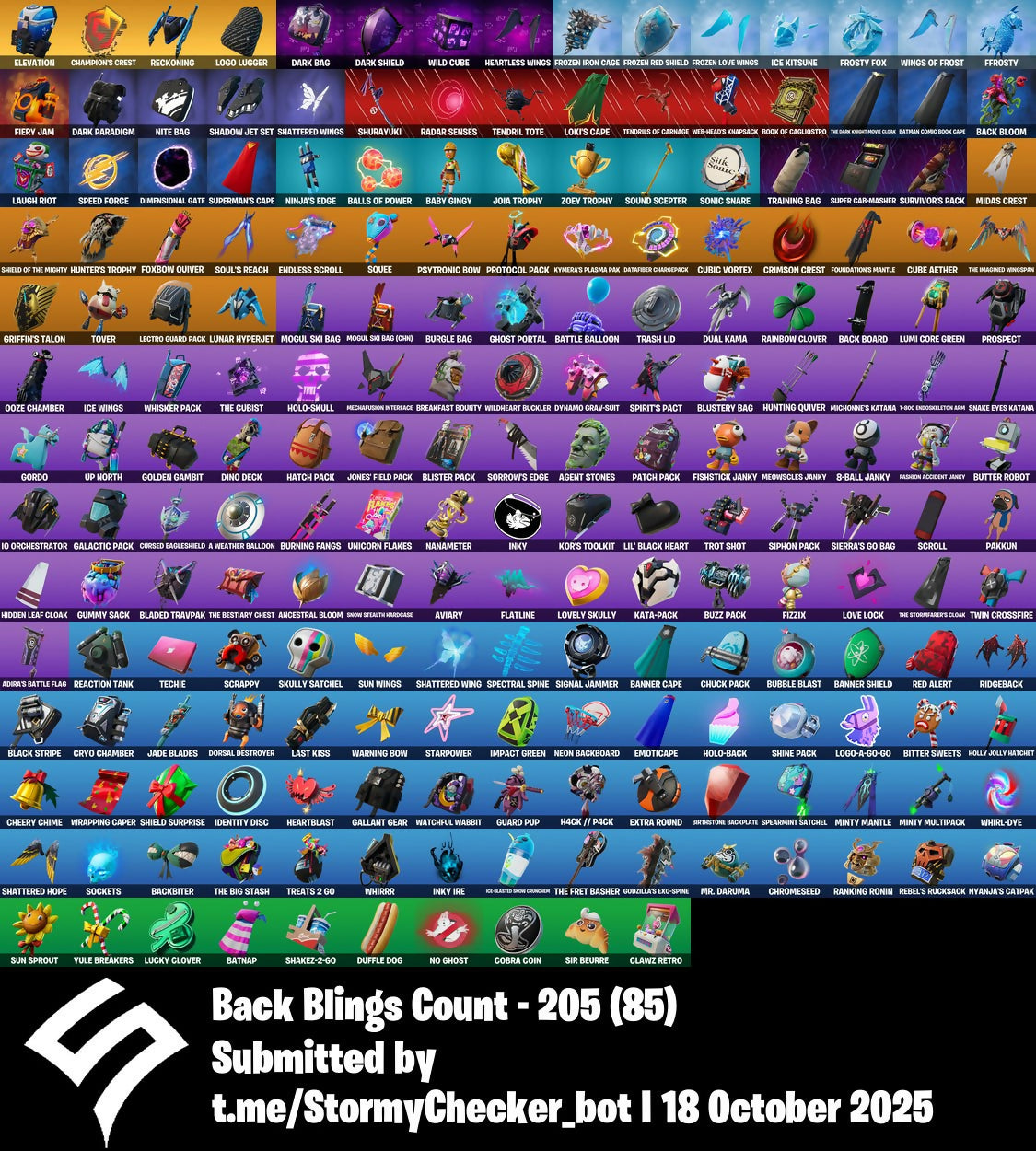 6-Carat Cutter, 8-Ball Janky, A Warrior Prepares, A Weather Balloon, Absenz, Abyssal Blade, Adira, Adira's Battle Flag, Aerial Acrobat, Aftermath, Agent Jones, Agent Stones, Air Horn, All-Hallows Steve, Alli, Ancestral Bloom, Anderson Paak, Articulated Blade Wing, Aspen, Aura, Aviary, Axe-Tral Form, Axo, Azarath Metrion Zinthos!, B.R.U.T.E. Gunner, Baby Gingy, Back Bloom, Back Board, Backbiter, Bad Joke, Baller, Balls Of Power, Balvin Cruiser, Bandwidth, Banner Cape, Banner Shield, Basic Basher, Batman Comic Book Cape, Batman Comic Book Outfit, Batman Pickaxe, Batnap, Battle Balloon, Battle Bloom, Batwing, Bean Bag, Bear Hug, Beastfang, Bhangra Boogie, Billy Bounce, Bim Bam Boom, Birdie, Birthstone Backplate, Bitter Sweets, Black Ops Sword, Black Stripe, Blade Of The Waning Moon, Bladed Travpak, Bleak Beak, Blister Pack, Bloomin' Bouquet, Blowin' Up, Blue Viper, Blustery Bag, Bold Bar, Bone Patrol, Boogie Down, Book Of Cagliostro, Boom Bap, Boomin', Boots 'N' Cats, Bounty 'Brella, Breaker Mace, Breakfast Bounty, Breakpoint, Breathless Blades, Breezy Bashers, Bring It, Bring It Around, Brite Bomber, BriteStorm Bomber, Bronzed Scimitars, Brrr-Witching Blades, Bruno Mars, Bubble Blast, Bubble Bomber, Bubbloon, Buckets, Buckle Up, Bugha, Bugha Blades, Build Up, Bullseye, Bully, Burgle Bag, Burning Fangs, Burst Case Scenario, Butter Robot, Buzz Pack, Caged Swiftwing, Candy Axe, Cardistry, Carnage, Carnage Cleaver, Castaway Jonesy, Catwoman's Grappling Claw, Centurion, Centurion Edge, Chain Surfer, Chainsaur, Champion's Crest, Chaos Agent, Chaos Origins, Charlotte, Cheer Up, Cheery Chime, Chew Toy, Chicken Wing It, Chigusa, Chill Count, Chitauri Chariot, Choice Knit, Chop Chop, Chop Dropper, Chromebrella, Chromeseed, Chuck Pack, Chun-Li, Clark Kent, Clawz Retro, Clean Sweep, Cliffside Soarer, Clinical Crosser, Cloud Striker, Cluck, Clutch, Cobalt Cloudbreak, Cobra Coin, Combat Knife, Comfy Cats, Conjure Weapon, Contract Killer, Controller Crew, Cozy Jonesy, Crescent Shroom, Crimson Axe, Crimson Crest, Crimson Wish, Crooked Claw, Cryo Chamber, Cryptic, Crystal, Crystal Axe Of The Masters, Cube Aether, Cube Assassin, Cube Edge, Cubic Scepter, Cubic Vortex, Cuddly Cloudcruiser, Cursed Eagleshield, Cutting Words, Cyclo Curl, Cymitar, D'ark, Dagger Dance, Dance Moves, Dance Off, Daredevil, Daredevil's Billy Clubs, Dark Axe, Dark Bag, Dark Blessing, Dark Bomber, Dark Jonesy, Dark Paradigm, Dark Red Knight, Dark Shield, Dark Side, Dark Symbiote, Dark Wild Card, Darkheart, Daryl Dixon, Daryl's Knives, Datafiber Chargepack, Dealer's Deck, Deep Dab, Default Pickaxe, Deimos, Demonslayer Blade, Diamond Diva, Dimensional Gate, Dino Deck, Dizzie, Doctor Slone, Doctor Strange, Don't Start Now, Dorsal Destroyer, Double Up, Dragon Rider, Dragon Rune Lance, Dream, Dribblin', Driver, Drummies, Dual Kama, Dual Katanas, Duffle Dog, Dynamo, Dynamo Grav-Suit, Eagle's Form, Eggar, Electro Swing, Elevation, Emoticape, Enchanted Lifebloom, Endless Scroll, Energy Claw, Envoy, Epic Sword Of Might, Erisa, Evasive Maneuvers, Everybody Loves Me, Evie, Ex, Extra Round, Fabio Sparklemane, Fashion Accident Janky, Ffrosty, Fiery Jam, Finger Guns, Finger Wag, Fishtick Janky, Fist Pump, Fixer, Fizzix, Flapjack Flyer, Flare, Flatline, Flavor-Dusted Sparklewings, Flying Carp, Fncs 3:1 Champion, Focus, Focused, Forsaken Strike, Foundation's Mantle, Foundation's Plasma Spike, Foundational 'Brella, Foxbow Quiver, Freedom Wheels, Fresh Aura, Fresh Cut, Freshbreaker, Frost Broker, Frost Squad, Frostbite Cane, Frosty Fox, Frosty Globes, Frozen Iron Cage, Frozen Love Ranger, Frozen Love Wings, Frozen Raven, Frozen Red Knight, Frozen Red Shield, Galactic Pack, Gallant Gear, Gangnam Style, Get Gone, Get Griddy, Get Loose, Ghost Portal, Gingerbread Raider, Glacial Rift Edges, Glider, Go Mufasa, Godzilla's Exo-Spine, Gold Crow, Gold Digger, Golden Daggers, Golden Gambit, Golden Look Board, Golden Pigskin, Good Guy, Gordo, Grave Robber, Gridlock, Griffin's Talon, Grimoire, Grind, Grisabelle, Guard Pup, Guardian Daggers, Guggimon, Gum Brawler, Gumbo, Gummed Up, Gummy Sack, Gunn-Brella, Gunnar, H4ck // P4ck, Hammerhead Morty, Hand-Forged, Hang Loose Celebration, Harley Hitter, Harlowe, Harmony, Hatch Pack, Have A Seat, Haven, Haze, Headhunter Prime, Heart Sign, Heart-Rizon, Heartblast, Heartless Wings, Heartslash, Heron Stance Hero, Hey Now!, Hidan's Scythe, Hidden Leaf Cloak, Hit It, Holly Hatchets, Holly Jolly Hatchet, Holly Striker, Holo-Back, Holo-Skull, Hooplah Hammer, Hot Pokers, Hot Stuff, Huddle Hero, Human Bill, Hunter's Skyblade, Hunter's Trophy, Hunting Quiver, Hush, Hyperboard, I'm Diamond, IO Eradicator, IO Field Flyer, IO Orchestrator, IO Stealth Sail, Ice Breaker, Ice Kitsune, Ice Wings, Ice-Blasted Snow Cruncher, Icicle, Identity Disc, Impact Green, In Da Party, Infectious, Infinite Dab, Inky, Inky Ire, Instinct, Invasion, It Is Finished, It's Dynamite!, It's... You?, Ivy Axe, J.B. Chimpanski, Jabba Switchway, Jade Blades, Jaguar Strike, Jazz Hands, Jingle Wing, Jitterbug, Joey, Joia Trophy, Joker's Revenge, Joltara, Jones' Field Pack, Jonesy The First, Josie, Jubilation, Jungle Scout, K.O. Club, K.O. Cruiser, Kakashi Hatake, Kal-El's Cape, Kata Tech Burstwing, Kata-Pack, Kiara K.O., Kick Back, Kingmaker, Kitbash, Kittanas, Kondor, Kor, Kor Flails, Kor's Toolkit, Krisabelle, Kunai, Kuno, Kymera, Kymera's Plasma Pax, Kyra, Lara Croft, Last Forever, Last Kiss, Laugh It Up, Laugh Riot, Lavish, Lazarbeam, Leave The Door Open, Lebeau's Bo, Lectro Guard Pack, Leviathan Axe, Lexa, Lil' Black Heart, Lil' Monster, Lil' Octane, Lil' Rover, Lil' Saucer, Llamabro, Llaminator, Lock It Up, Logo Lugger, Logo-A-Go-Go, Loki Laufeyson, Loki's Cape, Loki's Scepter, Love It!, Love Lock, Lovely, Lovely Skully, Lt. John Llama, Lucky, Lucky Clover, Lucky Rider, Lumi Core Green, Lunar Charge, Lunar Hyperjet, Lunar Skyspan, Lunch Break, Lyra, Mace Of Hearts, Magic Wings, Malik, Mancake, Mandala Disc, Mandalorian, Manic, Marigold, Marked Marauder, Marsh W